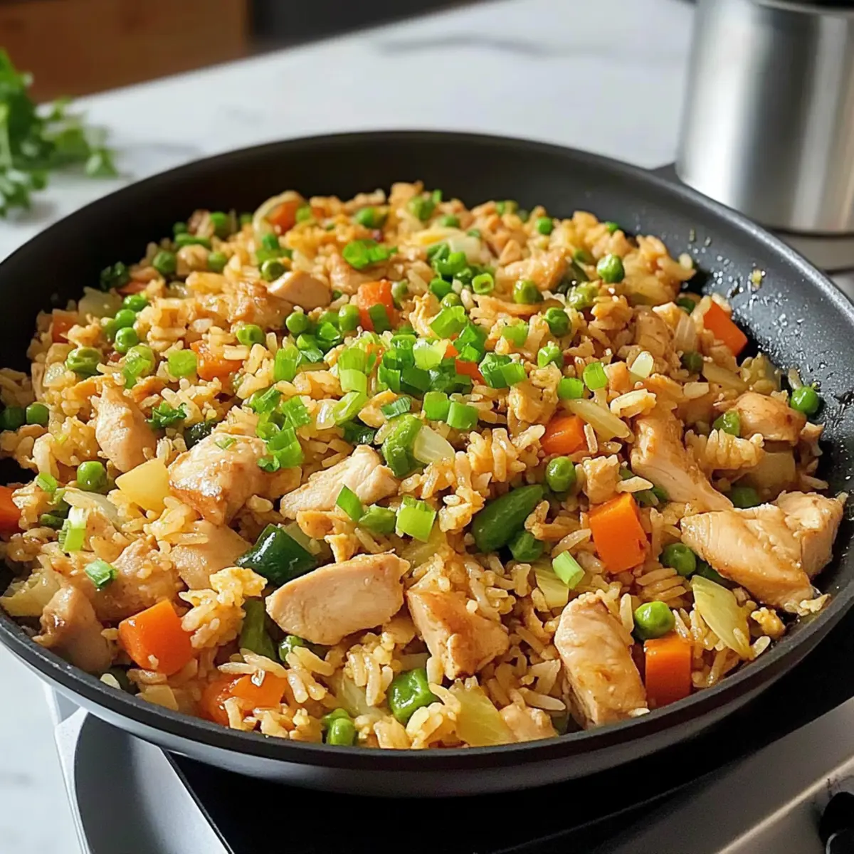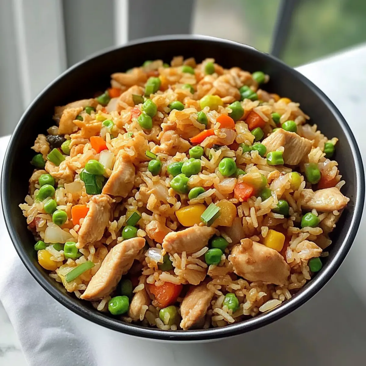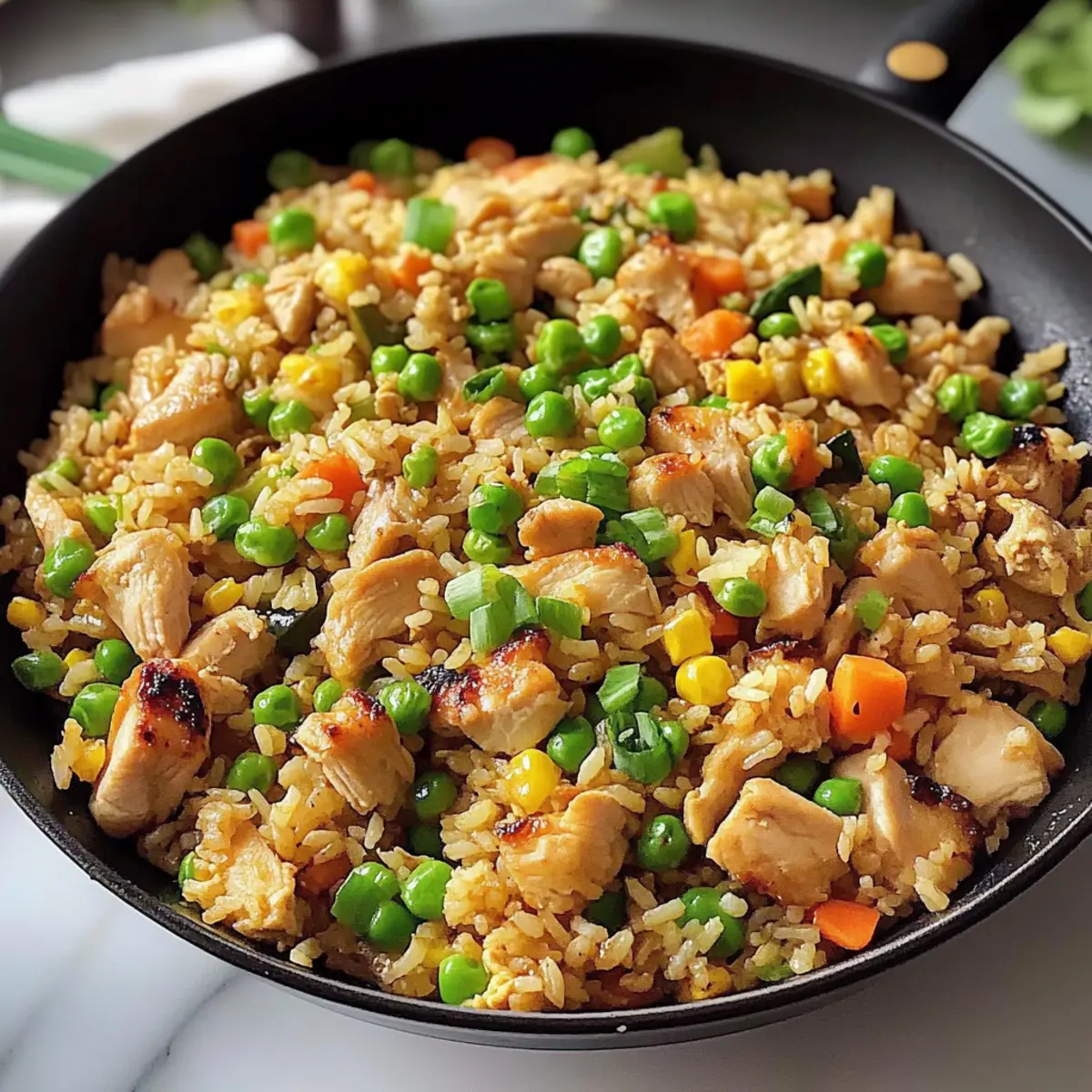 Das Geräusch von sprudelndem Öl in der Pfanne weckt sofort meine Vorfreude. Wenn ich an einen schnellen und köstlichen Abendessen denke, dann kommt der asiatische Hähnchenbratreis ganz oben auf meine Liste. Dieses Gericht vereint zartes Hähnchen mit buntem Gemüse und nimmt nur 20 Minuten in Anspruch – perfekt für hektische Wochentage. Besonders spannend ist die Möglichkeit, mit übrig gebliebenem Reis und Gemüse zu experimentieren, sodass es nicht nur schnell, sondern auch unglaublich anpassungsfähig ist. Mit dem nötigen Biss und den tollen Aromen wird diese köstliche Mischung garantiert jeden begeistern, vom Koch-Nerd bis hin zum Familienmitglied, das immer auf der Suche nach neuen Geschmackserlebnissen ist. Seid ihr bereit, die Pfanne zum Glühen zu bringen? Warum wirst du diesen Hähnchenbratreis lieben? Schnelligkeit: In nur 20 Minuten zauberst du ein köstliches Gericht, perfekt für hektische Wochentage! Vielfalt: Anpassbar mit allem, was dein Kühlschrank hergibt. Nutze übrig gebliebenen Reis und Gemüse, um kreativ zu werden. Aromen: Die Kombination aus Gewürzen und frischem Gemüse bringt aufregende Geschmäcker auf den Tisch. Einfache Zubereitung: Ideal für Kochanfänger, die mit minimalem Aufwand maximalen Genuss erleben möchten. Beliebt bei allen: Egal ob Familie oder Freunde, dieser asiatische Hähnchenbratreis wird alle begeistern, genau wie unser Asiatischer Gurkensalat Chili als erfrischende Beilage. Wenig Aufwand, große Wirkung: Perfekt für eine schnelle Mahlzeit, die eine Geschmacksexplosion bietet! Asiatischer Hähnchenbratreis Zutaten Für die Soße: Chinesischer Kochwein – Gibt Tiefe und verstärkt die Aromen; Ersatz: trockener Sherry, falls nicht verfügbar. Austernsauce – Sorgt für eine umami-reiche Note; Ersatz: Hoisinsauce für eine vegetarische Variante. Hellsojasauce – Liefert die salzige Grundlage; Ersatz: Tamari für eine glutenfreie Option. Sesamöl – Verleiht ein nussiges Aroma; Anpassung nach Geschmack empfohlen. Weißer Pfeffer – Fügt milde Schärfe hinzu; Ersatz: schwarzer Pfeffer für ein ähnliches Schärfeniveau. Gemahlener Ingwer – Bringt Wärme und Würze; frischer Ingwer kann für mehr Kick verwendet werden. Für das Gericht: Öl (zum Braten) – Unverzichtbar für das Anbraten; jedes neutrale Öl wie Raps- oder Sonnenblumenöl funktioniert gut. Eier – Bieten Protein und Feuchtigkeit; können durch Tofu für eine vegane Version ersetzt werden. Hähnchenbrust – Hauptproteinquelle; kann durch Hackfleisch aus Truthahn oder Tofu variiert werden. Knoblauch – Verfeinert Aroma und Geschmack; frisch halten für optimalen Geschmack. Zwiebel – Bietet Süße und Tiefe; jede Zwiebelart kann verwendet werden. Bacon – Fügt herzhaftes Fett und Reichhaltigkeit hinzu; kann für ein leichteres Gericht weggelassen oder durch Truthahnbacon ersetzt werden. Für das Gemüse: Karotte – Bringt Süße und Farbe; andere Gemüse wie Paprika können ebenfalls verwendet werden. Mais (gefroren oder frisch) – Fügt Süße und Textur hinzu; grüne Bohnen oder Erbsen sind ebenfalls gute Alternativen. Erbsen – Bieten kleine süße Überraschungen; gefrorene Erbsen sind ideal; wegzulassen, wenn nicht verfügbar. Gekochter weißer Reis (am besten vom Vortag) – Kernzutat; sorgt für die perfekte, nicht matschige Textur. Frisch gekochter Reis kann nach Anleitung getrocknet werden. Frühlingszwiebeln – Für Garnierung und Farbe; können durch Schnittlauch ersetzt werden. Tipp: Dieses Rezept für asiatischen Hähnchenbratreis ist nicht nur schnell zubereitet, sondern lässt sich auch mit Resten anpassen! Schritt-für-Schritt-Anleitung für Asiatischer Hähnchenbratreis Schritt 1: Sauce vorbereiten Mische in einer kleinen Schüssel den chinesischen Kochwein, die Austernsauce, die Hellsojasauce, das Sesamöl, den weißen Pfeffer und den gemahlenen Ingwer. Rühre die Zutaten gut um, bis sie vollständig vermischt sind. Setze die Mischung beiseite, um die Aromen zu vereinen, während du die anderen Zutaten vorbereitest. Schritt 2: Zutaten vorbereiten Zerkleinere den Knoblauch und würfele die Zwiebel sowie die Karotte. Schneide die Frühlingszwiebeln in zwei Teile: die weißen und die grünen Teile getrennt. Teile das Hähnchenbrustfilet und den Bacon in kleine Stücke. Halte alles bereit, da du diese Zutaten in den nächsten Schritten schnell verwenden wirst. Schritt 3: Eier rühren Erhitze 1 Esslöffel Öl in einem heißen Wok bei mittlerer bis hoher Temperatur. Gib die Eier dazu und verrühre sie sofort mit einem Holzlöffel, bis sie nur leicht gestockt sind. Nach etwa 1-2 Minuten nimm die Eier aus dem Wok und lege sie auf einen Teller. Dies sorgt für eine weiche Textur. Schritt 4: Bacon und Aromaten anbraten Füge das restliche Öl in den Wok und erhitze es, bis es schimmert. Gebe den Bacon hinzu und brate ihn ca. 1 Minute lang an, bis er knusprig wird. Füge dann den Knoblauch und die Zwiebeln hinzu und brate sie für etwa 30 Sekunden an, bis sie duften und die Zwiebeln glasig sind. Schritt 5: Hähnchen braten Gib die Hähnchenstücke in den Wok und brate sie 1-1,5 Minuten, bis sie fast durchgegart sind. Achte darauf, dass das Hähnchen an den Rändern leicht gebräunt ist, um den besten Geschmack zu entfalten. Rühre während des Bratens regelmäßig um. Schritt 6: Gemüse hinzufügen Füge nun die gewürfelte Karotte, den Mais und die Erbsen in den Wok hinzu. Brate die Mischung ca. 1 Minute lang, bis das Gemüse leicht erhitzt ist und leuchtende Farben zeigt. Dies sorgt für zusätzliche Frische und Textur im asiatischen Hähnchenbratreis. Schritt 7: Reis einarbeiten Gebe den gekochten Reis, der am besten vom Vortag ist, in den Wok. Zerkleiner die Reisklumpen mit einem Holzlöffel und gieße die vorbereitete Sauce darüber. Rühre alles gut um und brate die Mischung für etwa 1,5 Minuten, bis der Reis gleichmäßig mit der Sauce bedeckt und heiß ist. Schritt 8: Eier und Frühlingszwiebeln hinzufügen Füge die zuvor gekochten Ei