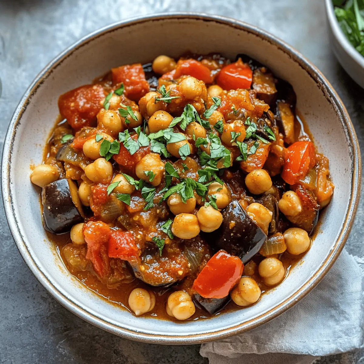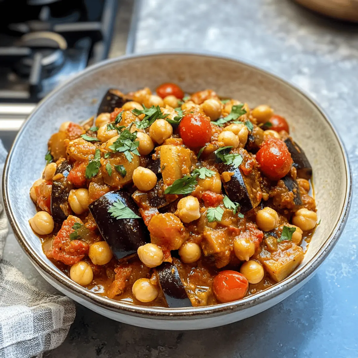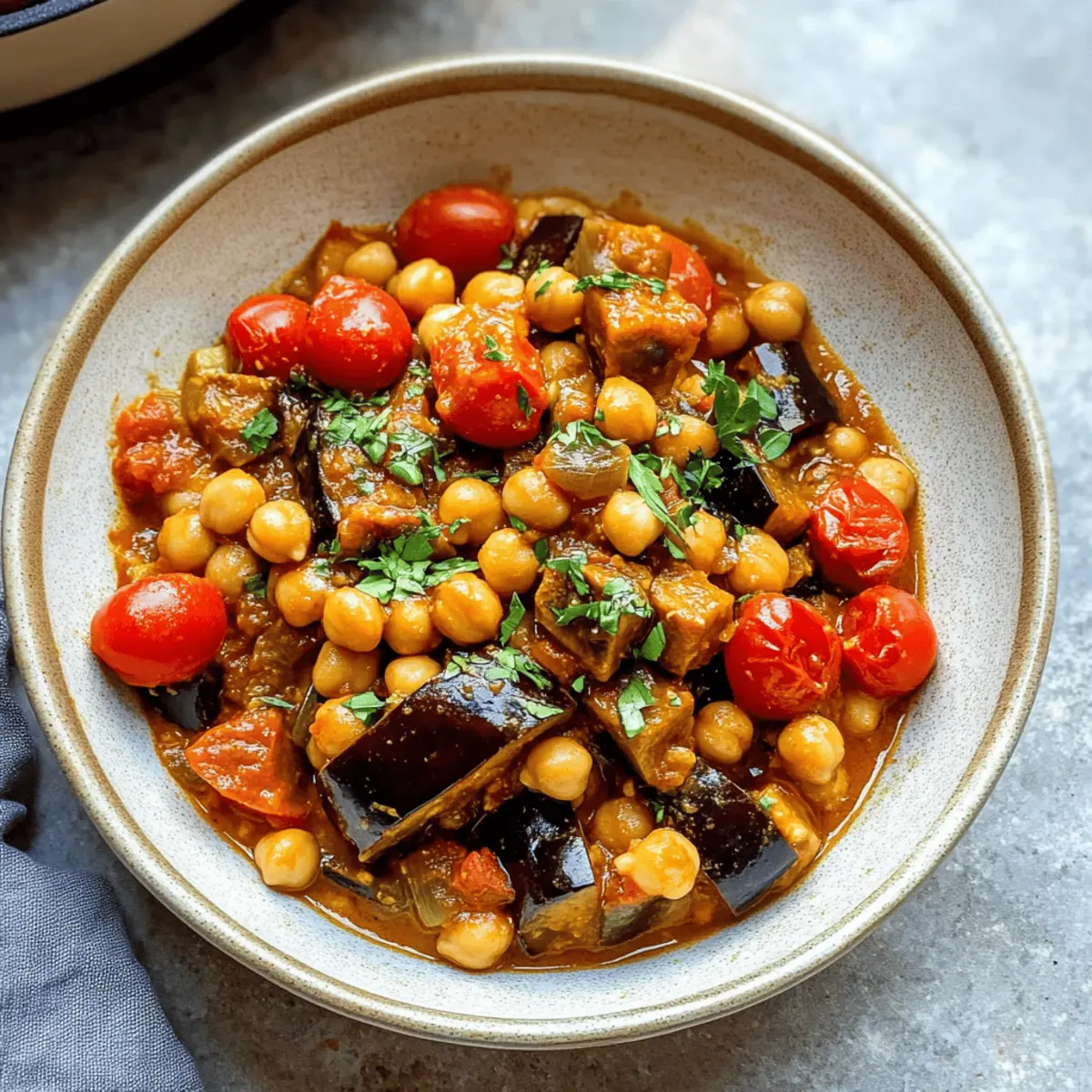 In der Küche kann es manchmal zu unerwarteten Entdeckungen kommen, die unsere Geschmäcker für immer verändern. Ich erinnere mich an den ersten Biss in einen unwiderstehlich aromatischen Auberginen-Eintopf mit Kichererbsen, Tomaten und Harissa. Das Zusammenspiel von zart gerösteten Auberginen und der pikanten Wärme der Harissa hat mich sofort verzaubert. Dieses herzliche Gericht vereint nicht nur den Reichtum der nordafrikanischen Küche, sondern ist auch ein schnelles Wohlfühlessen, das in weniger als einer Stunde zubereitet werden kann. Perfekt für alle, die köstliche und nahrhafte vegetarische Rezepte suchen! Glaubt mir, dieser Eintopf wird nicht nur eure Geschmacksnerven kitzeln, sondern auch zum Star eurer nächsten Mahlzeit werden. Neugierig, was euch erwartet? Lass uns gemeinsam kochen! Warum schmeckt dieser Eintopf so besonders? Aromatischer Genuss: Die Kombination aus Auberginen, Kichererbsen und der feurigen Harissa verleiht diesem Eintopf eine unverwechselbare Note, die eure Geschmacksknospen begeistern wird. Einfachheit: In weniger als einer Stunde steht ein köstliches, nahrhaftes Gericht auf dem Tisch – perfekt für stressige Tage! Vielseitigkeit: Ob mit frischem Brot, Quinoa oder Reis serviert, dieser Eintopf passt zu vielen Beilagen und Gelegenheiten. Nährstoffreich: Kichererbsen bieten eine hervorragende Proteinquelle und machen das Gericht nicht nur lecker, sondern auch gesund. Einstieg in die nordafrikanische Küche: Wer neugierig auf neue Aromen ist, wird diese spannende Kombination lieben und seine Gäste beeindrucken! Auberginen-Eintopf Zutaten • Für die Zubereitung: Aubergine – die Basiszutat, die dem Eintopf Textur und Herzhaftigkeit verleiht. Olivenöl – sorgt für Feuchtigkeit und optimalen Röstgeschmack, verwende extra vergine für mehr Aroma. Knoblauch – intensiviert den Geschmack des Eintopfs; die Menge kann je nach persönlichen Vorlieben angepasst werden. Harissa Gewürzmischung – bringt Schärfe und Komplexität; kann durch Harissa-Paste ersetzt werden, wobei die Ölmenge angepasst werden sollte. Cherrytomaten – die süße Note, die den Eintopf ausgleicht; die Dosenversion ist für Geschmack und Praktikabilität empfohlen. Kichererbsen – steigern die Proteinzufuhr und sorgen für Biss; getrocknete Kichererbsen bieten besseren Geschmack, während Konserven für Geschwindigkeit verwendet werden können. Sahne – bereichert den Eintopf; kann durch pflanzliche Sahne für eine vegane Variante ersetzt werden. • Optional zum Servieren: Frisch gehackte Petersilie – bringt Farbe und Frische. Zerbröckelter Feta oder Schafskäse – für eine cremige, salzige Note. Beilage nach Wahl – wie Bulgur oder Reis, ergänzt den Eintopf perfekt. Dieser Auberginen-Eintopf mit Kichererbsen, Tomaten und Harissa ist nicht nur ein Fest für die Sinne, sondern auch eine nahrhafte Option für jede Mahlzeit! Schritt-für-Schritt-Anleitung für Auberginen-Eintopf mit Kichererbsen, Tomaten und Harissa Step 1: Ofen vorheizen und Backblech vorbereiten Heize den Ofen auf 200°C vor und lege ein Backblech mit Backpapier aus. Diese Vorbereitung stellt sicher, dass der Eintopf gleichmäßig garen kann und die Auberginen perfekt rösten. Während der Ofen aufheizt, kannst du dich um die nächsten Schritte kümmern, um die Zubereitung zu optimieren. Step 2: Auberginen würzen und rösten Schneide die Aubergine in Würfel und vermische sie in einer großen Schüssel mit zwei Esslöffeln Olivenöl, Salz und Pfeffer. Lege die gewürzten Auberginen gleichmäßig auf das Backblech und röste sie für etwa 20-25 Minuten im Ofen, bis sie goldbraun und zart sind. Die Röstung wird die Aromen intensivieren und eine köstliche Basis für deinen Eintopf schaffen. Step 3: Knoblauch anbraten Erhitze in einem großen Topf einen Esslöffel Olivenöl bei mittlerer Hitze. Füge den zerdrückten Knoblauch hinzu und brate ihn an, bis er aromatisch und leicht goldbraun ist, was etwa 1-2 Minuten dauert. Achte darauf, den Knoblauch regelmäßig umzurühren, damit er nicht verbrennt und den Eintopf mit seinem aromatischen Geschmack bereichert. Step 4: Harissa und Hauptzutaten hinzufügen Rühre die Harissa in den Topf mit dem Knoblauch und lass die Gewürze kurz aufkochen. Dazu gibst du die roasted Auberginen, die Dosentomaten und die abgetropften Kichererbsen. Rühre alles gut um und lasse es bei niedriger Hitze 20 Minuten köcheln, damit sich die Aromen entfalten können. Während dieser Zeit wird dein Eintopf eine einladende Farbe und einen verführenden Duft entwickeln. Step 5: Sahne einrühren und abschmecken Nach dem Köcheln gib die Sahne oder die pflanzliche Alternative in den Eintopf. Rühre die Sahne gründlich ein, um die Cremigkeit zu erhöhen. Schmecke den Eintopf mit Salz und Pfeffer ab, um die Aromen zu intensivieren. Lass den Eintopf noch 2-3 Minuten auf dem Herd, damit alles gut vermischt ist und dann serviere den aromatischen Auberginen-Eintopf mit Kichererbsen, Tomaten und Harissa. Meal Prep für den Auberginen-Eintopf mit Kichererbsen, Tomaten und Harissa Der Auberginen-Eintopf mit Kichererbsen, Tomaten und Harissa ist perfekt für eine stressfreie Essensvorbereitung! Du kannst die gewürfelten Auberginen bis zu 24 Stunden im Voraus zusammen mit dem Olivenöl und dem Salz marinieren und sie dann im Kühlschrank aufbewahren, um die Aromen noch besser zur Geltung zu bringen. Auch die Kichererbsen, sei es getrocknet oder aus der Dose, können bereits einige Tage im Voraus vorbereitet werden. An einem geschäftigen Abend musst du dann nur noch die Auberginen rösten, den Knoblauch anbraten und alles in einem Topf zum Köcheln bringen. Damit der Eintopf frisch bleibt, lagere ihn in einem luftdichten Behälter, in dem er bis zu 3 Tage haltbar ist und beim Erhitzen die Cremigkeit erhält, die ihn so köstlich macht! Was passt gut zu Auberginen-Eintopf mit Kichererbsen, Tomaten und Harissa? Genieße den vollen Geschmack deines Eintopfs mit diesen köstlichen Beilagen, di