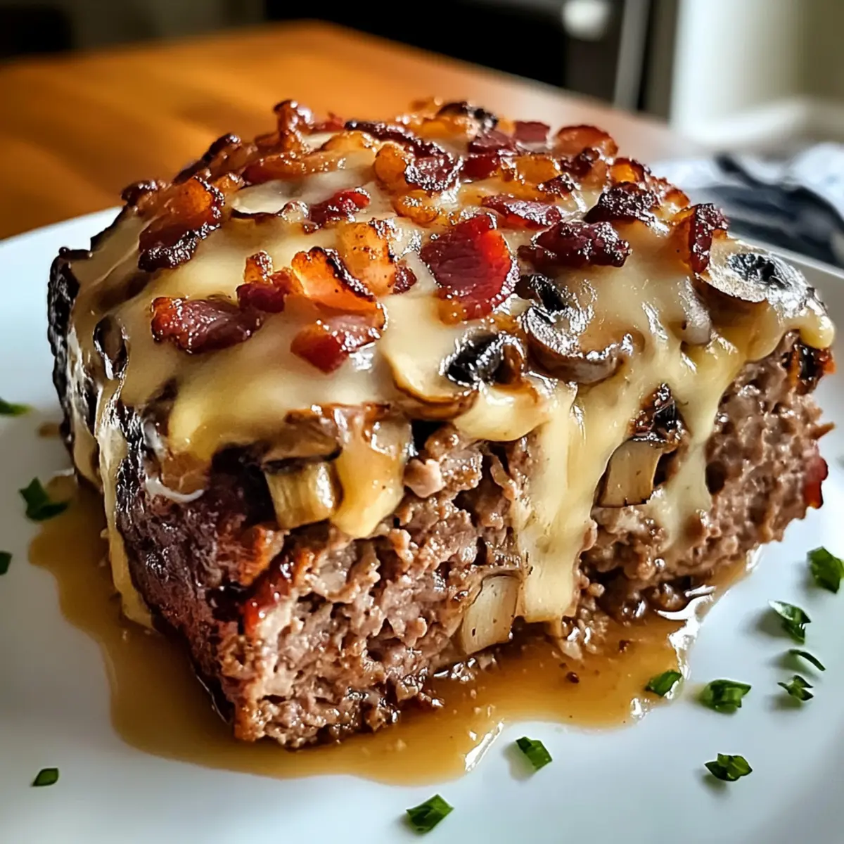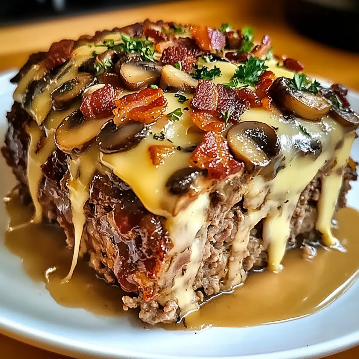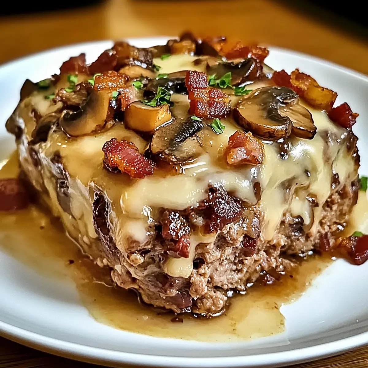 Ein köstlicher Bacon Pilz Schweizer Käse Fleischlaib, der Komfort und Geschmack vereint, ideal für jede Mahlzeit.