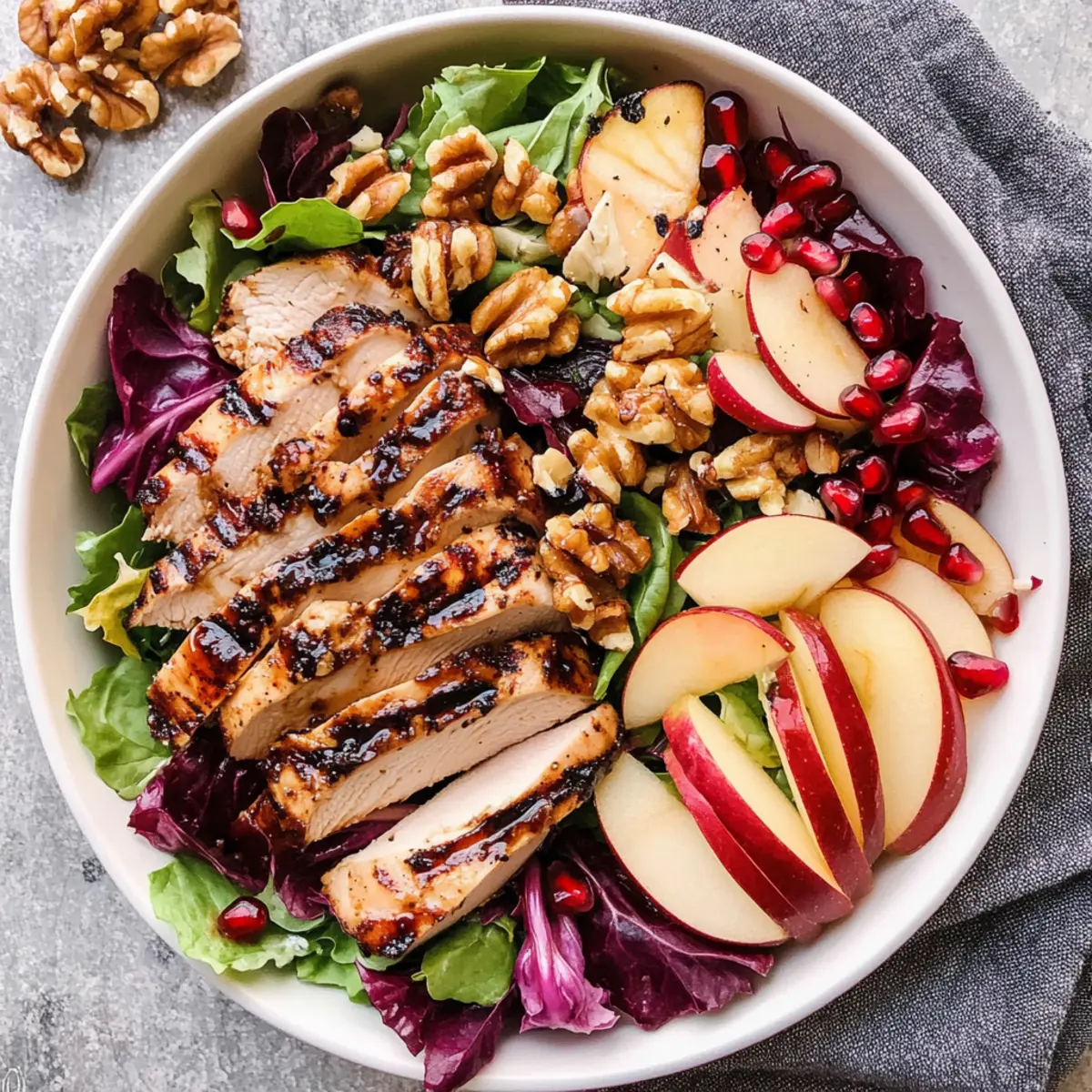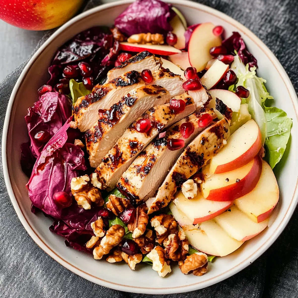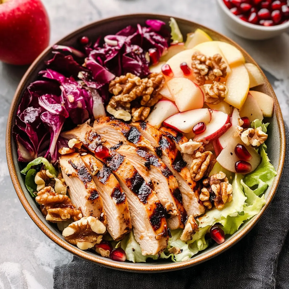 Frische Aromen harmonieren perfekt mit der Grillnote des Hähnchens und machen jeden Bissen unvergesslich. Einfache Zubereitung: Mit nur wenigen Schritten und leicht erhältlichen Zutaten kannst du im Handumdrehen ein Festmahl kreieren. Gesunde Wahl: Reich an Proteinen und Ballaststoffen unterstützt dieser Salat eine ausgewogene Ernährung. Vielfalt in den Zutaten sorgt dafür, dass jeder Geschmack auf seine Kosten kommt – egal, ob du Nüsse, frischen Salat oder die Süße von Äpfeln bevorzugst. Schau dir auch unsere Tipps für vegetarische Alternativen an, sodass du Variationen ganz nach deinen Vorlieben genießen kannst!