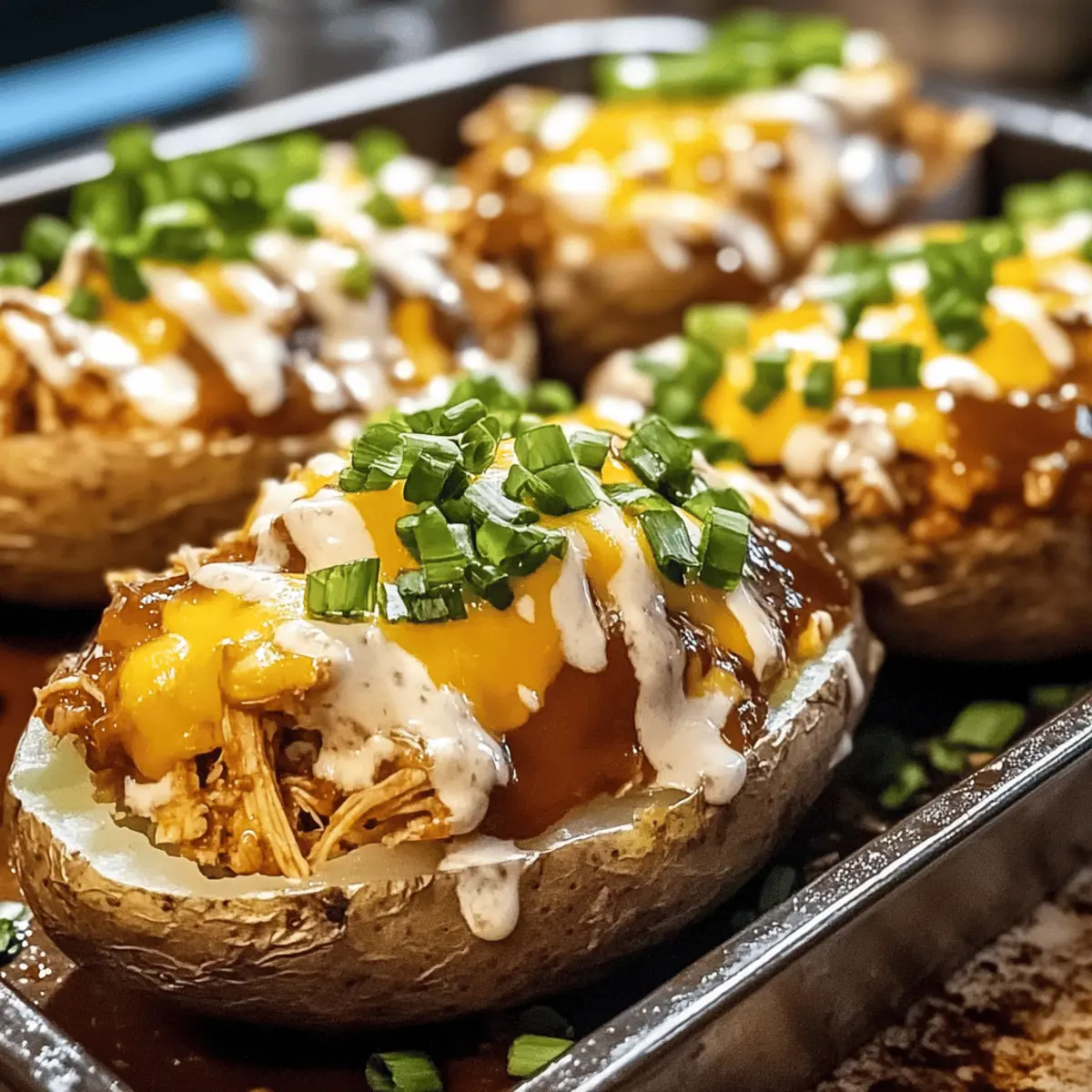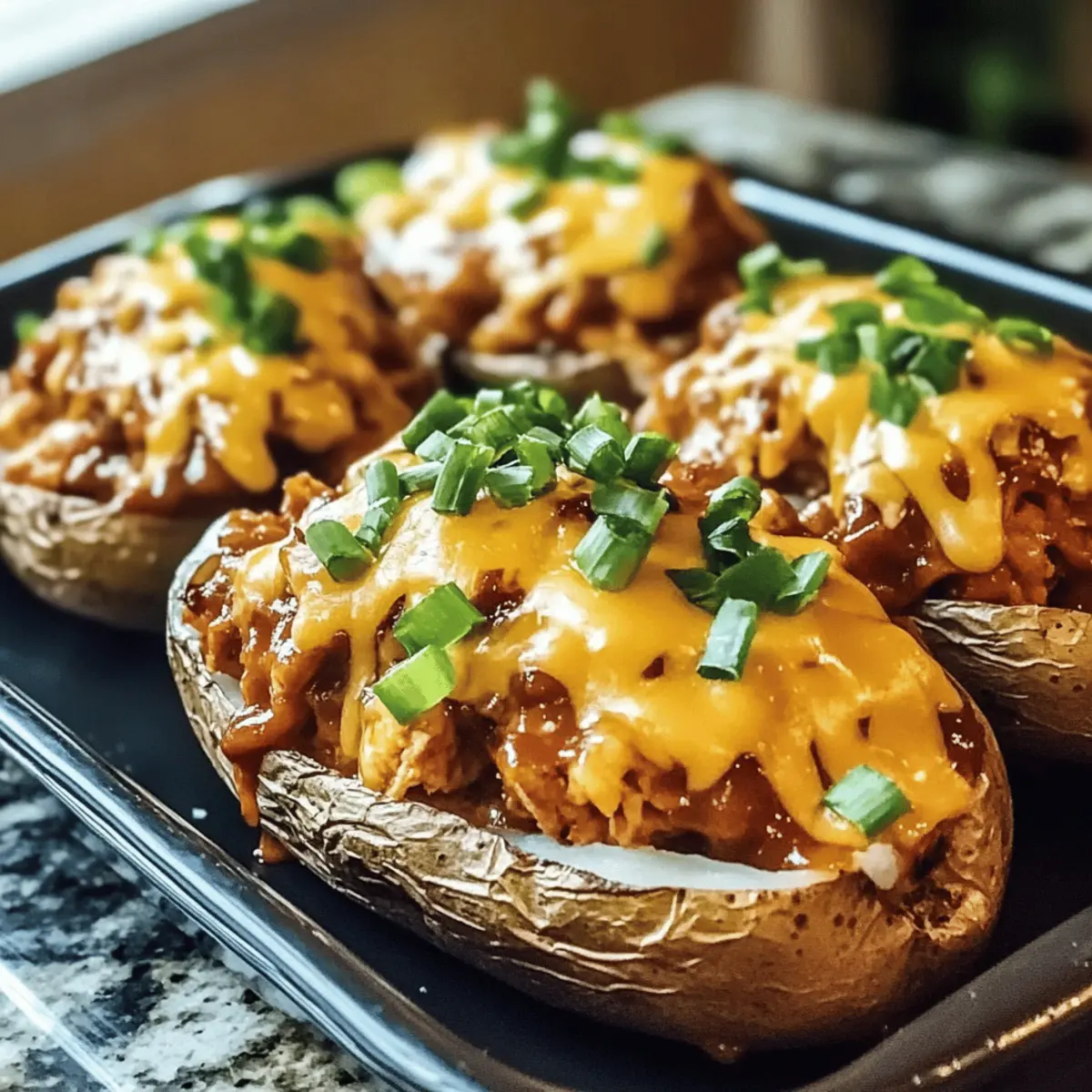 BBQ-Hühnchen gefüllte Ofenkartoffeln sind zarte Hühnchenstücke in fluffigen Kartoffeln, ideal für ein schnelles und leckeres Abendessen.