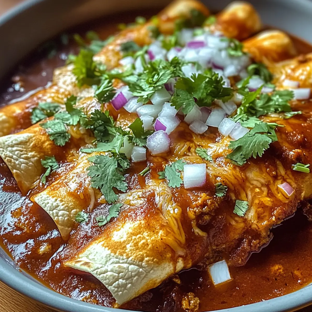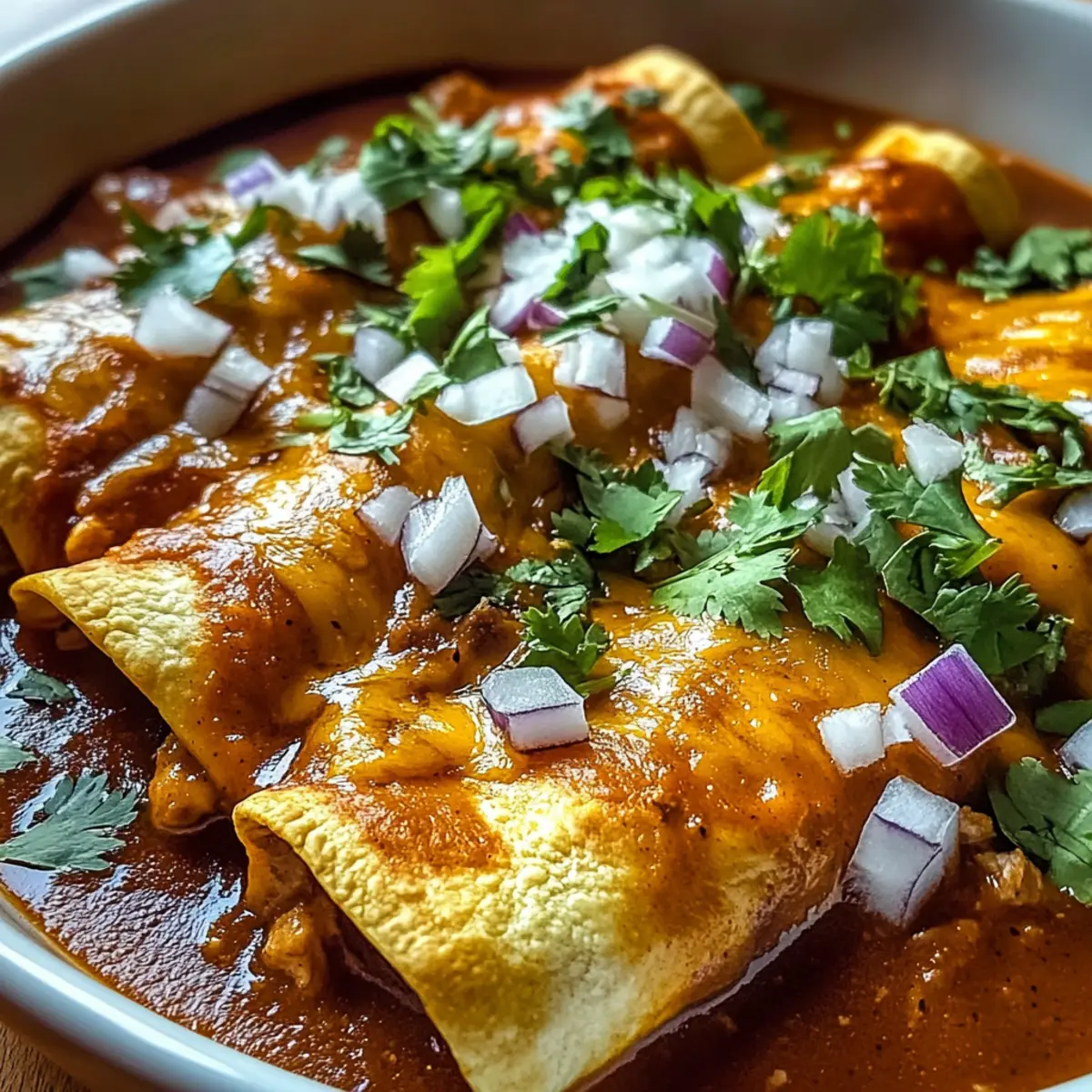 Nimm die Enchiladas aus dem Ofen und garniere sie mit gewürfelter roter Zwiebel und frischem Koriander. Serviere sie heiß mit zusätzlicher Konsommé an der Seite für ein schmackhaftes Erlebnis. Bereite dich auf die herzhafte Reise voller Geschmack und Aromen vor!