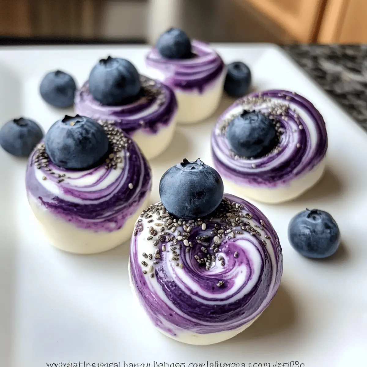 Genießen Sie die erfrischenden Blaubeerwirbel-Joghurtbissen – ein gesunder Snack mit cremigem griechischem Joghurt und spritzigen Blaubeeren.