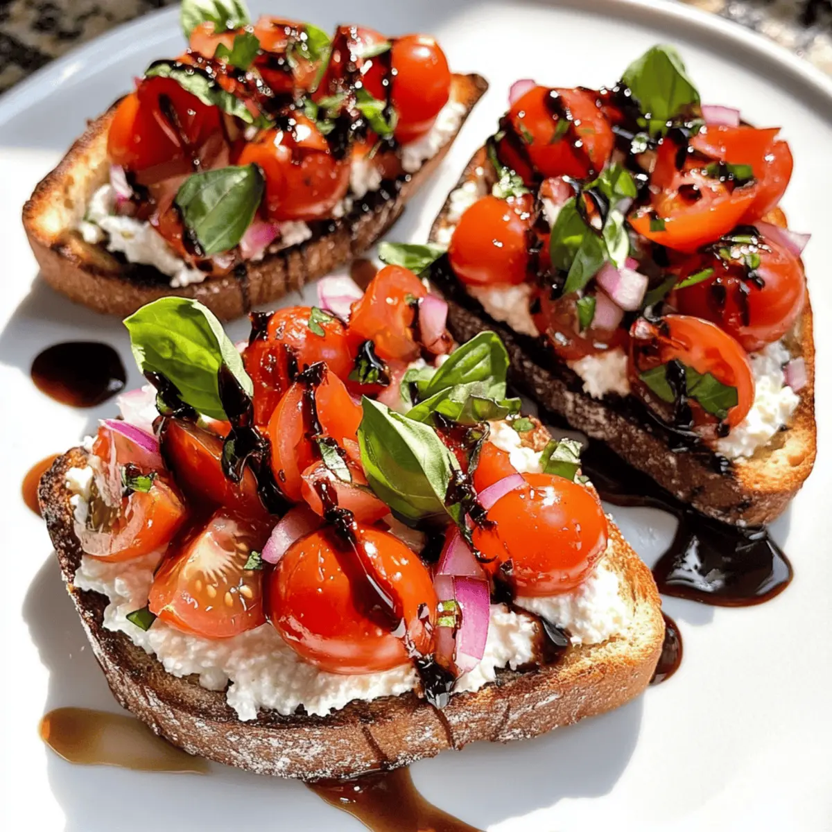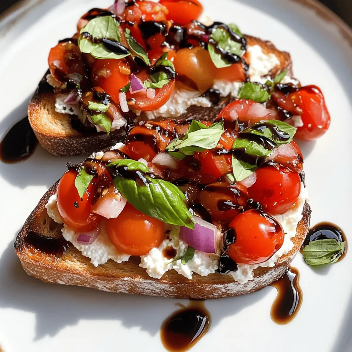 Um deinen Bruschetta-ähnlichen Hüttenkäsetoast stressfrei genießen zu können, kannst du verschiedene Komponenten ganz einfach im Voraus vorbereiten. Zum Beispiel kannst du die Bruschetta-Mischung (Tomaten, Zwiebeln, Basilikum, Olivenöl und Gewürze) bis zu 3 Tage im Kühlschrank aufbewahren – achte darauf, sie in einem luftdichten Behälter zu lagern, um die Frische zu bewahren. Auch die Hüttenkäse-Basis lässt sich gut bis zu 24 Stunden vorher anrühren und kühl lagern. Beachte, dass du das Toastbrot erst kurz vor dem Servieren vorbereitest, damit es knusprig bleibt. Einfach das Brot toasten, Hüttenkäse auftragen, mit der vorbereiteten Mischung belegen und die Balsamico-Glasur hinzufügen – so hast du im Handumdrehen einen köstlichen Snack, der dich begeistert und wertvolle Zeit spart!