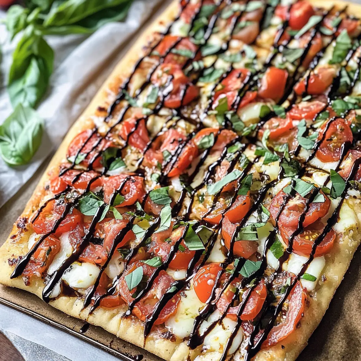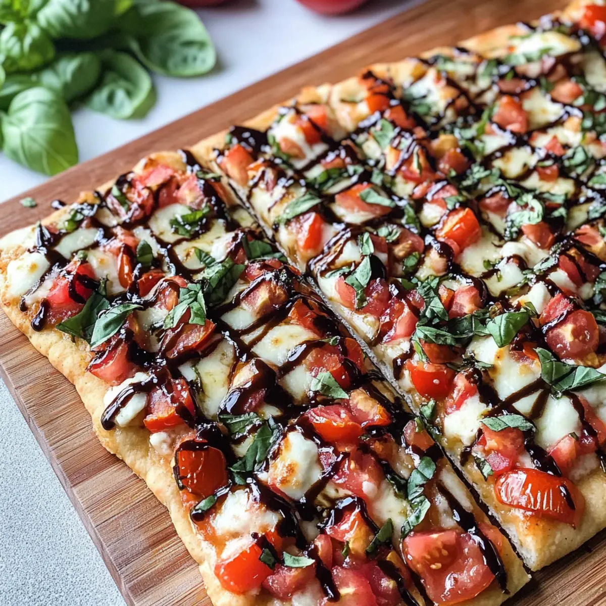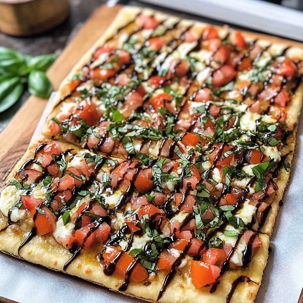Es ist erstaunlich, wie schnell eine einfache Zutatenliste einen unglaublichen Geschmack entfalten kann. Heute teile ich mit dir mein Rezept für Bruschetta Fladenbrot Pizza, das nicht nur in weniger als 30 Minuten zubereitet ist, sondern auch vollgepackt mit frischen, köstlichen Aromen. Diese vegetarische Köstlichkeit vereint knuspriges Fladenbrot mit saftigen Roma-Tomaten, aromatischem Basilikum und zart schmelzendem Mozzarella – ideal für gemütliche Abende oder als beeindruckendes Fingerfood bei deinen nächsten Partys. Und das Beste daran? Du kannst die Toppings ganz nach deinem Geschmack anpassen! Welche kreativen Kombinationen wirst du ausprobieren? Warum wirst du dieses Rezept lieben? Einfachheit: Die Zubereitung ist kinderleicht und benötigt nur grundlegende Kochfertigkeiten. Frische Aromen: Die Kombination aus saftigen Tomaten, duftendem Basilikum und geschmolzenem Käse bringt unvergleichliche Frische auf deinen Teller. Vielfältige Anpassungsmöglichkeiten: Du kannst die Toppings nach deinem Geschmack variieren, sei es mit Pilzen oder sogar frischen Erdbeeren. Schnelle Zubereitung: In weniger als 30 Minuten bist du bereit, deine Gäste mit dieser köstlichen Bruschetta Fladenbrot Pizza zu begeistern! Perfekte für jeden Anlass: Egal, ob ein gemütliches Abendessen oder eine Feier, dieses Rezept wird garantiert ein Hit sein. Für mehr kreative Ideen, probiere auch unsere Knusprige Tortilla Pizza oder die Pizza Bagels Rezept! Bruschetta Fladenbrot Pizza Zutaten • Verpasse nicht die frischen Aromen! Für das Fladenbrot Artesian Flatbread – Die Basis für die Pizza; du kannst fertiges Fladenbrot verwenden oder deinem eigenen Rezept folgen. Für den Belag Pesto – Serviert als aromatische Basis; für eine vegane Variante einfach Hummus verwenden. Frischer Mozzarella – Sorgt für eine cremige Textur; marinierten Mozzarella für mehr Geschmack nutzen. Roma-Tomaten – Ideal für Frische und Geschmack; entscheidend für das beste Ergebnis, da andere Tomaten zu saftig sein könnten. Basilikumblätter – Fügen einen duftenden, kräuterigen Akzent hinzu; Genoveser Basilikum ist bevorzugt, obwohl süßer Basilikum auch geht. Knoblauch – Für Frische und aromatische Tiefe; verwende keinen Knoblauchpulver. Parmesankäse – Für umami und eine salzige Note; benutze immer frisch geriebenen Käse für den besten Geschmack. Balsamico-Essig – Verleiht dem Gericht Säure; wähle eine hochwertige Sorte. Olivenöl – Bringt Reichhaltigkeit in die Bruschetta-Mischung; extra vergine wird empfohlen. Salz – Verstärkt den Gesamtgeschmack; nach Geschmack anpassen. Balsamico-Glasur – Zum abschließenden Garnieren; kann im Geschäft gekauft oder selbst hergestellt werden für zusätzliche Süße. Step-by-Step Instructions for Bruschetta Fladenbrot Pizza Step 1: Ofen vorheizen Heize den Ofen auf 220 °C vor und lege ein Backblech mit Folie aus, um das Backen einfacher zu gestalten. Diese Vorbereitung ist entscheidend, damit die Bruschetta Fladenbrot Pizza gleichmäßig und knusprig gebacken wird. Achte darauf, dass der Ofen vollständig aufgeheizt ist, bevor du mit den nächsten Schritten fortfährst. Step 2: Bruschetta-Mischung vorbereiten In einer Rührschüssel vermengst du die grob gehackten Roma-Tomaten, frische Basilikumblätter, den fein gehackten Knoblauch, frisch geriebenen Parmesan, Balsamico-Essig, Olivenöl und eine Prise Salz. Rühre alles gut durch, bis eine einheitliche, aromatische Mischung entsteht, die später auf die Fladenbrot Pizza kommt. Step 3: Fladenbrot vorbereiten Lege das Fladenbrot auf das vorbereitete Backblech und verteile das Pesto gleichmäßig darauf. Achte darauf, dass die gesamte Oberfläche mit einer dünnen Schicht bedeckt ist, um den Geschmack in jedem Bissen der Bruschetta Fladenbrot Pizza zu verstärken. Dies schafft eine köstliche Basis für die weiteren Zutaten. Step 4: Mit Mozzarella belegen Schneide den frischen Mozzarella in Scheiben und lege diese gleichmäßig auf das mit Pesto belegte Fladenbrot. Achte darauf, dass zwischen den Käsescheiben genügend Platz bleibt, damit der Käse beim Backen gut schmelzen kann. Dies sorgt für die perfekte, geschmolzene Textur. Step 5: Backen Backe die Bruschetta Fladenbrot Pizza im Ofen für etwa 10 Minuten, bis der Käse schön geschmolzen und leicht blubbrig ist. Halte während des Backens ein Auge darauf, dass sie nicht zu dunkel wird. Der perfekte Indikator ist, wenn der Käse goldbraun und leicht sprudelnd erscheint. Step 6: Fertigstellen und Garnieren Lass die Fladenbrot Pizza nach dem Backen kurz auf einem Gitter abkühlen, damit der Boden knusprig bleibt. Toppe dann die warme Pizza großzügig mit der vorbereiteten Bruschetta-Mischung und beträufle sie mit Balsamico-Glasur. Garnieren kannst du abschließend mit frischen Basilikumblättern und mehr Parmesan für den ultimativen Genuss. Step 7: Servieren Schneide die Bruschetta Fladenbrot Pizza in Stücke und serviere sie sofort, damit die Aromen frisch und lebendig bleiben. Diese köstliche Kombination aus knusprigem Fladenbrot und frischem Belag wird bei jedem Anlass ein Hit sein. Deine Gäste werden von dem Geschmack begeistert sein! Was servierst du mit Bruschetta Fladenbrot Pizza? Lass deiner Kreativität freien Lauf und baue ein köstliches Menü rund um diese herrliche Bruschetta Fladenbrot Pizza! Frischer Gartensalat: Ein leichtes, knackiges Salatmix aus Rucola, Gurken und Kirschtomaten bringt einen erfrischenden Kontrast zur herzhaften Pizza. Zucchini-Nudeln: Diese gesunden, gedünsteten Nudeln sind eine aromatische und leichte Beilage, die die Aromen der Bruschetta-Fladenbrot-Pizza perfekt ergänzt. Gegrilltes Gemüse: Eine bunte Mischung aus gegrillten Zucchini, Paprika und Auberginen sorgt für zusätzliche Textur und Geschmack und bringt ein mediterranes Flair auf den Tisch. Weißwein: Ein spritziger Sauvignon Blanc harmoniert hervorragend mit der Frische der Zutaten und hebt den Geschmack der Pizza hervor. Hausgemachte Focacci