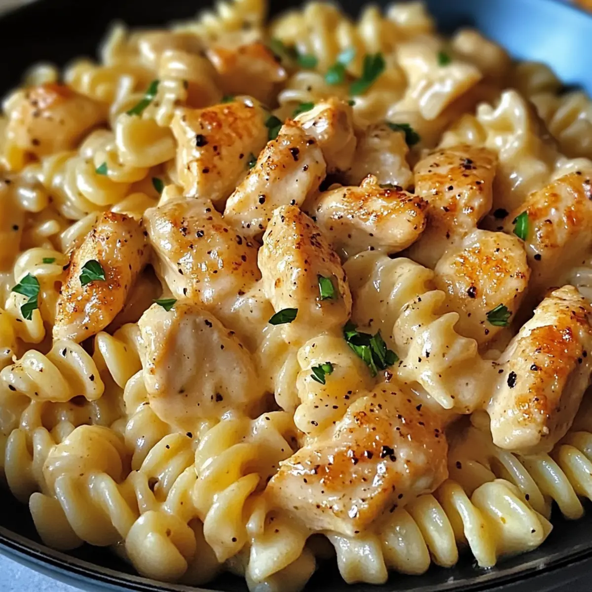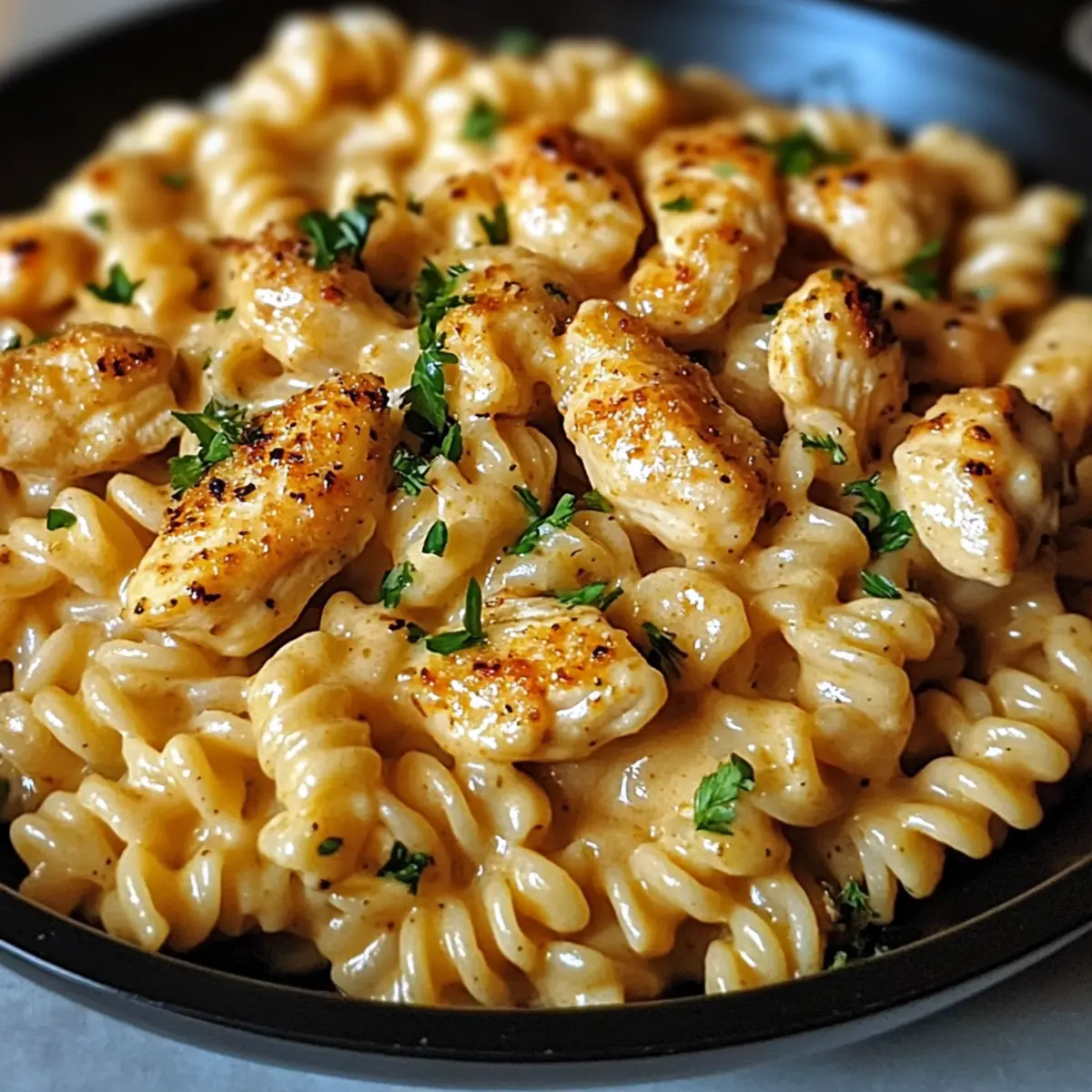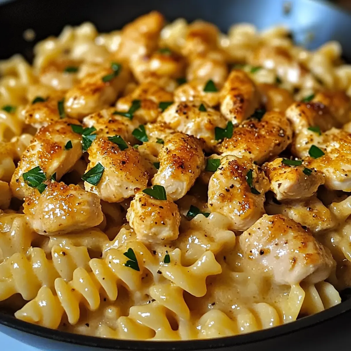 Es gibt diese besonderen Abende, an denen unser Zuhause in den verführerischen Duft von geröstetem Knoblauch und würzigem Cajun gewoben wird – genau das erwartet euch mit meiner Cajun Knoblauchhühnchen Rotini Pfanne für gemütliche Nächte. Dieses cremige, einpfannige Gericht macht nicht nur das Kochen zum Vergnügen, sondern sorgt auch dafür, dass ihr im Handumdrehen ein herzhaftes und schnelles Abendessen auf den Tisch bringt. Ganz gleich, ob ihr schnell etwas für die Familie zubereiten oder Freunde beeindrucken möchtet, diese Rezeptvariante ist perfekt anpassbar – selbst für Vegetarier oder glutenfreie Genießer. Seid ihr bereit, eure Kochkünste mit einem Hauch von Südstaatenflair zu verfeinern? Lasst uns loslegen! Warum wirst du dieses Rezept lieben? Einfachheit: Mit nur einer Pfanne ist die Zubereitung schnell und unkompliziert. Perfekt für stressige Wochentage! Vielfalt: Egal ob vegetarisch oder glutenfrei, dieses Rezept lässt sich leicht anpassen, sodass jeder am Tisch glücklich ist. Aromatische Aromen: Der würzige Cajun-Geschmack in Kombination mit dem cremigen Käse bringt jeden Bissen zum Leben und zaubert ein Lächeln auf dein Gesicht. Familienfreundlich: Dieses herzhaft leckere Gericht wird garantiert von Groß und Klein geliebt, ein echter Hit für das Familienessen. Zeitersparnis: Schnelle Zubereitung und wenig Aufräumaufwand machen dieses Gericht zu einer idealen Wahl für spontane Abendessen. Perfektes Wohlfühlgericht: Die cremige Konsistenz und der zarte Hühnergeschmack machen es zur idealen Wahl für gemütliche Nächte daheim. Wenn du auf der Suche nach weiteren Woche für Woche bewährten Rezepten bist, schau dir auch unsere anderen leckeren Ideen an! Cajun Knoblauchhühnchen Rotini Pfanne Zutaten Für das Huhn 1 Pfund Hähnchenbrustfilets ohne Haut – Hauptprotein für eine sättigende Mahlzeit; für eine vegetarische Option einfach sautierte Pilze verwenden. Für die Pasta 12 oz Rotini-Pasta – Die ideale Basis, die die Aromen wunderbar aufnimmt; kann durch Glutenfreie Pasta ersetzt werden. Für die Sauce 2 Esslöffel Olivenöl – Zum Anbraten des Huhns und um dem Gericht ein volles Aroma zu verleihen; kann auch durch Sonnenblumenöl ersetzt werden. 2 Esslöffel Cajun-Gewürz – Sorgt für den würzigen Kick; kann mit einer milderen Gewürzmischung für weniger Schärfe angepasst werden. 1 Teelöffel Knoblauchpulver – Intensiviert den Knoblauchgeschmack; alternativ kann frischer, gehackter Knoblauch verwendet werden. ½ Teelöffel Zwiebelpulver – Ergänzt den Knoblauchgeschmack; optional, falls nicht verfügbar. 4 Knoblauchzehen, gehackt – Frischer Knoblauch, der das Aroma bereichert. 1 Esslöffel Butter – Für eine reichhaltige Sauce; kann durch Olivenöl ersetzt werden, um das Gericht milchfrei zu machen. 1 Tasse Schlagsahne – Sorgt für die cremige Konsistenz der Sauce; für eine leichtere Option kann auch Kokosnusscreme verwendet werden. ½ Tasse Hühnerbrühe – Verstärkt den Geschmack der Sauce; für eine vegetarische Variante kann Gemüseb Brühe genommen werden. 1 Tasse Mozzarella Käse, gerieben – Für eine cremige Textur und schmelzige Konsistenz. ½ Tasse Parmesan Käse, gerieben – Fügt eine herzhafte Tiefe hinzu. ½ Tasse Cheddar Käse, gerieben – Verstärkt den Käsegeschmack. ¼ Tasse frische Petersilie, gehackt – Als Garnierung und für frischen Geschmack. Genieße das Kochen mit diesem köstlichen Rezept für die Cajun Knoblauchhühnchen Rotini Pfanne und bringe ein bisschen Genuss in deine Woche! Step-by-Step Instructions für Cajun Knoblauchhühnchen Rotini Pfanne für Gemütliche Nächte Step 1: Pasta Kochen Bringe in einem großen Topf ausreichend gesalzenes Wasser zum Kochen. Füge die Rotini-Pasta hinzu und koche sie für etwa 8-10 Minuten, bis sie al dente ist. Achte darauf, regelmäßig umzurühren, damit die Pasta nicht zusammenklebt. Wenn sie fertig ist, gieße sie in ein Sieb ab und stelle ihn beiseite. Step 2: Hähnchen Braten Erhitze in einer großen Pfanne bei mittlerer Hitze 2 Esslöffel Olivenöl. Würze die Hähnchenbrustfilets mit 2 Esslöffeln Cajun-Gewürz und lege sie in die heiße Pfanne. Brate das Hähnchen für circa 6-7 Minuten pro Seite, bis es goldbraun und durchgegart ist. Nimm es aus der Pfanne und lege es auf einen Teller, um es beiseite zu stellen. Step 3: Sauce Zubereiten Reduziere die Hitze der Pfanne auf niedrig und füge 1 Esslöffel Butter hinzu. Lass sie schmelzen und füge dann 4 gehackte Knoblauchzehen hinzu. Sauté den Knoblauch für etwa 1 Minute, bis er duftet. Gib anschließend ½ Tasse Hühnerbrühe und 1 Tasse Schlagsahne hinzu und bringe die Mischung zum Simmern. Rühre gut um, damit sich alles verbindet. Step 4: Käse Hinzufügen Füge in die leicht köchelnde Sauce 1 Tasse geriebenen Mozzarella, ½ Tasse geriebenen Parmesan und ½ Tasse geriebenen Cheddar hinzu. Rühre kräftig, bis sich der Käse vollständig aufgelöst hat und die Sauce cremig ist. Achte darauf, dass die Temperatur niedrig bleibt, damit die Milch nicht gerinnt. Step 5: Alles Kombinieren Gib die vorgekochte Rotini-Pasta und das gebratene Hähnchen zurück in die Pfanne mit der Sauce. Vermenge alles gut, sodass die Pasta und das Hähnchen gleichmäßig mit der cremigen Sauce überzogen sind. Lass das Ganze für weitere 2-3 Minuten köcheln, bis alles gut heiß ist und die Aromen sich verbinden. Step 6: Servieren Nimm die Pfanne vom Herd und garniere das Gericht mit ¼ Tasse frisch gehackter Petersilie sowie zusätzlichem Käse, falls gewünscht. Serviere das Cajun Knoblauchhühnchen Rotini Pfanne für gemütliche Nächte sofort und genieße die köstliche Kombination aus Aromen und Texturen. Was passt gut zur Cajun Knoblauchhühnchen Rotini Pfanne? Die perfekten Beilagen bringen die Aromen dieser köstlichen Pfanne zum Strahlen und schaffen ein unvergessliches Essenserlebnis. Knoblauchbrot: Das ist eine klassische Kombination! Das knusprige und buttrige Knoblauchbrot passt wunderbar zu den 