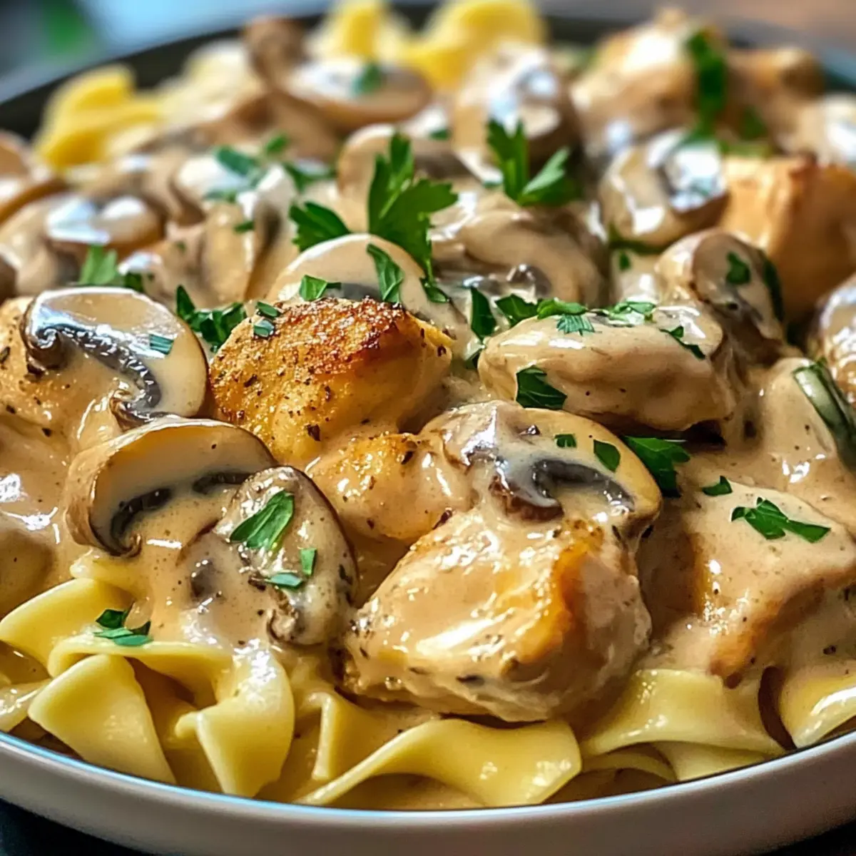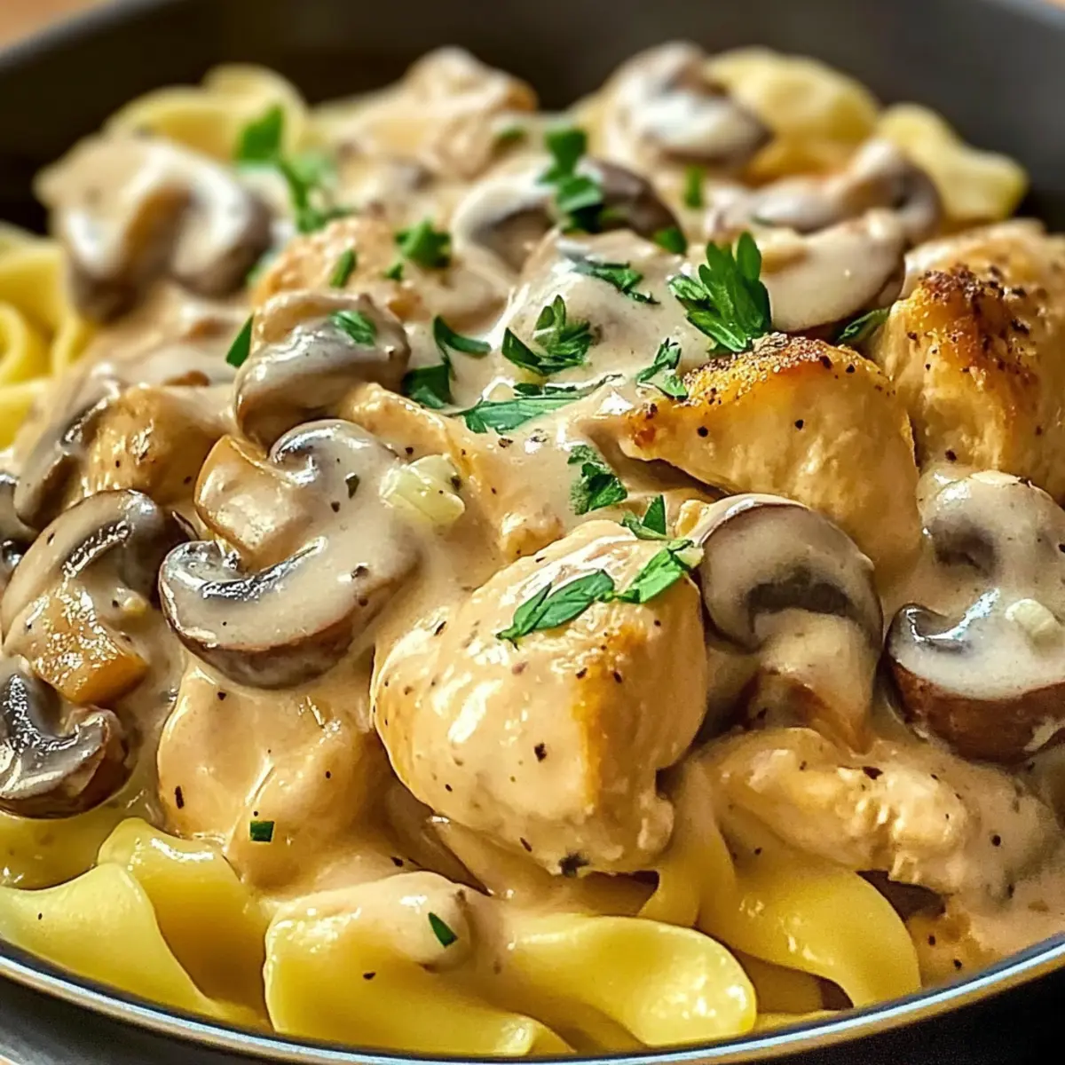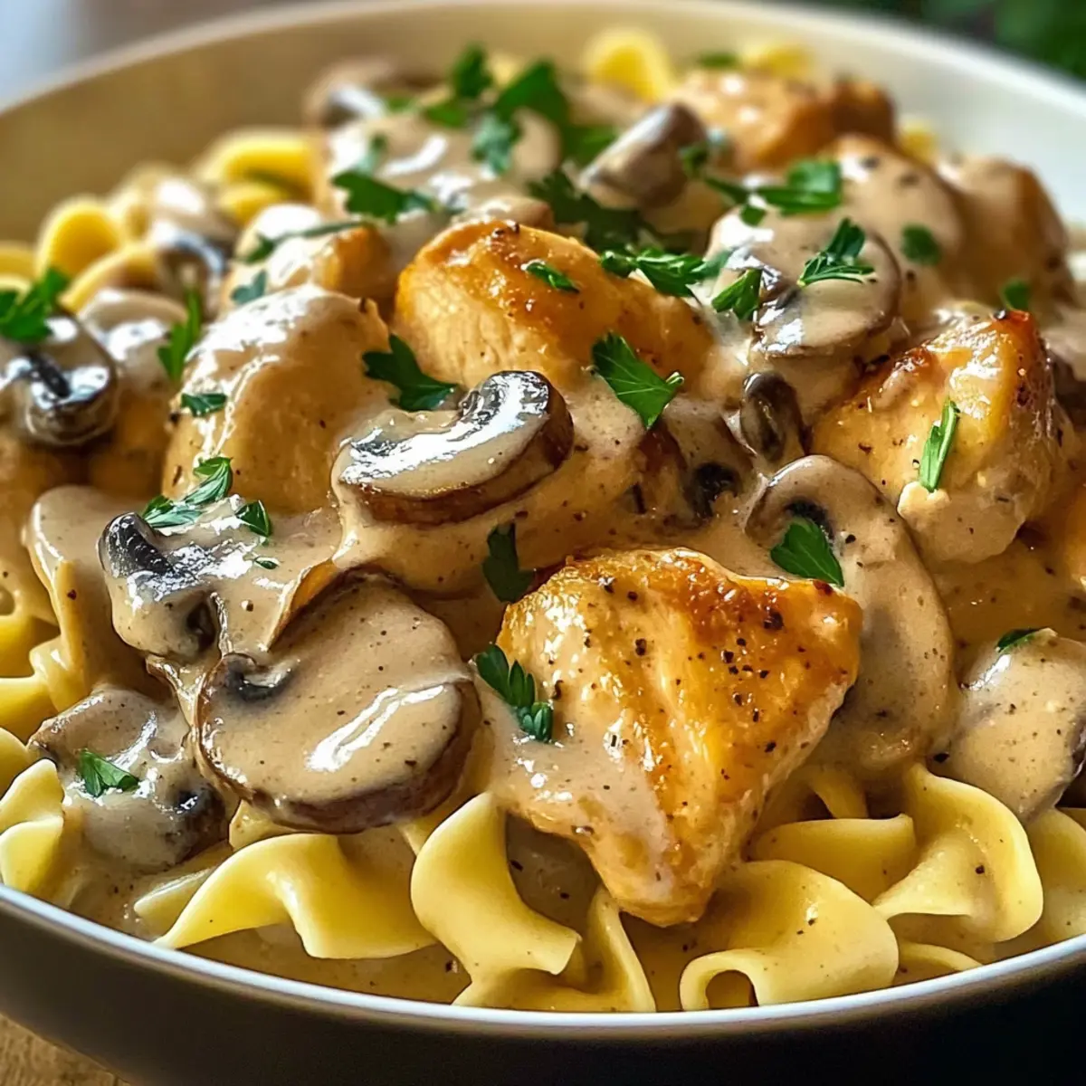 Der Duft von frisch gebratenem Hähnchen und würzigen Pilzen erfüllt die Küche und versetzt mich sofort in eine gemütliche Stimmung. Heute lade ich euch ein, meine Variante des Cremigen Hähnchen Stroganoff zu entdecken – ein Gericht, das nicht nur in weniger als 45 Minuten zubereitet ist, sondern auch komplette Familien und Freunde begeistert. Diese Kombination aus zartem Hähnchen in einer samtigen, cremigen Pilzsauce auf perfekt gekochter Pasta ist der Inbegriff von Comfort Food. Mit einfachen Zutaten aus dem Vorratsspeicher zaubert ihr mit minimalem Aufwand ein Restaurant-ähnliches Erlebnis nach Hause. Wer kann da schon widerstehen? Und habt ihr schon einmal daran gedacht, verschiedene Variationen auszuprobieren, um dieses Rezept noch aufregender zu gestalten? Lasst uns gemeinsam in die Welt des Hähnchen Stroganoff eintauchen! Warum wirst du dieses Rezept lieben? Einfachheit: Die Zubereitung des Cremigen Hähnchen Stroganoff ist unkompliziert und benötigt keine speziellen Kochfähigkeiten – perfekt für jeden! Reichhaltiger Geschmack: Diese Kombination aus zartem Hähnchen und aromatischen Pilzen schmeckt wie eine Umarmung auf dem Teller. Vielseitigkeit: Du kannst problemlos die Zutaten variieren; probiere zum Beispiel, Gemüse wie Spinat oder Erbsen hinzuzufügen oder sogar die Pasta durch Zucchini-Nudeln zu ersetzen. Schnelle Zubereitung: In weniger als 45 Minuten kannst du ein köstliches Gericht auf den Tisch bringen, das den Stress des Alltags vergessen lässt. Perfektes Comfort Food: Ideal für gemütliche Abende mit der Familie oder Freunden, die jeden begeistern werden. Wenn du auf der Suche nach weiteren köstlichen Rezepten bist, schau dir auch meine Cremige Gnocchi Mit Spinat Und Parmesan oder die Kräuter Hühnchen Cremige Sauce an! Cremige Hähnchen Stroganoff Zutaten • Für das Hähnchen Hähnchenbrust oder -oberschenkel (450 g) – Wähle die Oberschenkel für mehr Geschmack oder die Brust für eine magerere Option. • Für die Sauce Cremini- oder weiße Champignons (225 g, in Scheiben) – Fügt erdige Tiefe und Umami hinzu; für einen anderen Geschmack kannst du Shiitake verwenden. Zwiebel (1 kleine, fein gehackt) – Verstärkt die Geschmacksbasis mit Süße. Knoblauch (2 Zehen, gehackt) – Für ein aromatisches Geschmackserlebnis. Olivenöl (2 Esslöffel) – Zum Braten des Hähnchens; kann auch durch pflanzliches Öl ersetzt werden. Butter (2 Esslöffel) – Für zusätzlichen Reichtum; für eine milchfreie Variante ganz durch Olivenöl ersetzen. Allzweckmehl (2 Esslöffel) – Verdickt die Sauce; bei Bedarf kann glutenfreies Mehl verwendet werden. Hühnerbrühe (240 ml) – Flüssigkeitsbasis, um die Sauce zu bilden; niedriger Natriumgehalt ist empfehlenswert. Sauerrahm (120 ml) – Sorgt für die notwendige Cremigkeit und einen Hauch von Säure; griechischer Joghurt ist eine kalorienärmere Alternative. Schlagsahne (120 ml) – Verleiht eine luxuriöse Textur; kann durch Kaffeesahne ersetzt werden. Paprika (1 Teelöffel) – Für milde Schärfe und Farbe. Salz und Pfeffer – Grundgewürze, um die Aromen zu unterstreichen. Frische Petersilie (2 Esslöffel, gehackt; optional) – Zum Garnieren und für zusätzliche Frische. • Für die Pasta Eierteig-Nudeln oder Fettuccine (225 g) – Hauptkohlenhydrat; wechsle zu glutenfreier Pasta für besondere Ernährungsbedürfnisse. Das Rezept für Cremigen Hähnchen Stroganoff vereint all diese Zutaten zu einem herzhaften Wohlfühlessen, das in kürzester Zeit zubereitet ist! Schritt-für-Schritt-Anleitungen für Cremige Hähnchen Stroganoff Schritt 1: Hähnchen vorbereiten Schneide das Hähnchen in bite-sized Stücke und würze es großzügig mit Salz, Pfeffer und Paprika. Erhitze in einer großen Pfanne Olivenöl und Butter bei mittlerer bis hoher Temperatur. Brate das Hähnchen etwa 6–8 Minuten lang an, bis es goldbraun ist. Sobald es gar ist, nimm das Hähnchen aus der Pfanne und stelle es zur Seite. Schritt 2: Gemüse anbraten Gib die geschnittenen Champignons und die fein gehackte Zwiebel in die gleiche Pfanne. Karamellisiere das Gemüse für etwa 6–7 Minuten, bis die Zwiebel weich und leicht golden ist. Füge dann den gehackten Knoblauch hinzu und brate ihn eine weitere Minute mit, bis er aromatisch ist. Schritt 3: Sauce binden Streue das Allzweckmehl gleichmäßig über das Gemüse und rühre gut um, um das Mehl zu verteilen; dies braucht etwa 1 Minute, um den rohen Mehlgeschmack zu eliminieren. Achte darauf, dass die Mischung gut kombiniert ist, bevor du mit dem nächsten Schritt fortfährst. Schritt 4: Brühe hinzufügen Gieße die Hühnerbrühe in die Pfanne und verwende einen Holzlöffel, um die gebräunten Stücke vom Pfannenboden zu lösen. Lass die Sauce auf mittlerer Hitze 3–4 Minuten köcheln, bis sie leicht eingedickt ist und eine seidige Konsistenz annimmt. Schritt 5: Cremigkeit hinzufügen Reduziere die Hitze auf niedrig und rühre den Sauerrahm und die Schlagsahne langsam in die Sauce ein, bis alles gut vermischt und cremig ist. Dies sollte ungefähr 2 Minuten dauern. Achte darauf, die Sauce nicht zum Kochen zu bringen, um ein Gerinnen zu vermeiden. Schritt 6: Hähnchen zurückgeben Gib das angebratene Hähnchen zurück in die Pfanne mit der cremigen Sauce. Lass das Ganze für weitere 5–7 Minuten leicht köcheln, damit sich die Aromen gut verbinden können und das Hähnchen wieder heiß ist. Rühre regelmäßig um, damit nichts am Boden ansetzt. Schritt 7: Pasta kochen Koche die Eierteig-Nudeln oder Fettuccine gemäß den Anweisungen auf der Verpackung, bis sie al dente sind. Dies dauert in der Regel 8–10 Minuten. Wenn die Nudeln fertig sind, lasse sie gut abtropfen und beiseite stehen, während die Sauce fertiggestellt wird. Schritt 8: Anrichten und servieren Mische die gekochte Pasta direkt mit der cremigen Hähnchen Stroganoff Sauce in der Pfanne oder serviere die Sauce über die Pasta. Garniere das Gericht nach Belieben mit frisch gehackter Petersilie für zusätzlichen Ge