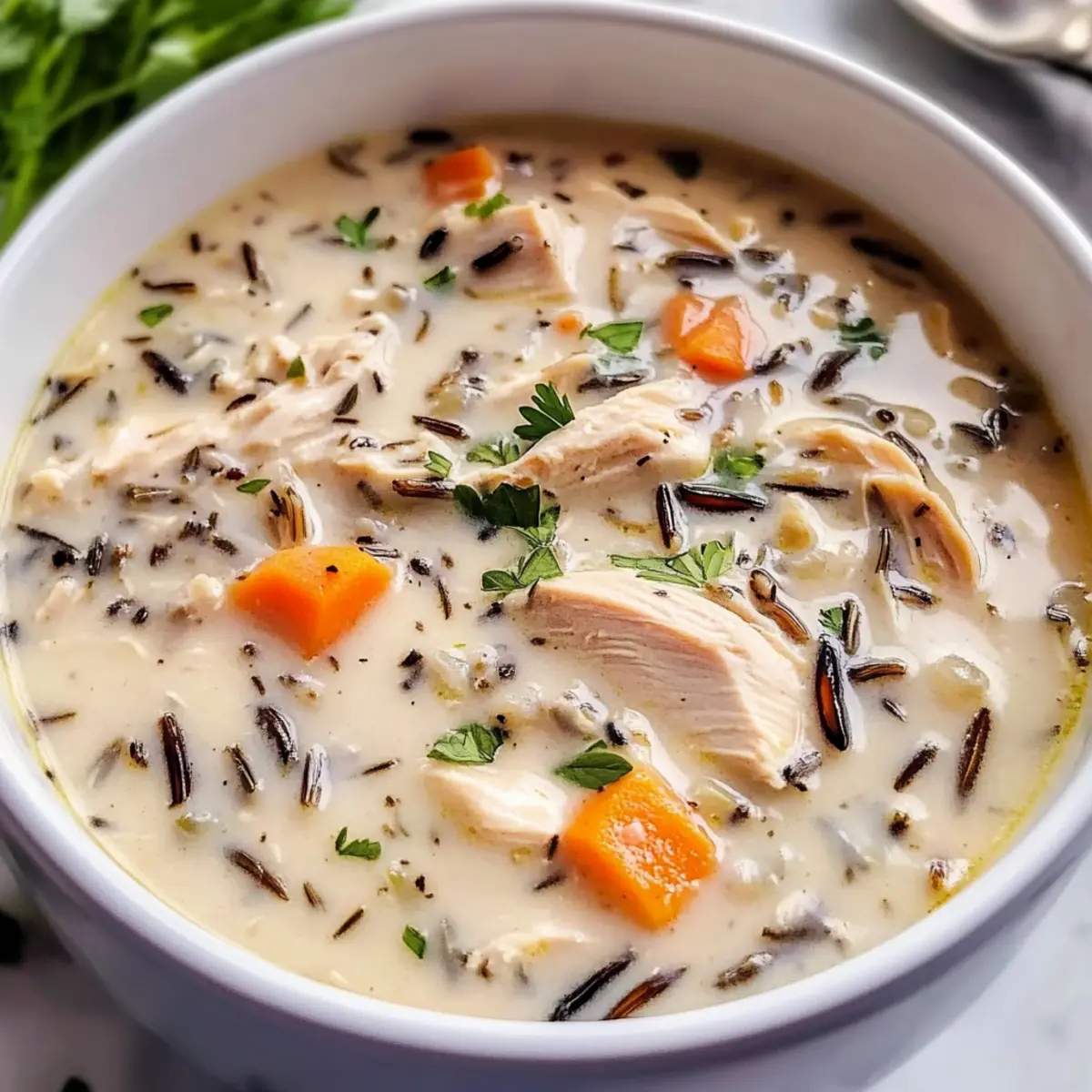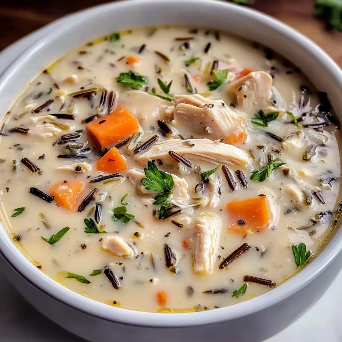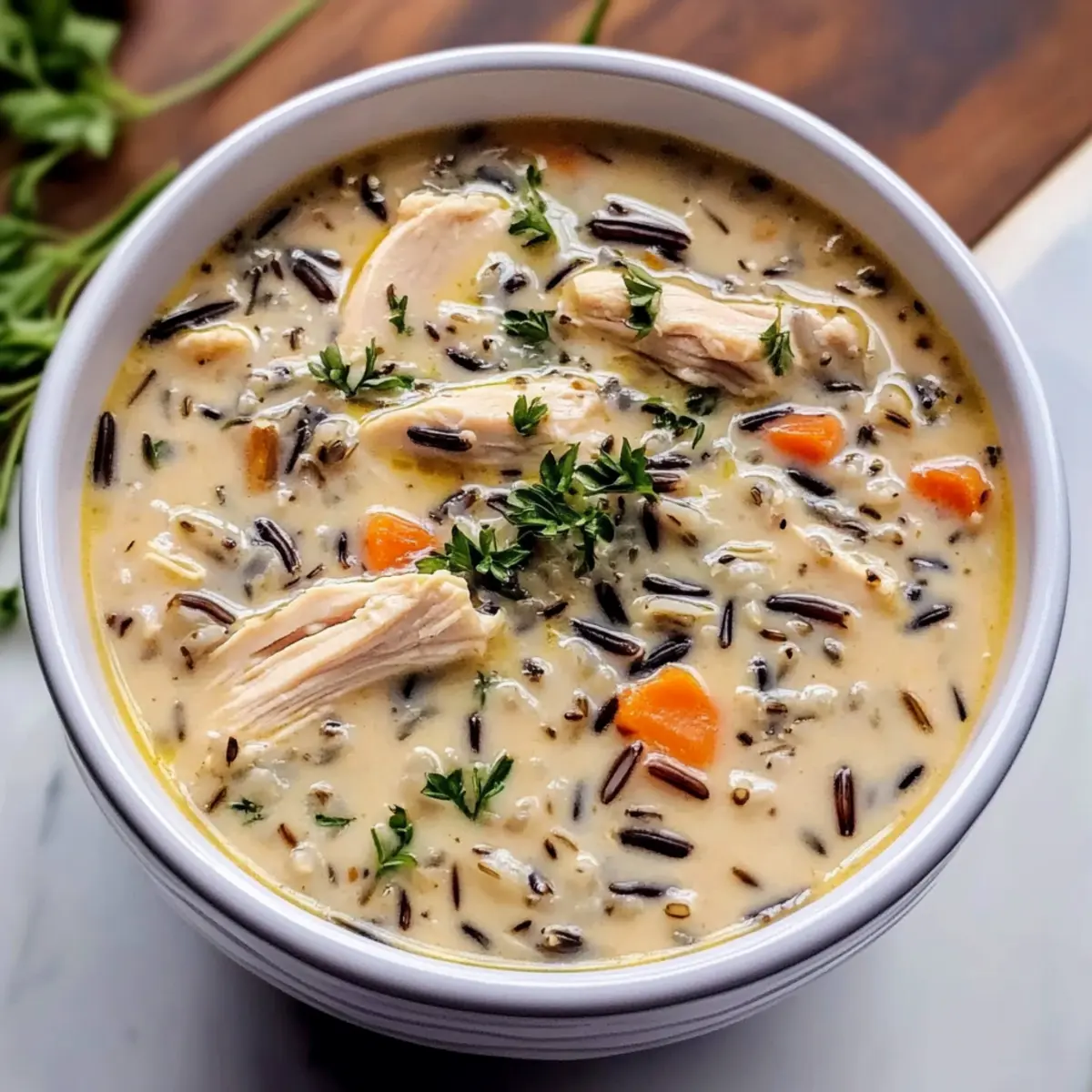 Ein kühlender Wind weht durch die Bäume, während ich mich in meiner warmen Küche um die Kochstelle versammle. Heute zaubere ich eine cremige Hähnchen- und Wildreissuppe, die nicht nur das Herz, sondern auch die Seele wärmt. Diese Suppe ist mehr als nur ein Gericht – sie ist wie eine Umarmung an einem kalten Abend, perfekt für gesellige Familientreffen oder entspannte Abende allein. Mit ihrem reichhaltigen, samtigen Geschmack und den zarten Hähnchenstücken, die sich harmonisch mit dem erdigen Wildreis verbinden, gehört dieses Rezept zu den wahren Komfortspeisen. Ob du ein erfahrener Hobbykoch oder auf der Suche nach einer schnellen und schmackhaften Lösung bist, diese Suppe wird dich begeistern. Bereit für eine kulinarische Umarmung? Warum wirst du diese Suppe lieben? Wärmender Komfort: Diese cremige Hähnchen- und Wildreissuppe ist der Inbegriff von Gemütlichkeit und perfekt für kalte Tage. Einfach zu machen: Die Zubereitung ist simpel, sodass selbst Kochanfänger sich zuerst daran versuchen können. Vielfältige Variationen: Du kannst ganz einfach das Hähnchen durch Gemüse ersetzen oder frische Kräuter hinzufügen, um neue Geschmäcker zu entdecken. Nährstoffreich: Mit zartem Hähnchen und erdigen Wildreis bietet die Suppe eine köstliche Möglichkeit, sich gesund zu ernähren und dennoch den vollen Geschmack zu genießen. Kräftige Aromen: Die Kombination aus Sahne, Gewürzen und frischem Gemüse sorgt für einen unvergleichlichen Genuss, der deine Gäste begeistern wird. Mach dich bereit, mit einer Portion Kuschelsuppe Freude in deine Küche zu bringen! Cremige Hähnchen- und Wildreissuppe Zutaten • Um sicherzustellen, dass du alles für deine köstliche cremige Hähnchen- und Wildreissuppe hast, hier die Zutaten im Detail: Für die Suppe Ungekochter Wildreis-Mix – Gibt der Suppe einen nussigen Geschmack und eine angenehme Textur. Substitution: Jede Mischung aus Wild- und Naturreis eignet sich hervorragend. Zwiebel, gehackt – Sorgt für eine süße und tiefgründige Basis. Hinweis: Verwende jede Zwiebelvariante, die du zur Hand hast. Karotten, gewürfelt – Verleiht der Suppe sowohl Süße als auch Farbe. Substitution: Petersilienwurzel kann für einen anderen Geschmack verwendet werden. Sellerie, gewürfelt – Fügt Crunch und Aroma hinzu. Hinweis: Achte darauf, ihn fein zu würfeln, damit er gleichmäßig gart. Butter – Sorgt für Reichhaltigkeit und hilft beim Anbraten des Gemüses. Substitution: Olivenöl kann für eine milchfreie Option verwendet werden. Knoblauch, gehackt – Intensiviert den Geschmack mit seinen aromatischen Eigenschaften. Hinweis: Frischer Knoblauch ist ideal; Knoblauchpulver kann im Notfall substituiert werden. Niedrignatron-Hühnerbrühe – Bildet die Basis der Suppe. Substitution: Gemüsebrühe für eine vegetarische Version. Getrocknete Kräuter (Thymian, Majoran, Salbei, Rosmarin) – Bringt herzliche Aromen in die Suppe. Substitution: Frische Kräuter können getrocknete ersetzen; verwende die dreifache Menge. Hähnchenbrustfilets, ohne Haut – Bietet die Hauptproteinquelle. Hinweis: Übriges, gekochtes Hähnchen ist ebenfalls eine tolle Option; füge es am Ende hinzu, um zarte Stücke zu erhalten. Allzweckmehl – Wird verwendet, um die Suppe zu binden. Substitution: Maisstärke oder glutenfreies Mehl können ebenfalls zum Eindicken eingesetzt werden. Milch – Verleiht der Suppenbasis Cremigkeit. Substitution: Pflanzliche Milch für eine milchfreie Variante. Obers (Sahne) – Sichert die Reichhaltigkeit und sorgt für ein luxuriöses Mundgefühl. Hinweis: Halbe-Halbe kann als leichtere Option verwendet werden. Zitronenschale – Belebt das Geschmacksprofil. Substitution: Ein Spritzer Zitronensaft kann ebenfalls verwendet werden. Bereite dich auf eine köstliche und herzhafte Erfahrung mit dieser cremigen Hähnchen- und Wildreissuppe vor! Schritt-für-Schritt-Anleitung für Cremige Hähnchen- und Wildreissuppe Step 1: Wildreis kochen Koche den Wildreis gemäß den Anweisungen auf der Verpackung, in der Regel liegt die Kochzeit bei 45 Minuten. Verwende dafür einen mittelgroßen Topf mit ausreichend Wasser. Achte darauf, dass der Reis weich und leicht aufgeplustert ist, dann stell ihn beiseite, um ihn später in die cremige Hähnchen- und Wildreissuppe zu geben. Step 2: Gemüse anbraten Erhitze in einem großen Topf 1 Esslöffel Butter bei mittlerer Hitze. Füge die gehackte Zwiebel, Karotten und Sellerie hinzu und dünste das Gemüse für etwa 4 Minuten, bis es weich und leicht goldbraun ist. Rühre gelegentlich um, damit nichts anbrennt, und genieße den angenehmen Duft, der sich entfaltet. Step 3: Knoblauch hinzufügen Gib den gehackten Knoblauch zum Gemüse in den Topf und brate ihn für weitere 30 Sekunden an. Rühre kräftig um, damit sich das Aroma entfaltet, und achte darauf, dass der Knoblauch nicht anbrennt, da er sonst bitter wird. Dies fügt eine wunderbare Geschmacksnote zur Cremigen Hähnchen- und Wildreissuppe hinzu. Step 4: Brühe und Kräuter hinzufügen Gieße die niedrignatron Hühnerbrühe in den Topf und füge die getrockneten Kräuter wie Thymian, Majoran, Salbei und Rosmarin hinzu. Schmecke die Mischung leicht mit Salz und Pfeffer ab. Bring alles zum Kochen und reduziere dann die Hitze, um die Suppe bei schwacher Hitze für etwa 10 Minuten köcheln zu lassen. Step 5: Hähnchen kochen Addiere die Hähnchenbrustfilets in die köchelnde Brühe. Lasse das Ganze abgedeckt aufkochen. Reduziere die Hitze erneut und lass es 12–16 Minuten simmern, bis das Hähnchen vollständig durchgegart und innen nicht mehr rosa ist. Überprüfe die Konsistenz, und der Duft wird dich verzaubern. Step 6: Hähnchen zerkleinern Nimm das Hähnchen aus dem Topf und lasse es 5 Minuten abkühlen. Zerkleinere es dann in mundgerechte Stücke, die du später in die cremige Hähnchen- und Wildreissuppe zurückgeben wirst. So erhältst du perfekt zarte Hähnchenstücke, die sich wunderbar im Gericht verteilen. Step 7: Roux zubereit