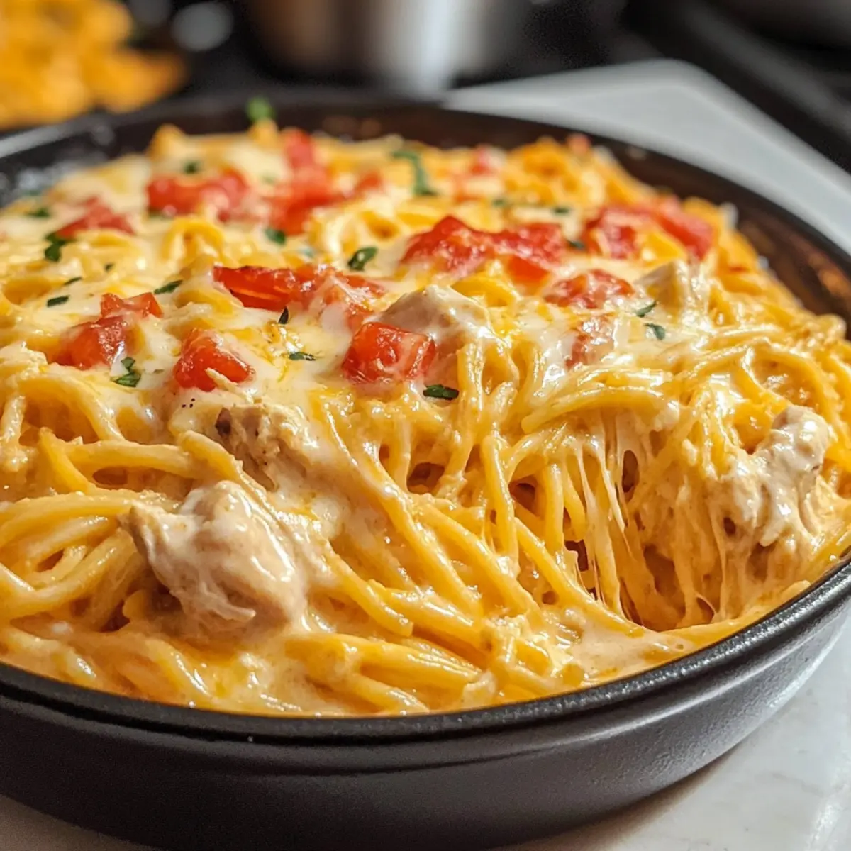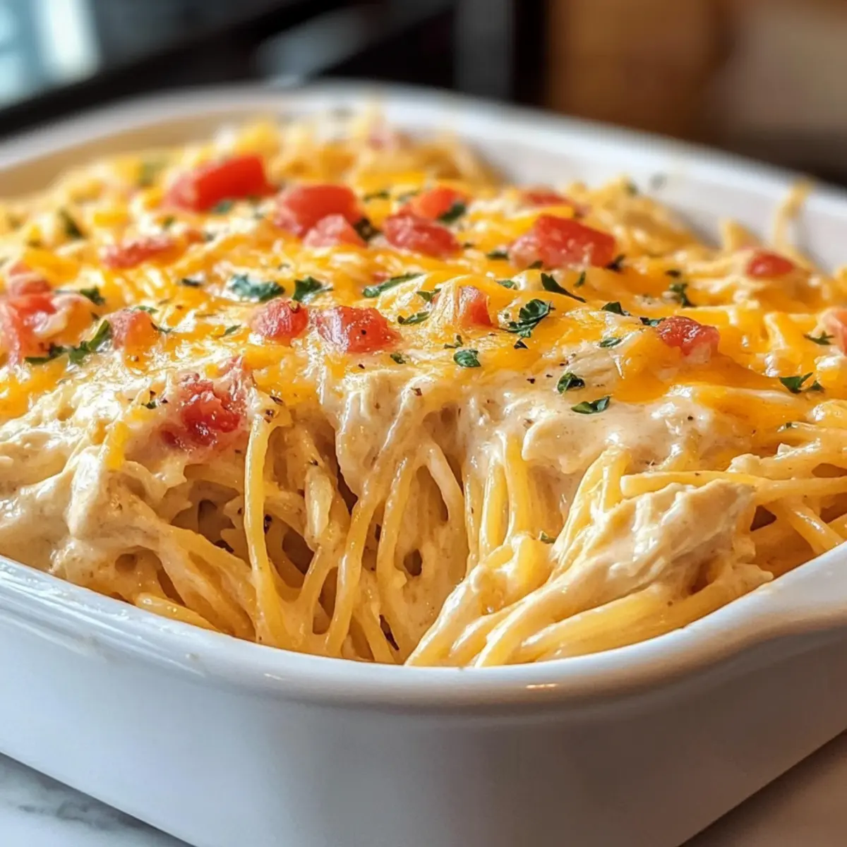 Zuerst hörte ich das verlockende Zischen der Spaghetti, die im Wasser köcheln, während sich der Knistern einer köstlichen Sauce im Hintergrund ausbreitete. Heute präsentiere ich euch meine Cremigen Hähnchen-Spaghetti mit Rotel – ein Gericht, das den Alltag in ein herzhaftes Fest verwandelt. Wenn ihr an einem stressigen Wochentag ein schnelles, kindgerechtes Essen zaubern möchtet, ist dieses Rezept genau das Richtige für euch. Mit nur einem Topf und einer zarten, cremigen Mischung aus Hähnchen und würzigen Tomaten, sorgt es nicht nur für ein einfaches Cleanup, sondern auch für ein Lächeln auf den Gesichtern aller Esser. Und das Beste? Ihr könnt das Rezept ganz nach euren Wünschen anpassen! Seid ihr bereit, in die Welt der Aromen einzutauchen und eure Familie zu beeindrucken? Warum werden sie dieses Rezept lieben? Einfachheit in Perfektion: Mit nur einem Topf ist die Zubereitung ein Kinderspiel. Herzhafter Geschmack: Die Mischung aus würzigen Tomaten und cremigem Hähnchen sorgt für ein unverwechselbares Geschmackserlebnis. Vielseitig anpassbar: Egal ob mit Fettuccine oder glutenfreier Pasta, dieses Gericht lässt sich leicht variieren, sodass es jedem schmeckt. Familienfreundlich: Die Kinder werden die cremige Textur lieben und die Erwachsenen schätzen die unkomplizierte Zubereitung. Schnell und zeitsparend: Perfekt für stressige Wochentage, bei denen wenig Zeit zum Kochen bleibt. Dieses Rezept wird garantiert zum neuen Favoriten in eurer Küche! Cremige Hähnchen-Spaghetti Zutaten • Dieses Rezept der cremigen Hähnchen-Spaghetti mit Rotel ist vollmundig und einfach zuzubereiten! Für die Basis Gekochtes Hähnchen – bietet Protein und Substanz; Rotisserie-Hähnchen ist eine großartige Zeitersparnis. Spaghetti-Nudeln – bilden das herzhafte Fundament; Fettuccine oder Penne sind ebenfalls geeignet. Hühnchenbrühe – sorgt für Feuchtigkeit und Tiefe; Gemüsebrühe funktioniert ebenfalls gut. Für die cremige Sauce Hühnchensuppe – verleiht cremigen Genuss; eine cremige Champignonsuppe sorgt für eine schmackhafte Wendung. Champignoncremesuppe – verstärkt die reichhaltige Textur; probiere alternative Suppen für verschiedene Aromen. Sauerrahm – bringt Cremigkeit und einen Hauch von Säure; griechischer Joghurt ist eine leichtere Alternative. Für den Würze Knoblauchpulver – sorgt für zusätzlichen Geschmacksboost; frischer gehackter Knoblauch bringt mehr Intensität. Zwiebelpulver – fügt herzhafte Noten hinzu; angedünstete frische Zwiebeln können den Geschmack verbessern. Salz – hebt den Gesamteindruck hervor; nach Geschmack anpassen. Schwarzer Pfeffer – fügt subtile Schärfe hinzu; weglassen für mildere Geschmäcker. Rotel-Tomaten – bringen Säure und Würze; du kannst jede Marke von gewürzten Dosen-Tomaten verwenden. Für das Topping Geriebener Cheddar-Käse – schmilzt wunderbar und macht das Gericht noch leckere; verwende für einen Extra-Pikant Pfefferjack-Käse. Schritt-für-Schritt-Anleitung für Cremige Hähnchen-Spaghetti mit Rotel Step 1: Ofen vorheizen Heize deinen Ofen auf 175°C (350°F) vor und fette eine 23×33 cm große Auflaufform leicht ein, damit nichts anhaftet. Während der Ofen aufheizt, kannst du alle Zutaten vorbereiten und die Vorfreude auf die köstlichen Cremigen Hähnchen-Spaghetti mit Rotel steigern. Step 2: Nudeln kochen Bringe in einem großen Topf ausreichend gesalzenes Wasser zum Kochen und füge die Spaghetti-Nudeln hinzu. Koche sie für 8-10 Minuten, bis sie al dente sind. Achte darauf, sie rechtzeitig abzuschütten und warm zu halten, damit sie in der nächsten Phase nicht aneinanderkleben. Step 3: Cremige Sauce zubereiten Vermische in einer großen Schüssel die Hühnchenbrühe, den Sauerrahm, die Hühnchencremesuppe und die Champignoncremesuppe. Füge die abgetropften Rotel-Tomaten hinzu und würze die Mischung mit Knoblauchpulver, Zwiebelpulver, Salz und schwarzem Pfeffer. Verquirle alles gut, bis eine glatte Sauce entsteht. Step 4: Zutaten kombinieren Gib das zerkleinerte Hähnchenfleisch und die warmen Spaghetti in die Schüssel mit der cremigen Sauce. Füge eine Tasse geriebenen Cheddar-Käse hinzu und hebe alles vorsichtig unter, bis die Nudeln und das Hähnchen gleichmäßig mit der Sauce überzogen sind. Step 5: Mischung verteilen Übertrage die Mischung in die vorbereitete Auflaufform und verteile sie gleichmäßig, damit sich die Aromen gut vermischen können. Achte darauf, dass die Ecken und Kanten ebenfalls mit der leckeren Mischung gefüllt sind, um ein tolles Ergebnis bei den Cremigen Hähnchen-Spaghetti mit Rotel zu erzielen. Step 6: Käse hinzufügen Streue den restlichen geriebenen Cheddar-Käse großzügig über die oberste Schicht der Mischung in der Auflaufform. Der Käse schmilzt während des Backens und sorgt für eine köstliche, goldene Kruste, die das Gericht verleiht. Step 7: Backen Schiebe die Auflaufform in den vorgeheizten Ofen und backe die Cremigen Hähnchen-Spaghetti mit Rotel für 30-35 Minuten. Achte darauf, dass der Käse geschmolzen, blasend und goldbraun ist, bevor du das Gericht herausnimmst. Step 8: Auskühlen lassen Lass die Auflaufform nach dem Backen für etwa 5 Minuten stehen, damit sich die Aromen setzen können und das Gericht etwas abkühlt. Danach kannst du deine Cremigen Hähnchen-Spaghetti mit Rotel servieren und genießen! Was serviert man zu Cremigen Hähnchen-Spaghetti mit Rotel? Ein herzhaftes Gericht bringt immer gute Laune – ergänze es mit passenden Beilagen für ein rundum perfektes Essen. Knuspriges Knoblauchbrot: Perfekt, um die köstliche, cremige Sauce aufzutunken. Der aromatische Duft wird eure Küche durchfluten. Frischer Gartensalat: Ein leichter Salat mit einer spritzigen Vinaigrette bietet einen erfrischenden Kontrast zur Wärme des Auflaufs. Leicht und knusprig, ideal für einen gesunden Ausgleich! Grünes Gemüse: Gedämpfter Brokkoli oder grüne Bohnen sorgen für eine wunderbare Frische und eine schöne Farbvielfalt auf dem Teller