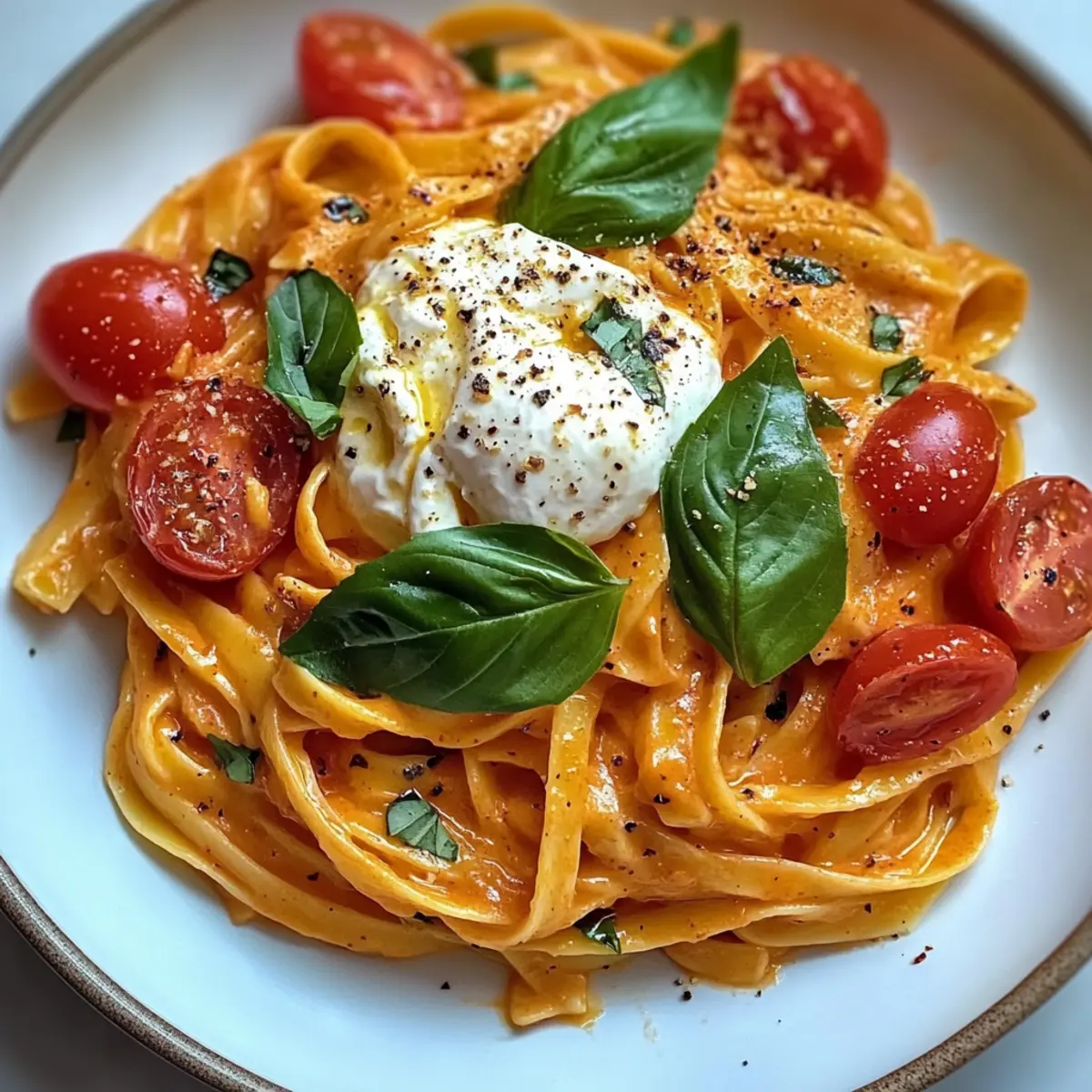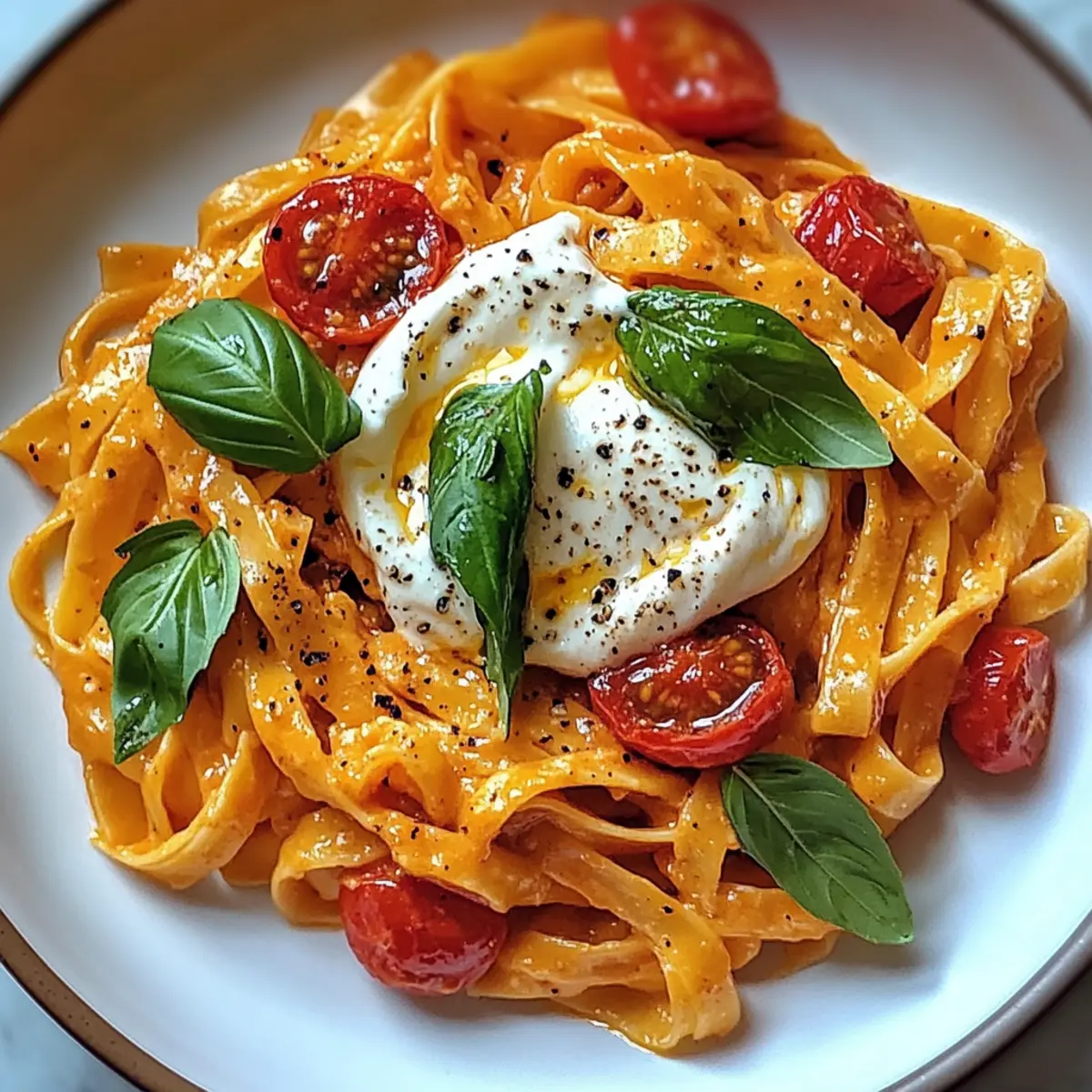 Ein freudiger Duft von frisch gekochten Tomaten und geschmolzener Burrata durchströmte meine Küche, als ich mich entschied, die Cremige Tomaten-Burrata-Pasta in 30 Minuten zuzubereiten. Diese köstliche vegetarische Speise ist nicht nur schnell zubereitet, sondern auch eine echte Freude für den Gaumen. Sie vereint die süße Frische von Kirschtomaten mit der wunderbar cremigen Textur der Burrata und verwandelt jede Mahlzeit in ein tröstendes Erlebnis. Perfekt für hektische Wochentage oder besondere Anlässe, lässt sich dieses Rezept außerdem ganz nach deinem Geschmack anpassen! Suchst du nach einer einfachen Möglichkeit, den Pasta-Hunger zu stillen und gleichzeitig deine Lieben zu beeindrucken? Dann lass uns gemeinsam in die Welt dieser verführerischen Pasta eintauchen! Warum wirst du dieses Rezept lieben? Schlichtheit: Mit nur wenigen Zutaten ist die Zubereitung der cremigen Tomaten-Burrata-Pasta ein Kinderspiel! Jeder kann dieses Rezept meistern, egal ob Kochprofi oder Anfänger. Reiche Aromen: Die Kombination aus frischen Kirschtomaten und cremiger Burrata sorgt für einen geschmacklichen Höhepunkt, der alle begeistert. Flexibilität: Du kannst die Zutaten ganz nach deinem Geschmack anpassen, sei es mit frischem Gemüse oder verschiedenen Käsesorten. Probiere doch auch die Kombi mit Cremige Gnocchi Mit! Schnelligkeit: In weniger als 30 Minuten hast du ein köstliches Gericht auf dem Tisch – perfekt für stressige Abende! Für alle Anlässe: Ob für ein schnelles Abendessen oder ein festliches Essen mit Freunden, diese Pasta wird sicher zum Star des Abends! Cremige Tomaten-Burrata-Pasta Zutaten Für die Pasta Tagliatelle oder Farfalle – Wähle deine Lieblingsnudeln für die perfekte Textur. Kirschtomaten – Frische Tomaten sorgen für eine süße, aromatische Note. Für die Sauce Olivenöl – Verwende hochwertiges Olivenöl für den besten Geschmack. Knoblauch – Frischer Knoblauch bringt eine wunderbare Aroma-Ebene ein. Getrockneter Oregano – Fügt eine erdige Note hinzu; auch italienische Gewürzmischung ist eine gute Alternative. Salz & Pfeffer – Grundlegende Gewürze für die Geschmacksbalance; nach Belieben anpassen. Für den Belag Burrata – Diese cremige Köstlichkeit sorgt für eine luxuriöse Textur; frischer Mozzarella ist ein geeigneter Ersatz. Frisches Basilikum – Perfekt für eine farbenfrohe Garnitur; auch Petersilie oder Minze können verwendet werden. Parmesan – Optional für zusätzlichen Reichtum; Pecorino Romano ist ebenfalls passend. Schritt-für-Schritt-Anleitung für die Cremige Tomaten-Burrata-Pasta in 30 Minuten Schritt 1: Pasta kochen Bringe in einem großen Topf reichlich Salzwasser zum Kochen und koche die Tagliatelle oder Farfalle nach Packungsanweisung al dente für etwa 8-10 Minuten. Vor dem Abgießen bewahre eine Tasse des Nudelwassers auf, da es später zum Binden der Sauce hilfreich ist. Schritt 2: Tomaten vorbereiten Während die Pasta kocht, schneide die Kirschtomaten halbierend und stelle sie beiseite. Sie sollten prall und frisch sein, um das volle Aroma in der cremigen Tomatensauce zu gewährleisten. Schritt 3: Öl erhitzen Erhitze in einer großen Pfanne bei mittlerer Hitze etwa 2-3 Esslöffel Olivenöl, bis es heiß ist, aber nicht raucht. Achte darauf, dass die Pfanne groß genug ist, um die gesamte Pasta aufzunehmen, wenn es Zeit ist, die beiden Komponenten zu kombinieren. Schritt 4: Knoblauch anbraten Füge den fein gehackten oder gepressten Knoblauch in das heiße Öl und sautierte ihn für etwa 1-2 Minuten. Achte darauf, dass der Knoblauch goldbraun wird, aber nicht verbrennt, da dies einen bitteren Geschmack hinterlassen kann. Schritt 5: Tomaten hinzufügen Gib die halbierten Kirschtomaten in die Pfanne und koche sie etwa 5-7 Minuten lang, bis sie weich und leicht karamellisiert sind. Rühre gelegentlich um, sodass sie gleichmäßig garen und ihren natürlichen Saft freisetzen. Schritt 6: Gewürze hinzufügen Würze die Tomatenmischung mit getrocknetem Oregano, Salz und Pfeffer nach Geschmack. Mische alles gründlich durch, damit sich die Aromen gut verbinden und die Sauce die perfekte Balance erhält. Schritt 7: Pasta vermengen Sobald die Pasta al dente ist und abgetropft wurde, gib sie in die Pfanne mit der Tomatensauce. Vermische alles gründlich, sodass die Pasta den köstlichen Tomatensaft aufnimmt und gleichmäßig ummantelt wird. Schritt 8: Burrata hinzufügen Zerreiße die Burrata währenddessen in große Stücke und lege sie auf die Pasta. Lass sie für ein bis zwei Minuten schmelzen, während du die Mischung leicht umrührst, sodass eine cremige Textur entsteht. Schritt 9: Garnieren und servieren Gib frische Basilikumblätter über die Pasta, um Farbe und Geschmack hinzuzufügen. Serviere die cremige Tomaten-Burrata-Pasta sofort, damit du die herrlich geschmolzene Burrata voll genießen kannst. Schritt 10: Optionales Finish Falls gewünscht, streue etwas frisch geriebenen Parmesan über die fertige Pasta, um zusätzlichen Reichtum hinzuzufügen. Lass deiner Kreativität freien Lauf und genieße dieses köstliche Gericht! Expert Tips für die Cremige Tomaten-Burrata-Pasta Hochwertige Zutaten wählen: Verwende frische, reife Kirschtomaten und qualitativ hochwertige Burrata, um den besten Geschmack zu erzielen. Knoblauch nicht verbrennen: Achte darauf, den Knoblauch nur kurz zu sautieren, damit er nicht bitter wird. Ein goldbraun gerösteter Knoblauch ist ideal. Pasta-Wasser nutzen: Wenn die Sauce zu dick erscheint, füge einen Schuss des zurückbehaltenen Nudelwassers hinzu, um die Cremige Tomaten-Burrata-Pasta perfekt zu binden. Variationen ausprobieren: Ergänze die Pasta mit frischem Gemüse oder verschiedenen Käsesorten für ein individuelles Geschmackserlebnis. Richtige Kochzeit beachten: Koche die Pasta bis sie al dente ist; so bleibt sie bei der Vermengung in der Sauce nicht übergart. Lagerungstipps für Cremige Tomaten-Burrata-Pasta Zimmertemperatur: Die Pasta sollte nicht länger als 2 Stunden b