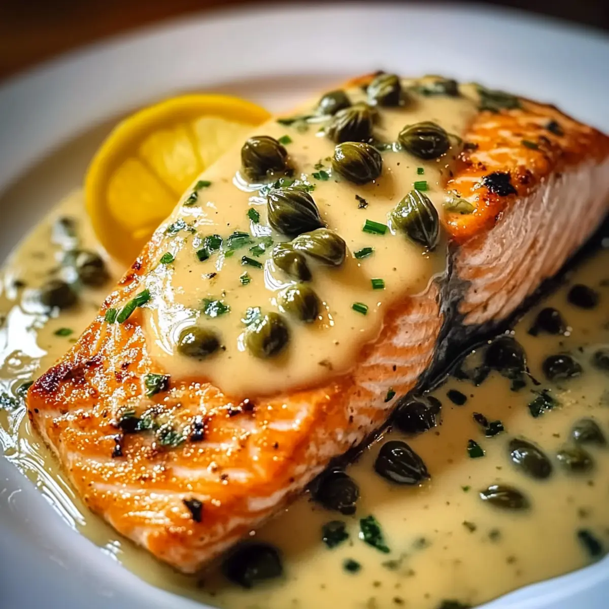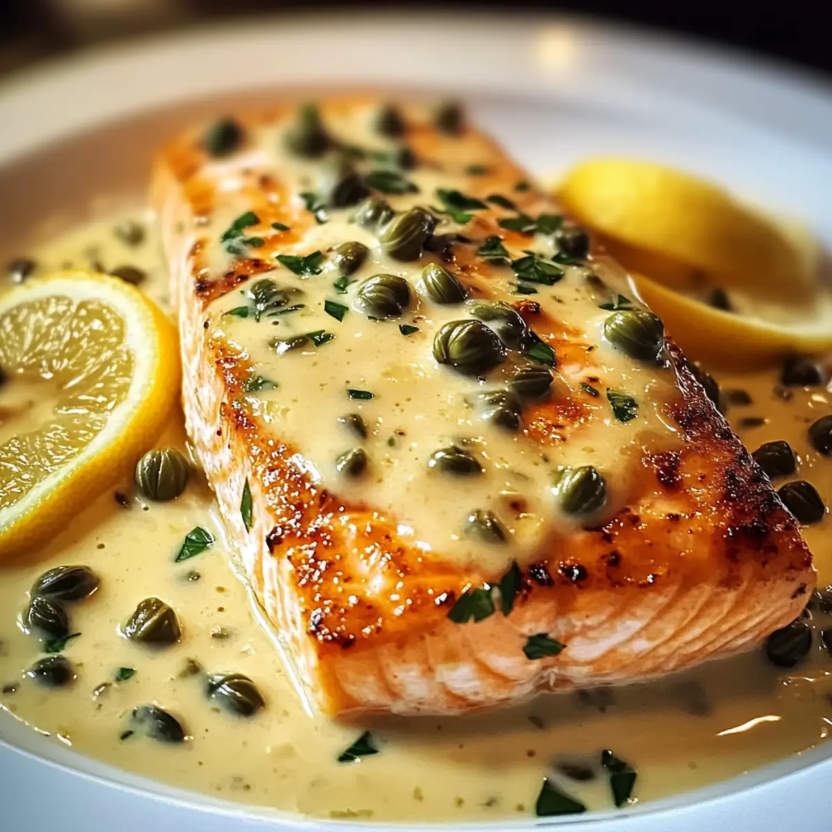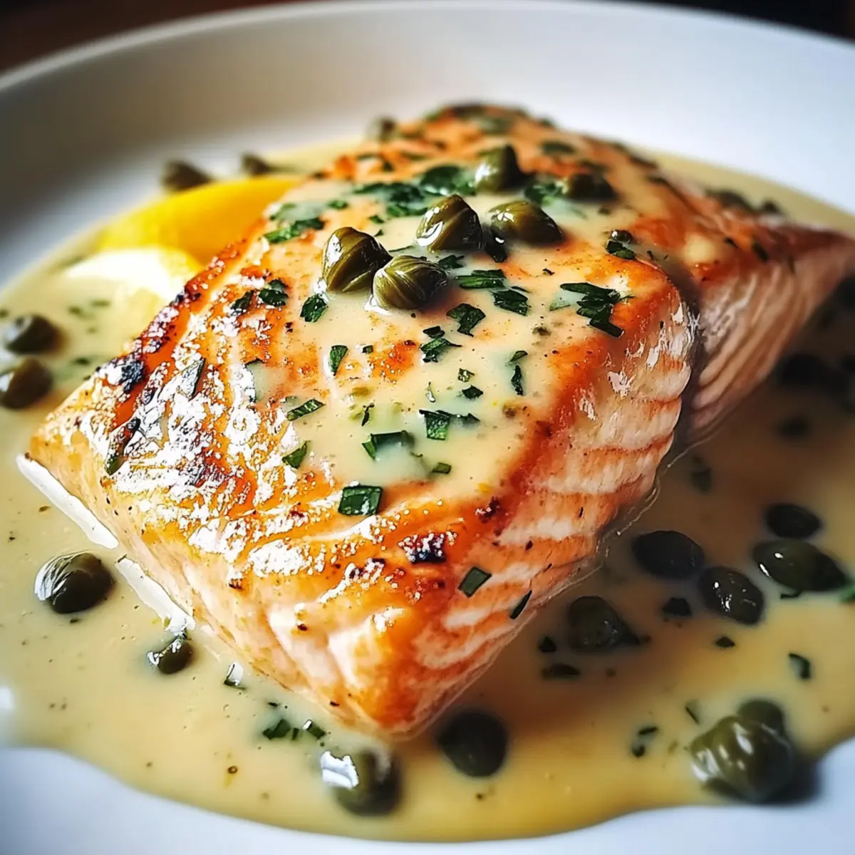Die sanfte Wärme der Küche umweht mich, während ich die leuchtenden Farben von frischem Lachs und saftigen Zitronen betrachte. Heute zaubere ich ein Gericht, das sowohl geschmacklich als auch in der Zubereitung begeistert: Cremiger Zitronen-Lachs Piccata. Diese elegante Speise vereint zarten, saftigen Lachs mit einer cremigen, zitronigen Sauce und verleiht jedem Abendessen einen Hauch von Raffinesse. In weniger als 40 Minuten auf den Tisch, ist dieses Rezept perfekt für alle, die sich nach einem köstlichen, selbstgemachten Essen sehnen, ohne stundenlang in der Küche zu stehen. Plus, die Möglichkeiten für leichtere Alternativen wie griechischen Joghurt sind eine gesunde Wendung, die auch deine Gäste beeindrucken wird. Bist du bereit, mit mir ins Abenteuer der Aromen einzutauchen? Warum ist Cremiger Zitronen-Lachs Piccata so besonders? Einfachheit und Schnelligkeit: In weniger als 40 Minuten zauberst du ein köstliches Gericht, das selbst an stressigen Tagen hochwertigen Genuss bietet. Geschmacksexplosion: Die Kombination aus zartem Lachs und einer erfrischenden, cremigen Zitronensauce bringt jeden Bissen zum Strahlen. Gesunde Alternativen: Mit griechischem Joghurt als Ersatz für Sahne kannst du das Gericht leichter gestalten, ohne den Geschmack zu opfern. Vielfältige Variationen: Ob du zufällig Vegetarier bist oder glutenfreie Optionen suchst, die Anpassungsmöglichkeiten sind nahezu unbegrenzt. Beeindruckende Präsentation: Serviere diesen Klassiker, und deine Gäste werden denken, du hast Stunden in der Küche verbracht, während du in Wirklichkeit nur diese einfache Zubereitung genutzt hast! Cremiger Zitronen-Lachs Piccata Zutaten • Hinweis: Entdecke, wie einfach es ist, dieses köstliche Gericht mit ausgewählten Zutaten zuzubereiten. Für den Lachs • Lachsfilets – Diese sind die Hauptproteinquelle und liefern einen vollen Geschmack; verwende hautlose Filets für gleichmäßiges Garen. • Olivenöl – Das ideale Fett zum Sautieren des Lachses; kannst auch Avocadoöl verwenden, um einen anderen Geschmack zu erzielen. • Salz und Pfeffer – Essentielle Gewürze für die Würze des Lachses; verwende Meersalz für eine erdige Note. Für die Sauce • Ungesalzene Butter – Verleiht der Sauce eine cremige Textur; kann teilweise durch Ghee ersetzt werden, um eine laktosefreie Variante zu bieten. • Knoblauch – Sorgt für aromatische Tiefe; frischen Knoblauch verwenden, für einen stärkeren Geschmack. • Hühnerbrühe – Bildet die Geschmacksbasis der Sauce; achte darauf, eine natriumarme Brühe zu wählen, um den Salzgehalt zu kontrollieren. • Frischer Zitronensaft – Sorgt für die nötige Säure und Frische; frisch gepresster Saft ist optimal. • Schlagsahne – Für die cremige Konsistenz der Sauce; durch griechischen Joghurt ersetzen, um eine leichtere Variante zu kreieren. • Kapern – Fügen eine salzige, würzige Komponente hinzu; vorher abspülen, um die Salzigkeit zu reduzieren. Variationen • Gemüse – Für mehr Nährstoffe; füge Spinat, Kirschtomaten oder Spargel hinzu. • Glutenfrei – Stelle sicher, dass die Hühnerbrühe glutenfrei ist und serviere mit glutenfreien Beilagen. • Dairy-Free – Verwende Kokoscreme anstelle von Schlagsahne für eine laktosefreie Version. Mit diesen sorgfältig ausgewählten Zutaten wirst du eine Vielzahl von Geschmäckern erleben können, die diesen Cremigen Zitronen-Lachs Piccata so besonders machen! Schritt-für-Schritt-Anleitung für Cremiger Zitronen-Lachs Piccata Step 1: Lachs vorbereiten Würze die hautlosen Lachsfilets großzügig mit Salz und frisch gemahlenem schwarzem Pfeffer. Lasse die Filets einige Minuten ruhen, während du die anderen Zutaten vorbereitest. Diese Schritte helfen, die Aromen zu intensivieren und sorgen dafür, dass der Lachs beim Braten köstlich schmeckt. Step 2: Pfanne erhitzen Erhitze in einer großen, beschichteten Pfanne bei mittelhoher Hitze etwa zwei Esslöffel Olivenöl. Achte darauf, dass das Öl gut erhitzt ist, bevor du den Lachs hinzufügst. Dies sorgt dafür, dass die Filets eine schöne, goldbraune Kruste bekommen und nicht am Boden der Pfanne kleben bleiben. Step 3: Lachs braten Lege die gewürzten Lachsfilets vorsichtig in die heiße Pfanne und brate sie für etwa 4 bis 5 Minuten pro Seite, bis sie goldbraun sind und sich leicht mit einer Gabel zerteilen lassen. Entferne die Filets anschließend aus der Pfanne und lege sie auf einen Teller, während du die Sauce zubereitest. Step 4: Sauce zubereiten Reduziere die Hitze in der Pfanne auf mittlere Stufe und füge zwei Esslöffel ungesalzene Butter hinzu. Lass die Butter schmelzen und füge dann zwei gehackte Knoblauchzehen hinzu. Sauté den Knoblauch für etwa eine Minute, bis er duftet, aber nicht braun wird, um bitteren Geschmack zu vermeiden. Step 5: Flüssigkeiten hinzufügen Gieße 1 Tasse Hühnerbrühe und den frisch gepressten Saft von zwei Zitronen in die Pfanne. Verwende einen Holzlöffel, um die bräunlichen Stücke vom Boden der Pfanne abzukratzen, und lasse die Mischung 2 bis 3 Minuten köcheln. Dies wird die Aromen intensivieren und eine köstliche Basis für die Sauce schaffen. Step 6: Sauce vollenden Rühre 1/2 Tasse Schlagsahne und 2 Esslöffel Kapern in die Sauce ein. Lasse die Mischung weitere 2 bis 3 Minuten köcheln, bis sie leicht eindickt. Achte darauf, gelegentlich umzurühren, damit die Sauce nicht ansetzt. Diese cremige Zitronen-Sauce ist der perfekte Begleiter für den Lachs. Step 7: Lachs kombinieren Lege die gebratenen Lachsfilets zurück in die Pfanne und wende sie vorsichtig in der Sauce, damit sie schön umhüllt werden. Lass alles zusammen noch eine Minute erhitzen, sodass der Lachs warm wird und die Aromen verschmelzen. Der Cremige Zitronen-Lachs Piccata ist jetzt bereit zum Servieren. Expertentipps für Cremiger Zitronen-Lachs Piccata Frischer Lachs: Verwende immer frischen Lachs für das beste Geschmackserlebnis; tiefgefrorener Lachs kann die Textur beeinträchtigen. Garzeit im B