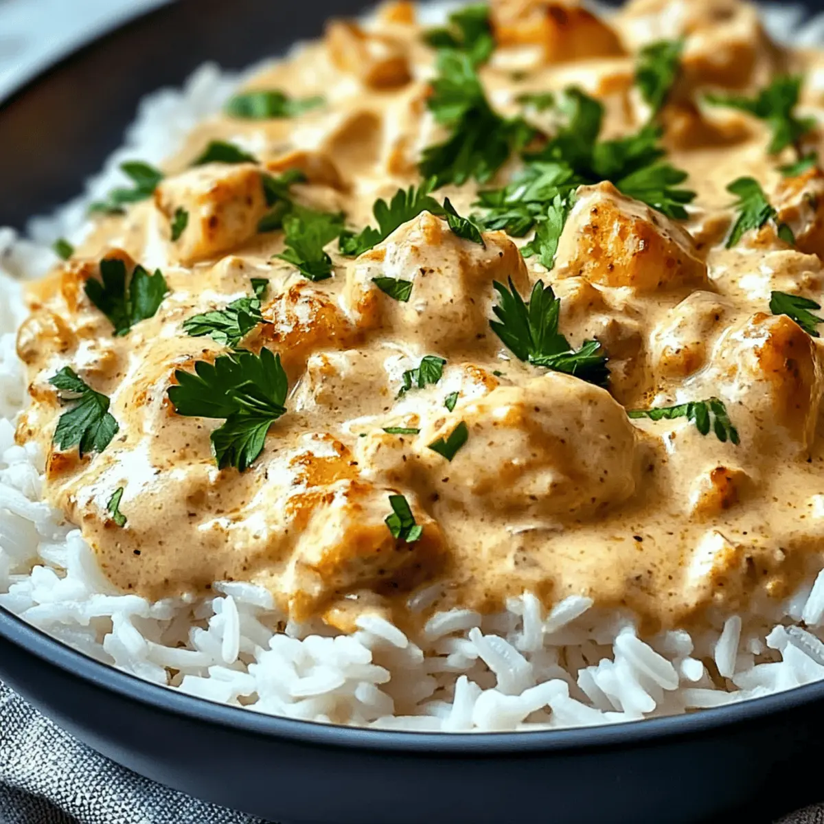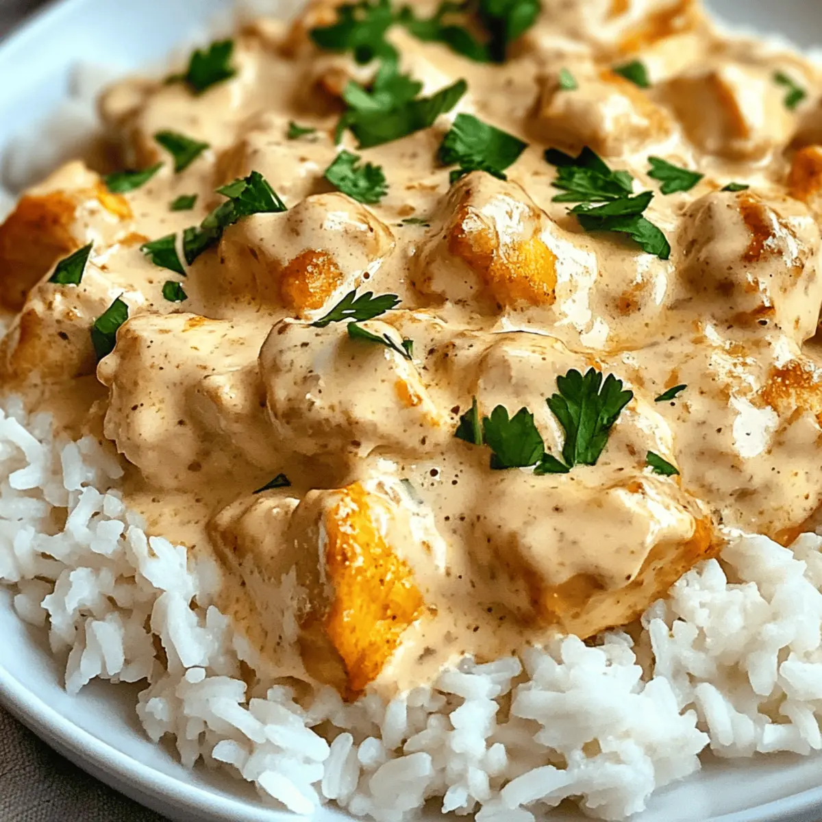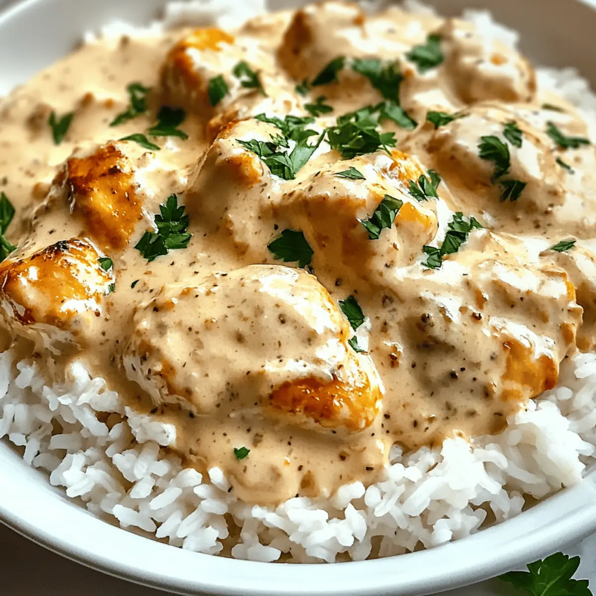 8. Serviere den fertig gekochten Reis mit dem cremigen Hähnchen und garnieren mit frisch gehackter Petersilie.
