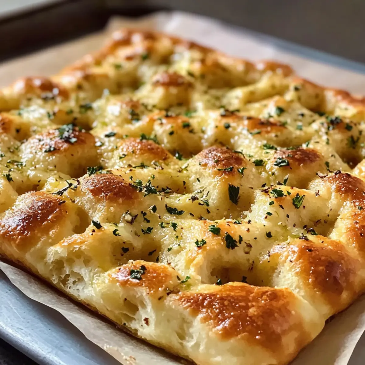 Eine frisch gebackene Focaccia, die mit aromatischer Knoblauchbutter verfeinert ist, ist wie ein Stück Italien, das direkt in deine Küche einzieht. Diese einfache Knoblauchbutter-Focaccia überzeugt durch ihre luftige Textur und den intensiven Geschmack – perfekt als Begleiter zu deinen Lieblingsgerichten oder einfach als leckere Snack-Option. Sie ist nicht nur schnell zubereitet, sondern auch ideal für anstrengende Wochentage, wenn du etwas Warmes und Hausgemachtes zaubern möchtest. Mit minimalem Aufwand kannst du ein beeindruckendes Ergebnis erzielen, das selbst deine Gäste begeistern wird. Neugierig, wie du diese köstliche Focaccia zubereiten kannst? Lass uns gleich loslegen! Warum ist diese Focaccia ein Muss? Einfachheit: Die Zubereitung ist unkompliziert, sodass auch Koch-Neulinge mühelos eine köstliche Focaccia erschaffen können. Aromatischer Genuss: Die Kombination aus Knoblauch und Butter verleiht jedem Bissen einen unverwechselbaren Geschmack, der garantiert für Begeisterung sorgt. Vielseitigkeit: Du kannst die Focaccia nicht nur als Beilage zu Pasta oder Suppen genießen, sondern sie eignet sich auch perfekt für Sandwiches oder belegte Snacks. Schnell zubereitet: Mit nur wenigen Zutaten und minimaler Vorbereitungszeit kannst du in kürzester Zeit ein hausgemachtes Brot zaubern. Geselligkeit: Diese Focaccia ist perfekt für gesellige Abende oder Dinnerpartys – sie zaubert ein Stück italienisches Flair auf den Tisch und wird deine Gäste überzeugen! Für einen zusätzlichen Kick kannst du dieses Honig Feta Gourmetgenuss Rezept als leckere Beilage ausprobieren! Einfache Knoblauchbutter-Focaccia Zutaten Für den Teig Allzweckmehl – Essentiell für Struktur und eine angenehme Kaubarkeit; kann durch Brotmehl ersetzt werden für mehr Biss. Warmes Wasser – Aktiviert die Hefe; sollte eine Temperatur von 38-43°C haben, um die Hefe nicht zu töten. Aktive Trockenhefe – Das Treibmittel für den Aufstieg; sicherstellen, dass sie schäumt, bevor du sie verwendest. Honig oder Zucker – Versorgt die Hefe mit Nahrung für die Fermentation; beide sind austauschbar. Salz – Verstärkt den Geschmack und reguliert die Hefetätigkeit. Extra natives Olivenöl – Fügt Feuchtigkeit und Geschmack hinzu; unerlässlich für das Fetten der Form und als Topping. Für die Knoblauchbutter Gehackter Knoblauch – Verleiht der Butter ein intensives Aroma; frischer Knoblauch ist am besten, aber auch Knoblauchpulver funktioniert in einer Notlage. Salzbutter – Sorgt für einen reichen Geschmack; bei Bedarf kann ungesalzene Butter verwendet werden, einfach zusätzliches Salz hinzufügen. Gehackte Petersilie – Fügt Frische zur Knoblauchbutter hinzu; kann weggelassen werden, wenn nicht verfügbar. Geriebener Parmesan – Ein würziger Abschluss für den Teig; jede Hartkäsesorte kann als Alternative genutzt werden. Diese einfache Knoblauchbutter-Focaccia ist nicht nur eine köstliche Beilage, sondern auch der perfekte Snack! Schritt-für-Schritt-Anleitung für Einfache Knoblauchbutter-Focaccia Step 1: Hefe aktivieren Mische das warme Wasser mit Honig oder Zucker in einer Schüssel und rühre gut um. Füge die aktive Trockenhefe hinzu und lasse die Mischung für etwa 10 Minuten stehen, bis sie schaumig ist. Dies zeigt dir, dass die Hefe aktiv ist und bereit, den Teig aufgehen zu lassen. Step 2: Teig mischen In einer großen Schüssel das Allzweckmehl und das Salz vermengen. Gieße die Hefe-Mischung sowie das Olivenöl dazu und rühre alles mit einem Holzlöffel oder deiner Hand, bis ein klebriger Teig entsteht. Decke die Schüssel mit einem sauberen Tuch ab und lasse den Teig etwa 1-3 Stunden an einem warmen Ort aufgehen, bis er sich verdoppelt hat. Step 3: Knoblauchbutter vorbereiten Schmelze in einem kleinen Topf die Salzbutter bei niedriger Hitze. Füge den gehackten Knoblauch und die gehackte Petersilie hinzu und lasse alles unter ständigem Rühren für 1-2 Minuten braten, bis der Knoblauch duftet, aber nicht bräunt. Diese aromatische Mischung wird später über die Focaccia gegossen. Step 4: Zutaten kombinieren Sobald der Teig aufgegangen ist, forme ihn vorsichtig mit deinen Händen und lasse die Luft heraus. Gieße die Knoblauchbutter über den Teig und falte ihn sanft ein, um die Aromen zu verteilen. Decke die Schüssel wieder ab und lasse den Teig für weitere 15 Minuten ruhen, damit er leicht aufgeht. Step 5: Teig formen Fette ein 9×13-Zoll-Blech mit Olivenöl ein. Übertrage den Teig auf das Blech und dehne ihn vorsichtig, bis er die gesamte Fläche ausfüllt. Bedecke das Blech erneut und lasse den Teig für etwa 45 Minuten bei Zimmertemperatur aufgehen, bis er sichtbar aufgegangen ist. Step 6: Focaccia backen Heize den Ofen auf 232°C (450°F) vor. Drücke sanft mit deinen Fingern in den Teig, um charakteristische Dellen zu erzeugen, und träufle nach Belieben etwas extra Olivenöl und die restliche Knoblauchbutter darüber. Backe die Focaccia für 18-22 Minuten, bis sie goldbraun und knusprig ist. Step 7: Abkühlen und Servieren Lasse die Focaccia nach dem Backen für 10-15 Minuten auf einem Gitterrost abkühlen. So kannst du sie leicht schneiden und servieren. Die Focaccia schmeckt warm am besten oder kann auch bei Zimmertemperatur genossen werden – eine wunderbare Ergänzung zu jedem Gericht oder einfach als Snack! Was man zu einfacher Knoblauchbutter-Focaccia serviert Lass dich von diesen köstlichen Begleitern inspirieren, während du das Aroma dieser himmlischen Focaccia in deinem Zuhause genießt. Frischer grüner Salat: Frische, knackige Blätter bringen eine schöne Textur und Leichtigkeit, die die Focaccia ergänzt. Herzhafte Tomatensuppe: Die wärmende, tomatige Suppe verbindet sich perfekt mit dem butterigen Geschmack der Focaccia, ein klassisches Duo. Gegrilltes Gemüse: Die Aromen von geröstetem Gemüse fügen eine rauchige Note hinzu, die einen tollen Kontrast zur Focaccia bietet. Antipasto-Teller: Oliven, Käse und eingelegtes Gemüse machen die Focacci