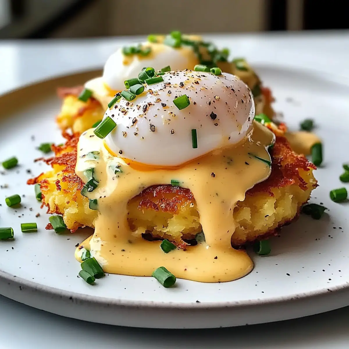 Einfache Latke Eggs Benedict kombiniert knusprige Kartoffel-Latkes mit perfekten pochierten Eiern und cremiger Hollandaise.