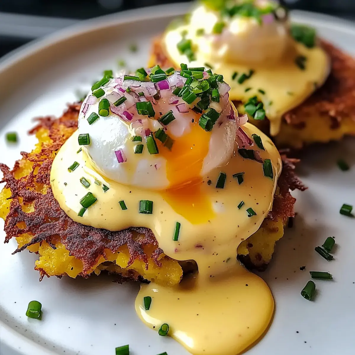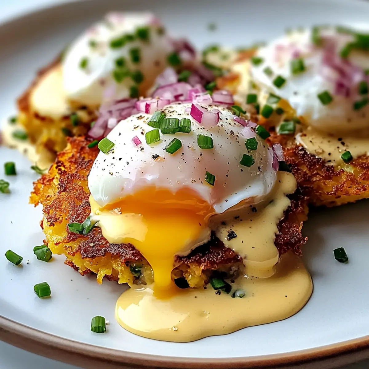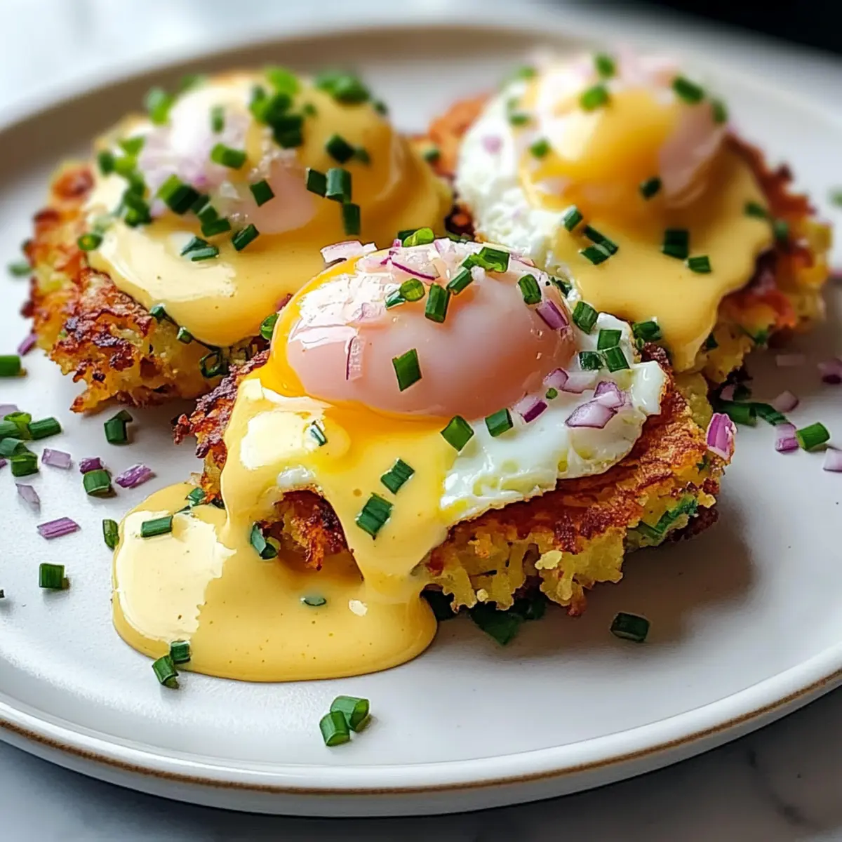 Stellen Sie sich vor, Sie stehen an einem sonnigen Sonntagmorgen in der Küche und der verlockende Duft von frisch gebratenen Kartoffel-Latkes erfüllt den Raum. Schauen Sie sich die perfekte Hochzeit dieser knusprigen latkes mit einem perfekt pochierten Ei und einer samtigen Hollandaise-Sauce an! Mein Rezept für Einfache Latke Eier Benedict ist die ideale Antwort auf das Bedürfnis nach einem herzhaften Brunch, der einfach zuzubereiten ist. Diese Kombination aus knusprigen und cremigen Texturen wird sowohl Ihre Familie als auch Freunde begeistern, während Sie gleichzeitig eine erfrischende Abwechslung zu klassischen Eier Benedict bieten. Wer könnte da widerstehen? Lassen Sie uns gemeinsam in diese köstliche Kreation eintauchen! Warum werden Sie dieses Rezept lieben? Einfachheit: Mit wenigen grundlegenden Zutaten und einem unkomplizierten Prozess ist dieses Rezept für Einfache Latke Eier Benedict perfekt für Kochanfänger und erfahrene Köche gleichermaßen. Aromen: Die Kombination aus knusprigen Latkes, einem saftigen, pochierten Ei und der cremigen Hollandaise schafft ein unvergleichliches Geschmackserlebnis, das garantiert den Gaumen erfreut. Kreativität: Variieren Sie das Rezept nach Belieben! Ob mit geräuchertem Lachs, Avocado oder sogar Spinat – die Möglichkeiten sind endlos. Zeitersparnis: Bereiten Sie den Latke-Teig im Voraus vor und genießen Sie ein stressfreies Brunch, das Sie und Ihre Gäste lieben werden. Diese Rezepte für eine Mischung aus frischen Zutaten sorgen stets für einen Wow-Effekt. Beliebtheit: Dieses Gericht ist ein wahrer Publikumsliebling und wird Ihre Gäste beeindrucken, egal ob bei einer kleinen Zusammenkunft oder einem großen Brunch! Textur: Der knusprige Latke bildet die perfekte Grundlage, um die reichhaltige Hollandaise und das zarte Ei zu tragen, was jede Biss zu einem Erlebnis macht. Einfache Latke Eier Benedict Zutaten • Entdecken Sie die notwendigen Zutaten für dieses köstliche Rezept! Für die Latkes Russet Kartoffeln – sorgen für die knusprige Textur; wählen Sie feste Kartoffeln ohne Druckstellen für beste Ergebnisse. Gelbe Zwiebel – verleiht Geschmack und Feuchtigkeit; sorgt für ein harmonisches Aroma. Eier – dienen als Bindemittel; frische Eier sind ideal für das Pochieren. Matze-Mehl (oder Allzweckmehl) – bindet die Latkemischung; matze-mehl fügt einen traditionellen Touch hinzu. Koscheres Salz – verstärkt den Geschmack; nach persönlichem Geschmack anpassen. Schwarzer Pfeffer – fügt Würze hinzu; kann nach Belieben verändert werden. Pflanzenöl – zum Frittieren; essenziell für die knusprige Konsistenz. Für das Topping Geräucherte Forelle – optional; sorgt für eine herzhafte Note. Hollandaise-Sauce Zutaten (Eigelb, Zitronensaft, ungesalzene Butter, Koscheres Salz) – bietet eine cremige Reichhaltigkeit; vorsichtig zubereiten, um das Gerinnen zu vermeiden. Schnittlauch und fein gewürfte rote Zwiebel – für die Garnitur; sorgt für Frische und ansprechende Optik. Schritt-für-Schritt-Anleitung für Einfache Latke Eier Benedict Step 1: Kartoffeln vorbereiten Reiben Sie die Russet-Kartoffeln und die gelbe Zwiebel mit einer Küchenmaschine oder einer Reibe. Weichen Sie die geriebenen Zutaten für 20 bis 30 Minuten in leicht gesalzenem Wasser ein. Gießen Sie das Wasser ab und drücken Sie die Mischung gut aus, um überschüssige Feuchtigkeit zu entfernen. Dies ist entscheidend für die Knusprigkeit Ihrer Latkes. Step 2: Zutaten mischen Vermischen Sie in einer großen Schüssel die abgetropften Kartoffeln und Zwiebeln mit einem geschlagenen Ei, Matze-Mehl, Koscherem Salz und frisch gemahlenem Pfeffer. Rühren Sie die Mischung, bis eine homogene Masse entsteht. Diese Basis ist entscheidend für die Herstellung Ihrer Einfache Latke Eier Benedict, also stellen Sie sicher, dass alles gut kombiniert ist. Step 3: Latkes braten Erhitzen Sie ausreichend Pflanzenöl in einer großen Pfanne bei mittlerer bis hoher Hitze, bis es leicht schimmert. Formieren Sie die Latkemischung zu etwa 7,5 cm großen Fladen und braten Sie sie in Chargen für 6 bis 10 Minuten pro Seite, bis sie goldbraun und knusprig sind. Halten Sie die fertigen Latkes im Ofen bei 90 °C warm, während Sie die restlichen braten. Step 4: Eier pochieren Füllen Sie einen Topf mit Wasser und fügen Sie einen Schuss Essig hinzu. Bringen Sie das Wasser zum Sieden und erzeugen Sie mit einem Löffel einen sanften Strudel. Lassen Sie die Eier vorsichtig in die Mitte des Strudels gleiten und pochieren Sie sie 4½ bis 5 Minuten lang, bis das Eigelb wachsweich ist. Entfernen Sie die Eier mit einer Schaumkelle und legen Sie sie auf einen geölten Teller. Step 5: Hollandaise zubereiten In einer Schüssel eine Mischung aus Eigelb, Zitronensaft und Koscherem Salz anrühren. Schmelzen Sie die Butter und gießen Sie sie langsam unter ständigem Rühren in die Eigelbmasse, bis die Sauce dicklich wird. Achten Sie darauf, die Hollandaise warm zu halten, während Sie mit dem Zusammenstellen Ihrer Einfache Latke Eier Benedict fortfahren. Step 6: Anrichten Legen Sie einen knusprigen Latke auf einen Teller und belegen Sie ihn mit geräucherter Forelle, gefolgt von einem pochierten Ei. Träufeln Sie die warme Hollandaise-Sauce großzügig über das Ei und garnieren Sie das Gericht mit frischem Schnittlauch und fein gewürfelter roter Zwiebel. So genießen Sie Ihre Einfache Latke Eier Benedict in vollem Umfang! Lagerung und Einfrieren von Einfache Latke Eier Benedict Kühlschrank: Lagern Sie übrig gebliebene Latkes, pochierte Eier und Hollandaise getrennt im Kühlschrank für bis zu 2 Tage. Stellen Sie sicher, dass sie gut verpackt oder in luftdichten Behältern aufbewahrt werden. Einfrieren: Latkes können bis zu 2 Monate eingefroren werden. Frieren Sie sie flach auf einem Backblech ein, bevor Sie sie in einen Gefrierbeutel umfüllen. So bleiben sie knusprig und frisch. Aufwärmen: Um Latkes aufzuwecken, heizen Sie den Ofen auf 175 °C vor und backen Sie sie 10-15 Minut