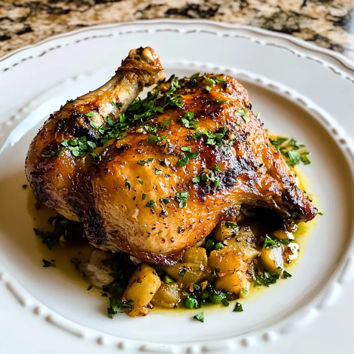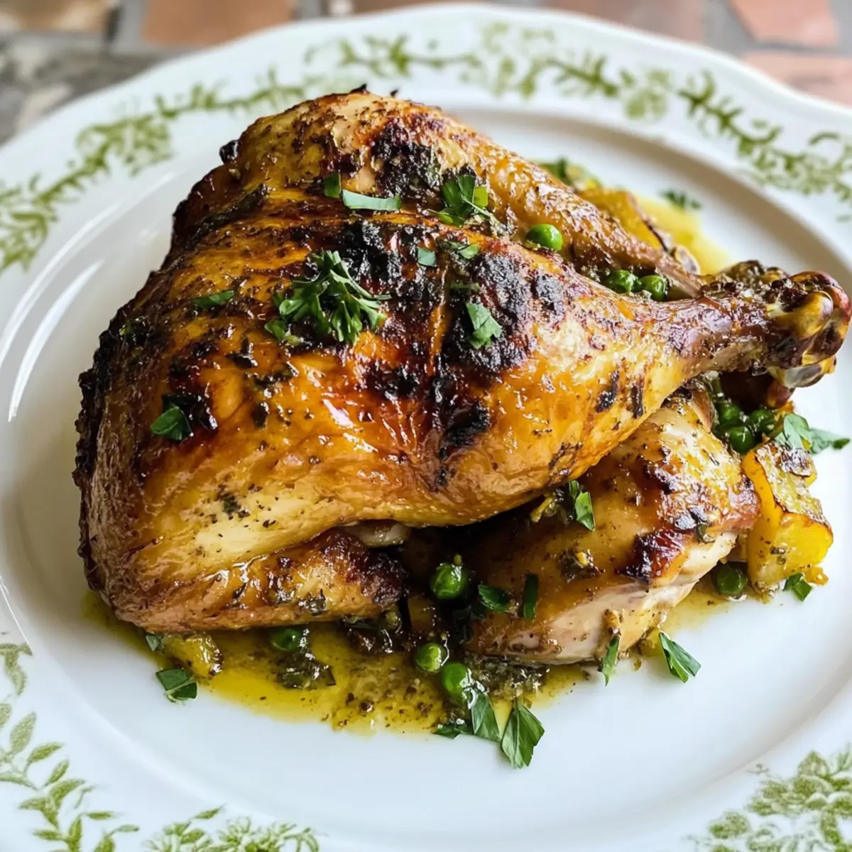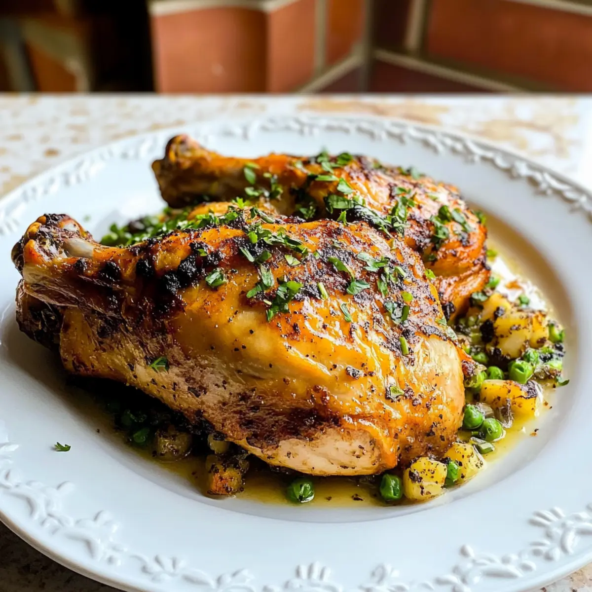 Als ich kürzlich in der Küche stand, überkam mich der verführerische Duft von Gewürzen und Zitrone, der durch die Luft schwebte. Die Zubereitung von einfachem portugiesischem Hähnchen ist für mich mehr als nur ein Rezept – es ist eine kulinarische Reise, auf die ich Sie einladen möchte. Dieses einfach im Ofen gebackene Gericht ist nicht nur schnell zubereitet, sondern verwandelt auch alltägliche Zutaten in ein Geschmackswunder. Mit seiner saftigen Textur und der flexiblen Schärfe, die Sie nach Ihrem Geschmack anpassen können, ist es der perfekte Begleiter für ein entspanntes Wochenabendessen oder um Freunde zu beeindrucken. Wer könnte da widerstehen? Lassen Sie uns gemeinsam in diese köstliche Welt eintauchen und entdecken, wie einfach es ist, ein Stück Portugal auf Ihren Tisch zu bringen! Warum ist dieses Rezept einzigartig? Einfachheit: Die Zubereitung dieses einfachen portugiesischen Hähnchens geht schnell und erfordert nur grundlegende Kochkenntnisse. Vielseitigkeit: Passen Sie die Gewürze ganz nach Ihrem Geschmack an – von mild bis super feurig! Saftiger Genuss: Das marinierte Hähnchen bleibt beim Backen schön saftig, während die Haut köstlich knusprig wird. Perfekte Wahl für jeden Anlass: Ob für ein einfaches Abendessen oder als Highlight bei einem Festmahl, dieses Gericht wird Ihre Gäste begeistern! Gesunde Zutaten: Mit frischen Kräutern und Zitrusfrüchten ist dieses Rezept nicht nur lecker, sondern auch nährstoffreich. Für weitere gesunde Optionen könnten Sie auch unser Tzatziki Bowl Rezept ausprobieren. Einfache portugiesische Hähnchen Zutaten • Für die Marinade: Zitronensaft – sorgt für Frische und zarte Textur; frischer Zitronensaft hat den besten Geschmack. Olivenöl – bringt Feuchtigkeit und hilft, die Marinade am Hähnchen zu halten. Kann durch Pflanzenöl ersetzt werden. Paprika – verleiht eine rauchige Note und eine ansprechende Farbe; wählen Sie zwischen süßer oder geräucherter Paprika. Knoblauch – sorgt für ein aromatisches Fundament und Tiefe im Geschmack; frischer Knoblauch ist bevorzugt. Oregano – bringt eine erdige, kräuterige Note; getrockneter Oregano kann als Alternative verwendet werden. Salz – hebt die Aromen im Gericht hervor; nach Bedarf anpassen. Chilipulver – fügt Wärme und Schärfe hinzu; Menge je nach gewünschtem Schärfegrad anpassen. Rote Paprikaflocken – steigern die Schärfe; für mildere Aromen weglassen. Lorbeerblatt – fügt der Marinade aromatische Tiefe hinzu; vor dem Servieren am besten entfernen. Schwarzer Pfeffer – ergänzt die Gewürze und verbessert den Geschmack; frisch gemahlener Pfeffer wird empfohlen. Hähnchenkeulen – das Hauptprotein, das durch Fett und Haut für Saftigkeit sorgt; kann durch Hähnchenschenkel oder -brust ersetzt werden. Holen Sie sich dieses einfache portugiesische Hähnchen auf den Tisch und beeindrucken Sie Ihre Familie und Freunde mit einem köstlichen Genuss! Schritt-für-Schritt-Anleitung für einfaches portugiesisches Hähnchen Step 1: Marinade vorbereiten In einem Mixer Zitronensaft, Olivenöl, Paprika, Knoblauch, Oregano, Salz, Chilipulver, rote Paprikaflocken, Lorbeerblatt und schwarzen Pfeffer vermengen. Mixen Sie die Zutaten, bis eine glatte Marinade entsteht. Diese aromatische Mischung ist die Grundlage für Ihr einfache portugiesisches Hähnchen, die dem Fleisch den unverwechselbaren Geschmack verleiht. Step 2: Hähnchen marinieren Die Hähnchenkeulen an der Hautseite leicht einschneiden, um die Marinade besser aufnehmen zu können. Legen Sie die Keulen in einen Zip-Lock-Beutel, fügen Sie zwei Drittel der zubereiteten Marinade hinzu, verschließen Sie den Beutel und kneten Sie das Hähnchen gut ein. Lassen Sie das Hähnchen mindestens 8 Stunden oder über Nacht im Kühlschrank marinieren, um den vollen Geschmack zu entfalten. Step 3: Ofen vorheizen Heizen Sie den Ofen auf 180°C vor und bereiten Sie eine Auflaufform vor, indem Sie sie mit Butter einfetten. Der vorgeheizte Ofen sorgt dafür, dass das einfache portugiesische Hähnchen gleichmäßig gar wird und die Haut schön knusprig bleibt, während die Keulen saftig bleiben. Step 4: Hähnchen backen, erste Phase Legen Sie die marinierten Hähnchenkeulen mit der Hautseite nach unten in die vorbereitete Auflaufform. Decken Sie die Form mit Aluminiumfolie ab und backen Sie das Hähnchen 20 Minuten lang. Dies hilft, das Fleisch zu dämpfen und es besonders zart zu machen, während die Aromen der Marinade durchdringen. Step 5: Bastezeit Nach 20 Minuten die Folie entfernen und das Hähnchen mit der restlichen Marinade bestreichen. Decken Sie die Form wieder ab und backen Sie das Hähnchen weitere 20 Minuten. So wird sichergestellt, dass die Aromen intensiv bleiben und das Fleisch gleichmäßig gart. Step 6: Endbacken Nach der zweiten Backphase die Folie entnehmen, das Hähnchen erneut bestreichen und für weitere 15-20 Minuten backen, bis die Kerntemperatur 74°C erreicht ist und der Saft klar austritt. Die Haut sollte goldbraun und knusprig sein – ein perfektes Ergebnis für Ihr einfache portugiesisches Hähnchen! Einfache portugiesische Hähnchen Variationen Lassen Sie Ihrer Kreativität freien Lauf und passen Sie dieses Rezept nach Ihrem Geschmack an! Dairy-Free: Ersetzen Sie Olivenöl ganz einfach durch eine pflanzliche Alternative, um die Marinade laktosefrei zu machen. Hähnchenbrust: Verwenden Sie stattdessen Hähnchenbrust für eine magere, zarte Option. Die Marinade durchdringt auch hier wunderbar das Fleisch. Frische Kräuter: Mischen Sie frischen Thymian oder Rosmarin in die Marinade, um einen erdigen Twist hinzuzufügen. Diese Kräuter verleihen dem Hähnchen eine lebendige Note. Mildere Version: Reduzieren Sie die Menge an Chilipulver und roten Paprikaflocken für eine sanfte, kinderfreundliche Variante. Mild und dennoch geschmackvoll! Zitrus-Vielfalt: Fügen Sie etwas Limettensaft zu der Marinade hinzu für eine zusätzliche Frische. Die Kombination von Zitrusfrüchten bringt 