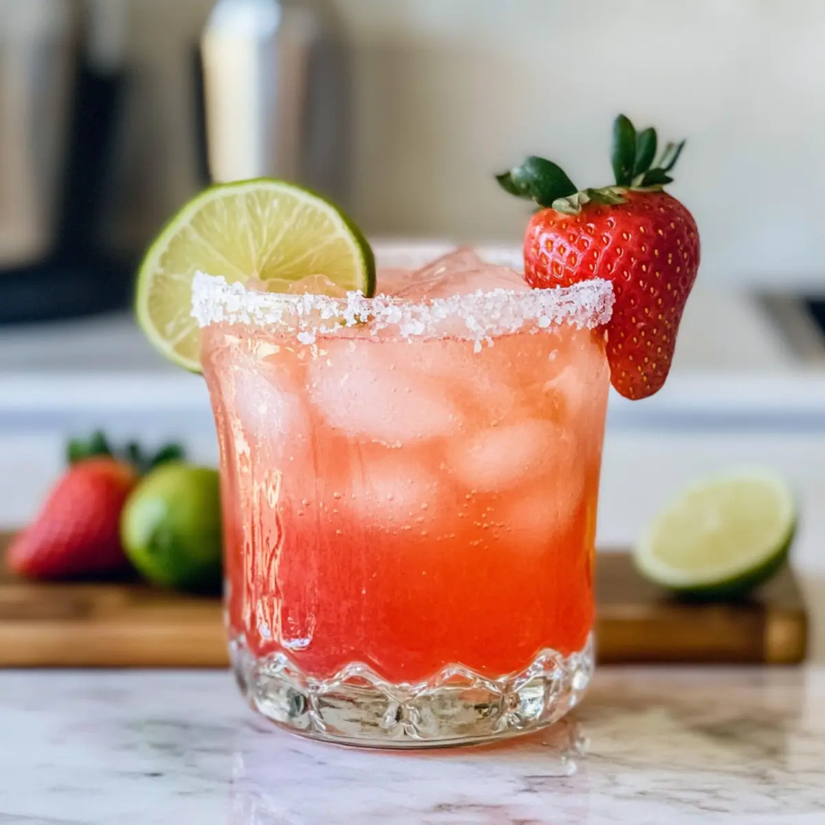 Während ich an einem warmen Nachmittag im Garten saß, überkam mich die Lust nach einem erfrischenden Getränk. Ein kurzer Blick auf die saftig roten Erdbeeren, die in meiner Obstschale lagen, und ich wusste, was ich brauchte: einen Erdbeer-Limette-Mocktail-Margarita! Diese spritzige Mischung vereint die fruchtige Süße der Erdbeeren mit der herrlichen Säure der Limette und ist dabei völlig alkoholfrei – eine perfekte Ergänzung für jede Zusammenkunft oder einfach zum Genießen an einem heißen Tag. Und das Beste? Die Zubereitung ist schnell und unkompliziert, sodass du mehr Zeit mit deinen Liebsten verbringen kannst, anstatt in der Küche zu stehen. Hast du schon einmal überlegt, wie aufmunternd ein solches Getränk sein kann? Lass uns gemeinsam in die Zubereitung eintauchen! Warum wirst du diesen Mocktail lieben? Erfrischend und Fruchtig: Dieser Erdbeer-Limette-Mocktail-Margarita ist eine wahre Geschmacksexplosion! Einfach zubereitet in nur wenigen Schritten, ist er perfekt für spontane Gartenpartys oder entspannte Nachmittage. Vegan und glutenfrei: Du kannst ihn bedenkenlos genießen, egal welche Vorlieben du hast. Vielfältige Variationen wie frische Minze oder exotische Früchte machen ihn zum Star jeder Veranstaltung. Und das Beste? Mit nur 106 Kalorien ist dieser Drink nicht nur lecker, sondern auch gesund – ideal für einen warmen Sommertag! Erdbeer-Limette-Mocktail-Margarita Zutaten Für die Mischung • Frische Erdbeeren – sorgen für natürliche Süße und Fruchtigkeit; greife zu reifen, in Saison befindlichen Beeren für den besten Geschmack. • Limettensaft – bringt eine erfrischende Säure; frischer Limettensaft ist für das beste Aroma zu empfehlen. • Honig (oder Agavendicksaft) – fügt zusätzliche Süße hinzu; nach Geschmack anpassen. Alternativ kann einfacher Zuckersirup verwendet werden. • Orangensaft – trägt eine subtile Süße und Geschmackstiefe bei, um die Säure auszubalancieren. • Ginger Beer (oder Club Soda/Sprudelwasser) – sorgt für Spritzigkeit und verstärkt den Geschmack; benutze Ginger Beer für mehr Süße oder greife zu Club Soda/Sprudelwasser, wenn die Mischung schon süß genug ist. • Flockiges Salz – wird verwendet, um das Glas zu rimmen und verleiht ein zusätzliches Geschmacks-Highlight; eine Limettenschnitte rund um den Glasrand drücken und in Salz tauchen. Für die Garnitur • Limettenscheibe – perfekt zum Dekorieren und als zusätzlicher Zitronenfrischekick. • Frische Minze – für einen aromatischen Touch; einfach ein paar Blätter zupfen und ins Glas geben. Dieser Erdbeer-Limette-Mocktail-Margarita ist nicht nur ein Genuss für den Gaumen, sondern bringt auch Farbe auf jede Tischdekoration! Schritt-für-Schritt-Anleitung für Erdbeer-Limette-Mocktail-Margarita Step 1: Glas vorbereiten Rim ein Glas mit flockigem Salz, indem du eine Limettenschnitte um den Rand drückst und dann in das Salz tauchst. Fülle das vorbereitete Glas anschließend mit Eiswürfeln, damit dein Erdbeer-Limette-Mocktail-Margarita schön kühl und erfrischend serviert wird. Step 2: Erdbeeren pürieren oder zerdrücken Gib frische Erdbeeren in einen Mixer und füge Limettensaft, Honig und Orangensaft hinzu. Mixe die Mischung auf hoher Stufe, bis sie komplett glatt ist. Alternativ kannst du die Erdbeeren in einem stabilen Glas mit einem Stößel zerdrücken, bis sie gleichmäßig zerdrückt sind – beides sorgt für einen fruchtigen Geschmack! Step 3: Zutaten mischen Gib die pürierten oder zerdrückten Erdbeeren in einen Cocktailshaker. Fülle den Shaker mit Eis und schüttle energisch für etwa 10-15 Sekunden, damit sich die Aromen gut miteinander verbinden und eine kühle, erfrischende Basis für deinen Erdbeer-Limette-Mocktail-Margarita entsteht. Step 4: Servieren Gieße die Mischung vorsichtig in das rimmed Glas, das bereits mit Eis gefüllt ist. Fülle anschließend das Glas mit Ginger Beer, Club Soda oder sprudelndem Wasser auf, je nach Vorlieben und gewünschter Süße. Lass das Getränk leicht sprudeln, dann ist es bereit zum Genießen! Aufbewahrungstipps für Erdbeer-Limette-Mocktail-Margarita Frühstück: Bereite die Fruchtmischung vor und bewahre sie in einem luftdichten Behälter im Kühlschrank auf, um den frischen Geschmack bis zu 24 Stunden zu erhalten. Eis: Fülle das fertige Getränk erst kurz vor dem Servieren mit Eis, um ein Wässrigwerden zu vermeiden; so bleibt der Erdbeer-Limette-Mocktail-Margarita schön erfrischend. Stabilität: Für die beste Textur und Aromen genieße deinen Mocktail am besten frisch zubereitet, da die Kohlensäure und Frische sonst verloren gehen können. Garnitur: Halte die Limettenscheiben und Minzblätter getrennt, bis du servierst, damit sie frisch bleiben und den Drink optisch aufwerten. Expert Tips für Erdbeer-Limette-Mocktail-Margarita Süßigkeit Anpassen: Probier die Mischung vor dem Servieren; füge mehr Honig oder Sirup hinzu, wenn die Erdbeeren zu sauer sind. Frisch ist Besser: Verwende frische Zutaten wie Limettensaft und reife Erdbeeren, um den Geschmack zu intensivieren – das macht deinen Erdbeer-Limette-Mocktail-Margarita unvergleichlich lecker! Eis nicht sparen: Bedeutende Menge Eis im Glas sorgt für die perfekte Erfrischung – ein warmer Drink kann das Erlebnis ruinieren. Garnitur erhöhen: Dekoriere deinen Mocktail mit Limettenscheiben und frischer Minze für einen zusätzlichen Farbtupfer und Geschmackskick. Vorausplanung: Bereite die Fruchtmischung im Voraus vor und bewahre sie bis zu 24 Stunden im Kühlschrank auf, um spontane Zusammenkünfte zu nutzen. Was passt gut zu Erdbeer-Limette-Mocktail-Margarita? Ein erfrischendes Getränk wie dieser Mocktail weckt die Sehnsucht nach einer vollmundigen Mahlzeit, die den Genuss perfekt ergänzt. Crispy Tacos: Diese knusprigen Tacos bieten einen herzhafter Kontrast zu der süßen Fruchtigkeit des Mocktails. Ihre Würze hebt die Aromen des Getränks hervor. Guacamole mit Tortilla-Chips: Die cremige Guacamole harmoniert wund
