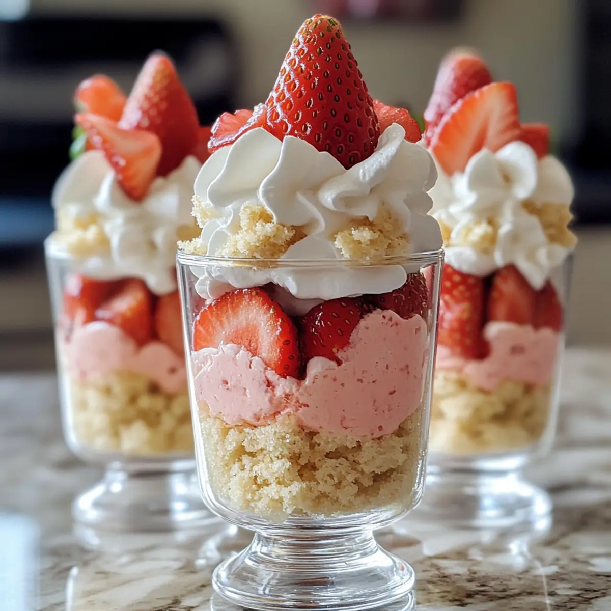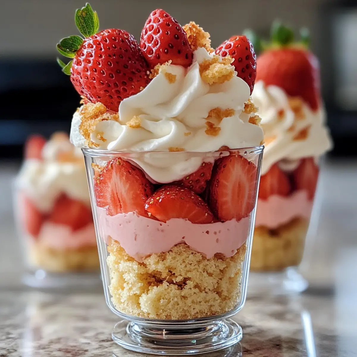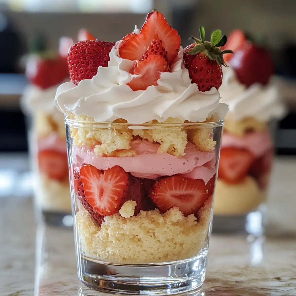 Gerade saß ich im Garten und beobachtete, wie die Sonne die letzten Strahlen des Tages auf die reifen Erdbeeren in meinem Garten warf. Diese saftig-süßen Früchte sind der perfekte Star für meine Erdbeertorte Dessertbecher, die nicht nur köstlich, sondern auch unglaublich einfach zuzubereiten sind. Diese no-bake Dessertbecher kombinieren die leckeren Aromen von frischen Erdbeeren, fluffiger Sahne und zartem Kuchen in eleganten Portionen, die jede Feier aufwerten können. Ideal für einen schnellen Genuss oder als Blickfang auf dem Buffet, wird jedes Schichten dieser Dessertbecher ein kleines Fest für die Sinne. Bist du bereit, deine Gäste mit einem einfachen, aber eindrucksvollen Dessert zu beeindrucken? Warum wirst du diese Dessertbecher lieben? Frische Erdbeeren: Die Verwendung von sonnengereiften Erdbeeren verleiht diesen Dessertbechern einen unvergleichlichen Geschmack, der jeden Bissen veredelt. Einfachheit pur: Dank des no-bake Verfahrens sind sie im Handumdrehen zubereitet, ideal für spontane Leckereien. Elegante Präsentation: Die geschichtete Anordnung macht diese Dessertbecher zu einem echten Hingucker auf jedem Tisch. Vielseitig anpassbar: Du kannst die Füllung nach Belieben variieren, z.B. mit Himbeeren oder einem Spritzer Zitrone für eine frische Note. Perfekt für den Sommer: Diese Dessertbecher sind die ideale Erfrischung für heiße Tage und ein toller Begleiter zu einem Glas Prosecco. Köstlich und leicht: Sie bieten Genuss ohne ein schweres Gefühl – ideal für den warmen Sommer! Erdbeertorte Dessertbecher Zutaten Für die Kuchenbasis • Gebackener Vanillekuchen – Bildet die weiche Basis für die Dessertbecher; du kannst auch Biskuit verwenden, wenn du eine leichtere Variante möchtest. • Zucker – Optional, um den Kuchenbröseln zusätzlichen Geschmack zu verleihen. Für die Creme • Schlagsahne – Sorgt für die cremige Textur; am besten im Kühlschrank kühlen, bevor du sie aufschlägst. • Frischkäse – Bietet eine glatte Basis für die Füllung; achte darauf, dass er weich ist, um ein schnelles Mischen zu gewährleisten. • Puderzucker – Süßt die Creme und sorgt für die perfekte Konsistenz. • Vanilleextrakt – Gibt der Creme eine florale Note; ein Muss für köstliches Aroma. • Erdbeerpüree – Verleiht der Creme einen frischen Erdbeergeschmack; kann selbst gemacht oder gekauft sein. • Rosa Lebensmittelfarbe – Optional, um die visuelle Anziehungskraft zu erhöhen. Für die Garnierung • Frische Erdbeeren – Die Hauptzutat, die für Saftigkeit und Frische sorgt; darauf achten, dass sie gut abgetrocknet sind, um Sumpf zu vermeiden. • Herzförmige Streusel/Pink Sanding Sugar – Optional, um die Präsentation zu verschönern. Diese Erdbeertorte Dessertbecher vereinen alle Geschmäcker und Texturen eines klassischen Desserts in einer eleganten und anpassbaren Form, perfekt für jeden Anlass! Schritt-für-Schritt-Anleitung für Erdbeertorte Dessertbecher Step 1: Frischkäse vorbereiten Schlage den erweichten Frischkäse in einer großen Schüssel mit einem Handmixer etwa 2-3 Minuten lang, bis er schön cremig ist. Füge dann den Puderzucker und den Vanilleextrakt hinzu und vermische alles gut, bis eine glatte Masse entsteht. Dieser erste Schritt sorgt für die köstliche Basis des Erdbeertorte Dessertbechers. Step 2: Sahne schlagen In einer separaten, gekühlten Schüssel schlägst du die Schlagsahne mit einem Handmixer auf hoher Stufe für etwa 3-5 Minuten, bis steife Spitzen entstehen. Achte darauf, dass die Sahne nicht überbearbeitet wird, da sie sonst körnig wird. Diese luftige Sahne wird die Cremigkeit der Dessertbecher perfekt ergänzen. Step 3: Creme zusammenführen Falte die steif geschlagene Sahne vorsichtig in die Frischkäsemixtur. Verwende dabei einen Gummispatel und hebe die Sahne sanft unter, damit die leichte Textur erhalten bleibt. Dies ergibt die cremige Füllung, die in deinen Erdbeertorte Dessertbechern die Hauptattraktion bildet. Step 4: Erdbeerpüree herstellen Gib frische Erdbeeren in einen Mixer und püriere sie, bis eine glatte Konsistenz erreicht ist. Wenn du möchtest, kannst du die Erdbeeren vorher etwas süßen, um den Geschmack zu intensivieren. Das Erdbeerpüree wird in die Creme eingearbeitet und sorgt für das fruchtige Element in den Dessertbechern. Step 5: Creme teilen und färben Teile die Creme in zwei gleich große Portionen auf. Mische das Erdbeerpüree in eine der Portionen, um eine herrlich rosa Erdbeercreme zu erhalten. Die andere Portion bleibt unverändert und dient als Vanillecreme. Diese beiden Cremes bieten eine schöne Farb- und Geschmackskombination in deinen Erdbeertorte Dessertbechern. Step 6: Kuchen zerbröseln Zerbrösele den gebackenen Vanillekuchen in kleine Stücke oder Krümel. Achte darauf, dass die Stücke gut zerbröselt sind, um eine gleichmäßige Schichtung in den Dessertbechern zu gewährleisten. Dieser Schritt bildet die stabile Basis für die leckeren Cremeschichten. Step 7: Dessertbecher schichten Beginne mit einer Schicht vanille Kuchenkrümel am Boden jedes Dessertbechers. Füge anschließend eine Schicht Erdbeercreme hinzu, gefolgt von einer Schicht frischen, in Scheiben geschnittenen Erdbeeren, und dann der Vanillecreme. Wiederhole die Schichtung, bis der Becher gefüllt ist, um ein attraktives Erscheinungsbild zu schaffen. Step 8: Garnieren und kühlen Spritz einen schönen Swirl der Erdbeercreme oben auf die Dessertbecher und garniere sie nach Belieben mit frischen Erdbeeren oder herzförmigen Streuseln. Decke die Dessertbecher ab und stelle sie für mindestens 30 Minuten in den Kühlschrank. Dies hilft, die Schichten zu festigen und die Aromen miteinander zu verbinden, bevor du sie servierst. Was passt zu Erdbeertorte Dessertbechern? Gerade die richtige Begleitung macht aus einem Dessert ein vollkommenes Erlebnis. Lass dich von diesen Ideen inspirieren, während du deine Erdbeertorte Dessertbecher servierst. Kaffee: Ein frisch gebrühter Kaffee ergänzt 