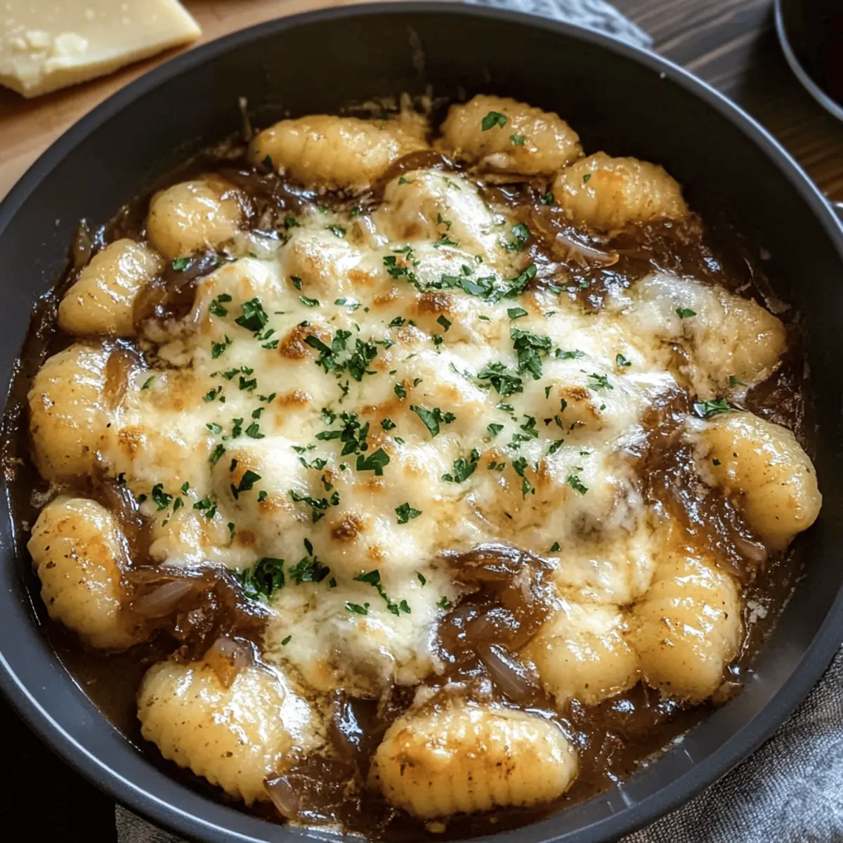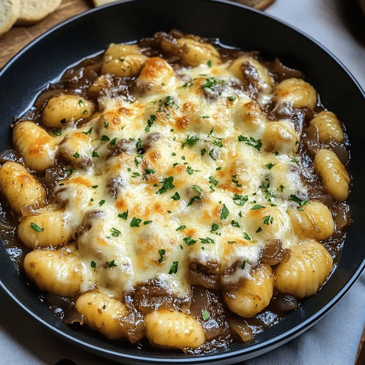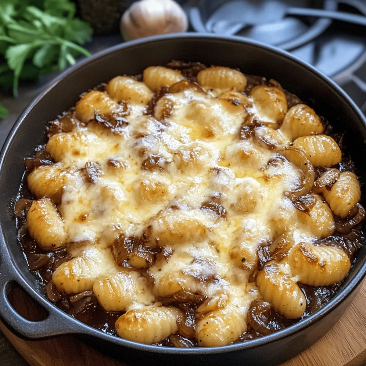 Wenn ich einen kalten Abend mit Freunden oder Familie genieße, gibt es nichts Besseres als ein warmes Gericht, das alle in den Bann zieht. Diese Französische Zwiebelgnocchi, die zart und fluffig sind, verwandeln die klassische französische Zwiebelsuppe in eine gemütliche Hauptspeise, die einfach unwiderstehlich ist. Erfreue dich an den aromatischen Schichten von karamellisierten Zwiebeln, die in einer herzhaften Brühe schwimmen und mit schmelzendem Gruyère-Käse gekrönt werden. Dieses Rezept bietet nicht nur eine schnelle Zubereitungszeit, sondern auch die Möglichkeit, in die samtige Umarmung eines traditionellen Comfort Foods einzutauchen. Konnte ich deine Neugier schon wecken, wie du dieses köstliche Gericht zubereiten kannst? Warum wirst du dieses Rezept lieben? Einfachheit: Die Zubereitung ist unkompliziert und benötigt keine speziellen Kochkünste. Jeder kann die perfekten Französische Zwiebelgnocchi zaubern! Herzhafter Genuss: Die Kombination aus karamellisierten Zwiebeln und Gruyère-Käse sorgt für ein geschmackliches Erlebnis, das Komfort und Wärme vermittelt. Vielseitigkeit: Ob als schmackhaftes Abendessen oder als Teil eines festlichen Buffets, dieses Gericht passt zu vielen Anlässen und kann leicht variiert werden. Schnelle Zubereitung: In nur 30 Minuten bist du bereit, dieses köstliche Essen zu servieren – perfekt für hektische Wochentage! Unvergessliches Aroma: Die aromatische Mischung aus Brühe und Gewürzen zieht jeden in ihren Bann. Es wird nicht lange dauern, bis deine Familie nach einem Nachschlag fragt. Beliebtheit: Dieses Gericht hat das Potenzial, zum neuen Favoriten bei Freunden und Familie zu werden. Unbedingt mit einem Stück ofenfrischem Brot kombinieren, um die köstliche Brühe aufzuessen! Französische Zwiebelgnocchi Zutaten • Entdecke die Geheimnisse dieser köstlichen Französische Zwiebelgnocchi! Für die Basis Extra Virgin Olive Oil – sorgt für einen aromatischen Geschmack beim Kochen. Unsalted Butter – verleiht Fülle und Tiefe; kann durch Margarine ersetzt werden für eine milchfreie Variante. Yellow Onions – sind die Geschmacksbasis und karamellisieren für eine natürliche Süße. Red Wine – intensiviert den Geschmack, kann durch Brühe ersetzt werden für eine alkoholfreie Variante. Kosher Salt – verstärkt das Aroma; alternativ Meer- oder Tafelsalz verwenden. Black Pepper – sorgt für eine würzige Note; frisch gemahlener Pfeffer empfohlen. Garlic Powder – fügt Aroma hinzu; frischer Knoblauch kann ebenfalls genutzt werden. Für die Flüssigkeit Beef Broth – der Hauptbestandteil, reich an Umami; Gemüsebrühe ist eine gute vegetarische Option. Worcestershire Sauce – sorgt für eine komplexe Note; Tamari oder Sojasauce für eine glutenfreie Option verwenden. Für die Gnocchi Potato Gnocchi – bringt eine weiche, zähe Textur mit; gekaufte sind empfehlenswert, selbstgemachte sind eine feine Wahl. Gruyère Cheese – sorgt für einen cremigen, nussigen Geschmack; kann durch Schweizer Käse oder Mozzarella ersetzt werden, aber der Geschmack wird variieren. Für die Garnitur Parsley – bringt Farbe und Frische ins Gericht; kann durch Schnittlauch oder Frühlingszwiebeln ersetzt werden. Schritt-für-Schritt-Anleitung für Französische Zwiebelgnocchi Step 1: Öl und Butter erhitzen Erhitze in einer großen, schweren, ofenfesten Pfanne bei mittlerer Hitze 2 Esslöffel Olivenöl und 1 Esslöffel ungesalzene Butter. Achte darauf, dass die Butter schäumt, aber nicht bräunt. Dies dauert etwa 1-2 Minuten. Die Mischung sorgt für einen aromatischen Grundgeschmack, der die Grundlage für unsere Französische Zwiebelgnocchi bildet. Step 2: Zwiebeln karamellisieren Füge jetzt 3 mittelgroße, in Scheiben geschnittene gelbe Zwiebeln hinzu und brate sie unter regelmäßigem Rühren für etwa 15-20 Minuten, bis sie schön goldbraun sind und eine süße, karamellisierte Farbe erhalten. Reduziere die Hitze bei Bedarf, um ein Anbrennen zu vermeiden. So entwickeln die Zwiebeln ihre herrlichen Aromen, die unser Gericht bereichern werden. Step 3: Wein und Gewürze hinzufügen Nachdem die Zwiebeln karamellisiert sind, gib ½ Tasse Rotwein hinzu. Lass ihn für etwa 3-4 Minuten kochen, bis der Alkohol verdampft ist. Anschließend 1 Teelöffel koscheres Salz, ½ Teelöffel frisch gemahlenen schwarzen Pfeffer und 1 Teelöffel Knoblauchpulver einrühren. Diese Würze verleiht der Mischung ihre geschmackliche Tiefe. Step 4: Brühe und Worcestershire-Sauce einrühren Gieße nun 2 Tassen Rinderbrühe und 1 Esslöffel Worcestershire-Sauce in die Pfanne. Bringe die Mischung zum Köcheln und lasse sie 5 Minuten simmernd, damit sich die Aromen gut verbinden. Diese herzhafte Flüssigkeit bildet die Basis für die köstliche Soße der Französischen Zwiebelgnocchi. Step 5: Gnocchi hinzufügen Reduziere die Hitze auf niedrig und gib 500 g Kartoffelgnocchi in die Pfanne. Lasse alles 3-5 Minuten köcheln, bis die Gnocchi zart sind und die Aromen aufgenommen haben. Achte darauf, die Gnocchi vorsichtig in der Brühe zu schwenken, damit sie gleichmäßig erhitzt werden. Step 6: Gruyère-Käse hinzufügen Streue 150 g geriebenen Gruyère-Käse gleichmäßig über die Gnocchi und die Zwiebelmischung. Stelle die Pfanne unter den Grill des Ofens und broile alles für 2-3 Minuten, bis der Käse geschmolzen und goldbraun ist. Hier entsteht die köstliche, überbackene Schicht, die unser Gericht krönt. Step 7: Garnieren und servieren Nehme die Pfanne aus dem Ofen und garniere die Französische Zwiebelgnocchi mit frischer Petersilie nach Belieben. Serviere das Gericht sofort, idealerweise mit knusprigem Brot, um die aromatische Brühe aufzusaugen. Jetzt kannst du dich auf das herzliche Aroma und den Geschmack deiner köstlichen Zwiebelgnocchi freuen! Variationen und Alternativen für Französische Zwiebelgnocchi Entfalte deine Kreativität in der Küche und habe Spaß beim Anpassen dieses leckeren Gerichts! Pilze hinzufügen: Sauté 250 g Champignons zusamme