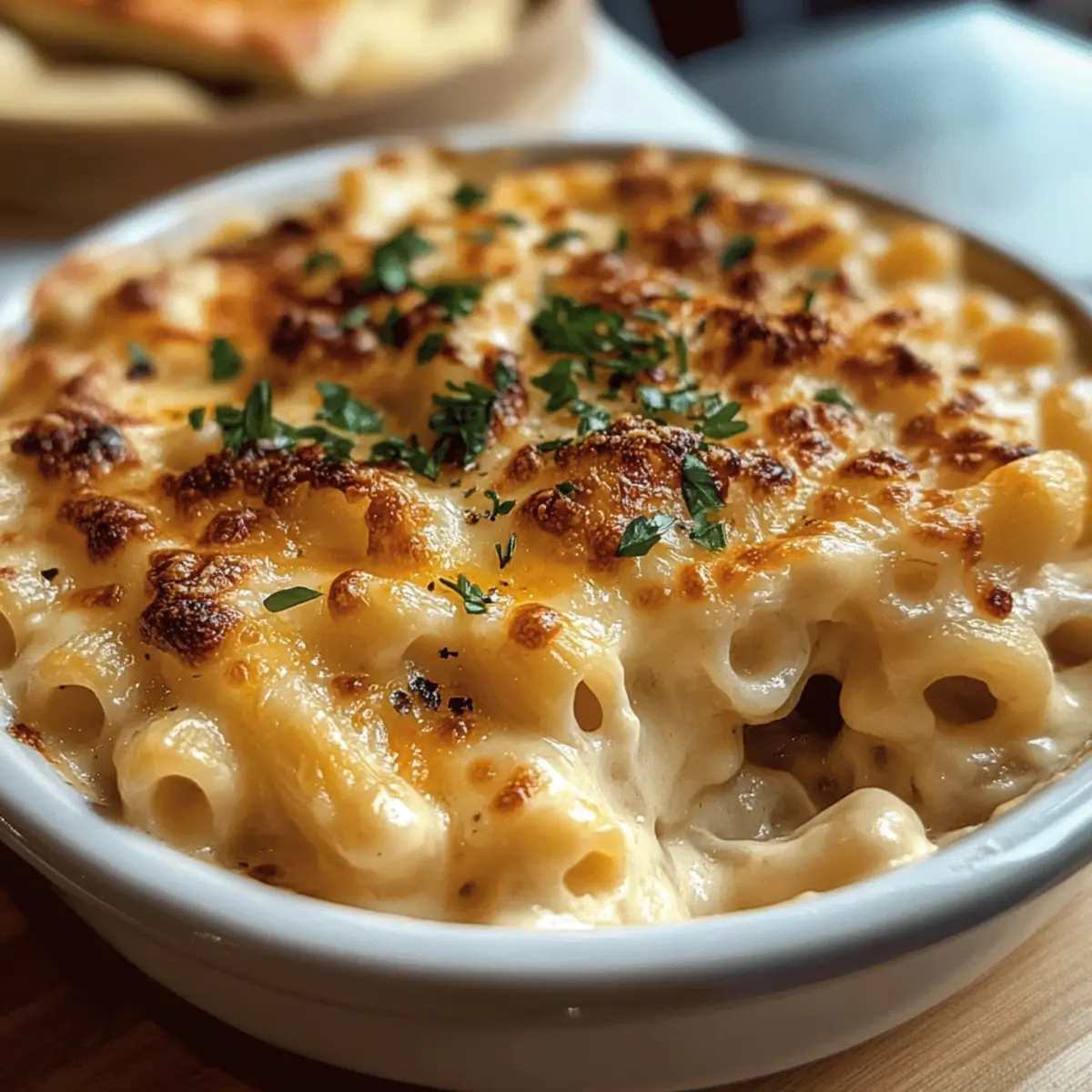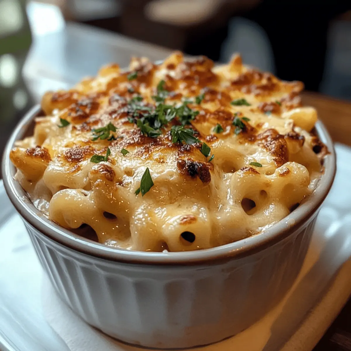 Als ich neulich in meiner Küche stand und den verlockenden Duft von karamellisierten Zwiebeln wahrnahm, wusste ich, dass etwas Besonderes auf dem Herd simmerte. Die Kombination aus cremigem Käse und herzhaften Aromen, die an die klassische Französische Zwiebelsuppe erinnerten, war nicht nur eine Idee, sondern eine köstliche Realität: Französische Zwiebelsuppe Makkaroni und Käse. Dieses Gericht ist der Inbegriff von Komfort und verspricht, jede Mahlzeit in eine herzliche Umarmung zu verwandeln. Mit einfachen Zutaten zubereitet, ist es nicht nur ein Hingucker auf dem Tisch, sondern auch eine schnelle Lösung für den Hunger nach gemütlicher, selbstgemachter Kost. Bist du bereit, dich in diese unwiderstehliche Kombination aus käsiger Cremigkeit und dem reichhaltigen Geschmack von gerösteten Zwiebeln zu verlieben? Warum wirst du dieses Rezept lieben? Einfachheit: Die Zubereitung ist unkompliziert und erfordert nur grundlegende Kochkenntnisse. Herzhafter Geschmack: Die Kombination aus karamellisierten Zwiebeln und cremigem Käse schafft ein intensives Geschmackserlebnis, das den Gaumen verwöhnt. Komfortessen: Dieses Gericht vereint zwei beliebte Klassiker und bietet die perfekte Lösung für kalte Abende. Vielseitigkeit: Egal ob mit glutenfreier Pasta oder veganen Alternativen, du kannst es an deine Vorlieben anpassen. Schnelligkeit: In weniger als einer Stunde hast du ein köstliches Abendessen auf dem Tisch – ideal für beschäftigte Tage! Publikumsfavorit: Dieses Gericht wird garantiert deine Familie und Freunde begeistern und sorgt für zufriedene Gesichter rund um den Tisch. Zutaten für Französische Zwiebelsuppe Makkaroni und Käse • Um das Rezept perfekt zu gestalten, findest du hier alle notwendigen Zutaten. Für die Zwiebelbasis Gelbe Zwiebeln – verleihen die süße und Tiefe, die für den einzigartigen Geschmack unerlässlich sind. Butter – sorgt für Reichhaltigkeit und unterstützt das Karamellisieren der Zwiebeln. Für die Käsesauce Mehl – dickt die Käsesauce an und sorgt für eine glatte Textur. Rinderbrühe – bildet die herzhafte Grundlage; kann durch Gemüsebrühe für eine vegetarische Variante ersetzt werden. Schlagsahne – trägt zur Cremigkeit der Sauce bei. Gruyère Käse – bringt eine nussige, geschmolzene Qualität mit; perfekt für den französischen Geschmack. Scharfer weißer Cheddar – verstärkt die Geschmacksintensität; kann mit jedem schmelzbaren Käse ersetzt werden. Für die Pasta Makkaroni – hält die Käsesauce gut fest; Alternativen wie Penne oder Cavatappi sind ebenfalls möglich. Für die Garnitur Getoastete Baguettescheiben – optionale Beilage für zusätzlichen Biss; kannst auch Croutons verwenden. Frische Petersilie/Schnittlauch – sorgt für Frische und Farbe im Endgericht. Trüffelöl – optional für einen gehobenen Touch. Entdecke die köstliche Kombination, die das Beste aus klassischer Französischer Zwiebelsuppe und cremigem Makkaroni und Käse vereint! Schritt-für-Schritt-Anleitung für Französische Zwiebelsuppe Makkaroni und Käse Step 1: Zwiebeln karamellisieren Erhitze in einer großen Pfanne bei niedriger Hitze 2 Esslöffel Butter. Füge die dünn geschnittenen gelben Zwiebeln hinzu und lasse sie 30–40 Minuten lang sanft schmoren. Rühre gelegentlich um, bis die Zwiebeln goldbraun und süß sind. Diese sorgfältige Karamellisierung ist entscheidend für das Aroma der Französischen Zwiebelsuppe Makkaroni und Käse. Step 2: Sauce zubereiten Streue 2 Esslöffel Mehl über die karamellisierten Zwiebeln und rühre gut um. Gieße langsam 2 Tassen Rinderbrühe und 1 Tasse Schlagsahne hinzu, während du kräftig umrührst, um Klumpen zu vermeiden. Erhitze die Mischung auf mittlerer Hitze und lasse sie unter ständigem Rühren köcheln, bis die Sauce dick und cremig wird. Step 3: Käsesorten hinzufügen Reduziere die Hitze und füge 1 Tasse geriebenen Gruyère sowie 1 Tasse scharfen weißen Cheddar zur Sauce hinzu. Rühre kontinuierlich, bis der Käse vollständig geschmolzen und die Sauce schön cremig ist. Diese Kombination aus Käsesorten verleiht der Französischen Zwiebelsuppe Makkaroni und Käse seinen charakteristischen Geschmack. Step 4: Makkaroni kochen Koche 250 Gramm Makkaroni in einem großen Topf mit gesalzenem Wasser nach Packungsanweisung, bis sie al dente sind, etwa 8-10 Minuten. Hebe eine halbe Tasse des Nudelwassers auf, bevor du die Makkaroni abgießt. Dies ist wichtig, um die Sauce nach Bedarf zu verdünnen und die perfekte Konsistenz zu erreichen. Step 5: Kombinieren Füge die gekochten Makkaroni direkt zur Käsesauce in der Pfanne hinzu und rühre gründlich um, sodass jede Nudel gleichmäßig mit der cremigen Sauce bedeckt ist. Sollte die Sauce zu dick sein, füge nach und nach etwas von dem aufgehobenen Nudelwasser hinzu, bis die gewünschte Konsistenz erreicht ist. Step 6: Backen Heize den Ofen auf 200 °C vor und gib die Makkaroni-Käse-Mischung in eine ofenfeste Auflaufform. Bestreue die oberste Schicht mit zusätzlichem geriebenem Käse und optional mit getoasteten Baguettescheiben. Backe das Gericht 15-20 Minuten, bis es goldbraun und blubbernd ist. Step 7: Garnieren und Servieren Nehme die Auflaufform aus dem Ofen und lasse die Französische Zwiebelsuppe Makkaroni und Käse kurz abkühlen. Bestreue das Gericht mit frisch gehackter Petersilie oder Schnittlauch für einen farbenfrohen Akzent. Serviere es warm als gemütliches Abendessen, das garantiert für Begeisterung sorgt. Expertentipps für Französische Zwiebelsuppe Makkaroni und Käse Zwiebel perfekt karamellisieren: Nimm dir ausreichend Zeit, um die Zwiebeln langsam zu karamellisieren. Dies ist entscheidend, um den vollmundigen Geschmack der Französischen Zwiebelsuppe Makkaroni und Käse zu erzielen. Käsevariation: Experimentiere mit verschiedenen Käsesorten, die gut schmelzen, wie Fontina oder Asiago. Diese können zusätzliche Geschmackstiefen bieten. Konsistenz anpassen: Wenn die Sauce zu dick ist, füge schrittweise 