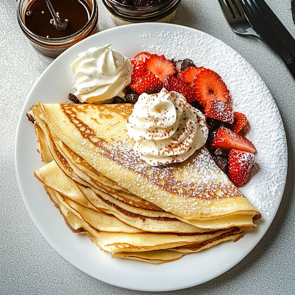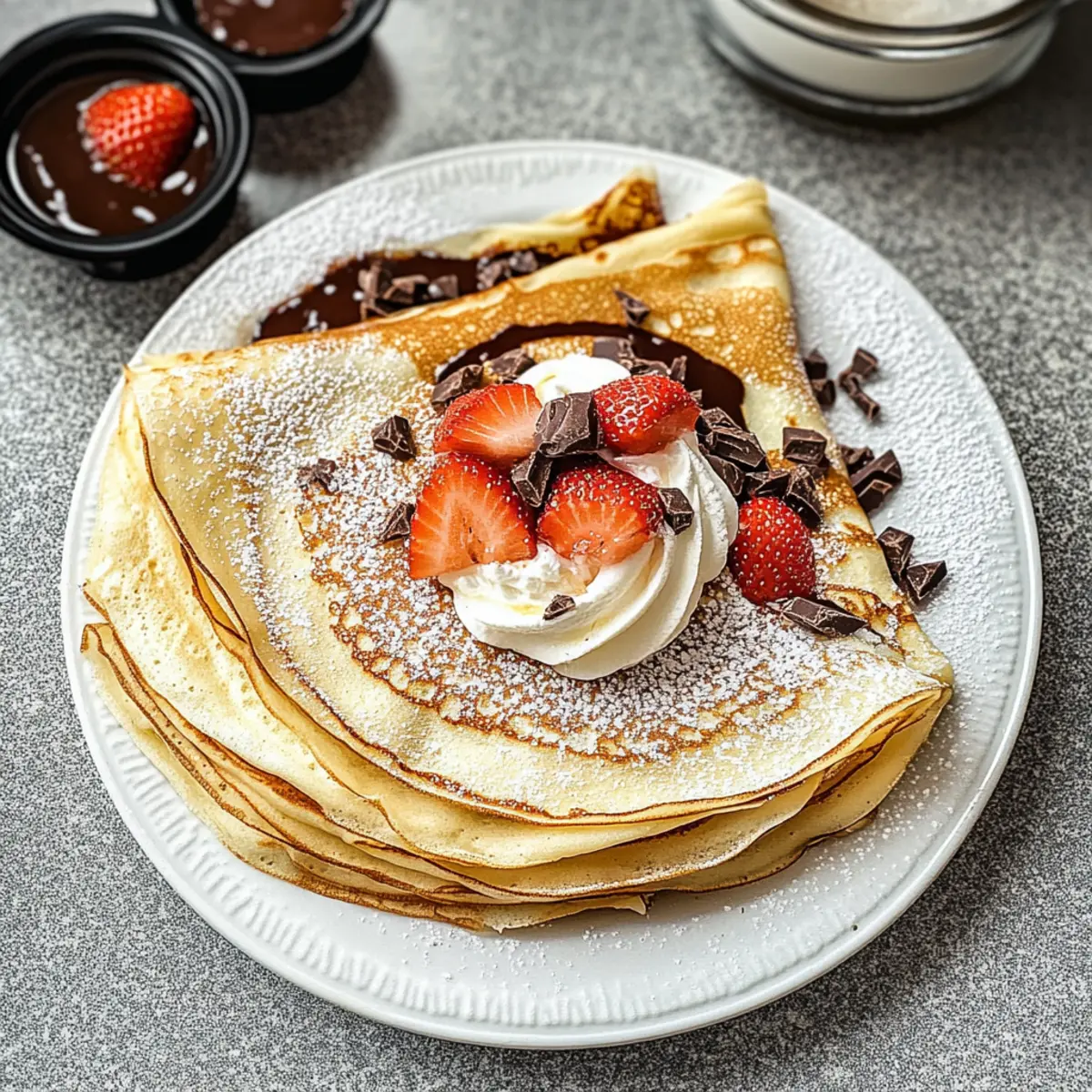 Wenn ich an ein gemütliches Frühstück denke, kommen mir immer die wunderbar zarten Französischen Crêpes in den Sinn. Diese schlichten, dünnen Pfannkuchen sind nicht nur ein Klassiker der französischen Küche, sondern auch überaus vielseitig. Mit einem einfachen Teig aus Mehl, Milch, Eiern und Butter lassen sich sowohl süße Geschmackserlebnisse, wie fruchtige Marmelade oder schmelzende Schokolade, als auch herzhafte Füllungen mit Schinken und Käse kreieren. Sie lassen sich schnell zubereiten und machen jede Mahlzeit zu einem besonderen Moment, sei es am Morgen oder als Snack zwischendurch. Bist du bereit, deinen eigenen Crêpes-Moment zu erleben? Lass uns gemeinsam diesen Genuss zaubern! Warum wirst du dieses Rezept lieben? Einfachheit ist hier das Geheimnis: Mit nur wenigen Zutaten und grundlegenden Kochkenntnissen kannst du beeindruckende Crêpes zaubern. Vielseitigkeit ist garantiert; ob süß mit frischen Früchten oder herzhaft mit Käse und Schinken, die Füllmöglichkeiten sind endlos. Zeitsparend in der Zubereitung, perfekt für ein schnelles Frühstück oder als schmackhafter Snack. Sinnliches Erlebnis: Die zarte Textur und der feine Geschmack bringen Freude auf den Tisch und in den Mund. Und das Beste? Du kannst deine Crêpes ganz nach Wunsch anpassen, sogar mit glutenfreiem Mehl oder pflanzlicher Milch. Bereite dich darauf vor, Familie und Freunde mit diesem Klassiker zu beeindrucken! Zutaten für Französische Crêpes • Die Basis für deine perfekten Crêpes! Für den Teig Mehl – Sorgt für die Struktur; verwende Weizenmehl für die klassische Textur. Milch – Fügt Feuchtigkeit hinzu und hilft beim Mischen; Mandel- oder Hafermilch sind gute Alternativen. Eier – Unverzichtbar für die Bindung und den Reichtum; keine Substitution empfohlen für beste Ergebnisse. Butter – Gibt Geschmack und verhindert das Ankleben; nutze geschmolzene ungesalzene Butter oder ersetze sie durch Öl für eine milchfreie Option. Zucker – Fügt eine leichte Süße hinzu; für herzhafte Crêpes weglassen und bei süßen nach Geschmack anpassen. Salz – Verstärkt den Geschmack; eine Prise genügt, passe nach Bedarf an. Mache dich bereit, mit diesen Zutaten köstliche Französische Crêpes zu zaubern! Schritt-für-Schritt-Anleitung für Französische Crêpes Step 1: Teigmischung vorbereiten In einer großen Rührschüssel das Mehl, den Zucker und das Salz vermischen. Anschließend eine Mulde in der Mitte formen und die Eier hineinschlagen. Mit einem Schneebesen langsam die Eier einarbeiten, bis eine homogene Mischung entsteht. Achte darauf, die trockenen Zutaten gut zu integrieren, um Klumpen zu vermeiden. Step 2: Milch hinzufügen Jetzt schütte nach und nach die Milch in die Schüssel, während du weiter kräftig rührst. Dies sorgt dafür, dass der Teig schön glatt wird. Wenn du eine klumpenfreie Konsistenz erreicht hast, lass den Teig für etwa 10 Minuten ruhen. Dies gibt dem Mehl Zeit, die Flüssigkeit zu absorbieren und sorgt für zartere Crêpes. Step 3: Butter einmixen Während der Teig ruht, kannst du die Butter schmelzen, um sie später für die Crêpes zu verwenden. Nach der Ruhezeit die geschmolzene Butter zum Teig geben und gut verrühren, bis alles gut vermischt ist. Der Teig sollte jetzt eine dünnflüssige Konsistenz haben, die sich leicht in der Pfanne verteilen lässt. Step 4: Pfanne erhitzen Erhitze eine beschichtete Pfanne auf mittlerer Hitze und gebe eventuell einen kleinen Tropfen Öl oder etwas Butter dazu, um das Ankleben zu verhindern. Warte, bis die Pfanne heiß ist, bevor du mit dem nächsten Schritt fortfährst; ein kleiner Wassertropfen sollte sofort im Sprühnebel zischen, wenn die Pfanne bereit ist. Step 5: Crêpes ausbacken Gieße eine kleine Kelle des Teigs in die heiße Pfanne und schwenke die Pfanne leicht, sodass sich der Teig gleichmäßig verteilt und eine dünne Schicht bildet. Backe die Crêpes für etwa 1-2 Minuten, bis die Ränder trocken aussehen und kleine Blasen an der Oberfläche entstehen. Step 6: Wenden und fertig garen Wenn die Ränder sich lift und die Unterseite leicht goldbraun ist, benutze einen Spatel, um die Crêpe vorsichtig umzudrehen. Koche die andere Seite für etwa 1 weitere Minute, bis sie ebenfalls goldbraun ist. Achte darauf, dass die Crêpes nicht zu dunkel werden, sie sollten zart und hell bleiben. Step 7: Warm halten und servieren Nimm die fertigen Crêpes aus der Pfanne und stapel sie auf einem Teller. Decke sie mit einem sauberen Küchentuch ab, damit sie warm bleiben, während du die restlichen Crêpes ausbackst. Serviere deine köstlichen Französischen Crêpes sofort, zusammen mit deinen Lieblingsfüllungen – sei es süß oder herzhaft! So bereitest du Französische Crêpes im Voraus vor Französische Crêpes sind die perfekte Lösung für vielbeschäftigte Köche, die Zeit sparen möchten! Du kannst den Crêpe-Teig bis zu 24 Stunden im Voraus zubereiten, ihn in einem luftdichten Behälter im Kühlschrank aufbewahren und so den Stress am Morgen reduzieren. Achte darauf, den Teig vor der Verwendung gut umzurühren, um sicherzustellen, dass sich alle Zutaten wieder gut vermischen. Auch die fertigen Crêpes lassen sich hervorragend vorbereiten: Einfach die gebratenen Crêpes zwischen Lagen von Backpapier in einem luftdichten Behälter aufbewahren. Sie halten sich bis zu 3 Tage im Kühlschrank oder können bis zu 3 Monate eingefroren werden. Zum Fertigstellen nimm die Crêpes einfach aus dem Kühlschrank oder gefrorenen Zustand, erhitze sie kurz in einer Pfanne, und schon sind sie bereit, mit deinen Lieblingsfüllungen serviert zu werden. Das bedeutet, dass du im Handumdrehen ein schmackhaftes Gericht genießen kannst! Was passt zu Französischen Crêpes? Wenn du den zarten Genuss von Crêpes in deinem Menü einbringen möchtest, empfiehlt es sich, diese mit geschmackvollen Beilagen zu kombinieren, die die Vielfalt der Crepes unterstreichen. Frischer Obstsalat: Bunte Früchte bringen eine fruchtige Frische, die
