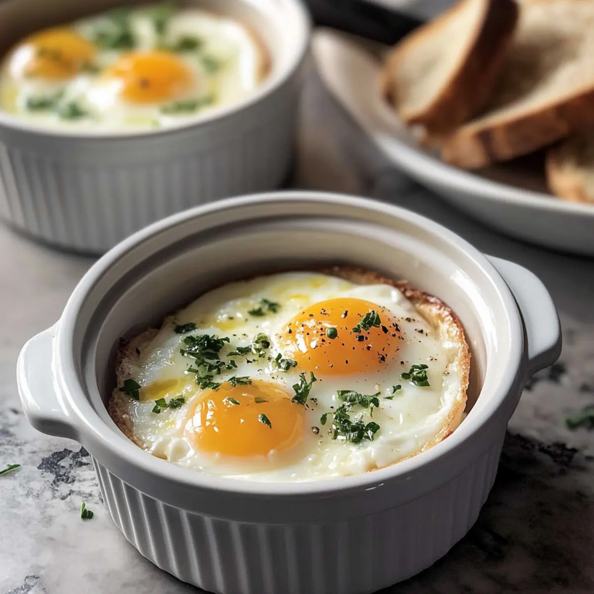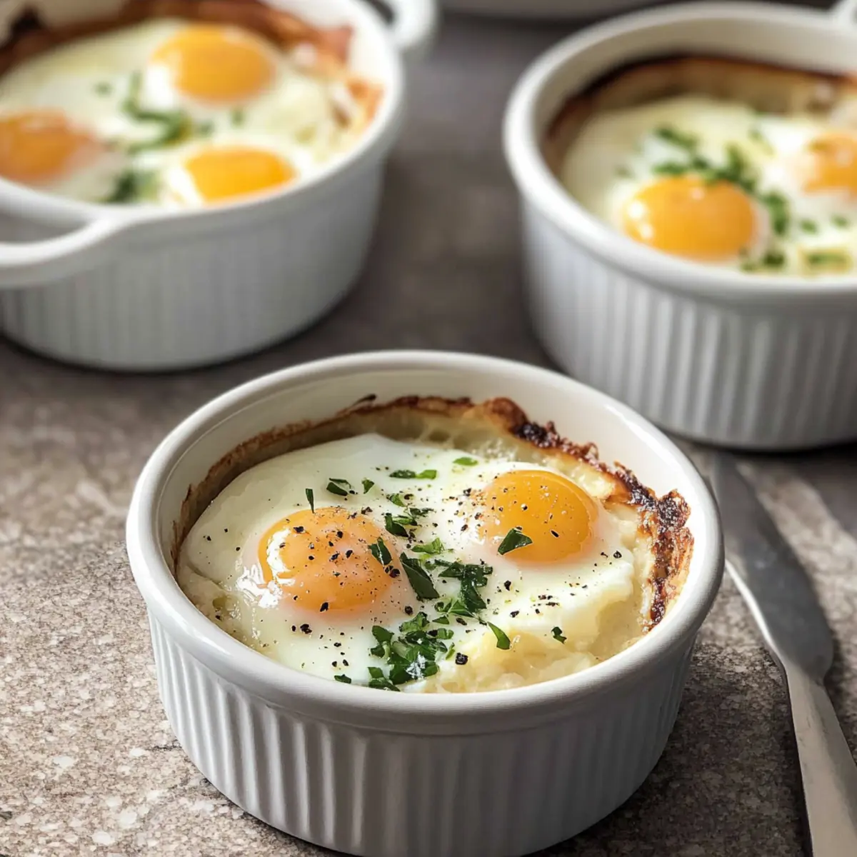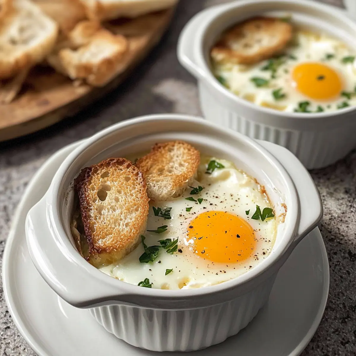 In einem kleinen Bistro in Paris sah ich einst, wie ein Chefkoch mit geschickten Händen perfekte Oeufs Cocotte zubereitete. Diese Französischen gebackenen Eier sind nicht nur ein himmlisches Frühstück, sondern auch eine elegante Option für jeden Brunch. Gedanken an die cremige Textur und die geschmackvollen Aromen von frischen Kräutern und Käse lassen mir jetzt noch das Wasser im Mund zusammenlaufen. Mit dieser einfachen und anpassbaren Rezeptur können Sie blitzschnell ein Gericht zaubern, das Ihre Familie und Freunde beeindrucken wird. Egal, ob Sie sie klassisch oder mit Gemüsevariationen zubereiten, diese gebackenen Eier bringen nicht nur Genuss auf den Teller, sondern sind auch glutenfrei und vegetarisch. Wer kann da schon widerstehen? Lassen Sie uns gemeinsam in die köstliche Welt der Französischen gebackenen Eier eintauchen! Warum werden Sie dieses Rezept lieben? Einfachheit, die begeistert: Die Zubereitung erfordert nur grundlegende Kochkünste, sodass auch Anfänger schnell loslegen können. Vielseitige Anpassungsmöglichkeiten: Ob mit frischen Kräutern, Gemüse oder einer Vielzahl von Käsesorten – Sie können die Oeufs Cocotte nach Ihrem Geschmack gestalten! Eleganter Genuss: Diese gebackenen Eier kombinieren eine cremige Textur mit aufregenden Aromen, die Ihre Gäste beeindrucken werden. Schnell zubereitet: In weniger als 30 Minuten sind Sie bereit, Ihre köstlichen Eier zu servieren, perfekt für geschäftige Morgen oder gemütliche Brunchs. Köstlich und nahrhaft: Mit einer hohen Proteinquellen passen diese Eier wunderbar zu einer ausgewogenen Ernährung, ganz gleich, ob Sie ein gesundes Frühstück oder Mittagessen möchten. Entdecken Sie auch den Eier Benedict Auflauf für eine weitere hervorragende Brunch-Idee! Zutaten für Französische gebackene Eier • Diese köstlichen Eier sind einfach anzupassen! Für die Basis Butter – sorgt für Reichhaltigkeit und verhindert das Festkleben; für eine nicht-milchhaltige Option kann auch Olivenöl verwendet werden. Crème Fraîche (oder Schlagsahne/Joghurt) – verleiht der Basis Cremigkeit; kann durch Sauerrahm oder eine milchfreie Alternative ersetzt werden. Eier – die Hauptzutat; liefern hochwertiges Protein; wählen Sie am besten Bio- oder Freiland-Eier für den besten Geschmack. Für den Geschmack Ziegenkäse – bietet einen würzigen Geschmack und eine cremige Textur; kann durch Feta oder Cheddar für unterschiedliche Geschmacksrichtungen ersetzt werden. Schnittlauch und Petersilie – frische Kräuter, die Helligkeit und Geschmack hinzufügen; alternativ können auch andere Kräuter wie Dill oder Thymian verwendet werden. Salz und Pfeffer – unverzichtbar für die Würze; nach Belieben anpassen. Topping-Optionen Sautiertes Gemüse – fügen Sie sautierten Spinat, Pilze oder übrig gebliebene geröstete Gemüse hinzu, bevor Sie die Eier hinzufügen. Zusätzliche Käsesorten – experimentieren Sie mit verschiedenen Käsesorten wie Feta oder Cheddar für abwechslungsreiche Aromen. Kräutervariationen – nutzen Sie alternativ Oregano, Thymian oder Dill je nach Ihrem Geschmack. Schritt-für-Schritt-Anleitung für Französische gebackene Eier Step 1: Ofen vorheizen und Wasser erhitzen Heizen Sie den Ofen auf 175°C vor und bringen Sie einen Topf mit Wasser zum Kochen. Dieser heiße Wasserdampf ist entscheidend, um die Französischen gebackenen Eier gleichmäßig zu garen. Stellen Sie sicher, dass das Wasser sprudelnd ist, bevor Sie fortfahren. Step 2: Ramekins vorbereiten Fetten Sie vier Ramekins (von 120–150 ml) mit Butter ein, um ein Ankleben der Eier zu verhindern. Achten Sie darauf, die Ramekins gleichmäßig zu beschichten. Dies sorgt nicht nur für einen schönen Geschmack, sondern hilft auch, die zarten Eierspeisen leicht herauszunehmen, wenn sie fertig sind. Step 3: Crème Fraîche hinzufügen Löffeln Sie jeweils einen Esslöffel Crème Fraîche, Schlagsahne oder Joghurt in den Boden jedes Ramekins. Diese Basis sorgt für die cremige Textur der Französischen gebackenen Eier. Verteilen Sie die Crème Fraîche gleichmäßig, um eine feste Grundlage für die Eier zu schaffen. Step 4: Eier knacken Brechen Sie vorsichtig ein Ei in jedes Ramekin und achten Sie darauf, das Eigelb nicht zu zerbrechen. Die Eier sollten direkt auf die Crème Fraîche gelegt werden, sodass die Kombination ihren vollen Geschmack entfalten kann. Überprüfen Sie, ob die Eier vollständig in der Creme eingesenkt sind. Step 5: Käse und Kräuter hinzufügen Streuen Sie etwas Ziegenkäse über die Eier und fügen Sie gehackte Kräuter wie Schnittlauch oder Petersilie hinzu. Diese Zutaten geben den Französischen gebackenen Eiern einen herrlichen Geschmack und eine besondere Note. Würzen Sie abschließend mit Salz und Pfeffer nach Geschmack, um den perfekten Gaumenkitzel zu erreichen. Step 6: Wasserbad vorbereiten Platzieren Sie die Ramekins in einer Auflaufform und füllen Sie diese mit dem heißen Wasser aus dem Topf, sodass das Wasser bis zur Hälfte der Seiten der Ramekins reicht. Das Wasserbad sorgt dafür, dass die Eier schonend garen und eine gleichmäßige Konsistenz erreichen. Achten Sie darauf, dass kein Wasser in die Ramekins gelangt. Step 7: Backen Schieben Sie die Auflaufform vorsichtig in den vorgeheizten Ofen und backen Sie die Französischen gebackenen Eier für 14-16 Minuten für flüssige Eigelbe oder 16-18 Minuten für weichere, cremige Eigelbe. Behalten Sie die Eier im Auge; sie sollten leicht wackeln, wenn sie fertig sind. Step 8: Servieren und genießen Nehmen Sie die Ramekins vorsichtig aus dem Ofen und lassen Sie sie kurz abkühlen. Servieren Sie die Französischen gebackenen Eier sofort mit frischem Toast zum Dippen. Genießen Sie dieses elegante Gericht, das ebenso köstlich wie einfach zuzubereiten ist! Vorbereitung für Französische gebackene Eier Die Französischen gebackenen Eier sind eine großartige Option für die Meal Prep! Sie können die Ramekins schon bis zu 24 Stunden im Voraus vorbereiten,