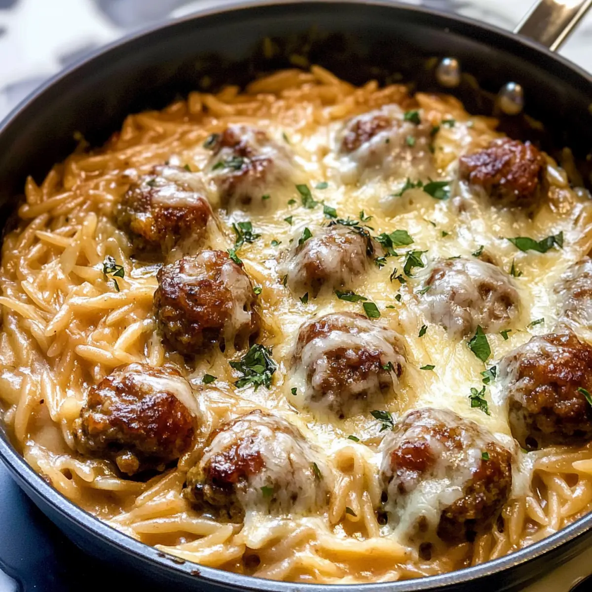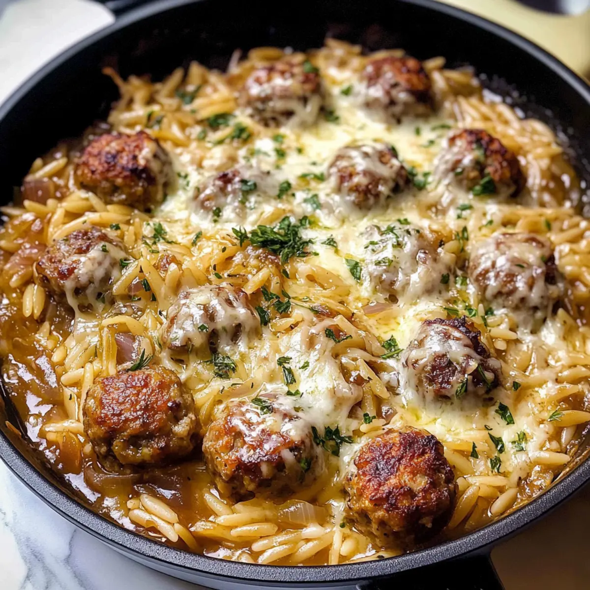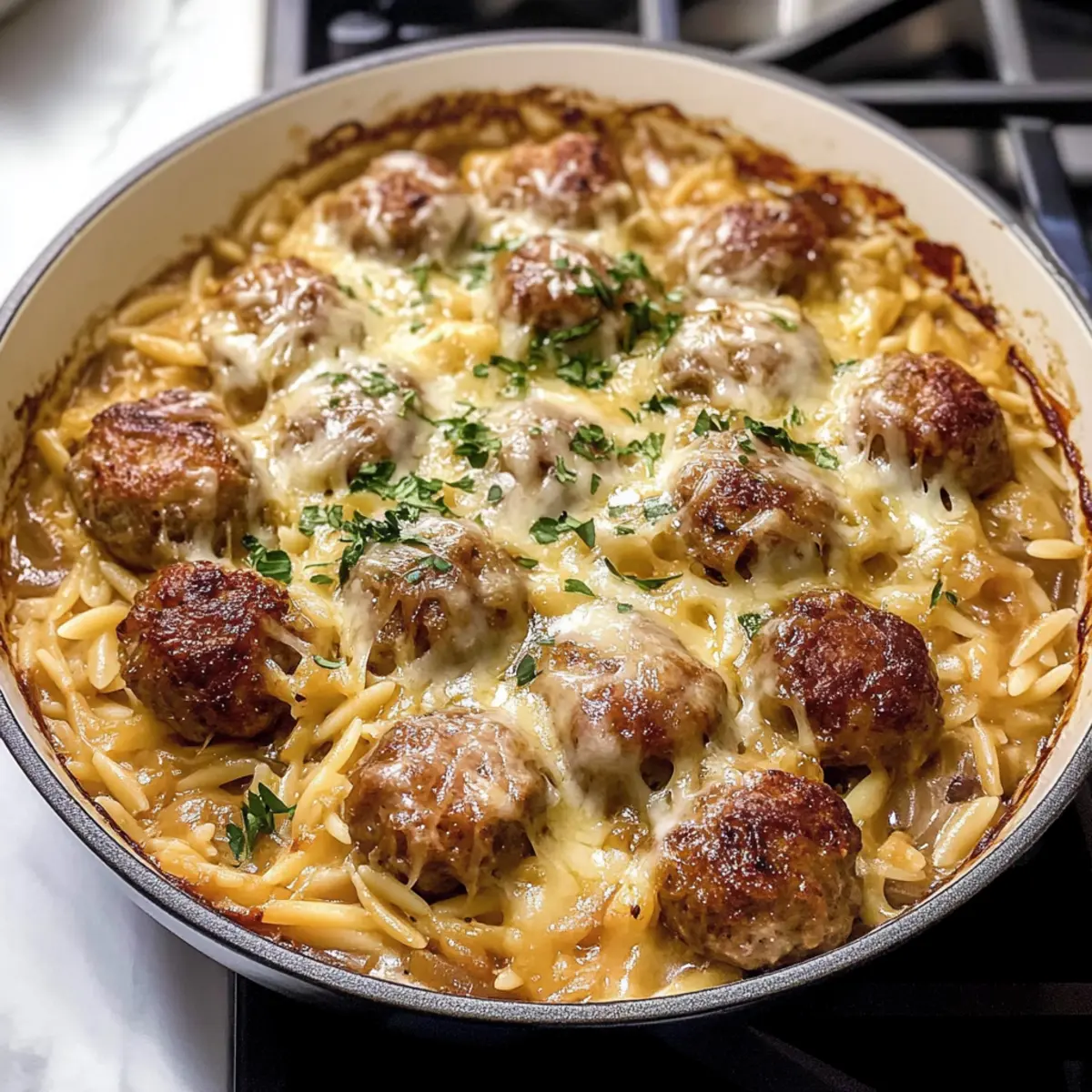 Als ich letzte Woche in meiner Küche stand, um ein bisschen zu experimentieren, offenbarte sich mir ein wahres Geschmackserlebnis: der Französische Zwiebel Orzo Auflauf mit Käse-Metabällchen! Diese Kombination aus saucigen, karamellisierten Zwiebeln und zarten Fleischbällchen aus Rind- und Schweinefleisch hat mich sofort in ihren Bann gezogen. Dieses Gericht ist nicht nur ein wohltuendes Comfort Food, sondern auch super einfach in der Zubereitung – perfekt für stressige Wochentage. Mit seinem reichhaltigen Geschmack, der an die klassische französische Zwiebelsuppe erinnert, wird es jeder Familie oder jedem Freundeskreis Freude bereiten. Wer kann da schon widerstehen? Seid ihr bereit, eure eigene köstliche Variante dieses Rezeptes auszuprobieren? Warum wirst du dieses Rezept lieben? Einfachheit pur: Die Zubereitung erfordert nur grundlegende Kochkenntnisse und ist somit für jeden machbar. Reichhaltiger Geschmack: Die Kombination aus herzhaften Fleischbällchen, cremigem Käse und süßen, karamellisierten Zwiebeln sorgt für ein unvergleichliches Geschmackserlebnis. Vielseitigkeit: Dieses Rezept kann leicht nach deinem Geschmack angepasst werden, zum Beispiel mit Gemüse wie Spinat oder Pilzen. Perfekt für jeden Anlass: Ob für ein gemütliches Familienessen oder eine Zusammenkunft mit Freunden, dieser Auflauf kommt immer gut an! Einfache Resteverwertung: Ideal zum Aufbewahren im Kühlschrank oder Einfrieren für zukünftige Mahlzeiten – so sparst du Zeit in der Küche. Lass deine Gäste mit einem Stück frisch gebackenem Brot oder einem einfachen Salat dazu schlemmen – eine perfekte Ergänzung! Französische Zwiebel Orzo Auflauf Zutaten • Entdecke die Zutaten für deinen köstlichen Französischen Zwiebel Orzo Auflauf! Für die Fleischbällchen Rinderhackfleisch – sorgt für reichhaltigen Geschmack; kann durch Putenhackfleisch für eine leichtere Variante ersetzt werden. Schweinehackfleisch – bringt Feuchtigkeit und einen einzigartigen Geschmacksprofil; kann durch Hähnchenhackfleisch weggelassen oder ersetzt werden. Panko-Brösel – sorgt für die nötige Textur; biologisch abbaubar durch herkömmliche Brösel. Gruyère-Käse – liefert eine cremige, nussige Note; auch mit Schweizer Käse ersetzbar. Knoblauch – verstärkt den Geschmack; frischer Knoblauch für das beste Ergebnis verwenden. Frischer Thymian – gibt erdige Noten; getrockneter Thymian (1 Teelöffel) kann verwendet werden. Koscheres Salz & schwarzer Pfeffer – nach Geschmack würzen; Grundzutaten zur Geschmacksverbesserung. Für die Sauce Vidalia-Zwiebeln – unerlässlich für die süßen, karamellisierten Aromen; kann durch süße oder gelbe Zwiebeln ersetzt werden. Butter – fügt der Karamellisierung Reichhaltigkeit hinzu; kann durch Olivenöl für eine gesündere Option ersetzt werden. Mehl – verdickt die Sauce; Maisstärke (1 Esslöffel) als glutenfreie Alternative verwenden. Trocken Weißwein – deglasiert die Pfanne und verstärkt den Geschmack; für eine alkoholfreie Variante kann Hühnerbrühe genutzt werden. Rinderbrühe – bildet die Basis für die Kochflüssigkeit; Better Than Bouillon sorgt für mehr Umami; Gemüsebrühe für einen leichteren Geschmack. Orzo-Pasta – saugt die Aromen auf und sorgt für Struktur; glutenfreie Alternativen wie Quinoa oder Reis sind möglich. Schritt-für-Schritt-Anleitungen für den Französischen Zwiebel Orzo Auflauf mit Fleischbällchen Step 1: Fleischbällchen vorbereiten Heize den Ofen auf 200°C vor. In einer großen Schüssel vermischst du das Rinderhackfleisch, das Schweinehackfleisch, die Panko-Brösel, den Gruyère-Käse, den gehackten Knoblauch, die Milch, die Worcestershire-Sauce, den Thymian, das Salz und den Pfeffer. Forme etwa 25 gleich große Bällchen und lege sie auf ein mit Backpapier ausgelegtes Blech. Backe sie für 15 Minuten, bis sie goldbraun sind. Step 2: Zwiebeln karamellisieren Während die Fleischbällchen im Ofen sind, erhitze in einer großen, tiefen Pfanne bei mittlerer Hitze die Butter. Füge die geschnittenen Vidalia-Zwiebeln, etwas Thymian und eine Prise Salz hinzu. Sauté die Zwiebeln für etwa 30 Minuten, bis sie weich und karamellisiert sind. Rühre regelmäßig um und füge bei Bedarf einen Esslöffel Wasser hinzu, um ein Anbrennen zu vermeiden. Step 3: Sauce zubereiten Nachdem die Zwiebeln karamellisiert sind, streue das Mehl über die Zwiebeln und rühre für etwa 1 Minute, um die Röststoffe aufzunehmen. Gieße den Weißwein langsam in die Pfanne, um die Aromen zu lösen, und koche etwa 2-3 Minuten lang, bis der Wein reduziert ist. Füge dann die Rinderbrühe, etwas frischen Thymian und Salz hinzu. Lasse die Mischung sanft köcheln, um die Sauce zu verdicken. Step 4: Orzo kochen Gib den Orzo in die Pfanne mit der Sauce und rühre gut um, damit der Orzo gleichmäßig verteilt wird. Koche die Mischung unter gelegentlichem Rühren für 10-12 Minuten, bis der Orzo al dente ist und die Sauce absorbiert hat. Achte darauf, dass die Hitze nicht zu hoch ist, damit nichts anbrennt. Die Textur sollte cremig und einladend sein. Step 5: Überbacken Nimm die gebackenen Fleischbällchen aus dem Ofen und brich sie vorsichtig in die Pfanne mit dem Orzo. Streue den restlichen Gruyère-Käse gleichmäßig über die Fleischbällchen und den Orzo. Stelle die Pfanne unter den Grill (Broiler) und lasse sie 5 Minuten backen, bis der Käse blubbert und goldbraun ist. Achte darauf, regelmäßig nachzusehen, damit der Käse nicht verbrennt. Variationen & Alternativen Es macht Spaß, Rezepte nach deinem eigenen Geschmack zu gestalten und zu variieren! Leichtere Variante: Ersetze das Rinder- und Schweinehackfleisch durch Putenhackfleisch oder eine pflanzliche Alternative für eine gesündere Option. Dies macht das Gericht weniger schwer und dennoch köstlich. Gemüse hinzufügen: Integriere frischen Spinat oder sautierte Champignons in die Sauce, um etwas mehr Farbe und Nährstoffe in dein Gericht zu bringen. Das gibt dem Auflauf einen