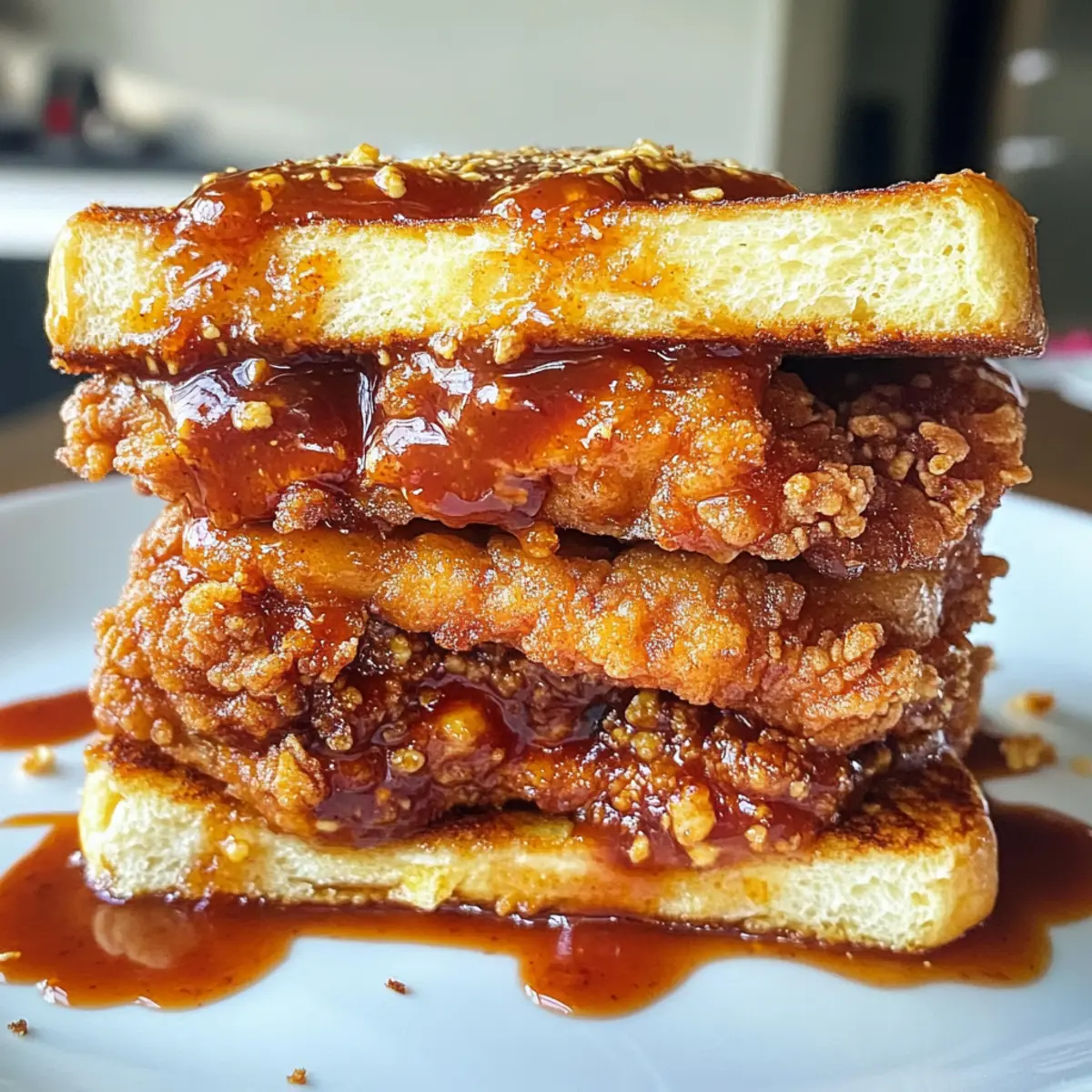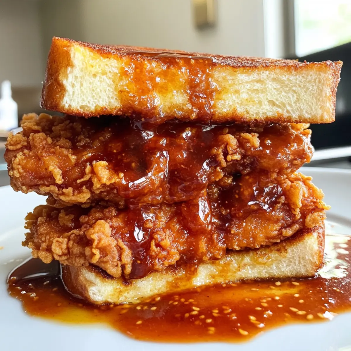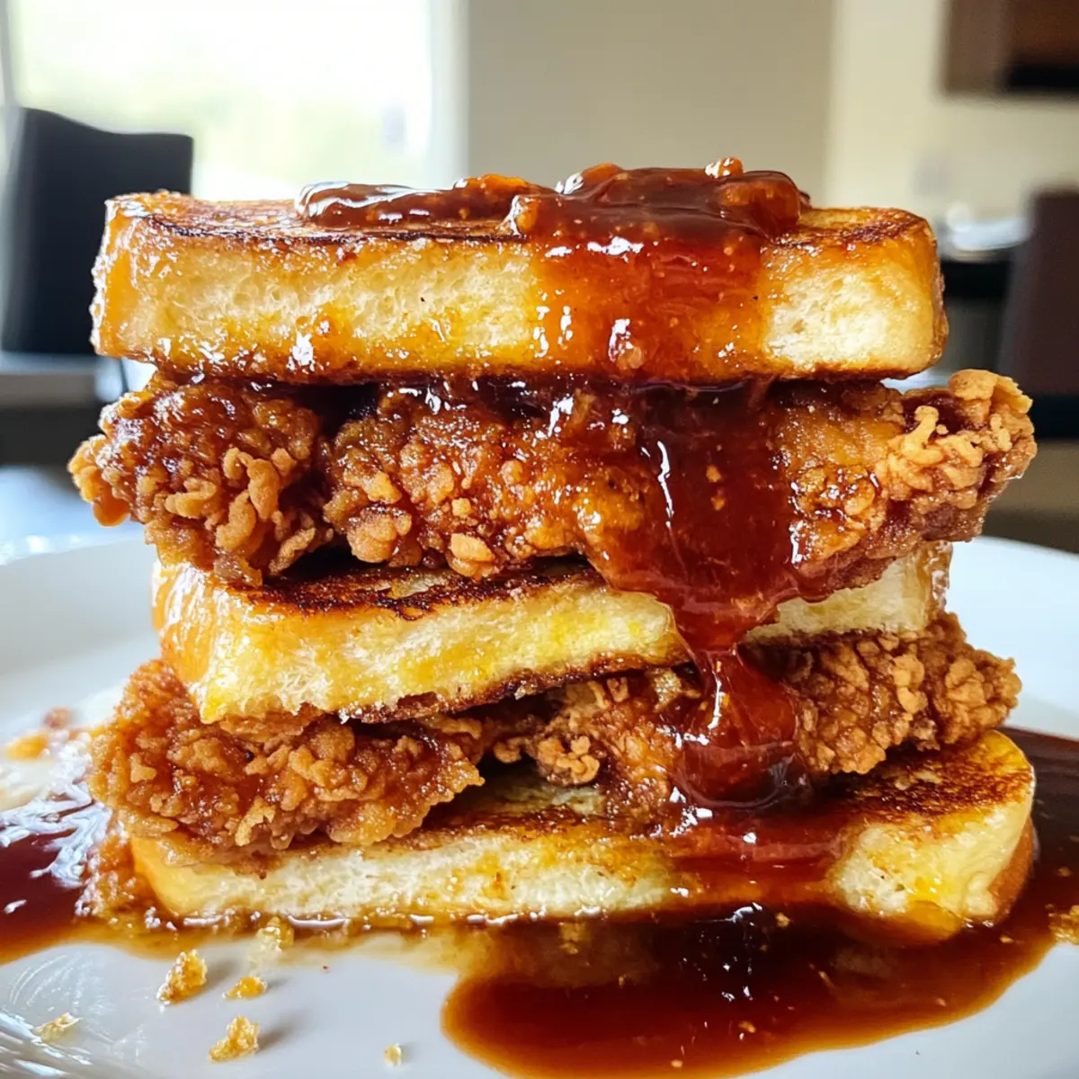 Entdecke das frittierte Hähnchen-Sandwich mit französischem Toast - ein Genuss, der süße und herzhafte Aromen vereint. Perfekt für den Brunch!