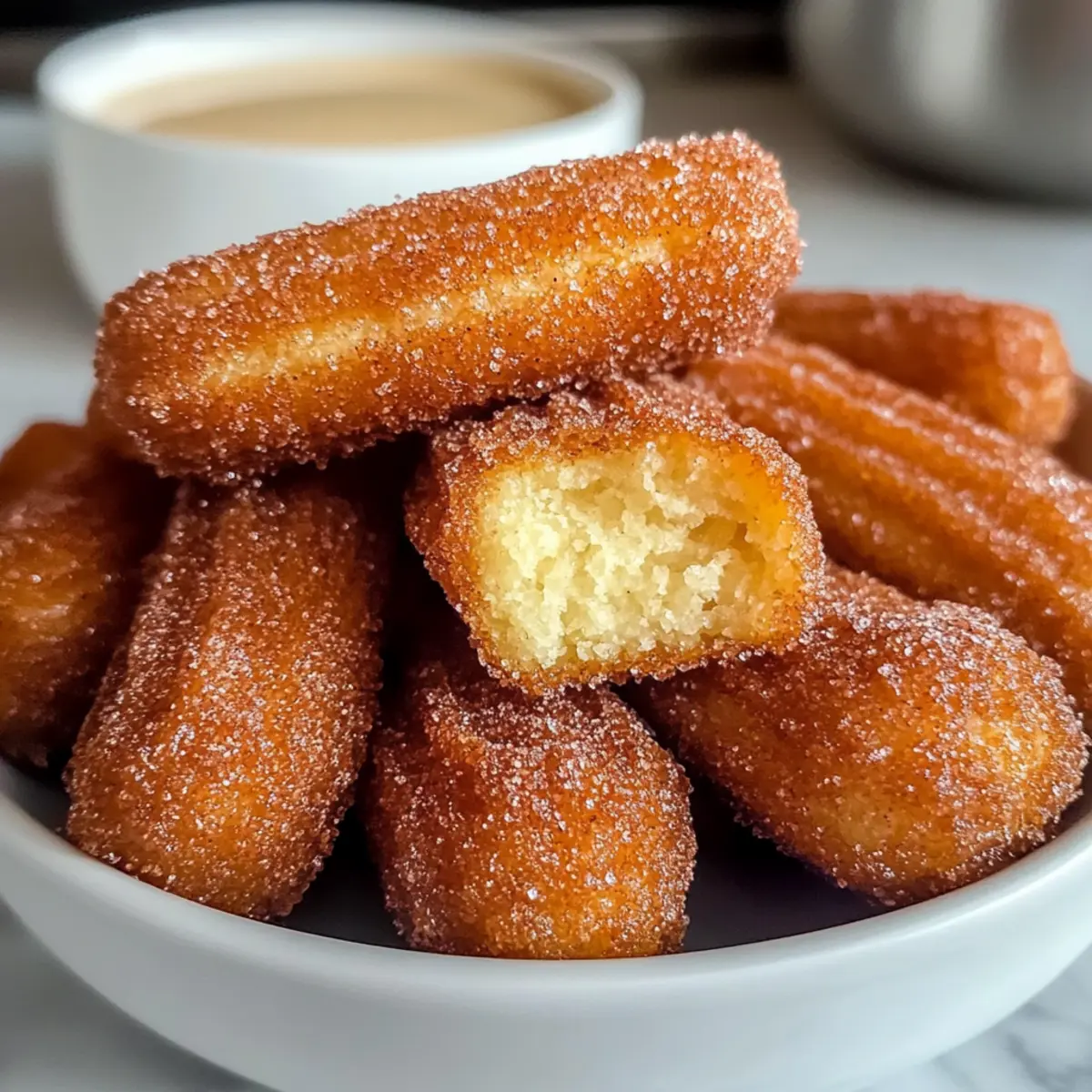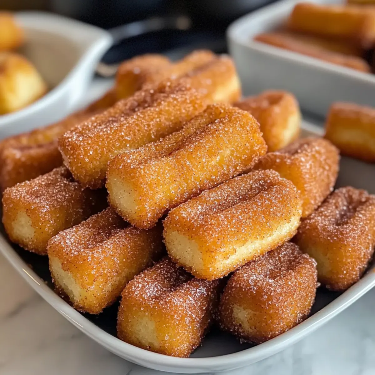 Wusstest du, dass du dir mit nur wenigen einfachen Zutaten eine köstliche Leckerei zaubern kannst, die Groß und Klein begeistert? Diese Gebackenen Churro Bissen sind nicht nur unwiderstehlich lecker, sondern auch kinderleicht zuzubereiten. Mit ihrem knusprigen Äußeren und der warmen Zimt-Zucker-Beschichtung sind sie perfekt für spontane Nachmittage oder als schnelle Dessertidee nach dem Abendessen. Du wirst dich freuen, dass sie im Ofen gebacken werden, was sie nicht nur gesünder macht, sondern auch weniger Aufwand bedeutet – der einfache Genuss des Lebens! Bereit, deine Küche in ein süßes Paradies zu verwandeln? Lass uns diese verführerischen Bissen gemeinsam zubereiten! Warum sind diese Churro Bissen unwiderstehlich? Einfachheit: Die Zubereitung ist kinderleicht und erfordert nur grundlegende Backfähigkeiten. Wunderbar knusprig: Außen goldbraun und knusprig, innen weich und zart – ein perfekter Kontrast. Vielseitige Serviermöglichkeiten: Genieße sie warm mit Schokoladensauce oder dulce de leche für ein Extra an Genuss. Gesündere Wahl: Da sie im Ofen gebacken werden, sind sie eine leichtere Alternative zu traditionellen frittierten Churros. Großer Spaß für Kinder: Diese kleinen Leckereien sind nicht nur einfach zuzubereiten, sondern erfreuen auch die Kleinen beim Essen! Schnell gemacht: Perfekt für spontane Wünsche, da sie nur 20-25 Minuten im Ofen brauchen – ideal für ein schnelles Dessert nach dem Abendessen. Gebackene Churro Bissen Zutaten • Verwandle deine Küche in ein süßes Paradies mit diesen einfachen Zutaten! Für den Teig Allzweckmehl – sorgt für die benötigte Struktur für die klassischen Churro-Bissen. Butter – fügt Reichhaltigkeit und Geschmack hinzu; hält die Churros feucht. Brauner Zucker – bringt eine reiche Süße und eine Prise Karamellgeschmack ins Spiel. Salz – verstärkt den Gesamtgeschmack und balanciert die Süße. Wasser – hilft, die Zutaten zu kombinieren und die Teigstruktur zu formen. Eier – binden den Teig und sorgen für etwas Auflockerung, was für eine leichte Textur notwendig ist. Vanilleextrakt – verleiht eine Geschmacksvielfalt; kann auch durch Mandelessenz ersetzt werden. Für die Zimt-Zucker-Beschichtung Zucker mit Zimt – die süße Würze, die diesen gebackenen Churro Bissen ihren charakteristischen Geschmack verleiht; einfach Zimt mit Zucker mischen. Diese gebackenen Churro Bissen sind nicht nur ein Genuss, sondern auch eine schnelle und kinderfreundliche Leckerei! Schritt-für-Schritt-Anleitung für Gebackene Churro Bissen Schritt 1: Teig vorbereiten In einem mittelgroßen Kochtopf Kombiniere Wasser, Butter, braunen Zucker und Salz. Erhitze die Mischung bei mittlerer Hitze und bringe sie zum Simmern, bis die Butter geschmolzen ist. Dies dauert etwa 2-3 Minuten. Achte darauf, die Mischung nicht zu kochen, da wir eine glatte Grundlage für unsere Gebackenen Churro Bissen kreieren möchten. Schritt 2: Mehl einrühren Füge nun das Allzweckmehl auf einmal hinzu und rühre kräftig mit einem Holzlöffel oder einem Spatel, bis ein klebriger Teig entsteht. Dies braucht etwa 5 Minuten. Der Teig sollte von den Seiten des Topfes loskommen und eine glatte, zusammenhängende Masse bilden. Schritt 3: Abkühlen und Vanille hinzufügen Nehme den Topf vom Herd und lasse den Teig einige Minuten abkühlen, damit er nicht zu heiß ist, wenn du die Eier hinzufügst. Nachdem der Teig leicht abgekühlt ist, rühre den Vanilleextrakt ein, um ihm eine wunderbare Geschmacksnote zu verleihen. Schritt 4: Eier unterrühren Schlage nun die Eier einzeln in den Teig ein und rühre gründlich, bis jedes Ei gut eingearbeitet ist. Dadurch wird der Teig leicht und luftig. Du solltest einen glatten und leicht klebrigen Teig erhalten, der bereit ist, in die Form gebracht zu werden. Schritt 5: Ofen vorheizen und Backbleche vorbereiten Heize deinen Ofen auf 220°C vor und bereite zwei Backbleche mit Backpapier vor. Sorge dafür, dass die Bleche groß genug sind, um genügend Platz für die Gebackenen Churro Bissen zu bieten, damit sie nicht zusammenkleben. Schritt 6: Teig spritzen Verwende einen Spritzbeutel mit einer großen Sterntülle, um 7-10 cm lange Teigstreifen auf die vorbereiteten Backbleche zu spritzen. Achte darauf, genügend Abstand zwischen den Streifen zu lassen, damit sie während des Backens Platz zum Aufgehen haben. Schritt 7: Backen Backe die Gebackenen Churro Bissen im vorgeheizten Ofen für 20-25 Minuten, bis sie aufgegangen sind und eine goldbraune Farbe angenommen haben. Sie sollten außen knusprig und innen weich sein. Halte in den letzten Minuten ein Auge darauf, um ein Überbacken zu vermeiden. Schritt 8: Abkühlen lassen Lasse die Churros nach dem Backen noch für etwa 10 Minuten im Ofen, damit sie weiterhin knusprig bleiben. Stelle sicher, dass die Ofentür leicht geöffnet bleibt, damit die Feuchtigkeit entweichen kann und sie nicht weich werden. Schritt 9: Mit Butter bestreichen und zuckern Nachdem die Gebackenen Churro Bissen leicht abgekühlt sind, pinsel sie großzügig mit geschmolzener Butter. Anschließend wälze sie in einer Mischung aus Zucker und Zimt, bis sie gleichmäßig bedeckt sind und herrlich glänzen. Schritt 10: Servieren Serviere die Gebackenen Churro Bissen sofort für den besten Geschmack und die beste Textur. Sie passen perfekt zu einer Schokoladensauce oder dulce de leche zum Dippen und machen jede Nascherei zu einem besonderen Vergnügen! Gebackene Churro Bissen Variationen Lass deiner Kreativität freien Lauf und passe dieses Rezept nach deinem Geschmack an! Dairy-Free: Verwende Pflanzenmargarine anstelle von Butter für eine vegane Variante. Glutenfrei: Ersetze das Allzweckmehl durch eine glutenfreie Mehlmischung für einen glutenfreien Genuss. Kokosgeschmack: Füge einen Teelöffel Kokosnussextrakt hinzu, um einem tropischen Flair zu verleihen. Eine interessante Wendung, die deine Geschmacksknospen überraschen wird! Schokoladensauce: Experimentiere mit verschiedenen Schokoladensa