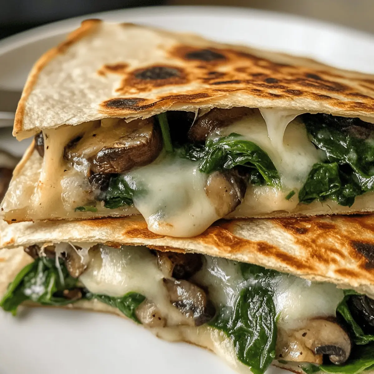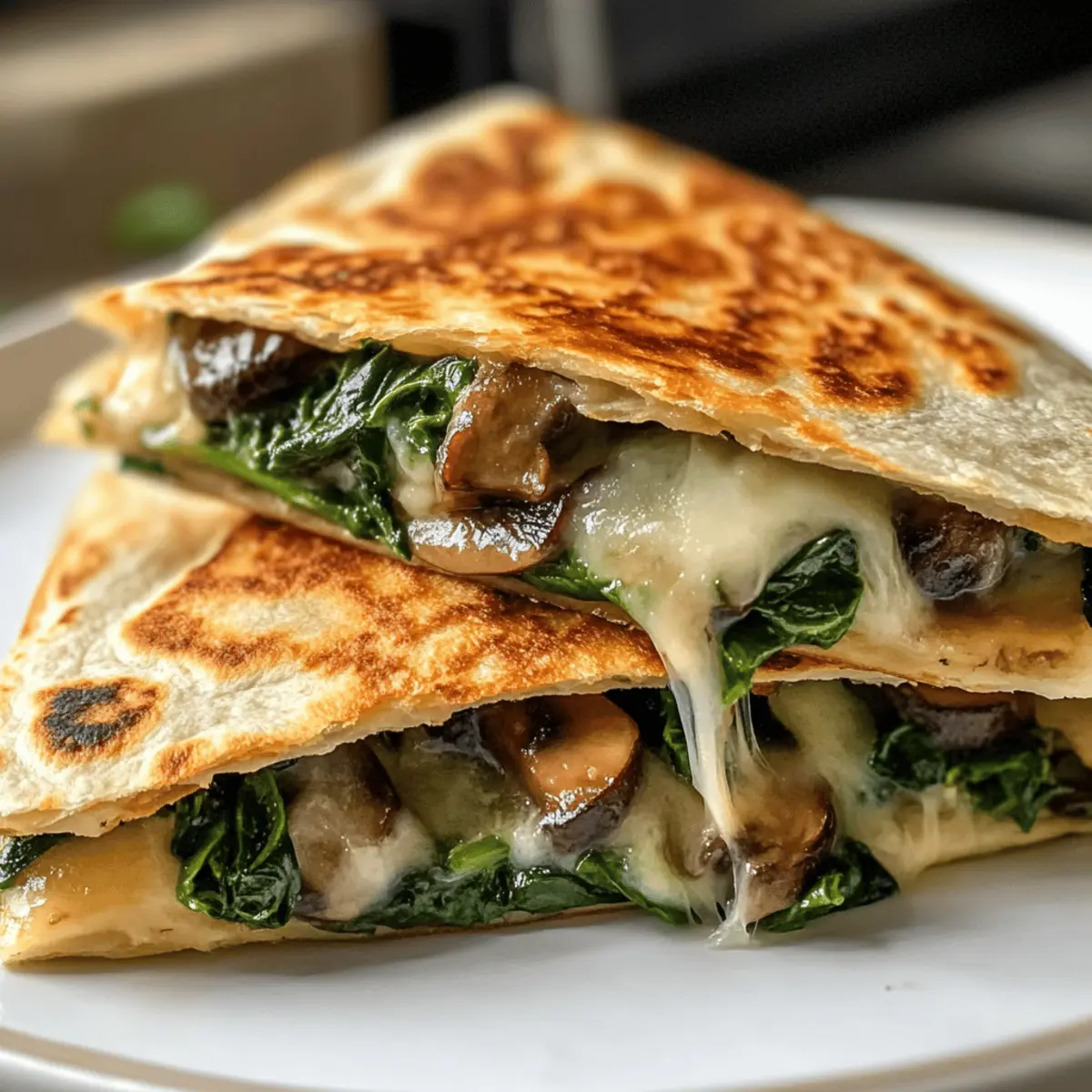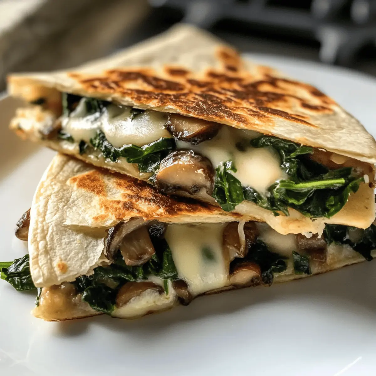 Eines Abends, umgeben von einer angenehmen Kühle, entdeckte ich beim Stöbern in meiner Küche die perfekten Zutaten für eine kreative Idee: Gebratene Spinat-Pilz-Quesadillas. Diese köstlichen kleinen Packer sind nicht nur einfach zuzubereiten, sondern bieten auch eine gesunde Alternative zu schnellen Snacks. Die Kombination aus zartem Spinat und aromatischen Pilzen, umhüllt von knusprigen Tortillas, wird selbst die anspruchsvollsten Gaumen begeistern. Außerdem ermöglichen sie durch ihre Vielseitigkeit individuelle Anpassungen – sei es glutenfrei mit Mais-Tortillas oder vegan mit pflanzlichem Käse. Wenn du Lust auf eine schnelle, gesunde Mahlzeit hast, wirst du diese Quesadillas lieben! Bereit für ein Rezept, das deine Küche in eine wahre Genuss-Oase verwandelt? Warum du diese Quesadillas lieben wirst Einfachheit: Die Zubereitung dieser gebratenen Spinat-Pilz-Quesadillas ist kinderleicht – perfekt für geschäftige Abende! Gesunde Alternative: Diese Quesadillas bieten eine nahrhafte Option, die leicht in deine Ernährung integriert werden kann. Vielseitig: Mit der Möglichkeit, verschiedene Gemüsesorten oder Käsealternativen zu verwenden, sind sie für jeden Geschmack geeignet. Knusprig und köstlich: Der goldbraune, knusprige Tortillenteig umhüllt eine cremige, schmelzende Füllung, die begeistert. Schnell zubereitet: In nur wenigen Minuten hast du ein leckeres Gericht, das Familie und Freunde gleichermaßen erfreut. Mach dich bereit, diese köstliche Mischung aus Aromen zu genießen! Gebratene Spinat-Pilz-Quesadillas Zutaten Für die Tortillas • Tortillas – Diese bilden die Grundlage für die Quesadillas; benutze Mais-Tortillas für eine glutenfreie Option. • Olivenöl – Ein leichtes Beschichten sorgt für zusätzliche Knusprigkeit; du kannst es weglassen, um Kalorien zu sparen. Für die Füllung • Geriebener Mozzarella – Sorgt für eine wunderbar schmelzende Textur; kannst alternativ auch pflanzlichen Käse verwenden, um sie vegan zu machen. • Geriebener Cheddar – Fügt eine kräftige Geschmacksnote hinzu; jeder Käsesort passt hier gut. • Gechnippelter Spinat – Bringt Farbe und Nährstoffe; kann durch Grünkohl ersetzt werden, wenn du etwas Neues ausprobieren möchtest. • In Scheiben geschnittene Pilze – Fügen einen erdigen Geschmack und Feuchtigkeit hinzu; eine gute Alternative sind Paprika oder Zucchini, falls gewünscht. Genieße die Zubereitung deiner gebratenen Spinat-Pilz-Quesadillas und lass dich von den Aromen verführen! Schritt-für-Schritt-Anleitungen für Gebratene Spinat-Pilz-Quesadillas Step 1: Ofen vorheizen Heize den Ofen auf 200 °C vor. Dies stellt sicher, dass deine gebratenen Spinat-Pilz-Quesadillas gleichmäßig und knusprig gebacken werden. Nutze dafür ein Backblech mit Backpapier, um ein Ankleben zu verhindern und das Aufräumen zu erleichtern. Step 2: Gemüse sautieren Erhitze in einer Pfanne einen Esslöffel Olivenöl bei mittlerer Hitze. Füge ungefähr eine minute lang gehackten Knoblauch hinzu, bis er aromatisch ist. Gib die in Scheiben geschnittenen Pilze hinzu und brate sie fünf Minuten lang, bis sie zart sind. Rühre dann den geschnittenen Spinat unter, bis er verwelkt ist. Mit Salz und Pfeffer abschmecken und vom Herd nehmen. Step 3: Quesadillas zusammenstellen Nimm eine Tortilla und lege sie auf eine saubere Arbeitsfläche. Platziere auf einer Hälfte die sautierte Spinat-Pilz-Mischung und streue eine großzügige Menge geriebenen Mozzarella- und Cheddar-Käse darüber. Klappe die Tortilla vorsichtig zur Hälfte, sodass die Füllung eingeklappt ist, und drücke leicht an, um die Füllung zu sichern. Step 4: Quesadillas backen Lege die gefüllten Tortillas auf das vorbereitete Backblech. Backe die Quesadillas bei 200 °C für 10 bis 12 Minuten. Wende sie zur Halbzeit, damit beide Seiten goldbraun und knusprig werden. Die Quesadillas sind fertig, wenn sie eine schön goldene Farbe angenommen haben. Step 5: Schneiden und servieren Lass die gebratenen Spinat-Pilz-Quesadillas kurz abkühlen, damit der Käse sich setzen kann. Schneide sie in Keile und serviere sie warm. Ergänze sie nach Belieben mit Salsa, saurer Sahne oder Guacamole für zusätzlichen Geschmack und genieße diese köstliche Kombination! Lagerung und Einfrieren von Gebratenen Spinat-Pilz-Quesadillas Kühlschrank: Bewahre die Quesadillas in einem luftdichten Behälter auf, damit sie bis zu 3 Tage frisch bleiben. Achte darauf, dass sie abgekühlt sind, bevor du sie einlagerst. Gefrierschrank: Für eine längere Haltbarkeit kannst du die Quesadillas einzeln einwickeln und bis zu 2 Monate einfrieren. So bleiben sie bei Bedarf immer griffbereit für einen schnellen Snack. Wiedererwärmen: Um die Quesadillas wieder knusprig zu machen, erwärme sie im Ofen oder in der Heißluftfritteuse. Vermeide die Mikrowelle, da diese die Quesadillas matschig machen kann. Vorbereitung: Bereite die Quesadillas im Voraus vor und kühle sie vor dem Einfrieren komplett ab. So bleibt die Füllung optimal und die Quesadillas behalten ihre köstliche Konsistenz. Meal Prep für Gebratene Spinat-Pilz-Quesadillas Die Gebratenen Spinat-Pilz-Quesadillas sind ideal für Meal Prep und bieten dir wertvolle Zeitersparnis an geschäftigen Wochentagen! Du kannst die Füllung – bestehend aus sautierten Spinat und Pilzen – bis zu 3 Tage im Voraus zubereiten und in einem luftdichten Behälter im Kühlschrank lagern, um die Frische zu bewahren. Um die Qualität zu erhalten, achte darauf, die Mischung vollständig abkühlen zu lassen, bevor du sie verpackst. Wenn du bereit bist, die Quesadillas zuzubereiten, erhitze den Ofen auf 200 °C, befülle die Tortillas mit der vorbereiteten Mischung, füge den Käse hinzu, klappe sie und backe sie für 10-12 Minuten, bis sie goldbraun und knusprig sind. So genießt du leckere Quesadillas mit minimalem Aufwand! Variationen & Alternativen für Gebratene Spinat-Pilz-Quesadillas Lass deiner Kreativität freien Lauf und passe dieses Rezept nach deine