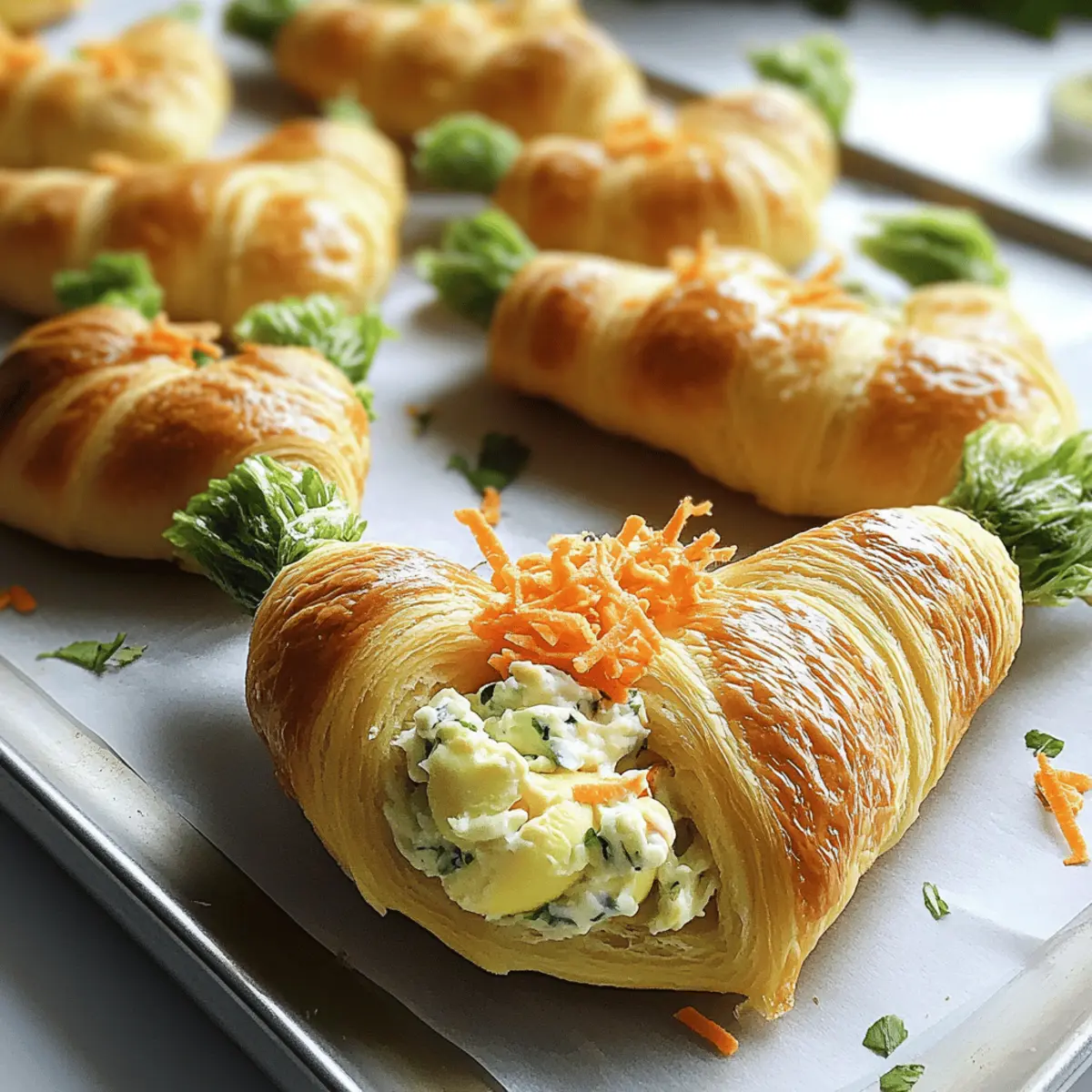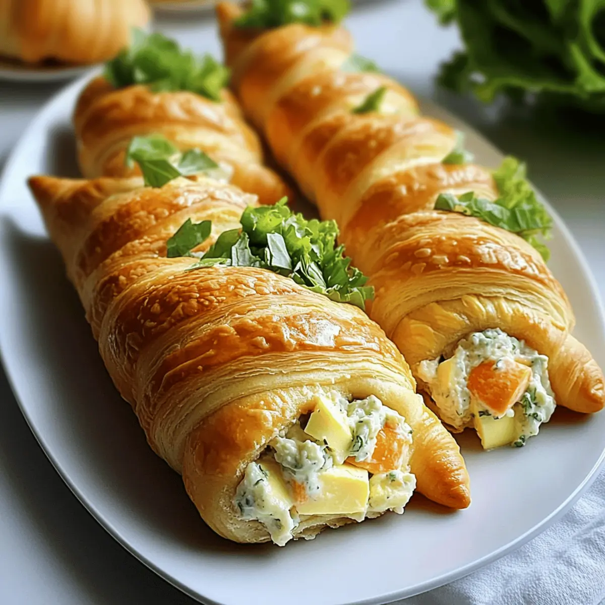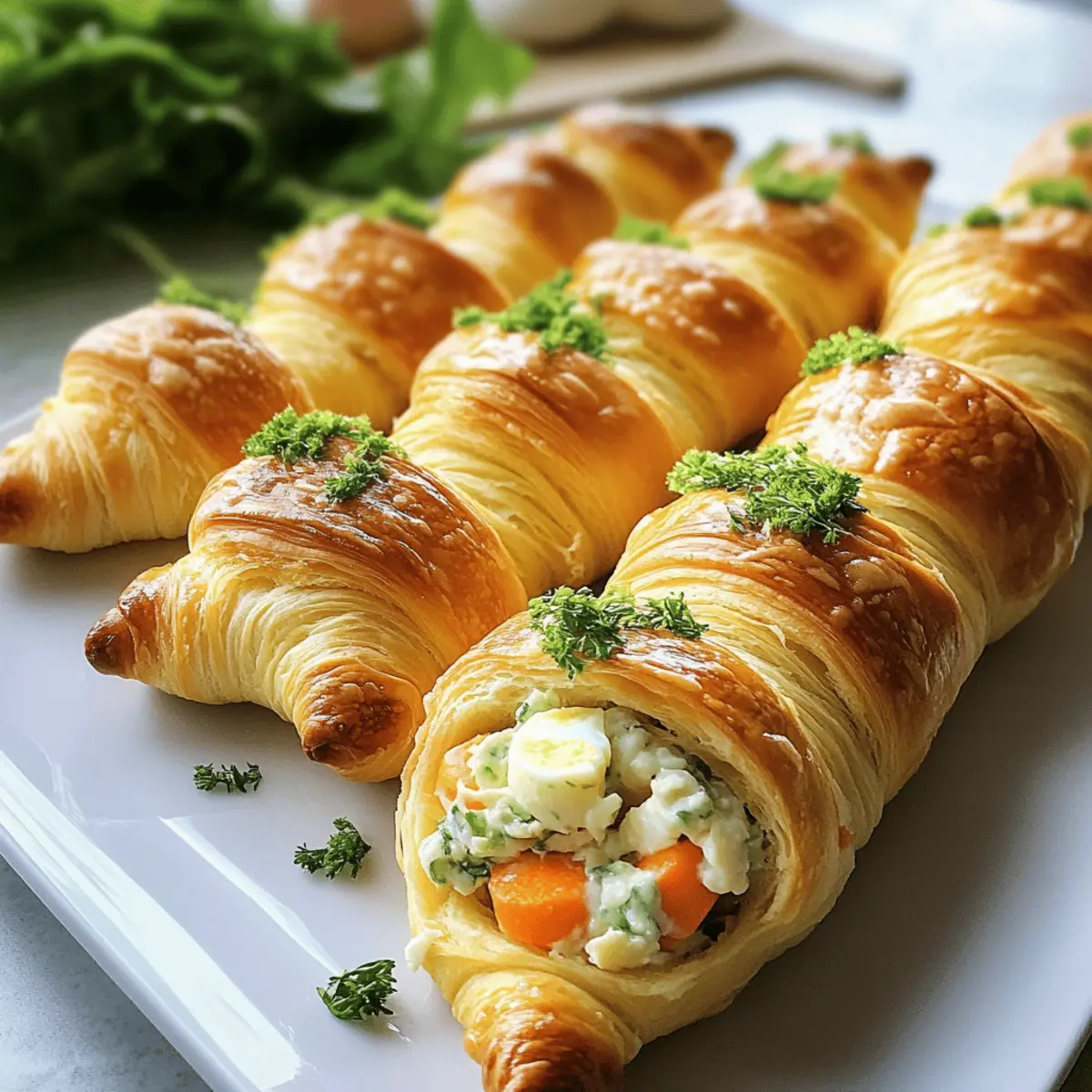 Als ich zum ersten Mal die Idee hatte, gefüllte Croissant-Rüben zu machen, war ich sofort begeistert. Die Vorstellung, die buttrigen, flauschigen Croissants in fröhliche Karottenformen zu verwandeln, weckte meine kreative Seite in der Küche. Diese kleinen Wunderwerke sind nicht nur ein optischer Genuss, sondern auch ein echtes Highlight auf jedem Brunch-Buffet oder bei Frühlingsfeiern. Das Schönste ist, dass sie schnell zubereitet sind und man die Füllungen ganz nach Wunsch anpassen kann – von klassischem Eiersalat über herzhaften Thunfischsalat bis hin zu veganem Hummus. Mit ihren lebhaften Farben und der spielerischen Form werden diese gefüllten Croissant-Rüben garantiert die Herzen von Groß und Klein erobern. Seid ihr bereit, mit mir in die Welt der kulinarischen Kreativität einzutauchen? Warum sind diese gefüllten Croissant-Rüben einzigartig? Kreativität: Diese gefüllten Croissant-Rüben sind nicht nur ein Hingucker, sondern auch eine Einladung zur kreativen Entfaltung in der Küche. Leckere Vielfalt: Du kannst die Füllungen nach Lust und Laune anpassen – ob mit herzhaftem Thunfischsalat oder einer veganen Hummus-Option. Schnelle Zubereitung: In kürzester Zeit hast du eine beeindruckende Speise gezaubert, die auf jedem Brunch-Buffet oder Frühlingsfest glänzt. Familienfreundlich: Groß und Klein werden von der spielerischen Form und dem köstlichen Geschmack begeistert sein. Für mehr köstliche Ideen schau dir auch unsere Boursin Gefüllte Datteln oder die Gefüllte Paprika Feta an! Zutaten für gefüllte Croissant-Rüben Für den Teig Crescent-Roll-Teig – Verwende gekühlte Crescent Rolls von Pillsbury für optimalen Fluff und Geschmack. Alufolie – Gestalte deine eigenen Kegel; sie sind ideal für die Form der Karotten. Für die Füllung Frischkäse – Sorgt für eine cremige Konsistenz; griechischer Joghurt ist eine leichtere Alternative. Hartgekochte Eier – Liefert wertvolles Protein; fein gehackt erleichtert das Mischen. Majonnaise – Für die nötige Feuchtigkeit und Geschmack; griechischer Joghurt ist eine gesunde Option. Dijon-Senf – Fügt eine leichte Schärfe hinzu; nach Geschmack dosieren. Knoblauchpulver & Zwiebelpulver – Verstärken den Geschmack; nach Belieben anpassen. Salz und Pfeffer – Zur Würzung; stets nach Geschmack abschmecken. Geriebener Salat oder Petersilie – Als Garnitur; sorgt für Frische und sieht aus wie Karottenspitzen. Ei (zum Bestreichen) – Gibt den Croissant-Rüben eine schöne Farbe; optional mit orangener Lebensmittelfarbe für einen besonderen Look. Orangene Lebensmittelfarbe (optional) – Für eine festliche Optik, die den Teig aufhebt. Mit diesen Zutaten wirst du sicher ein köstliches und kreatives Gericht zaubern, das sowohl das Auge als auch den Gaumen erfreut! Step-by-Step Instructions für Gefüllte Croissant-Rüben Step 1: Ofen vorheizen Heize den Ofen auf 200°C (400°F) vor und lege ein Backblech mit Backpapier aus. Dies wird sicherstellen, dass die gefüllten Croissant-Rüben gleichmäßig backen und nicht ankleben. Bereite alles nötige Equipment vor, um einen reibungslosen Ablauf zu gewährleisten. Step 2: Folienkegel vorbereiten Reiße einige Streifen Aluminiumfolie ab und forme diese zu Kegeln, indem du sie leicht drückst. Besprühe die Kegel mit einem Antihaftspray, damit der Teig beim Backen nicht an der Folie kleben bleibt. Diese Kegel sind die Grundlage für die Form der gefüllten Croissant-Rüben. Step 3: Croissant-Teig wickeln Rolle den Crescent-Roll-Teig aus und trenne ihn in die vorgegebenen Dreiecke. Wickele jedes Dreieck um die vorbereiteten Folienkegel, wobei die Ränder leicht überlappen, um eine gute Struktur zu gewährleisten. Diese Form ist entscheidend für das Erscheinungsbild deiner gefüllten Croissant-Rüben. Step 4: Eierwaschvorbereitung Schlage das Ei in einer kleinen Schüssel auf und füge, falls gewünscht, etwas orangene Lebensmittelfarbe hinzu. Verrühre die Mischung gut. Bestreiche die Außenseite jedes Folienkegels gründlich mit der Eierwaschmischung, um eine schöne, glänzende Oberfläche zu erzielen, wenn sie gebacken werden. Step 5: Backen Platziere die Kegel mit der Nahtseite nach unten auf dem Backblech und backe sie für 8-10 Minuten im vorgeheizten Ofen, bis sie goldbraun und knusprig sind. Achte auf einen angenehmen Duft und eine goldene Farbe, um sicherzustellen, dass sie perfekt gebacken sind. Step 6: Abkühlen und Folie entfernen Lass die Croissant-Rüben einige Minuten abkühlen, bevor du vorsichtig die Aluminiumfolienkegel entfernst. Sei dabei vorsichtig, um die noch zarten Croissants nicht zu beschädigen. Dies ist der Moment, in dem die gefüllten Croissant-Rüben ihre endgültige Form erhalten. Step 7: Füllung zubereiten In einer großen Schüssel mische den Frischkäse, die fein gehackten Eier, die Mayonnaise, den Dijon-Senf, Knoblauchpulver, Zwiebelpulver, Salz und Pfeffer. Rühre gut um, bis die Mischung cremig und gleichmäßig ist. Diese Füllung wird das Herzstück deiner gefüllten Croissant-Rüben. Step 8: Kegel füllen Fülle jede abgekühlte Croissant-Rübe großzügig mit der vorbereiteten Eiersalatfüllung. Achte darauf, nicht zu überfüllen, damit die Struktur erhalten bleibt. Dies gibt nicht nur Geschmack, sondern sorgt auch für eine ansprechende Präsentation. Step 9: Garnieren Gib am breiten Ende jeder gefüllten Croissant-Rübe ein wenig geriebenen Salat oder frische Petersilie hinzu, um die Karottenspitzen zu imitieren. Das verleiht deiner Präsentation nicht nur Farbe, sondern auch einen frischen Geschmack, der die gefüllten Croissant-Rüben hebt. Variationen für gefüllte Croissant-Rüben Du hast die Möglichkeit, deine gefüllten Croissant-Rüben ganz nach deinem Geschmack zu gestalten und zu individualisieren! Lass deiner Kreativität freien Lauf und überrasche deine Gäste mit außergewöhnlichen Füllungen. Eiersalat: Nutze ein klassisches Rezept für Eiersalat und verfeinere es mit frischen Kräutern oder etwas 