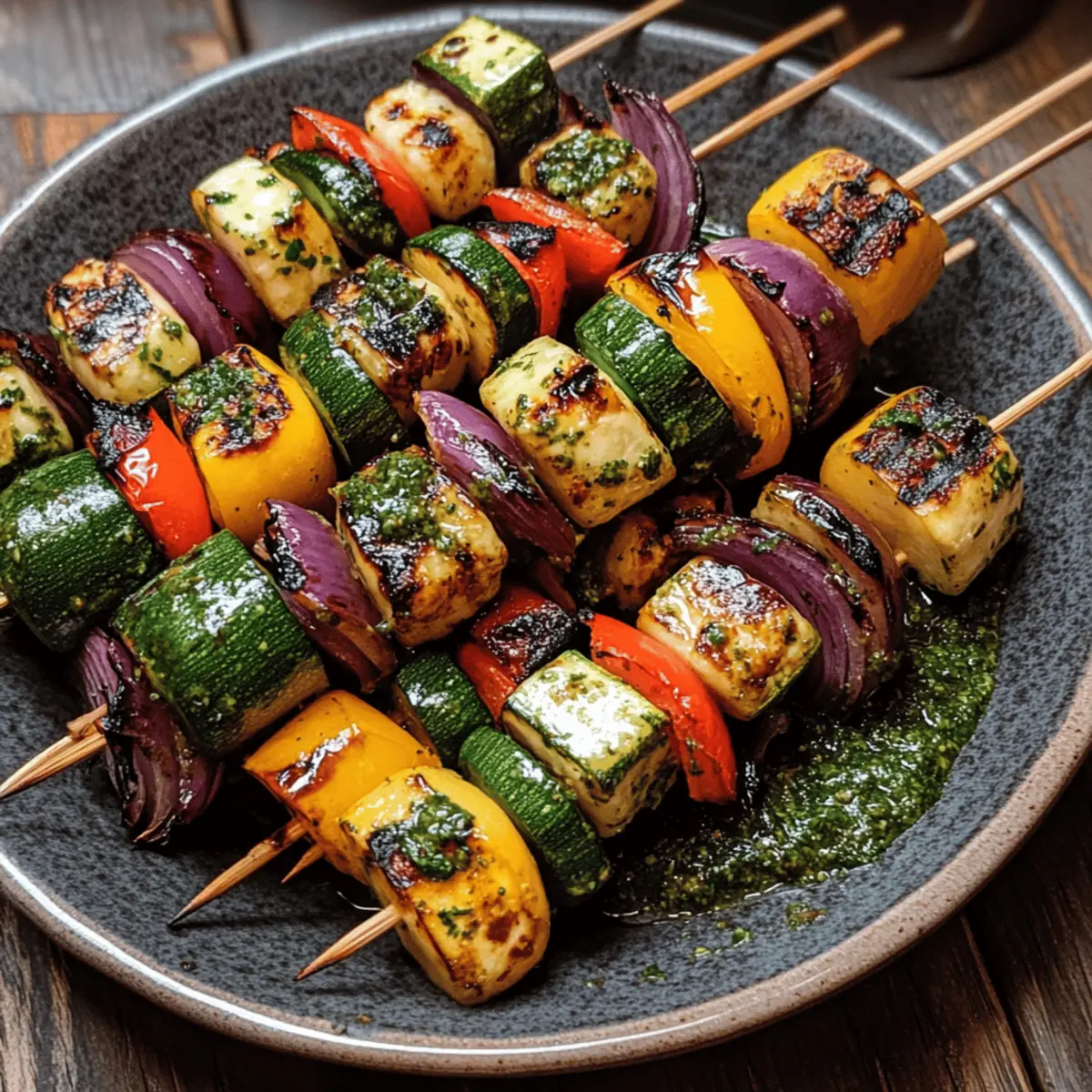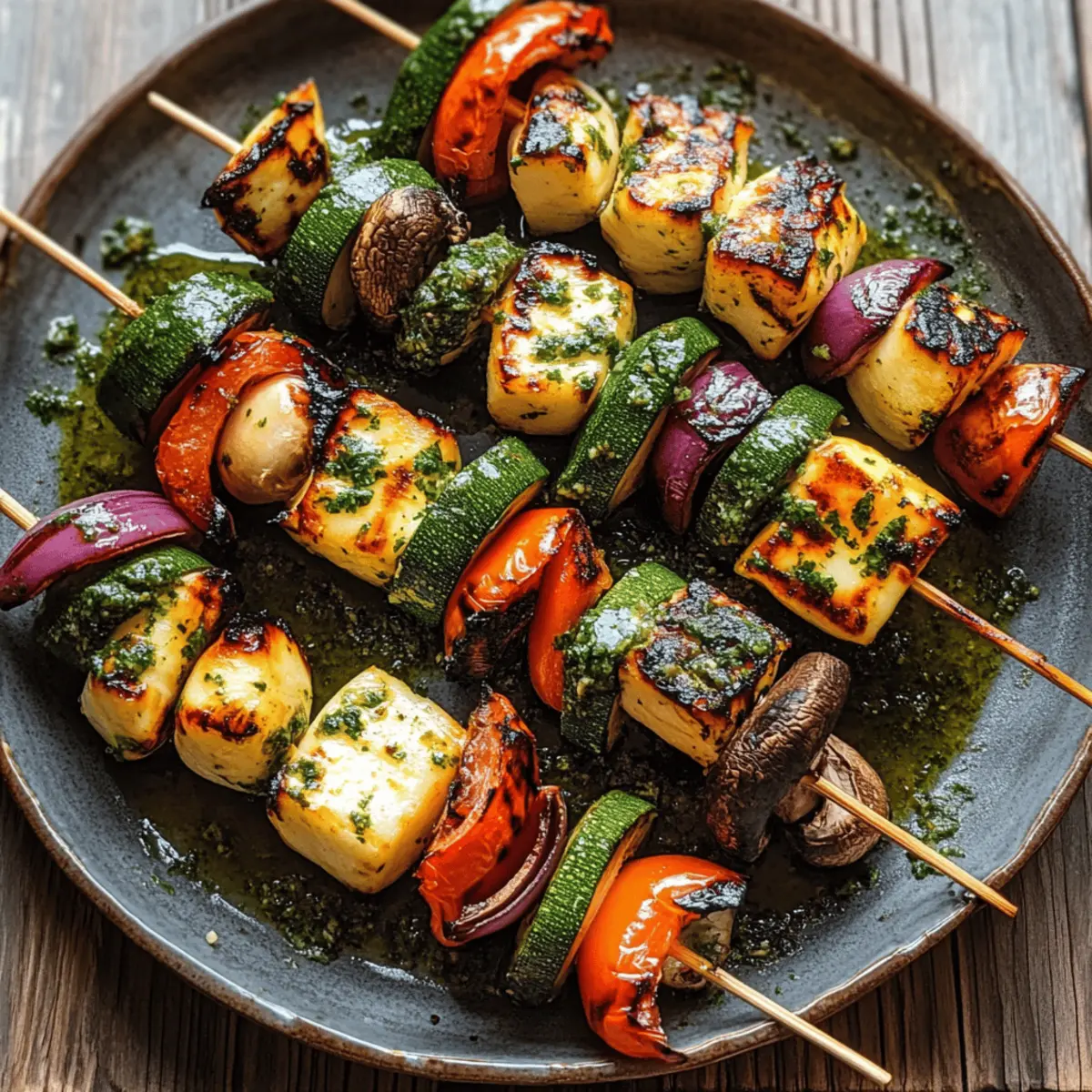 Der Duft von frisch gegrilltem Gemüse und geschmolzenem Halloumi weht durch die Luft und weckt Erinnerungen an unbeschwerte Sommertage. Diese gegrillten Gemüsespieße mit Halloumi & Chimichurri bringen nicht nur Farbe und Freude auf den Tisch, sondern überzeugen auch mit einem schnellen und einfachen Rezept, das perfekt für jede Grillparty ist. Die Vielfalt der bunten Zutaten, darunter knackige Paprika, zarte Zucchini und aromatische Champignons, sorgt für ein Geschmackserlebnis, das selbst eingefleischte Fast-Food-Liebhaber begeistert. Und das Beste daran? Sie sind nicht nur ein echter Hingucker, sondern auch ein gesunder Genuss für alle. Bereit, diese aufregende Kombination auszuprobieren und Ihre nächste Grillnacht aufzupeppen? Warum sollten Sie diese Gemüsespieße lieben? Frische Aromen: Der zesty Chimichurri und die knackigen, gegrillten Gemüse entfalten ein Geschmacksfeuerwerk, das den Sommer auf Ihren Teller bringt. Einfache Zubereitung: Mit nur wenigen Zutaten und Schritt-für-Schritt-Anleitungen sind diese Spieße schnell zubereitet, ideal für spontane Grillabende oder gemütliche Wochenendbrunches. Vielseitiger Genuss: Variieren Sie die Gemüse gemäß der Saison oder ersetzen Sie Halloumi durch Tofu für eine deftige vegane Option. Perfekter Blickfang: Die bunten Spieße sind nicht nur ein Fest für den Gaumen, sondern auch ein wahres Augenschmaus auf jedem Grillbuffet. Holen Sie sich noch mehr Tipps für Ihre Grillparty mit unserem Artikel über leckere Grillrezepte. Gesunde Wahl: Vollgepackt mit Gemüse und dem proteinreichen Halloumi, bieten diese Spieße eine nahrhafte und befriedigende Mahlzeit, die auch schnell zubereitet ist. Zutaten für Gegrillte Gemüsespieße mit Halloumi Diese köstlichen Spieße sind eine wahrhaftige Sommerfreude und bringen nicht nur Farbe auf den Grill, sondern auch eine Vielzahl an Aromen! Für die Spieße Rote Paprika – bringt Süße und leuchtende Farbe; verwenden Sie verschiedene Farben für zusätzliche Vielfalt. Gelbe Paprika – sorgt ebenfalls für eine süße Note; eine tolle Ergänzung zu den roten Paprika. Zucchini – bietet einen milden und leicht süßen Geschmack; in 2-3 cm große Stücke schneiden. Rote Zwiebel – fügt Schärfe hinzu und balanciert die Süße der Paprika. Halloumi Käse (400 g) – verleiht eine salzige, cremige Textur, die beim Grillen köstlich karamellisiert. Braune Champignons (250 g) – bringen einen reichen, umami Geschmack; am besten kurz marinieren für mehr Tiefe. Olivenöl (2 EL) – verhindert das Anhaften und hebt den Geschmack der Gemüse hervor. Salz und Pfeffer – essentielle Gewürze für die perfekte Abschmeckung. Für das Chimichurri Frische Petersilie (1 Bund) – sorgt für Frische; kann alternativ durch Koriander oder Basilikum ersetzt werden. Bio-Zitrone (Saft + Schale) – bringt Frische und Helligkeit; verwenden Sie eine normale Zitrone, wenn Bio nicht verfügbar ist. Knoblauch (2 Zehen) – verstärkt die aromatische Qualität der Chimichurri-Sauce. Rote Chili (optional) – sorgt für zusätzliche Schärfe; nach Gusto anpassen. Olivenöl (6 EL für Chimichurri) – als Basis der Sauce, vereint die Aromen. Weißweinessig (2 EL) – fügt Säure hinzu, um die Reichhaltigkeit des Halloumi auszubalancieren. Diese Zutaten für die gegrillten Gemüsespieße mit Halloumi & Chimichurri sorgen für ein Geschmackserlebnis, das Sie garantiert in den Sommer entführt! Schritt-für-Schritt-Anleitung für Gegrillte Gemüsespieße mit Halloumi & Chimichurri Step 1: Grill vorheizen Heizen Sie den Grill oder eine Grillpfanne auf mittelhohe Hitze vor (ca. 200°C). Warten Sie, bis die Grillroste heiß sind, bevor Sie mit den Vorbereitungen beginnen. Dies sorgt für schöne Grillstreifen und eine gleichmäßige Garung der gegrillten Gemüsespieße mit Halloumi & Chimichurri. Step 2: Gemüse vorbereiten Schneiden Sie die roten und gelben Paprika, die Zucchini sowie die rote Zwiebel und die Champignons in gleichmäßige Stücke von etwa 2-3 cm. Achten Sie darauf, die Stücke nicht zu klein zu schneiden, damit sie beim Grillen nicht durchfallen. Diese bunten Gemüsestücke sind die Grundlage Ihrer köstlichen Spieße. Step 3: Holzspieße einweichen Wenn Sie Holzspieße verwenden, legen Sie diese für mindestens 20 Minuten in Wasser. Dies verhindert, dass die Spieße auf dem Grill verbrennen. Währenddessen können Sie sich um das Anrichten der Grillware kümmern und sich auf die nächsten Schritte vorbereiten. Step 4: Spieße zusammenstellen Beginnen Sie mit dem Zusammenstellen Ihrer gegrillten Gemüsespieße. Wechseln Sie Gemüse und Halloumi ab und schichten Sie die Zutaten gleichmäßig auf die einweichten Spieße. Achten Sie darauf, genügend Abstand zwischen den Stücken zu lassen, damit die Hitze zirkulieren kann und die Spieße gleichmäßig garen. Step 5: Würzen der Spieße Bürsten Sie die zusammengestellten Spieße leicht mit Olivenöl und würzen Sie sie großzügig mit Salz und Pfeffer. Das Olivenöl hilft, das Anhaften an den Grillrosten zu verhindern und hebt zudem den Geschmack der gegrillten Gemüsespieße mit Halloumi und Chimichurri hervor. Step 6: Spieße grillen Legen Sie die Spieße auf den vorgeheizten Grill und grillen Sie sie für etwa 10-15 Minuten. Wenden Sie die Spieße regelmäßig, damit sie von allen Seiten leicht angebräunt und zart sind. Achten Sie darauf, dass der Halloumi eine goldene Kruste bekommt und das Gemüse weich und aromatisch ist. Step 7: Chimichurri zubereiten Während die Spieße grillen, bereiten Sie das Chimichurri zu. Geben Sie die frische Petersilie, den Zitronensaft, den Knoblauch und die Chili in einen Mixer. Fügen Sie das Olivenöl und den Weißweinessig hinzu und pürieren Sie alles, bis die Sauce gut vermischt und leicht gröber ist. Step 8: Servieren und genießen Sobald die gegrillten Gemüsespieße mit Halloumi perfekt gar sind, nehmen Sie diese vom Grill und servieren Sie sie heiß. Überziehen Sie die Spieße großzügig mit dem fri