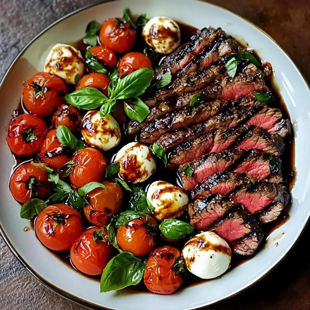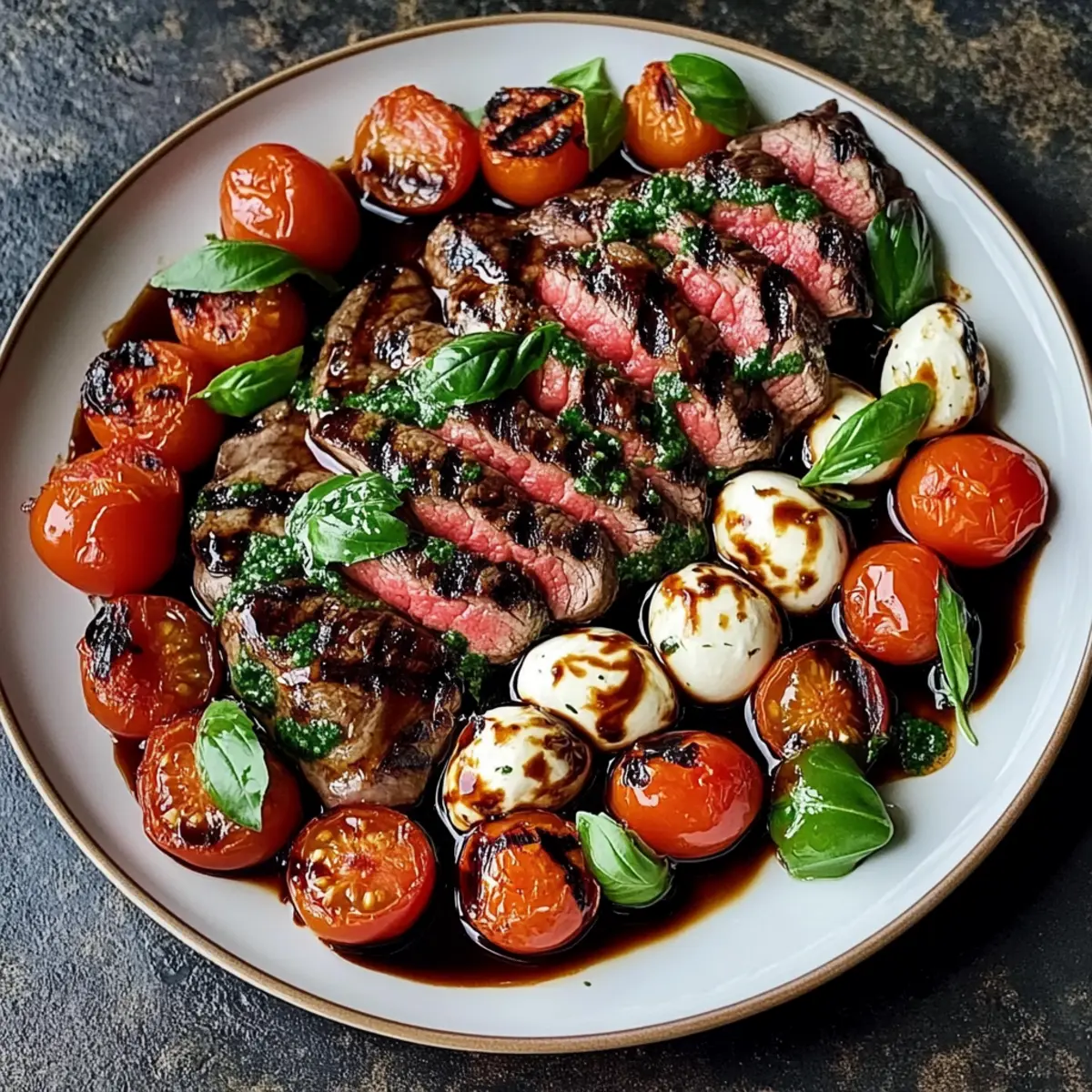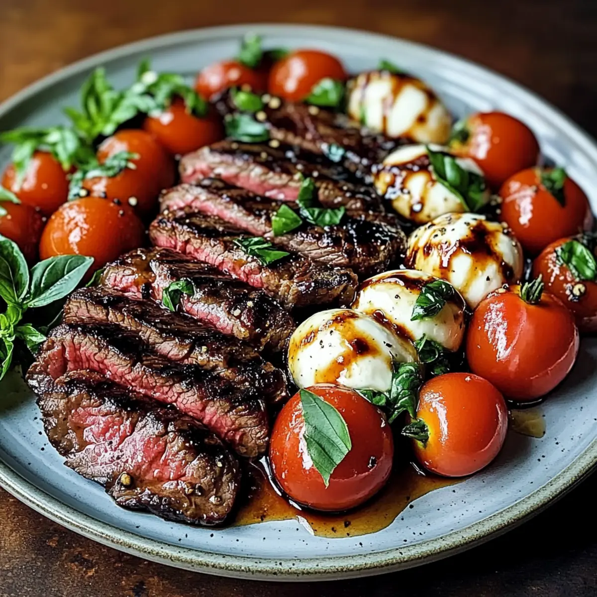 Die Sonne steht hoch am Himmel, während ich die Grillzange in der Hand halte und das köstliche Aroma von gegrilltem Flankensteak um mich herumwaft. Das Rezept für Gegrilltes Flankensteak Caprese mit Balsamico-Dressing vereint saftiges, zartes Fleisch und frische Aromen, die an einen lauen Sommertag erinnern. Ideal für ein schnelles Abendessen oder gesellige Zusammenkünfte, dieses Gericht punktet nicht nur durch seine einfache Zubereitung, sondern auch durch seine gesunde, kohlenhydratarme und proteinreiche Zusammensetzung. Die Mischung aus herzhaftem Steak, süßen Kirschtomaten, cremigem Mozzarella und duftendem Basilikum wird mit einer verführerisch süßen Balsamico-Reduktion gekrönt. Bist du bereit, das Grillfest zu beginnen? Lass uns gemeinsam in die Zubereitung eintauchen! Warum wirst du dieses Rezept lieben? Einfachheit: Die Zubereitung ist kinderleicht und erfordert nur grundlegende Kochfähigkeiten. Ideal für wenig Zeit, aber große Geschmäcker! Frische Aromen: Die Kombination aus zartem Flankensteak, süßen Kirschtomaten und cremigem Mozzarella bringt sommerliche Frische auf den Tisch. Vielseitigkeit: Du kannst das Flankensteak ganz nach deinem Geschmack ersetzen, zum Beispiel durch Skirt- oder Flanksteak – perfekt für jeden Gaumen! Gesundheit: Dieses Rezept ist niedrig an Kohlenhydraten und reich an Proteinen, perfekt für bewusstere Esser. Begeisterung: Es ist ein echter Hingucker und wird deine Gäste beeindrucken – so wird jede Barbecue-Party ein Hit! Probier dazu auch unsere Baguettscheiben mit Tomaten für ein perfektes Menü! Gegrilltes Flankensteak Zutaten • Entdecke die köstlichen Zutaten für dein Gegrilltes Flankensteak Caprese mit Balsamico-Dressing! Für das Steak Flankensteak – Achte auf ein dickes, tiefrotes Stück für den besten Geschmack. Alternativen: Skirt-Steak oder Flanksteak können verwendet werden. Olivenöl – Macht das Steak saftiger und ist essentiell für die Marinade. Knoblauch (gehackt) – Verleiht der Marinade einen herrlichen Geschmack. Salz – Hebt die natürlichen Aromen des Gerichts hervor. Schwarzer Pfeffer – Fügt der Marinade und dem Gericht eine milde Schärfe hinzu. Für den Salat Kirschtomaten – Bringen Süße und Säure ins Spiel; unentbehrlich für das Caprese-Element. Frische Mozzarella-Bällchen – Sorgt für eine cremige Textur; kann auch durch Scheiben von einem großen Mozzarella ersetzt werden. Frisches Basilikum (gehackt) – Bringt eine herzhafte Frische ein; entscheidend für die Geschmacksbalance. Für die Balsamico-Reduktion Balsamico-Glasur – Vereint das Gericht mit seiner reichen, säuerlich-süßen Note; kann durch Reduktion von Balsamico-Essig mit Honig selbst hergestellt werden. Schritt-für-Schritt-Anleitung für Gegrilltes Flankensteak Caprese mit Balsamico-Dressing Step 1: Marinade vorbereiten In einer flachen Schüssel oder einem Zip-Beutel mischst du Olivenöl, gehackten Knoblauch, Salz und schwarzen Pfeffer. Lege das Flankensteak hinein und achte darauf, dass es gut mit der Marinade überzogen ist. Decke die Schüssel ab oder verschließe den Beutel und lasse das Steak mindestens 1 Stunde, idealerweise bis zu 8 Stunden, im Kühlschrank marinieren, um die Aromen zu intensivieren. Step 2: Grill vorheizen Heize den Grill auf mittelhohe Temperatur (ca. 200-230°C) vor. Währenddessen nimm das marinierte Flankensteak aus dem Kühlschrank und lasse es auf Zimmertemperatur kommen. Dies fördert ein gleichmäßiges Garen. Wenn der Grill bereit ist, lege das Steak auf den Rost und schließe den Deckel. Step 3: Steak grillen Grille das Flankensteak für etwa 4-5 Minuten pro Seite, abhängig von der gewünschten Garstufe. Achte darauf, dass das Steak eine schöne Grillmarkierung erhält und sich leicht vom Grillrost löst. Für Medium-Rare sollte die Innentemperatur des Steaks zwischen 54-57°C liegen. Verwende ein Fleischthermometer, um die perfekte Garstufe zu überprüfen. Step 4: Steak ruhen lassen Nachdem das Steak gegrillt ist, nimm es vom Grill und lasse es 5-10 Minuten ruhen. Dies ermöglicht es den Fleischsäften, sich zu setzen, wodurch das Steak zarter und saftiger wird. Während du wartest, kannst du die Caprese-Salat-Zutaten vorbereiten. Step 5: Caprese-Salat zubereiten In einer Schüssel vermischst du die halbierten Kirschtomaten, die frischen Mozzarella-Bällchen und das gehackte Basilikum. Träufle etwas Olivenöl darüber und füge eine Prise Salz hinzu. Mische alles vorsichtig, damit die Aromen sich verbinden, ohne die Mozzarella-Bällchen zu zerdrücken. Step 6: Steak schneiden und anrichten Schneide das ruhende Flankensteak dünn gegen die Faser, um eine maximale Zartheit zu gewährleisten. Arrangiere die Scheiben auf einem großen Servierteller und gebe den Caprese-Salat großzügig dazu. Träufle die Balsamico-Glasur über das Steak und den Salat, um den Gegrilltes Flankensteak Caprese mit Balsamico-Dressing den letzten Schliff zu verleihen. Step 7: Servieren Serviere das Gericht warm und genieße es in guter Gesellschaft. Dieses Gegrillte Flankensteak Caprese mit Balsamico-Dressing ist perfekt für sommerliche Grillabende und wird jeden Gaumen erfreuen. Vorbereiten für dein Gegrilltes Flankensteak Caprese mit Balsamico-Dressing Du kannst die Zubereitung des Gegrillten Flankensteaks Caprese mit Balsamico-Dressing deutlich erleichtern, indem du das Steak bis zu 24 Stunden im Voraus marinierst. Die Marinade aus Olivenöl, Knoblauch, Salz und Pfeffer intensiviert die Aromen, während das Steak im Kühlschrank ruht. Ebenso lassen sich die Caprese-Zutaten (Kirschtomaten, Mozzarella und Basilikum) bereits bis zu 3 Tage vor dem Servieren vorbereiten, jedoch solltest du sie erst kurz vor dem Servieren vermischen, um die Frische und Textur zu bewahren. Achte darauf, das marinierte Steak rechtzeitig (z.B. 30 Minuten vor dem Grillen) aus dem Kühlschrank zu nehmen, um es auf Zimmertemperatur kommen zu lassen. Nach dem Grillen lässt du das Steak einige Minuten ruhen, bevor du es dü