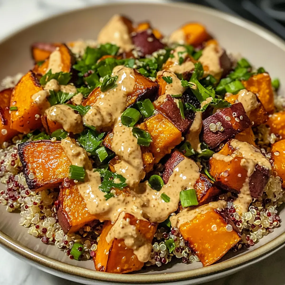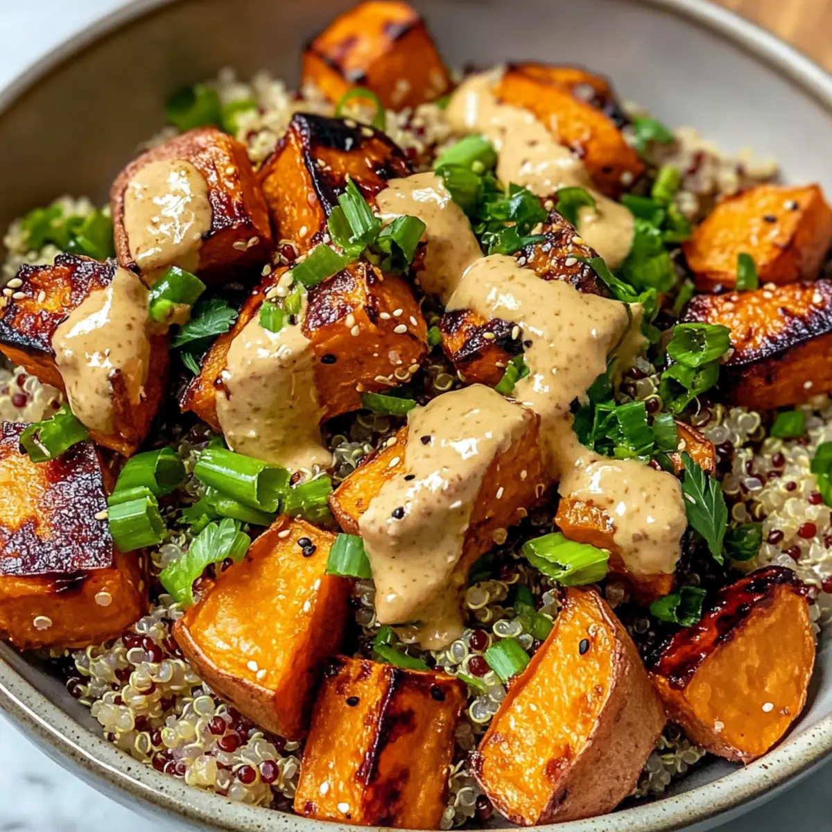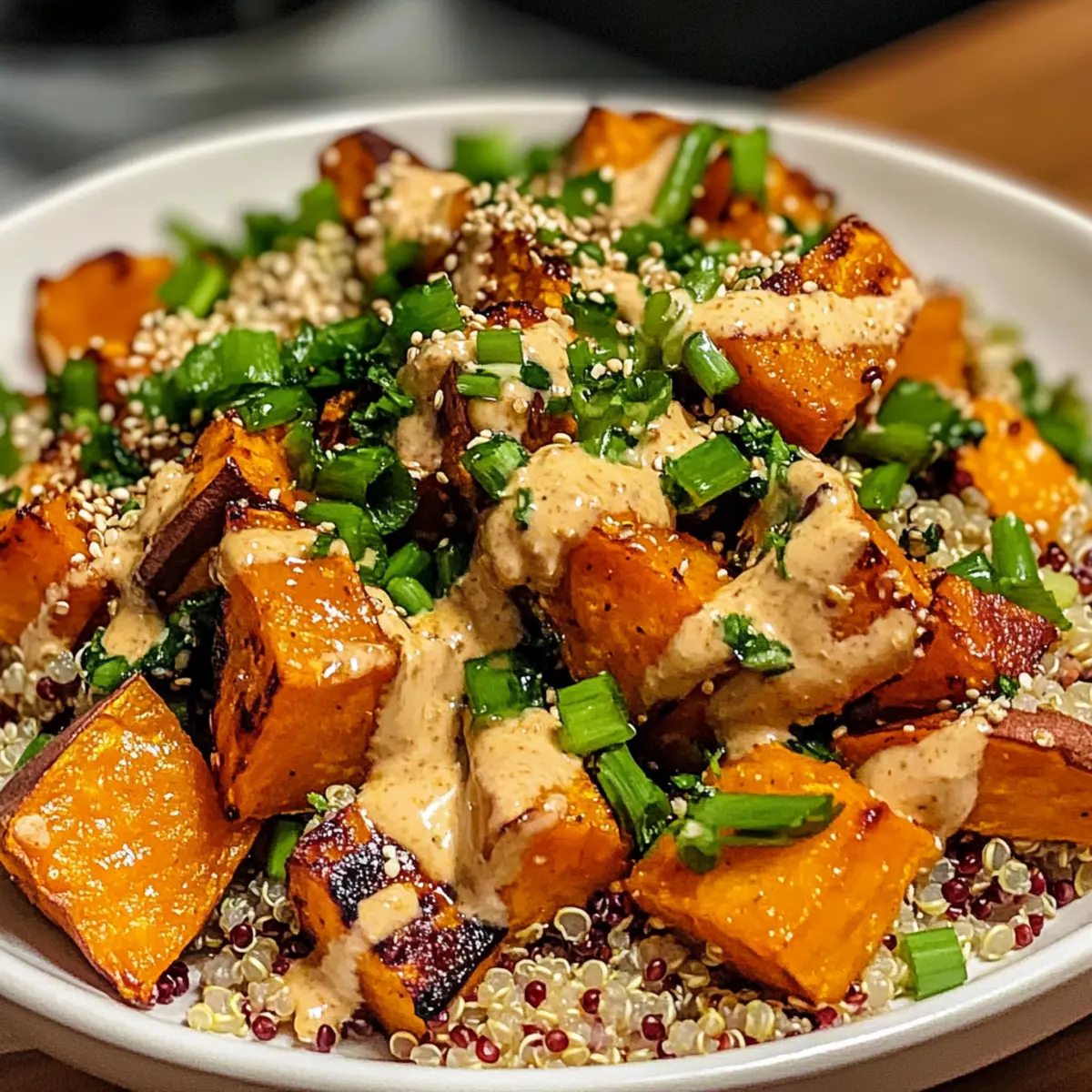 Als ich letztens in der Küche stand, hüllte mich der süße Duft von gerösteten Süßkartoffeln ein und ich wusste, dass ein besonderes Gericht auf mich wartete. Mein Gerösteter Süßkartoffel-Quinoa-Salat mit Sesam-Miso-Sauce ist nicht nur eine Augenweide, sondern auch eine wahre Geschmacksexplosion! Dieses nahrhafte vegane Rezept vereint die zarte Süße der gerösteten Süßkartoffeln mit der knackigen Textur der Quinoa, und die aromatische Miso-Sauce verleiht dem Ganzen das gewisse Etwas. Die Zubereitung ist schnell und einfach, perfekt für eine gesunde Mahlzeit unter der Woche oder als Beilage zu festlichen Anlässen. Und das Beste daran? Er lässt sich hervorragend aufbewahren und bleibt auch am nächsten Tag köstlich! Bist du bereit, dein nächstes Lieblingsgericht zu entdecken? Warum wirst du dieses Rezept lieben? Einfachheit: Die Zubereitung ist ein Kinderspiel – nur wenige Schritte und grundlegende Kochkenntnisse erforderlich. Vielseitigkeit: Personalisiere dein Gericht mit verschiedenen Kräutern oder Gemüse, wie Paprika oder Spinat, um deinen eigenen Twist hinzuzufügen. Nährstoffreich: Vollgepackt mit Ballaststoffen und pflanzlichem Protein ist dieser Salat nicht nur lecker, sondern auch gesund. Du wirst dich gut fühlen, wenn du ihn genießt! Köstlicher Geschmack: Die süßen, gerösteten Süßkartoffeln harmonieren perfekt mit der nussigen Quinoa und der aromatischen Miso-Sauce. Jeder Bissen ist ein Fest der Aromen! Vorratsfreundlich: Ideal für Meal Prep – der Salat bleibt bis zu 3 Tage frisch im Kühlschrank. Perfekt für geschäftige Tage oder als köstliche Beilage für deine nächste Grillparty. Wer könnte dazu Nein sagen? Entdecke auch meine Tipps zur Aufbewahrung für eine lang anhaltende Frische. Gerösteter Süßkartoffel-Quinoa-Salat Zutaten Für den Salat Süßkartoffeln – Die Basis des Salats, liefert Ballaststoffe und eine süße Note, wenn sie geröstet sind. Quinoa – Reich an pflanzlichem Protein und sorgt für eine angenehme Textur im Gericht. Olivenöl – Für eine geschmackvolle Aromatisierung der Süßkartoffeln beim Rösten. Salz und Pfeffer – Für die essenzielle Geschmacksverstärkung. Frühlingszwiebeln – Fügen frische Knusprigkeit hinzu und harmonieren wunderbar mit den anderen Zutaten. Koriander oder Petersilie – Frische Kräuter für zusätzliche Aromen (optional). Sesamsamen – Fügen eine knusprige Komponente hinzu (optional). Für das Sesam-Miso-Dressing Miso-Paste – Der Hauptbestandteil der Sauce, bringt salzige und umami Aromen ins Spiel. Tahini – Für eine cremige Konsistenz und eine nussige Note als luzide Joghurt-Alternative. Reisessig oder Apfelessig – Sorgt für die nötige Säure in der Sauce. Sojasauce – Fügt Tiefe hinzu und kann glutenfrei gewählt werden. Ahornsirup oder Agavendicksaft – Süßungsmittel für eine ausgewogene Geschmacksrichtung. Sesamöl – Verstärkt den nussigen Geschmack des Dressings. Warmes Wasser – Zum Anpassen der Konsistenz des Dressings, damit es perfekt auf dem Salat haftet. Dieser Geröstete Süßkartoffel-Quinoa-Salat mit Sesam-Miso-Dressing ist nicht nur einfach zuzubereiten, sondern auch wahnsinnig lecker und gesund! Schritt-für-Schritt-Anleitung für Gerösteter Süßkartoffel-Quinoa-Salat mit Sesam-Miso-Sauce Step 1: Süßkartoffeln rösten Heize den Ofen auf 200°C vor und lege ein Backblech mit Backpapier aus. Schäle die Süßkartoffeln und schneide sie in gleichmäßige Würfel. Vermische die Süßkartoffelwürfel in einer Schüssel mit Olivenöl, Salz und Pfeffer. Verteile die Würfel gleichmäßig auf dem Backblech und röste sie 25-30 Minuten, bis sie goldbraun und weich sind. Step 2: Quinoa kochen Spüle die Quinoa gründlich unter kaltem Wasser ab, um Bitterstoffe zu entfernen. Bringe in einem Topf 2 Tassen Wasser oder Gemüsebrühe zum Kochen. Füge die Quinoa hinzu, decke den Topf ab und lasse sie 15 Minuten köcheln. Schalte die Hitze aus und lasse die Quinoa 5 Minuten ruhen, damit sie quellen kann. Step 3: Sesam-Miso-Sauce mischen In einer Schüssel vermengst du Miso-Paste, Tahini, Reisessig, Sojasauce, Ahornsirup und Sesamöl. Rühre die Zutaten gut um und füge nach Bedarf warmes Wasser hinzu, um eine cremige Konsistenz zu erreichen. Die Sauce sollte gut vermischt und leicht flüssig sein, sodass sie gleichmäßig über den Salat verteilt werden kann. Step 4: Salat anrichten In einer großen Schüssel vermenge die gekochte Quinoa und die gerösteten Süßkartoffeln. Hacke Frühlingszwiebeln und optional Koriander oder Petersilie grob und gib sie zur Mischung. Gieße die Sesam-Miso-Sauce über den Salat und hebe alles vorsichtig unter, bis die Zutaten gut kombiniert sind. Step 5: Servieren Serviere den Gerösteten Süßkartoffel-Quinoa-Salat warm oder bei Raumtemperatur auf einer schönen Servierplatte. Optional kannst du den Salat mit gerösteten Sesamsamen bestreuen, um zusätzliche Knusprigkeit zu verleihen. Dieser nahrhafte Salat ist perfekt für jede Gelegenheit! Meal Prep für Gerösteten Süßkartoffel-Quinoa-Salat mit Sesam-Miso-Sauce Bereite deinen Gerösteten Süßkartoffel-Quinoa-Salat mit Sesam-Miso-Sauce stressfrei vor! Du kannst die gerösteten Süßkartoffeln bis zu 3 Tage im Voraus zubereiten und in einem luftdichten Behälter im Kühlschrank aufbewahren, um die Frische zu bewahren. Auch die Quinoa lässt sich ideal am Vortag kochen und bleibt in einem geschlossenen Behälter bis zu 3 Tage haltbar. Die Sauce solltest du separat aufbewahren, da sie in Kombination mit dem Salat schnell ihre Konsistenz verändern kann; sie bleibt jedoch frisch für bis zu 1 Woche im Kühlschrank. Wenn du bereit bist zu servieren, vermische einfach die vorbereiteten Zutaten mit der Sauce und genieße eine köstliche, zeitsparende Mahlzeit, die auch nach mehreren Tagen noch genauso lecker ist! Expert Tips für Gerösteten Süßkartoffel-Quinoa-Salat Gleichmäßiges Rösten: Stelle sicher, dass du die Süßkartoffelwürfel gleichmäßig schneidest, damit