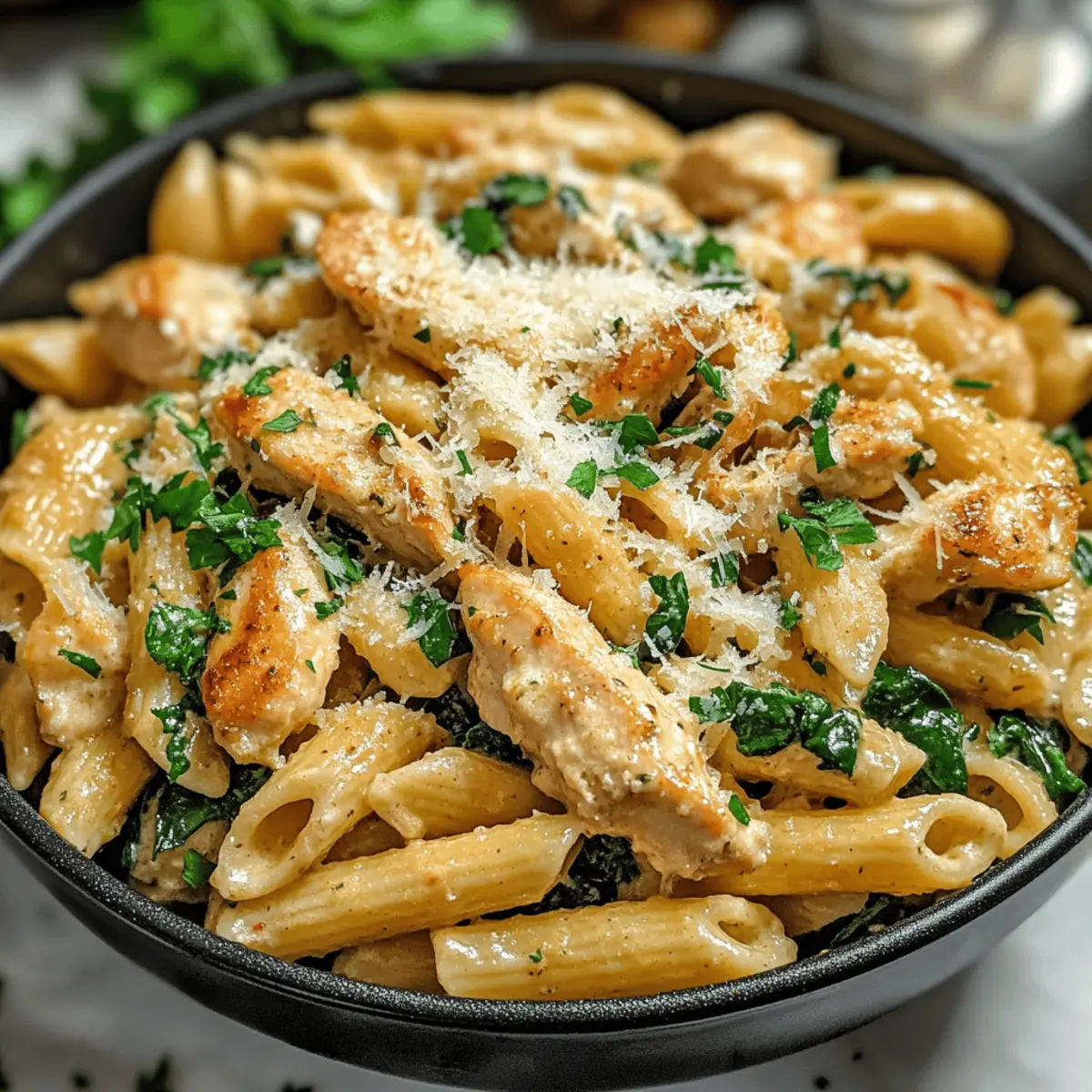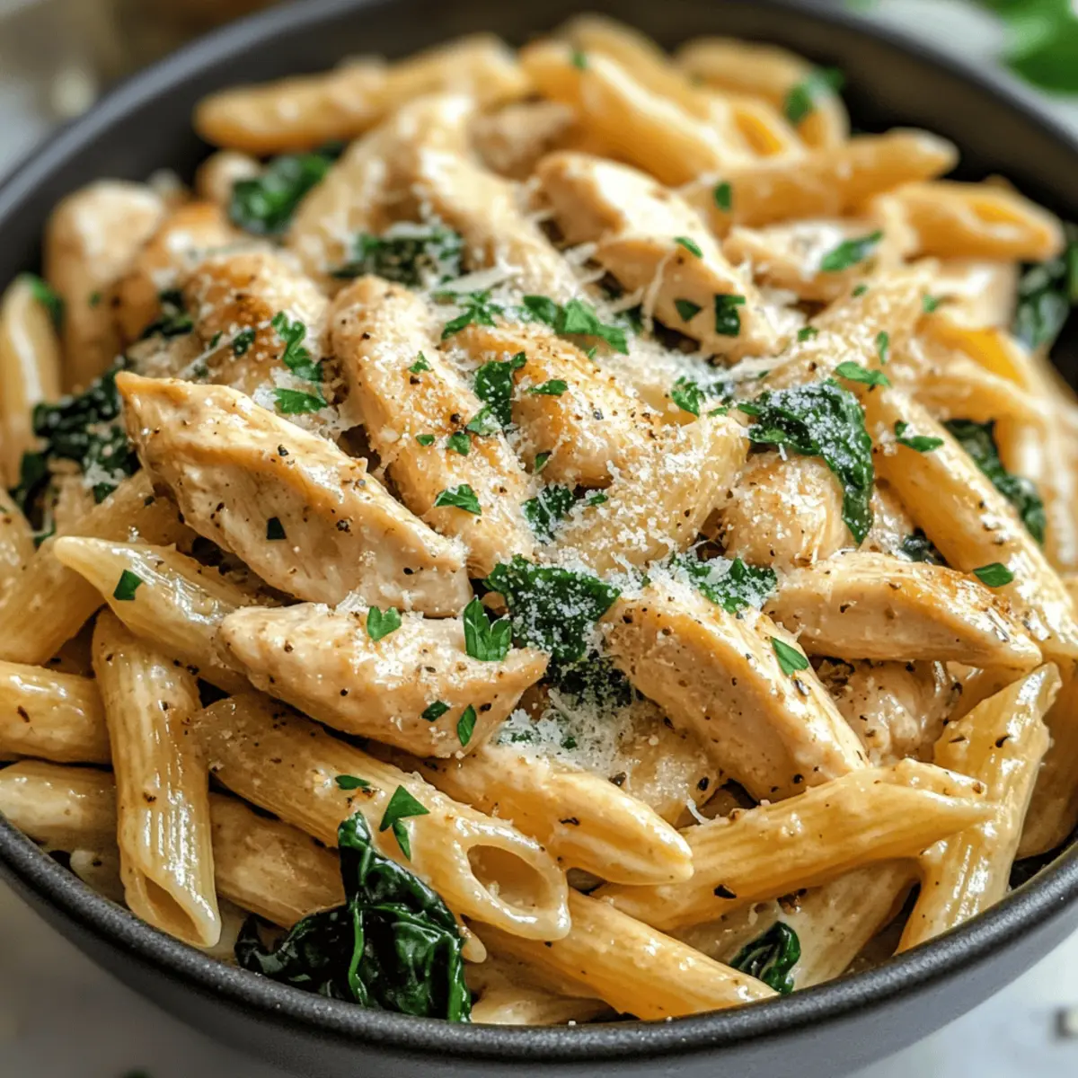 Als ich das erste Mal die Gesunde Knoblauch Parmesan Hühnchen Pasta zubereitete, überwältigte mich der verführerische Duft von geröstetem Knoblauch, der durch meine Küche zog. Diese einfache, aber köstliche Rezeptur verbindet die Leichtigkeit eines gesunden Abendessens mit dem herzhaften Komfort, den wir alle lieben. Mit hochwertigem Protein und frischen Zutaten bietet sie eine wohltuende Alternative zu schwereren Pastagerichten, ohne dabei auf Geschmack zu verzichten. Ideal nach einem Workout oder einfach für einen entspannten Abend, verspricht diese Pasta ein nahrhaftes, aber dennoch sündhaft leckeres Erlebnis. Wer könnte da widerstehen? Neugierig geworden, wie einfach es ist, diese köstliche Kombination zuzubereiten? Warum wirst du dieses Rezept lieben? Einfachheit: Die Zubereitung dieser Gesunden Knoblauch Parmesan Hühnchen Pasta ist kinderleicht und benötigt nur grundlegende Kochfähigkeiten. Vielseitigkeit: Du kannst die Rezepte leicht anpassen, indem du verschiedene Proteine oder Gemüsesorten verwendest, zum Beispiel Shrimps oder Brokkoli, je nach deinem Geschmack. Herzhafter Geschmack: Der köstliche Mix aus geröstetem Knoblauch, Parmesan und frischem Spinach sorgt für ein unvergleichlich intensives Geschmackserlebnis. Nährstoffreich: Mit hochwertigem Protein und komplexen Kohlenhydraten ist dieses Gericht ideal für Fitness-Enthusiasten und gesundheitsbewusste Genießer. Zeitsparend: In nur wenigen Schritten hast du ein vollwertiges Abendessen auf dem Tisch, perfekt für hektische Wochentage. Wenn du noch mehr leckere, gesunde Pasta-Ideen suchst, schau dir auch unsere Rezepte für leichte mediterrane Pasta an! Gesunde Knoblauch Parmesan Hühnchen Pasta Zutaten Für die Pasta Vollkornnudeln – bieten komplexe Kohlenhydrate für anhaltende Energie; glutenfreie Nudeln sind eine tolle Alternative. Hähnchenbrust – ist die Hauptproteinquelle, die Geschmack und Saftigkeit verleiht; für einen schlankeren Genuss kann Putenfleisch verwendet werden. Olivenöl – gibt gesunde Fette für das Kochen; kann durch Avocadoöl ersetzt werden, wenn gewünscht. Knoblauch – fügt Tiefe und intensiven Geschmack hinzu; frischer Knoblauch ist am besten für den vollen Geschmack. Für die Sauce Vollkornmehl – dient als Verdickungsmittel für die Sauce; kann durch Maisstärke für eine glutenfreie Variation ersetzt werden. Hühnerbrühe – sorgt für eine geschmackvolle und feuchte Sauce; kalorienreduzierte Varianten sind empfehlenswert. Fettarme Milch – sorgt für cremige Konsistenz ohne zu viele Kalorien; kann bei Bedarf durch Mandelmilch ersetzt werden. Griechischer Joghurt – fügt Cremigkeit und Protein hinzu; für eine vegane Variante kann ein pflanzlicher Joghurt verwendet werden. Parmesan-Käse – bringt einen herzhaften Geschmack und Reichhaltigkeit; frischer Parmesan ist ideal für besseren Geschmack und Textur – kann für eine milchfreie Option weggelassen werden. Für das Gemüse Spinat (optional) – bringt Nährstoffe und Farbe ins Gericht; kann durch Grünkohl oder andere Blattgemüse ersetzt werden. Für die Gewürze Salz, Pfeffer, Paprika, italienische Gewürzmischung – diese Gewürze heben den Geschmack hervor; nach persönlichem Geschmack anpassen. Mit dieser Gesunden Knoblauch Parmesan Hühnchen Pasta bist du nur wenige Schritte von einem nahrhaften und köstlichen Abendessen entfernt! Schritt-für-Schritt-Anleitung für Gesunde Knoblauch Parmesan Hühnchen Pasta Step 1: Wasser zum Kochen bringen Bring in einem großen Topf ausreichend gesalzenes Wasser zum Kochen. Füge die Vollkornnudeln hinzu und koche sie für etwa 8–10 Minuten, bis sie al dente sind. Achte darauf, eine Tasse des Kochwassers aufzuheben, bevor du die Pasta abgießt; dies hilft dir später beim Verfeinern der Sauce. Step 2: Hähnchen braten Erhitze 1 Esslöffel Olivenöl in einer beschichteten Pfanne bei mittlerer Hitze. Füge die gewürfelte Hähnchenbrust hinzu, würze sie nach Geschmack mit Salz und Pfeffer, und brate sie für 5–6 Minuten, bis sie goldbraun und durchgegart ist. Nimm das Hähnchen aus der Pfanne und stelle es beiseite. Step 3: Knoblauch anbraten In der gleichen Pfanne gibst du das restliche Olivenöl dazu und fügst den gehackten Knoblauch hinzu. Brate den Knoblauch für 30–60 Sekunden an, bis er duftet, aber achte darauf, dass er nicht anbrennt, da angebrannter Knoblauch bitter wird. Step 4: Roux zubereiten Streue das Vollkornmehl in die Pfanne und koche es für etwa 30 Sekunden, um einen Roux herzustellen. Rühre dabei kontinuierlich um, damit sich keine Klumpen bilden. Füge dann nach und nach die Hühnerbrühe und die fettarme Milch hinzu, während du kräftig rührst, bis die Sauce beginnt, in 2–3 Minuten zu verdicken. Step 5: Sauce verfeinern Reduziere die Hitze und rühre den griechischen Joghurt unter die Sauce, bis sie schön cremig ist. Füge den frisch geriebenen Parmesan-Käse hinzu und rühre weiter, bis er vollständig geschmolzen ist. Sollte die Sauce zu dick sein, kannst du sie mit dem aufbewahrten Pasta-Wasser strecken. Step 6: Pasta und Hähnchen hinzufügen Gib das gebratene Hähnchen zurück in die Pfanne und füge die gekochten Nudeln sowie den Spinat hinzu. Mische alles gut, bis die Pasta gleichmäßig mit der cremigen Sauce und dem zarten Hähnchen umhüllt ist. Achte darauf, dass der Spinat leicht zusammenfällt und die Farbe lebendig bleibt. Step 7: Servieren Serviere die Gesunde Knoblauch Parmesan Hühnchen Pasta sofort auf einem schönen Teller. Garniere das Gericht nach Belieben mit frischer Petersilie und zusätzlichem Parmesan-Käse. Genieße das Gericht warm und lass den köstlichen Geschmack auf der Zunge zergehen. Expertentipps für Gesunde Knoblauch Parmesan Hühnchen Pasta Temperatur beachten: Gekühlten griechischen Joghurt langsam in die Sauce einrühren, um ein Gerinnen zu vermeiden. Hähnchen würzen: Stelle sicher, dass du das Hähnchen großzügig würzt, um den Geschmack der gesamten Gesunden Knoblauch Parmesan H
