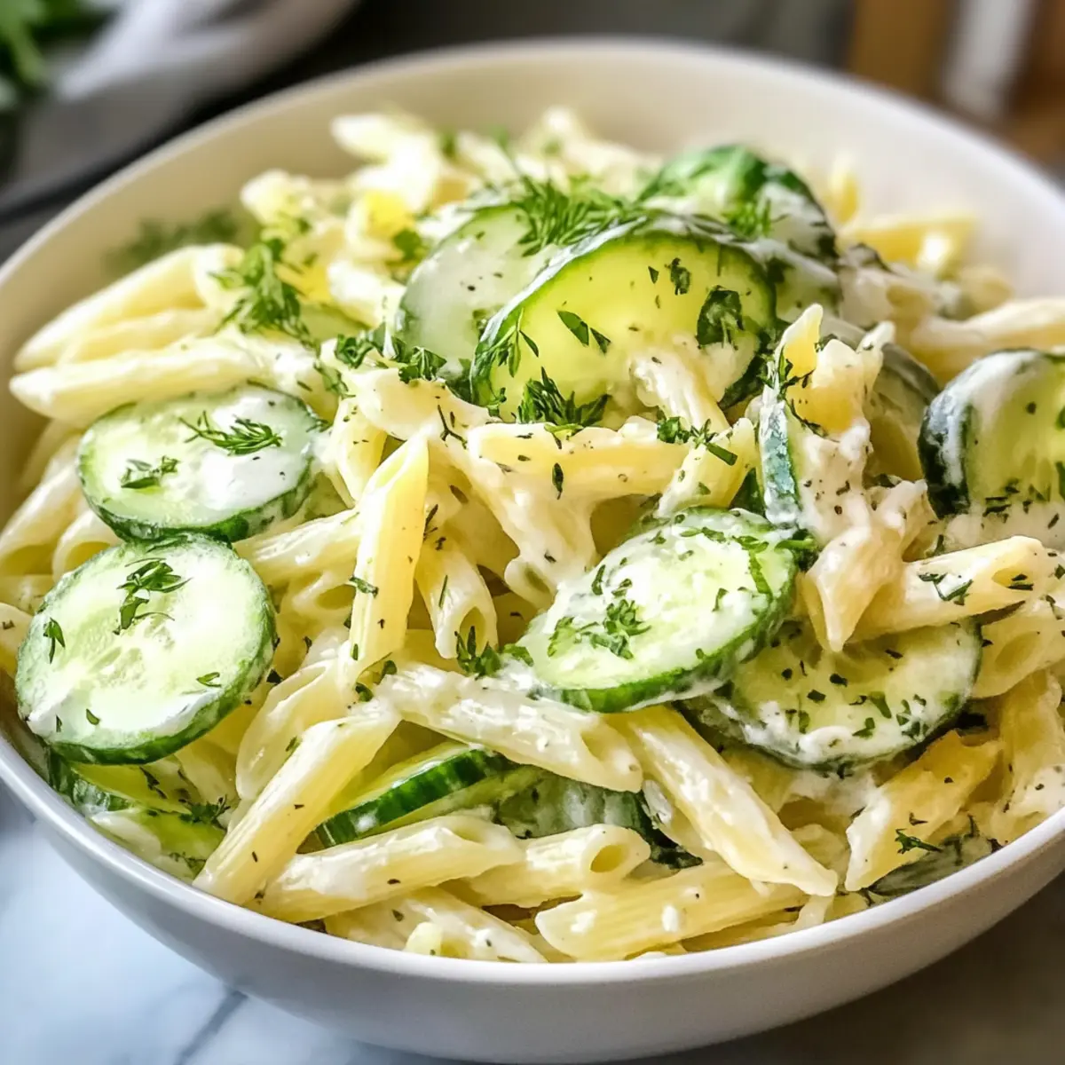 Genießen Sie einen erfrischenden Gesunden Gurken-Pasta-Salat, ideal für heiße Sommertage.