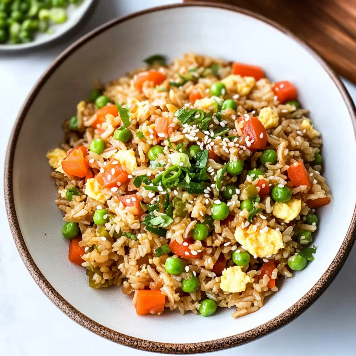 Serviere den gesunden vegetarischen gebratenen Reis heiß, garniert mit frisch geschnittenen grünen Zwiebeln und einem Sprinkler Sesamsamen für zusätzlichen Geschmack. Dies sorgt für einen schönen Kontrast und bereichert das Gericht visuell.