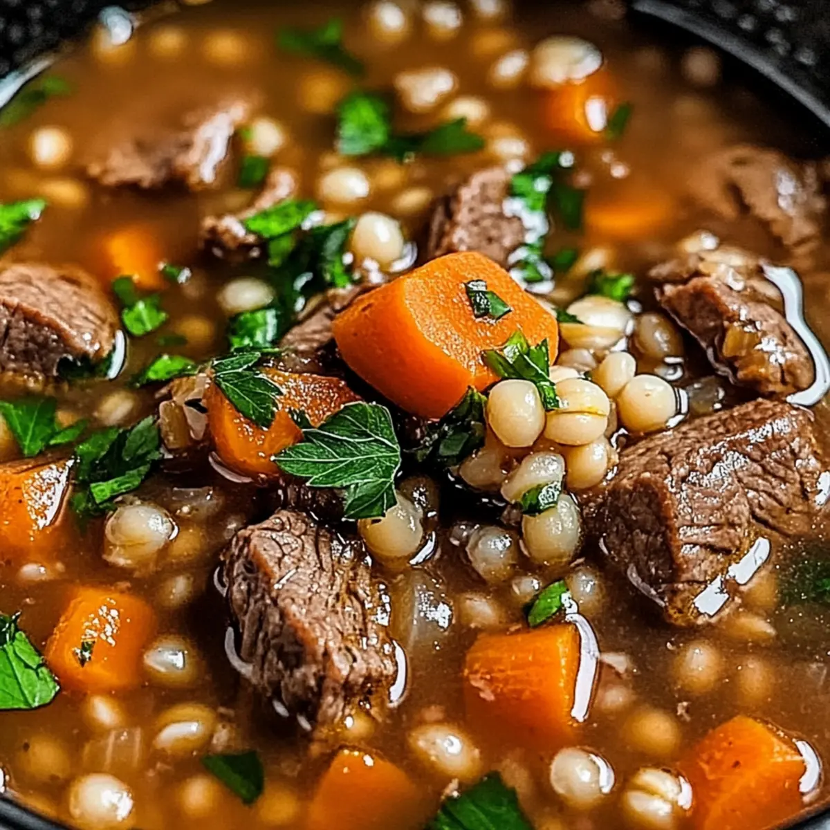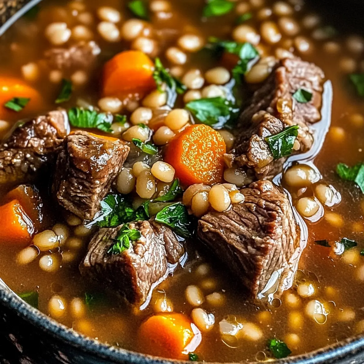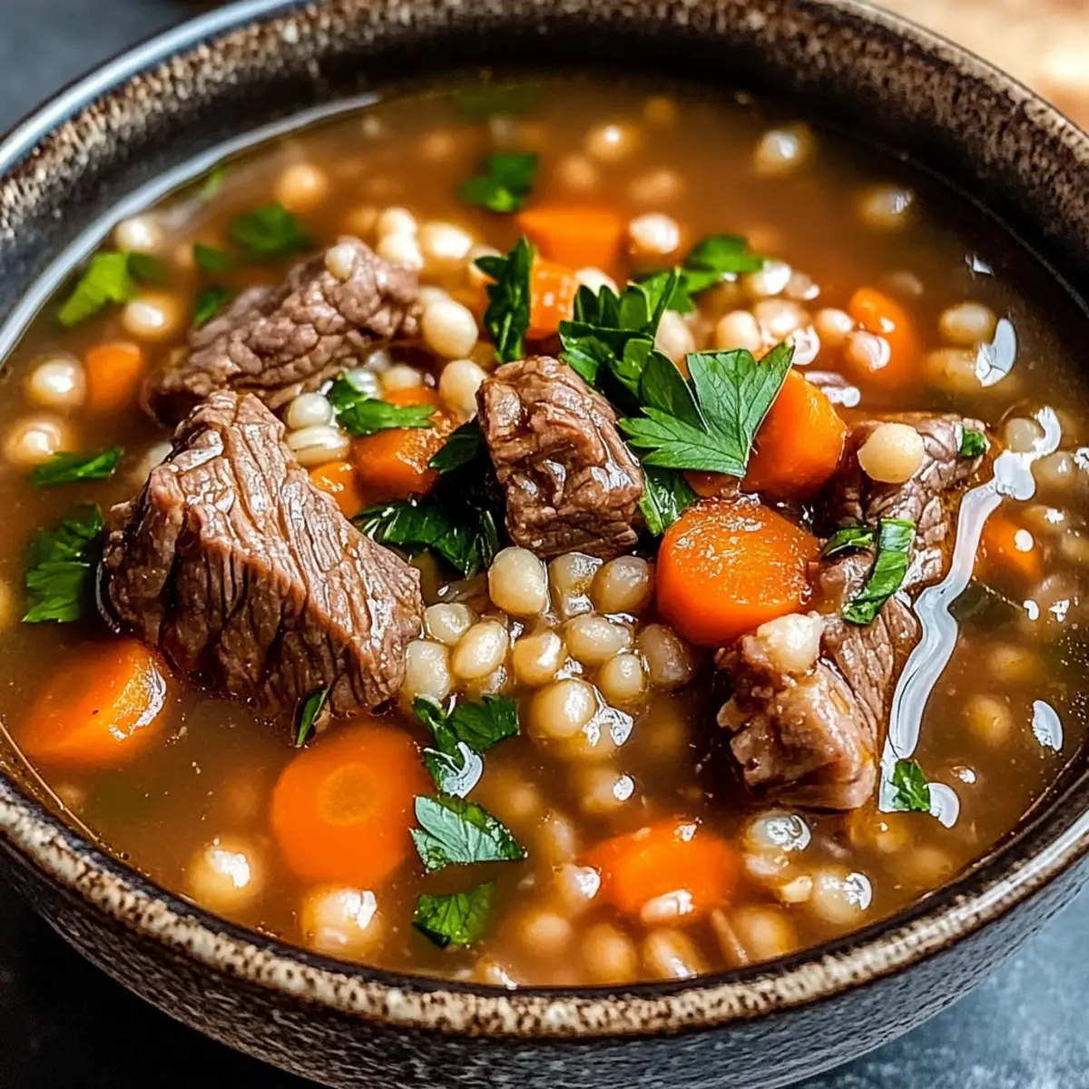 Herzhafter Geschmack: Diese Suppe kombiniert zarte Rindfleischstückchen mit den nussigen Aromen der Perlgerste – einfach ein festlicher Genuss.