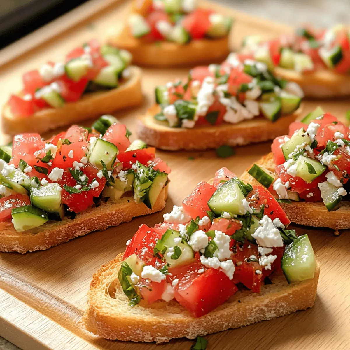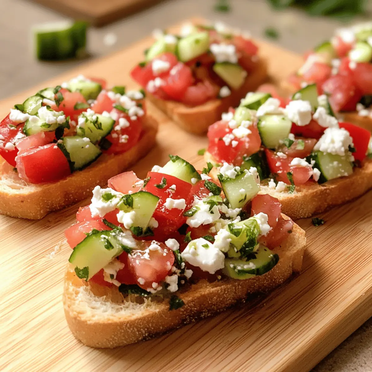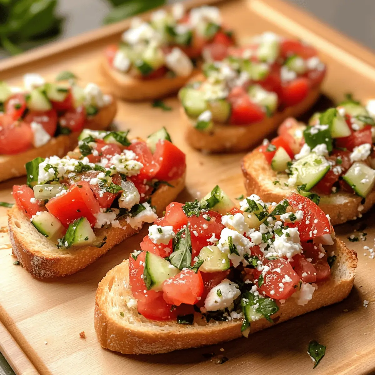Ein Spaziergang durch die charmanten Gassen Griechenlands, wo der Duft von frisch gebackenem Brot und saftigem Gemüse in der Luft liegt, inspiriert mich zu einem zeitlosen Klassiker: griechische Bruschetta. Diese einfache und dennoch eindrucksvolle Vorspeise vereint köstliche Roma-Tomaten, knackige Gurken und würzigen Feta zu einem wahren Fest für die Sinne. Perfekt für gesellige Abende, dieser mediterrane Genuss ist nicht nur schnell zubereitet, sondern auch ein echter Publikumsmagnet. Egal, ob auf gerösteten Crostini oder frischen Baguettescheiben serviert – dieser Appetitanreger bringt das Urlaubsfeeling direkt auf deinen Tisch. Bist du bereit, deine Gäste mit einer farbenfrohen Explosion der Aromen zu überraschen? Warum wirst du diese Bruschetta lieben? Einfachheit: Diese griechische Bruschetta ist schnell und unkompliziert zuzubereiten – perfekte Voraussetzungen für stressfreies Kochen. Frische Zutaten: Mit aromatischen Roma-Tomaten und knackiger Gurke bringt sie die Aromen des Mittelmeers direkt auf deinen Tisch. Vielseitigkeit: Ob als Vorspeise, Snack oder auf einer festlichen Charcuterie-Platte, sie macht immer Eindruck! Gesunde Wahl: Vollgepackt mit frischem Gemüse und Feta ist sie nicht nur köstlich, sondern auch nahrhaft. Publikumsliebling: Diese appetitliche Kombination zieht nicht nur den Gaumen, sondern auch die Herzen deiner Gäste an. Probiere sie mit einem Hauch von Hummus für das gewisse Extra! Griechische Bruschetta Zutaten Für die Basis • Baguette – Die perfekte Grundlage für deine Bruschetta, lässt sich zu knusprigen Crostini oder frischen Baguettescheiben zubereiten. Für die Füllung • Roma-Tomaten – Unverzichtbar für Geschmack und Saftigkeit; reife Tomaten sorgen für das beste Aroma. • Entkernte englische Gurke – Bringt Knackigkeit und Frische; kann auch durch gewöhnliche Gurken ersetzt werden. • Frisch zerbröckelter Feta – Fügt eine salzige, cremige Note hinzu; für eine andere Geschmacksrichtung kann auch Ziegenkäse verwendet werden. • Gehackte Frühlingszwiebel – Bietet eine milde Zwiebelnote; Lauchzwiebeln sind ebenfalls eine gute Alternative. Für das Dressing • Zitrone – Bringt Säure, um das Gericht auszugleichen; frische Zitrone ist zu bevorzugen. • Extra vergine Olivenöl – Verleiht Reichtum; unverzichtbar für die Zubereitung der Bruschetta-Mischung. • Rotweinessig – Ergänzt die Aromen; kann im Notfall durch Balsamico-Essig ersetzt werden. • Knoblauchpulver – Fügt eine subtile, herzhafte Tiefe hinzu; frischer Knoblauch kann nach Belieben verwendet werden. • Salz & Pfeffer – Essenzielle Gewürze; nach Geschmack anpassen. Für den aromatischen Kick • Getrockneter Oregano & Dill – Schlüsselkräuter des Mittelmeers, die aromatische Noten bringen; frische Kräuter sind auch möglich. • Getrockneter Basilikum – Optional, aber verleiht eine süße, duftende Note; frisches Basilikum sorgt für zusätzlichen Frische-Kick. Step-by-Step Instructions für griechische Bruschetta Step 1: Ofen vorheizen Heize deinen Ofen auf 190°C (375°F) vor. Während der Ofen aufheizt, bereitest du die Baguettescheiben vor. Achte darauf, dass der Ofen die richtige Temperatur erreicht, um die Crostini gleichmäßig und knusprig zu rösten. Step 2: Crostini vorbereiten Schneide das Baguette in ½ cm dicke Scheiben oder längs halbiert für größere Stücke. Lege die Scheiben auf ein Backblech und bestreiche sie großzügig mit Olivenöl. Backe sie für 10-12 Minuten, bis sie goldbraun und knusprig sind. Drehe die Scheiben nach der Hälfte der Backzeit um, um eine gleichmäßige Röstung zu gewährleisten. Step 3: Topping vorbereiten Während die Crostini im Ofen sind, würfle die Roma-Tomaten und die englische Gurke fein und schneide die Frühlingszwiebeln klein. In einer Schüssel mische den frisch gepressten Zitronensaft, Olivenöl, Rotweinessig, Knoblauchpulver, Salz, Pfeffer, Oregano, Dill und Basilikum. Füge dann die gewürfelten Gemüse und den zerbröckelten Feta hinzu und vermenge alles gut. Step 4: Anrichten und Servieren Nimm die Crostini aus dem Ofen und lasse sie kurz abkühlen, bevor du das Gemüse-Topping darauf löffelst. Alternativ kannst du auch frische Baguettescheiben anrichten und das Topping separat servieren. Für einen zusätzlichen Geschmack kannst du die Crostini vorher dünn mit Hummus bestreichen, bevor du das Gemüse darauf gibst. Expert Tips für griechische Bruschetta Richtige Temperatur: Stelle sicher, dass der Ofen die richtige Temperatur hat, bevor du die Crostini backst. Ein zu kalter Ofen kann zu weichen, unknusprigen Broten führen. Frische Zutaten: Verwende nur die frischesten Produkte, um das volle Aroma der griechischen Bruschetta zu genießen. Alte oder matschige Tomaten dürfen nicht sein! Aromatische Mischung: Achte darauf, die Kräuter und Gewürze gerade richtig zu dosieren. Eine ausgewogene Mischung hebt den Geschmack deiner Bruschetta hervor und verhindert, dass eine Zutat dominiert. Kühlen lassen: Lass die Crostini kurz abkühlen, bevor du das Topping darauf gibst. Dies verhindert, dass die Brote durchweichen und sorgt für eine optimale Textur. Hummus als Basis: Das Bestreichen der Crostini mit Hummus sorgt nicht nur für zusätzlichen Geschmack, sondern hilft auch, das Gemüse besser zu halten und Feuchtigkeit zu vermeiden. Aufbewahrungstipps für griechische Bruschetta Kühlschrank: Bewahre das übriggebliebene Gemüse-Topping in einem luftdichten Behälter im Kühlschrank auf. So bleibt es bis zu 4 Tage frisch und lecker. Gefrierschrank: Das gefüllte Topping eignet sich nur bedingt zum Einfrieren, da die Textur beim Auftauen leiden kann. Es wird empfohlen, nur die Crostini zu frieren, die für bis zu 2 Monate haltbar sind. Rösten: Wenn du die Crostini wieder verwenden möchtest, röste sie im Ofen oder Toaster, um die knusprige Textur zu bewahren. Eine kurze Röstdauer ist ideal, um Überröstung zu vermeiden. Serviervorschläge: Serviere die Bruschetta 