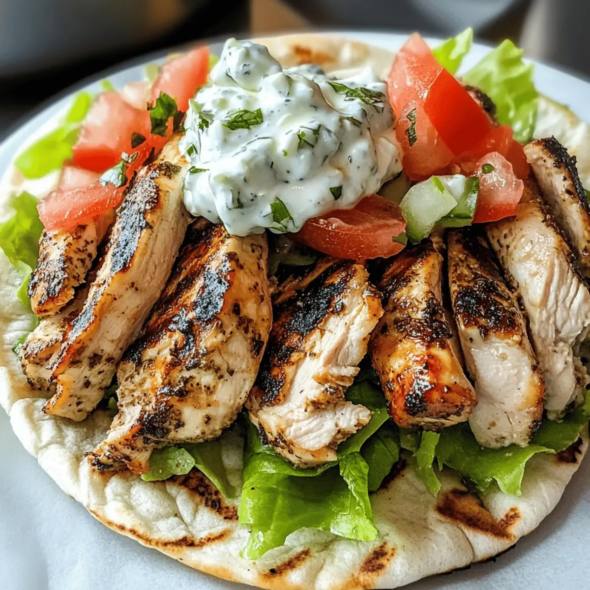 6. Gyros zusammenstellen: Fülle die Pita-Brote mit Hähnchen, Tzatziki, gehacktem Salat, Tomaten und Zwiebeln.