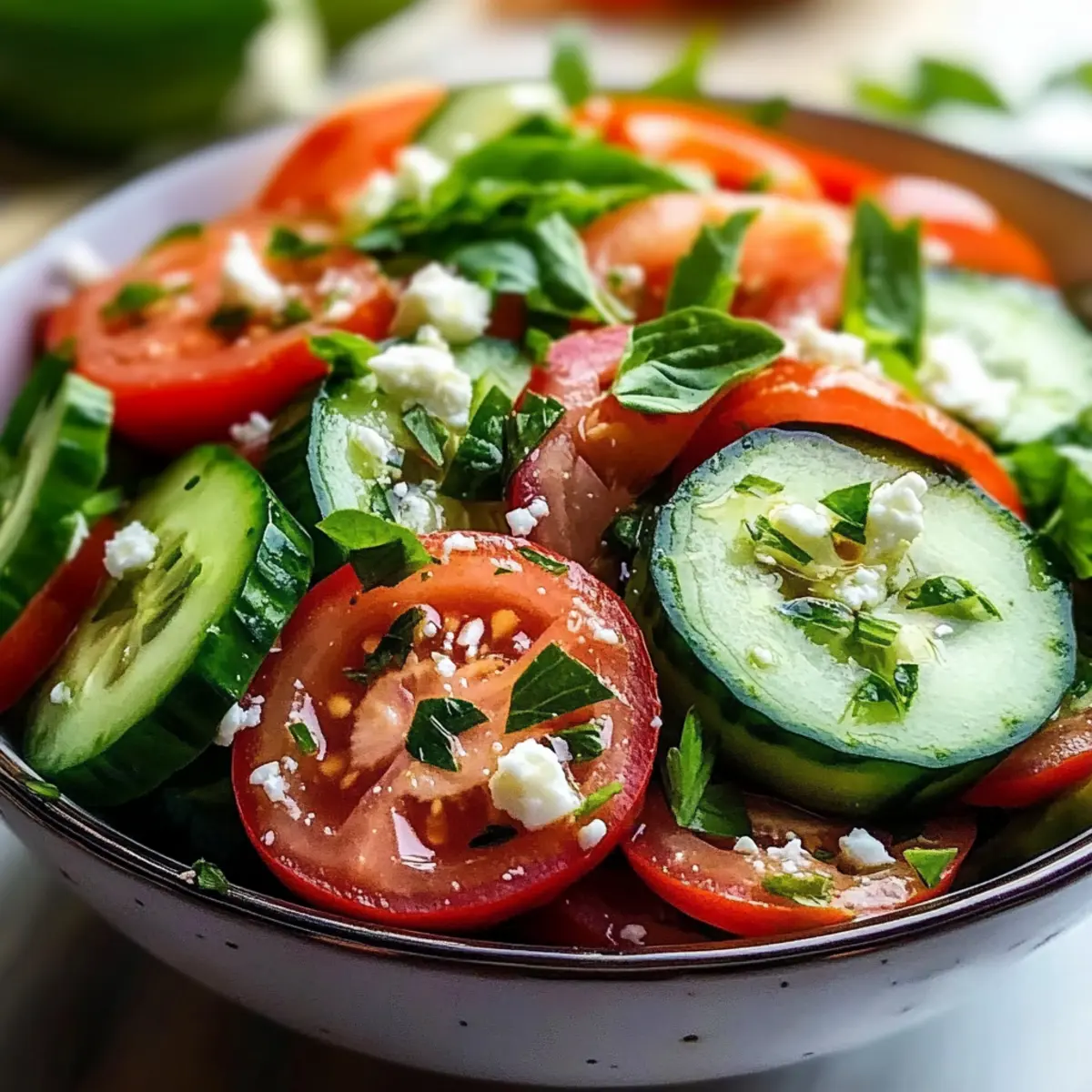 Es gibt nichts Erfrischenderes an einem heißen Sommertag als einen Gurken-Tomaten-Salat! Mit seinen knackigen Gurken und saftigen Tomaten ist dieser Salat nicht nur eine wahre Gaumenfreude, sondern auch unglaublich schnell zubereitet. Ideal für Grillabende oder einfach als leichtes Mittagessen, bringt er frische Farben und gesundes Gemüse auf den Tisch. Ein weiterer Vorteil: die Variationsvielfalt! Egal, ob du ihn mit Feta verfeinerst oder mit verschiedenen Dressings experimentierst, dieser Gurken-Tomaten-Salat kann zu deinem ganz persönlichen Gericht werden. Bereit, deinen neuen Sommer-Liebling kennenzulernen? Lass uns gemeinsam in die Welt dieser erfrischenden Spezialität eintauchen! Warum ist dieser Salat so besonders? Frische Zutaten: Dieser Gurken-Tomaten-Salat überzeugt durch knackige Gurken und saftige Tomaten, die in Kombination einfach himmlisch schmecken! Rasche Zubereitung: In nur 15 Minuten kannst du ein gesundes und schmackhaftes Gericht zaubern, perfekt für trubelige Tage oder unerwartete Gäste. Vielseitigkeit auf dem Teller: Egal ob als Beilage zu Grillgerichten oder leichtes Hauptgericht – er passt immer! Kreative Variationen: Mit Feta oder verschiedenen Dressings kannst du den Salat ganz nach deinem Geschmack anpassen. Und wenn du nach einem anderen leichten Gericht suchst, könnte der Asiatische Gurkensalat Chili eine tolle Ergänzung sein! Gurken-Tomaten-Salat Zutaten • Für den Salat: Gurken – 2 große Gurken sorgen für die frische und den Knack. Du kannst auch Kirschtomaten verwenden, wenn du kleinere Happen bevorzugst. Tomaten – 3 mittelgroße, reife Tomaten bringen Saftigkeit und Geschmack. Kirschtomaten sind eine ebenfalls köstliche Option. Rote Zwiebel – ½ kleine rote Zwiebel sorgt für Crunch und Schärfe; du kannst sie für einen milderen Geschmack durch Schalotten ersetzen. Frische Kräuter (Petersilie/Basilikum) – Etwa 2 Esslöffel gehackte Kräuter verbessern den Geschmack und die Farbe; Minze kann eine interessante Abwechslung bieten. Salz und Pfeffer – Wichtig für die Würze; nach Geschmack anpassen. Knoblauch – 1 kleine, fein gehackte Knoblauchzehe bringt zusätzlichen Geschmack; optional. • Für das Dressing: Olivenöl – 3 Esslöffel als Basis für das Dressing sorgen für reichhaltigen Geschmack. Rotweinessig oder Zitronensaft – Fügt Säure hinzu, um die Aromen zu balancieren; für einen intensiveren Geschmack kannst du Essig im gleichen Verhältnis ersetzen. • Für die Garnitur: Feta-Käse – Optional und zerbröckelt über dem Salat für eine cremige Note. Entdecke die Freude, einen erfrischenden Gurken-Tomaten-Salat zuzubereiten, der nicht nur gesund, sondern auch ein visueller Genuss ist! Schritt-für-Schritt-Anleitung für Gurken-Tomaten-Salat Step 1: Gemüseschnippeln Schneide die zwei großen Gurken und die drei mittelgroßen Tomaten in gleichmäßige Stücke und gib sie in eine große Schüssel. Füge die ½ kleine rote Zwiebel hinzu, die du ebenfalls in feine Ringe oder Stücke geschnitten hast. Achte darauf, dass die Stücke gleichmäßig groß sind, damit der Salat harmonisch aussieht und sich gut vermischen lässt. Step 2: Kräuter vorbereiten Hacke die frischen Kräuter, wie Petersilie oder Basilikum, grob und füge etwa 2 Esslöffel davon zu dem Gemüse in der Schüssel hinzu. Falls du einen anderen Geschmack bevorzugst, kannst du auch frische Minze verwenden. Diese Kräuter bringen nicht nur Farbe in den Gurken-Tomaten-Salat, sondern sorgen auch für ein frisches Aroma. Step 3: Dressing zubereiten In einer kleinen Schüssel vermischst du 3 Esslöffel Olivenöl mit 2 Esslöffeln Rotweinessig oder Zitronensaft. Würze das Dressing mit Salz und Pfeffer nach Geschmack. Schneide optional eine kleine Knoblauchzehe fein und füge sie der Mischung hinzu, um dem Dressing eine aromatische Note zu geben. Rühre das Dressing gut um, bis es homogen ist. Step 4: Salat vermengen Gieße das vorbereitete Dressing über das geschnittene Gemüse und die Kräuter in der großen Schüssel. Verwende zwei große Löffel, um alles vorsichtig zu vermengen, sodass das Gemüse gleichmäßig mit dem Dressing bedeckt wird. Achte darauf, dass die Gurken und Tomaten nicht zerdrückt werden, sondern ihre frische Form behalten. Step 5: Feta hinzufügen Wenn du Feta-Käse magst, bröckele ihn nun über den Salat. Verwende etwa 50 Gramm oder nach Geschmack. Der Feta verleiht dem Gurken-Tomaten-Salat eine cremige Textur und einen herzhaften Akzent, der perfekt zu den frischen Zutaten passt. Step 6: Salat kühlen Decke die Schüssel mit Frischhaltefolie ab und stelle den Salat für 10-15 Minuten in den Kühlschrank. Dies sorgt dafür, dass sich die Aromen gut vermischen und die frischen Zutaten etwas ruhen können. Bei dieser kurzen Kühlzeit bleibt der Gurken-Tomaten-Salat knackig und frisch. Was passt zum Gurken-Tomaten-Salat? Es gibt unzählige Möglichkeiten, um deinen Gurken-Tomaten-Salat in ein vollendetes Menü einzufügen, das alle Geschmäcker begeistert. Gegrilltes Hähnchen: Das zarte Fleisch ergänzt den frischen Salat perfekt und sorgt für ein herzhaftes Hauptgericht. Die Aromen des Hähnchens harmonieren wunderbar mit den knackigen Gemüsekomponenten. Quinoa: Diese nussige Beilage bringt eine sättigende Textur in dein Menü. Quinoa ist nicht nur gesund, sondern sorgt auch für einen spannenden Kontrast zur Frische des Salats. Crostini mit Pesto: Die knusprigen Scheiben bieten einen herrlichen Crunch und geselligen Snack, der prima zum Salat passt. Probiere das Crostini mit einer frischen Pesto-Variante, um zusätzliche Geschmäcker zu kombinieren. Mineralwasser mit Zitrone: Ein spritziges Getränk, das die Aromen deines Salats unterstreicht. Die Zitrone bringt Frische und einen Hauch von Sommer auf den Tisch. Auberginen-Röllchen: Gefüllt mit Ricotta und Kräutern, diese Röllchen sind eine köstliche, vegetarische Ergänzung, die die mediterranen Noten des Salats aufgreift. Tiramisu: Überrasche deine Gäste mit einem l