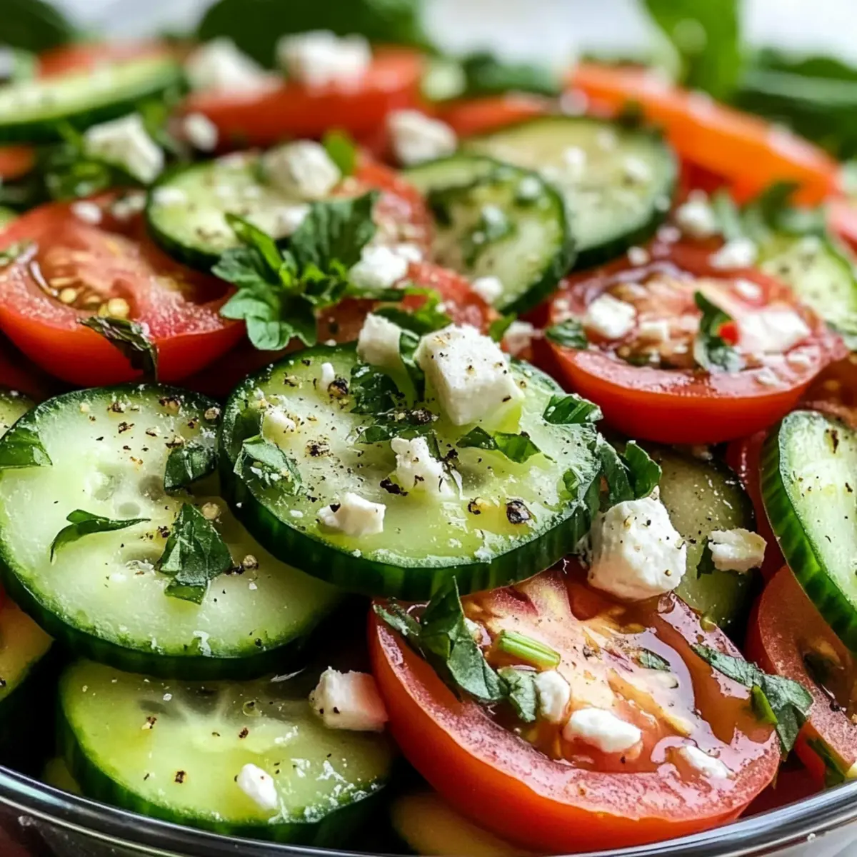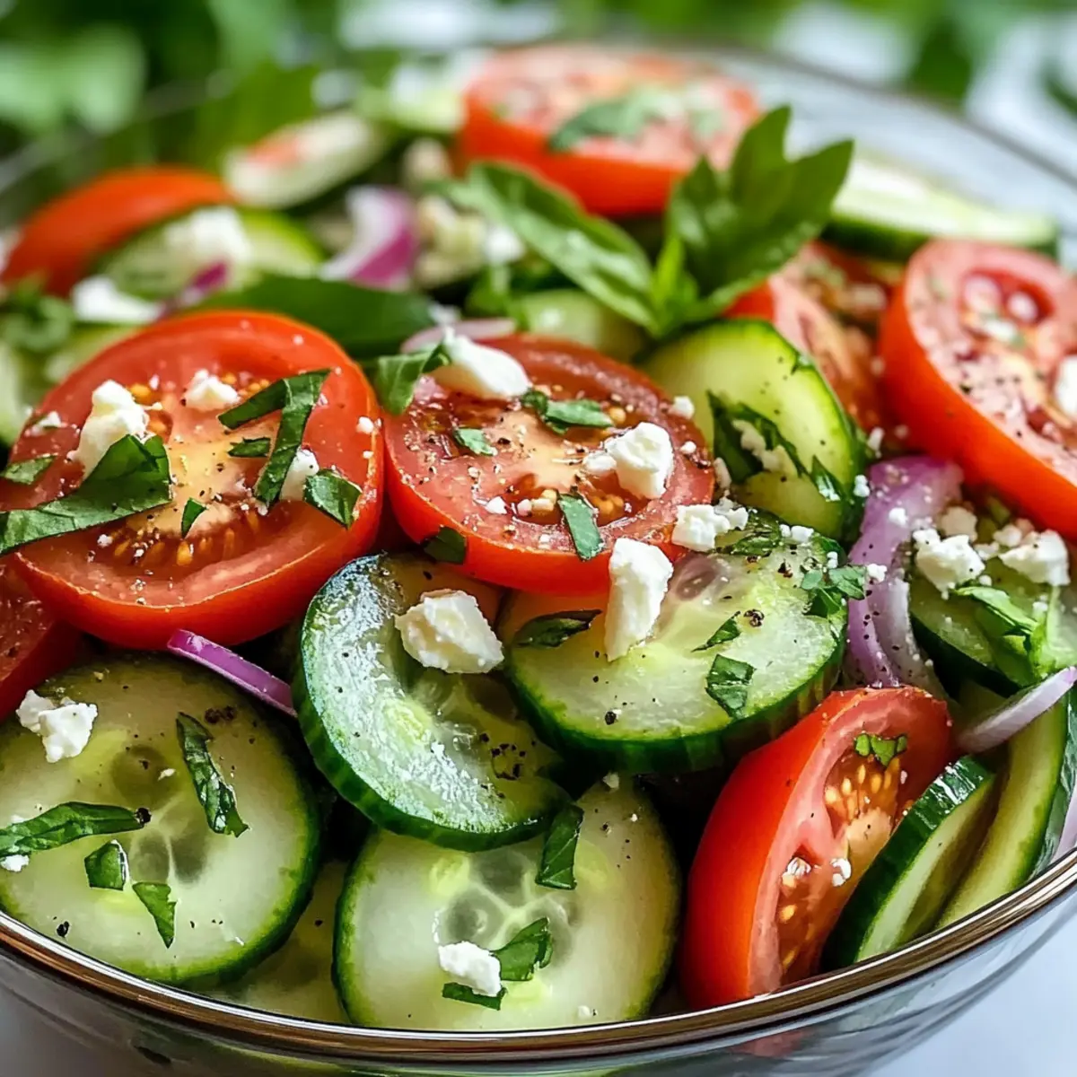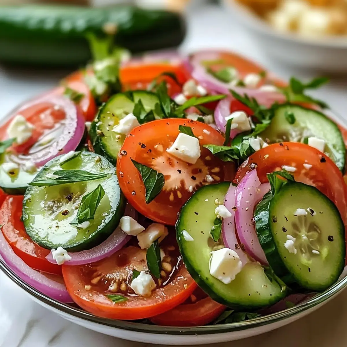 Letztens, als ich in meinem Garten die knackigen Gurken und saftigen Tomaten betrachtete, wurde mir klar, dass es Zeit für einen erfrischenden Gurken-Tomaten-Salat war. Mit nur wenigen einfachen Zutaten kreiert man ein leichtes, gesundes Gericht, das nicht nur besonders schnell zubereitet ist, sondern sich auch ganz nach deinem persönlichen Geschmack anpassen lässt. Dieser Salat ist perfekt für warme Tage, wenn man etwas Frisches genießen möchte oder als köstliche Beilage zu Grillgerichten. Du wirst überrascht sein, wie viel Freude in einem solch einfachen Rezept steckt! Welche Varianten wirst du ausprobieren? Warum ist dieser Salat so besonders? Einfachheit: Die Zubereitung des Gurken-Tomaten-Salats benötigt keine besonderen Kochkünste und ist schnell erledigt. Frische Aromen: Mit knackigen Gurken und saftigen Tomaten entsteht ein lebendiger Geschmack, der durch frische Kräuter noch verstärkt wird. Gesunde Wahl: Kalorienarm und reich an Vitaminen – perfekt für eine leicht gesunde Mahlzeit. Vielseitigkeit: Du kannst mit verschiedenen Dressings und Zutaten experimentieren, von Feta bis Avocado. Pikant oder mild: Mit einem Spritzer Zitrone oder einer Prise Chili kannst du die Schärfe nach deinem Geschmack anpassen. Mach dich bereit, diesen köstlichen Salat zu deinem neuen Favoriten zu erklären! Gurken-Tomaten-Salat Zutaten Für den Salat Gurken – Verwendung von 2 großen Gurken sorgt für Frische und Knackigkeit. Tomaten – 3 mittelgroße, reife Tomaten bringen Saftigkeit und Geschmack. Rote Zwiebel – ½ kleine rote Zwiebel fügt eine angenehme Schärfe hinzu; alternativ können Schalotten für einen milderen Geschmack verwendet werden. Frische Kräuter (Petersilie/Basilikum) – Etwa 2 Esslöffel gehackte Kräuter verbessern den Geschmack und die Farbe; Minze bietet eine interessante Abwechslung. Für das Dressing Olivenöl – 3 Esslöffel bilden die Grundlage des Dressings und sorgen für eine reichhaltige Note. Rotweinessig oder Zitronensaft – Fügt Säure hinzu, die die Aromen ausgleicht; für einen knackigeren Geschmack kann Essig im gleichen Verhältnis ersetzt werden. Knoblauch – Optional: 1 kleine, fein gehackte Knoblauchzehe bringt Geschmackstiefe. Salz und Pfeffer – Notwendige Gewürze zur geschmacklichen Abstimmung; nach Belieben anpassen. Für den Belag Feta-Käse – Optional für eine cremige Note; vor dem Servieren zerbröseln, um extra Reichtum zu bieten. Dieser Gurken-Tomaten-Salat ist nicht nur erfrischend, sondern auch extrem anpassungsfähig und perfekt für heiße Sommertage! Schritt-für-Schritt-Anleitung für Gurken-Tomaten-Salat Step 1: Zutaten vorbereiten Zuerst die 2 großen Gurken und 3 mittelgroßen Tomaten gründlich waschen. Schneide die Gurken in dünne Scheiben und die Tomaten in grobe Stücke. Für eine angenehme Schärfe die ½ kleine rote Zwiebel schälen und in feine Ringe schneiden. Alle vorbereiteten Zutaten in einer großen Schüssel vereinen und die Farben des Gurken-Tomaten-Salats bewundern. Step 2: Frische Kräuter hinzufügen Jetzt die 2 Esslöffel der gehackten frischen Kräuter, wie Petersilie oder Basilikum, zu den geschnittenen Zutaten in der Schüssel geben. Ihre Farben und Aromen werden den Salat beleben. Mit einem Löffel vorsichtig umrühren, damit alles gleichmäßig verteilt ist. So entsteht eine frische Geschmacksmischung. Step 3: Dressing anrühren In einer separaten kleinen Schüssel das Dressing zubereiten. 3 Esslöffel Olivenöl, 2 Esslöffel Rotweinessig oder Zitronensaft, 1 kleine, fein gehackte Knoblauchzehe, sowie Salz und Pfeffer nach Geschmack hinzufügen. Alles gut mit einem Schneebesen verrühren, bis eine homogene Mischung entsteht, die dem Gurken-Tomaten-Salat das gewisse Etwas verleiht. Step 4: Salat anrichten Das vorbereitete Dressing über die Gemüse- und Kräutermischung in der großen Schüssel gießen. Mit einem großen Löffel sanft mischen, dabei darauf achten, dass das Gemüse gleichmäßig mit der würzigen Soße überzogen ist. Achte darauf, dass der Gurken-Tomaten-Salat nicht zerdrückt wird, damit die Knackigkeit erhalten bleibt. Step 5: Mit Feta verfeinern Falls du Feta-Käse verwendest, jetzt die zerbröckelten Stücke gleichmäßig über den Salat streuen. Dies fügt eine cremige Note hinzu, die den erfrischenden Gurken-Tomaten-Salat perfekt ergänzt. Damit wird dein Salat nicht nur geschmacklich, sondern auch optisch ansprechend. Step 6: Kühlstellen für mehr Geschmack Um den vollen Geschmack zur Geltung zu bringen, den Gurken-Tomaten-Salat für 10-15 Minuten in den Kühlschrank stellen. Dies ermöglicht es den Aromen, sich zu verbinden. Die kühlende Frische ist ideal für heiße Tage und bringt den Salat die gewünschte Raffinesse, bevor du ihn servierst. Lagerung und Einfrieren von Gurken-Tomaten-Salat Raumtemperatur: Dieser Salat sollte nicht länger als 1 Stunde bei Raumtemperatur stehen gelassen werden, um die Frische und Knackigkeit zu erhalten. Kühlschrank: Reste können in einem luftdichten Behälter bis zu 2 Tage im Kühlschrank aufbewahrt werden. Es empfiehlt sich, das Dressing getrennt aufzubewahren, um die Sorglosigkeit zu bewahren. Einfrieren: Gurken-Tomaten-Salat eignet sich nicht gut zum Einfrieren, da die Textur von Gurken und Tomaten nach dem Auftauen matschig wird. Wiederaufwärmen: Falls du den Salat im Kühlschrank aufbewahrt hast, vor dem Servieren leicht durchmischen und nach Wunsch mit frischem Zitronensaft aufpeppen, um die frischen Aromen zu revitalisieren. Gurken-Tomaten-Salat Variationen Lass deiner Kreativität freien Lauf und gestalte den Gurken-Tomaten-Salat ganz nach deinem Gusto! Diese Anpassungen bringen neue Aromen und Texturen in dein Gericht. Zucchini: Ersetze die Gurken durch Zucchini für eine schmackhafte, low-carb Variante. Paprika: Mische bunte Paprika unter den Salat für zusätzlichen Crunch und Farbe. Joghurt-Dressing: Verwende griechischen Joghurt anstelle von Olivenöl für eine cremige, erfrischende Option. Avocado: Füge gew