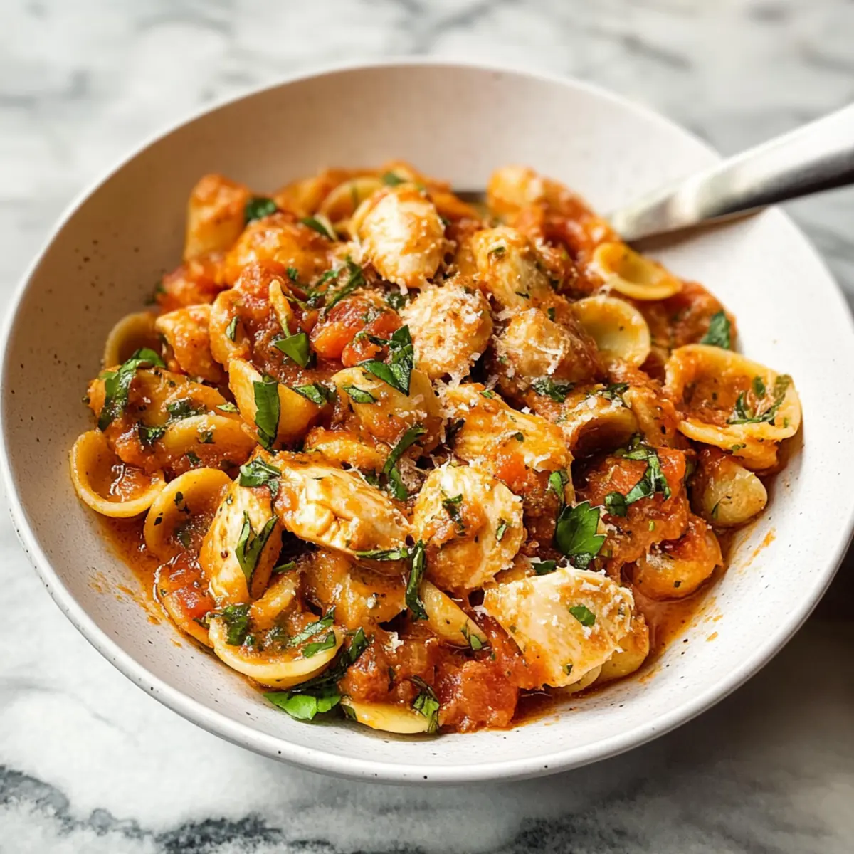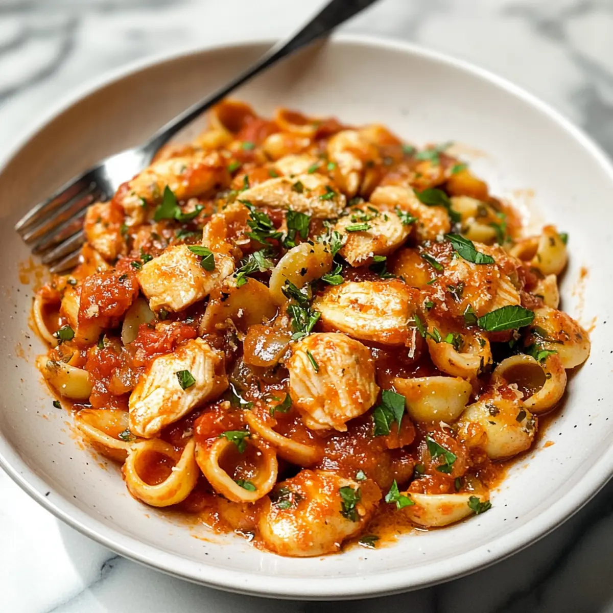 Der Duft von frisch gekochtem Hähnchen und würziger Tomatensauce ließ mich sofort an meine Zeit in Italien denken, als ich in einer kleinen Trattoria saß und auf mein Gericht wartete. Heute lade ich euch ein, diesen zauberhaften Moment mit meiner eigenen Version von Hähnchen Fra Diavolo Pasta nachzuvollziehen. Diese köstliche Pasta ist nicht nur ein absoluter Hit für eure Geschmacksknospen, sondern auch im Handumdrehen zubereitet und bietet euch die Freiheit, den Schärfegrad genau nach euren Vorlieben anzupassen. Perfekt für einen geselligen Abend mit Freunden oder ein schnelles, komfortables Abendessen im Kreise der Familie – dieses Rezept wird euch mit seinem vollmundigen Geschmack und seiner einfachen Zubereitung einfach begeistern! Seid ihr bereit, eure Küchenerinnerungen aufzupeppen und gleich in die Zubereitung einzutauchen? Warum ist dieses Rezept ein Muss? Einfachheit: Die Zubereitung des Hähnchen Fra Diavolo Pasta ist kinderleicht, sodass auch weniger erfahrene Köche schnell zum Ziel kommen. Vielseitigkeit: Die Schärfe könnt ihr ganz nach eurem Geschmack anpassen, sei es milde Aromen oder extremer Kick. Reichhaltiger Geschmack: Eine harmonische Zusammenstellung von aromatischen Kräutern und einer dicken Tomatensauce sorgt für einen vollen Geschmack, der jeden begeistert. Schnell und nahrhaft: In weniger als 30 Minuten steht das köstliche Gericht auf dem Tisch, ideal für hektische Wochentage. Wohlfühlfaktor: Dieses Gericht ist der Inbegriff von Komfortessen und bringt das italienische Flair direkt nach Hause. Verpasst nicht, dazu Brot oder einen frischen Salat zu servieren! Perfekt für gesellige Abende: Ob für ein gemütliches Dinner mit Freunden oder eine Familienfeier, dieses Gericht wird schnell zur Hauptattraktion! Hähnchen Fra Diavolo Pasta Zutaten Für die Sauce Olivenöl – sorgt für Reichtum und hilft beim Sautieren von Gemüse, kann auch durch andere Öle ersetzt werden. Zwiebel – bildet die Geschmacksbasis; verwende Schalotten für einen milderen Geschmack. Knoblauch – verleiht der Sauce aromatische Tiefe; frisch ist besser als Pulver. Trocken Weißwein – erhöht die Säure und Tiefe der Aromen; für eine alkoholfreie Variante durch Brühe ersetzen. DeLallo San Marzano Style Gecrushte Tomaten – bietet einen süßen, reichen Tomatengeschmack; kann durch andere Gecrushte Tomaten ersetzt werden, aber die Qualität wirkt sich auf den Geschmack aus. Zerstoßene rote Pfefferflocken – fügt Schärfe hinzu; nach Geschmack anpassen oder für mildere Aromen weglassen. Italienische Gewürzmischung – bietet eine Kräutermischung für geschmackliche Komplexität; getrockneten Oregano und Basilikum können ebenfalls verwendet werden. Getrockneter Oregano – verstärkt das italienische Geschmacksprofil. Salz – hebt alle anderen Aromen hervor; nach persönlichen Vorlieben anpassen. Für die Pasta und den Belag Orecchiette Pasta – bildet die Basis des Gerichts und hält die Sauce gut; kann durch jede bevorzugte Pasta ersetzt werden. Zerkleinertes Hähnchen oder Rotisserie-Hähnchen – bequeme Proteinquelle; frisches Hähnchen für einen handwerklicheren Ansatz verwenden. Frische Petersilie & Basilikum – sorgt für Frische und Farbe; je nach Verfügbarkeit anpassen oder weglassen. Pfeffer – bietet zusätzliche Würzung; frisch gemahlen für besseren Geschmack verwenden. Frisch geriebener Parmesan – ein traditioneller Finishing-Touch; für eine milchfreie Option mit veganem Käse ersetzen. Schritt-für-Schritt-Anleitung für Hähnchen Fra Diavolo Pasta Step 1: Zwiebel sautieren Erhitze in einem großen Dutch Oven bei mittlerer Hitze 2 Esslöffel Olivenöl. Füge die gewürfelte Zwiebel hinzu und sauté sie für 5-7 Minuten, bis sie weich und leicht gebräunt ist. Dies bildet die aromatische Basis deiner Hähnchen Fra Diavolo Pasta. Step 2: Knoblauch hinzufügen Gib den fein gehackten Knoblauch in den Topf und koche ihn für 1 Minute weiter, bis er duftet. Rühre dabei gut um, sodass der Knoblauch nicht anbrennt. Die Kombination von Zwiebel und Knoblauch wird die Sauce unglaublich aromatisch machen. Step 3: Wein reduzieren Erhöhe die Hitze und gieße 125 ml trockenen Weißwein in den Topf. Lass den Wein 3-4 Minuten köcheln, bis er auf die Hälfte reduziert ist. Dies fügt Tiefe und Säure zur Sauce deiner Hähnchen Fra Diavolo Pasta hinzu. Step 4: Tomaten und Gewürze einrühren Mische die DeLallo San Marzano Style Gecrushte Tomaten, 1 Teelöffel zerstoßene rote Pfefferflocken, 1 Teelöffel italienische Gewürzmischung, 1 Teelöffel getrockneten Oregano sowie Salz nach Geschmack in die Sauce. Reduziere die Hitze und lasse alles 10 Minuten köcheln, damit sich die Aromen entfalten können. Step 5: Pasta kochen Während die Sauce köchelt, bringe einen großen Topf mit Salzwasser zum Kochen. Füge die Orecchiette Pasta hinzu und koche sie gemäß den Anweisungen auf der Verpackung al dente, normalerweise etwa 8-10 Minuten. Behalte etwas Nudelwasser zur Seite, um die Sauce später anzupassen. Step 6: Hähnchen integrieren Rühre das zerkleinerte Hähnchen in die Tomatensauce ein und erwärme es 2-3 Minuten lang, bis alles gut durchgewärmt ist. Dies sorgt dafür, dass die Aromen gut miteinander verschmelzen und dein Hähnchen Fra Diavolo Pasta lecker und sättigend wird. Step 7: Frische Kräuter hinzufügen Nimm den Topf vom Herd und rühre frisch gehackte Petersilie und Basilikum in die Sauce ein. Das gibt der Hähnchen Fra Diavolo Pasta einen frischen Geschmack und ein ansprechendes Aussehen. Step 8: Pasta vermengen und servieren Gieße die gekochte Pasta ab und kombiniere sie mit der Sauce. Füge nach Bedarf einen Schuss vom reservierten Nudelwasser hinzu, um die Konsistenz anzupassen. Schmecke abschließend mit mehr Salz und frisch gemahlenem Pfeffer ab und serviere das Gericht mit frisch geriebenem Parmesan. Lagerungstipps für Hähnchen Fra Diavolo Pasta Raumtemperatur: Nicht länger als 2 Stunden bei Raumtemperatur aufbewahren, um da