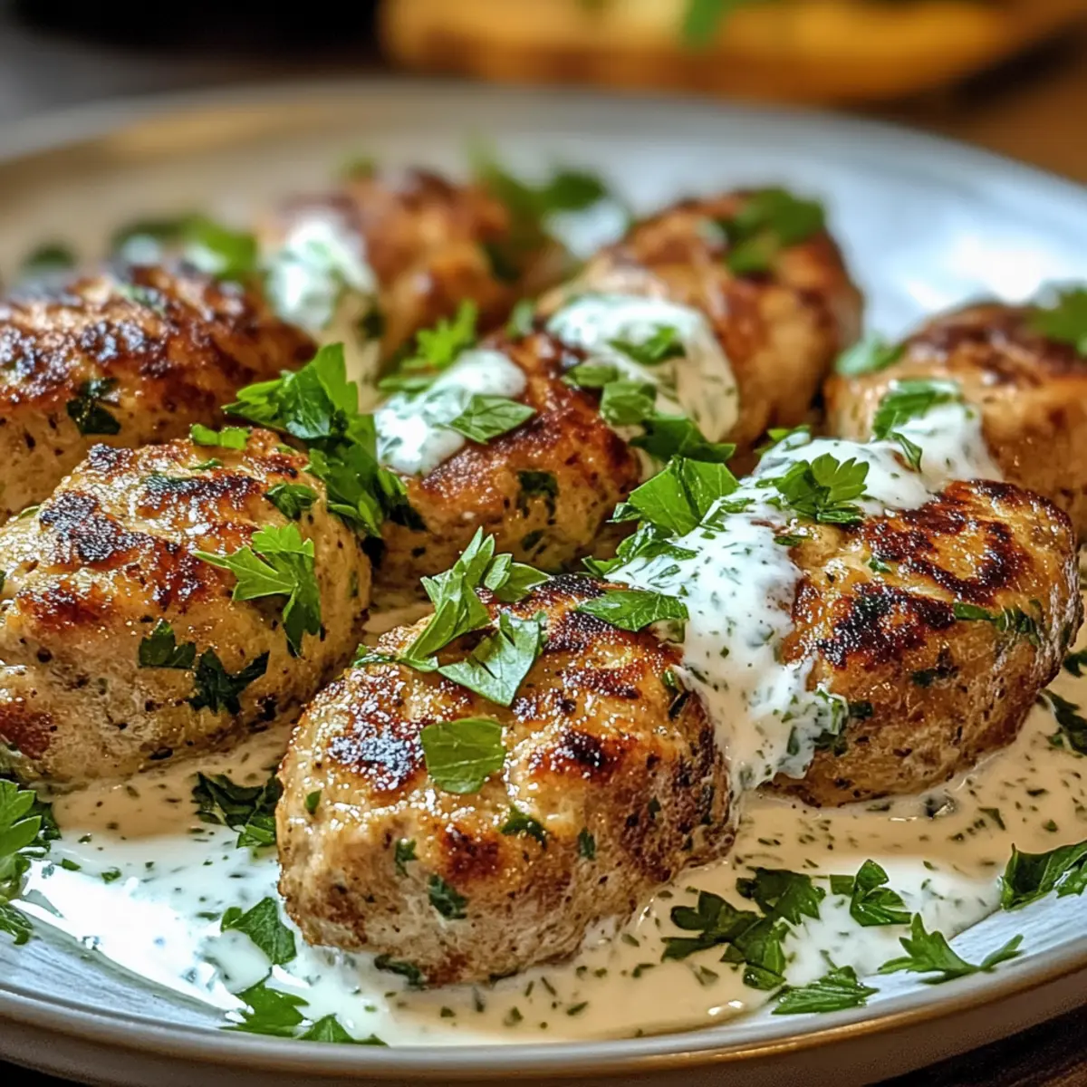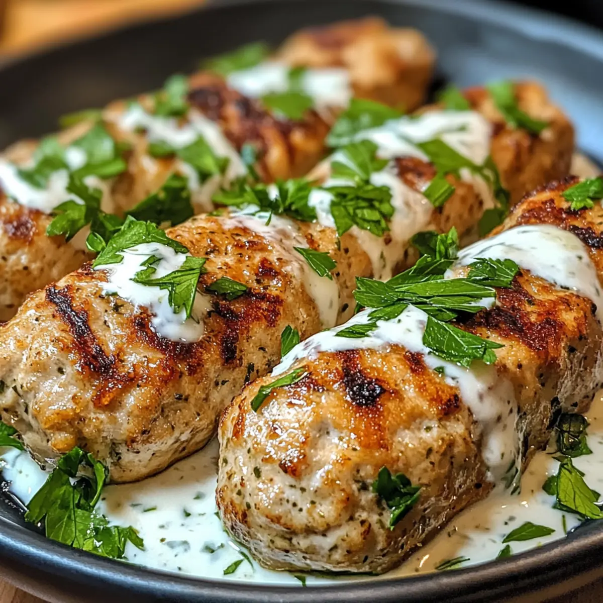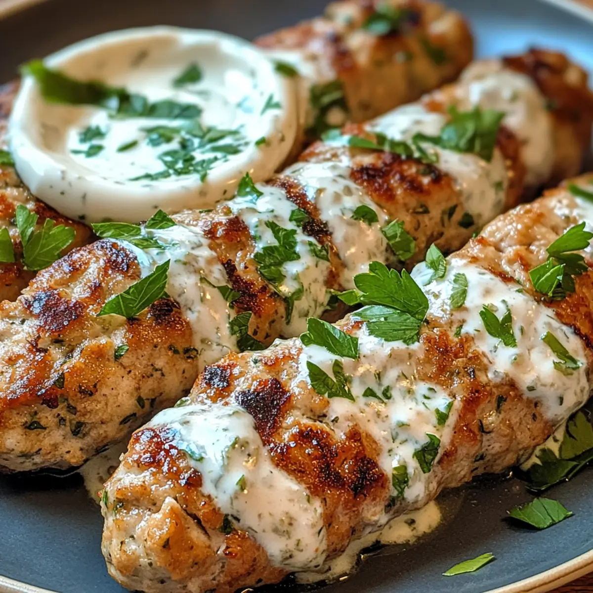 In einer kleinen Gasse von Marrakesch, wo das Aroma von gegrilltem Fleisch die Luft erfüllt, entdeckte ich das Geheimnis perfekt gewürzter Hähnchen-Kofta. Diese Hähnchen-Kofta mit Knoblauch-Joghurt-Sauce sind mehr als nur ein einfaches Abendessen; sie sind ein Fest der Aromen und die Lösung für alle, die eine glutenfreie Option suchen. Mit dieser schnellen und unkomplizierten Zubereitung bringst du im Handumdrehen ein Stück Mittelmeer in deine Küche. Die Kombination aus zartem Hähnchen und einer cremigen Sauce ist nicht nur köstlich, sondern auch ideal für ein geselliges Essen, das Gäste begeistert. Bist du bereit, deine Grillkünste auf ein neues Level zu heben und den Geschmack des Orients auf den Tisch zu bringen? Warum wirst du dieses Rezept lieben? Einfache Zubereitung: Du benötigst keine komplizierten Kochkünste, um die köstlichen Hähnchen-Kofta zuzubereiten. Sie sind schnell zubereitet und perfekt für ein stressfreies Abendessen. Vielseitige Aromen: Die Mischung aus aromatischen Gewürzen wie Kreuzkümmel und Koriander sorgt für ein unverwechselbares Geschmackserlebnis. Diese Kofta sind ein perfektes Beispiel für die Vielfalt der mediterranen Küche. Geselliges Essen: Ideal zum Teilen! Serviere die Kofta zusammen mit frischem Pita-Brot und einem knackigen Salat für ein unvergessliches Mahl. Gesund und Glutenfrei: Diese Hähnchen-Kofta sind nicht nur lecker, sondern auch reich an Proteinen und eine hervorragende glutenfreie Option für alle, die bewusst essen möchten. Perfekte Textur: Saftig und zart, mit einer leicht knusprigen Außenseite. Kombiniert mit der cremigen Knoblauch-Joghurt-Sauce wird jeder Bissen zum Genuss! Hähnchen-Kofta Zutaten • Diese zarten Hähnchen-Kofta mit Knoblauch-Joghurt-Sauce benötigen nur ein paar einfache Zutaten, um die Aromen des Orients direkt in deine Küche zu bringen. Für die Kofta • Gemahlenes Hähnchen – Die Hauptproteinquelle; leichter und saftiger als traditionelles Lamm oder Rind. Substitution: Verwende gemahlenen Truthahn, benötigst aber eventuell zusätzlich Flüssigkeit (z. B. Olivenöl). • Zwiebel, fein gehackt – Sorgt für Süße und Feuchtigkeit. Substitution: Schalotten für einen milderen Geschmack. • Knoblauch, gehackt – Verstärkt den Geschmack und ist ein Muss für die Sauce. Substitution: Knoblauchpulver kann genutzt werden, verändert jedoch die Textur und den Geschmack. • Frische Petersilie, gehackt – Bringt Frische und Farbe ins Spiel. Substitution: Frischer Koriander für eine andere aromatische Note. • Gemahlener Kreuzkümmel – Spendiert erdige Wärme. Keine gängigen Alternativen. • Gemahlener Koriander – Fügt Zitrusnoten hinzu. Keine gängigen Alternativen. • Salz & schwarzer Pfeffer – Hebt den gesamten Geschmack hervor; nach Geschmack anpassen. Substitution: Koscheres Salz für normales Salz. • Olivenöl – Wird zum Grillen verwendet und bringt Reichhaltigkeit. Substitution: Traubenkern- oder Avocadoöl für das Grillen. Für die Knoblauch-Joghurt-Sauce • Naturjoghurt – Basis für die Knoblauch-Joghurt-Sauce; cremige Textur. Substitution: Kokosjoghurt für eine milchfreie Option oder Tahini für eine würzige Alternative. • Zitronensaft – Bringt die Aromen in der Sauce zum Strahlen. Substitution: Essig für Säure, wenn keine Zitrone verfügbar ist. Jetzt, wo du die Zutaten für deine köstlichen Hähnchen-Kofta mit Knoblauch-Joghurt-Sauce kennst, bist du bereit, in die Küche zu gehen und diese Aromen des Orients selbst zu erleben! Schritt-für-Schritt-Anleitung für Hähnchen-Kofta mit Knoblauch-Joghurt-Sauce Step 1: Zutaten vorbereiten Sammle alle Zutaten und Werkzeuge, die du für die Zubereitung deiner Hähnchen-Kofta mit Knoblauch-Joghurt-Sauce benötigst. Achte darauf, das gemahlene Hähnchen, die fein gehackte Zwiebel, den Knoblauch, die Petersilie und die Gewürze bereit zu haben. Ein großes Rührgefäß ist ebenfalls wichtig, um alles gut vermischen zu können. Step 2: Hähnchenmasse mischen Gib das gemahlene Hähnchen, die gehackte Zwiebel, den Knoblauch, die Petersilie, den Kreuzkümmel, den Koriander, das Salz und den Pfeffer in eine große Schüssel. Mische alle Zutaten mit den Händen gut durch, bis sie gleichmäßig verteilt sind, aber achte darauf, die Masse nicht zu überarbeiten, damit die Kofta zart bleiben. Step 3: Kofta formen Befeuchte deine Hände leicht mit Wasser, um das Kleben der Hähnchenmasse zu verhindern. Forme die Mischung zu 10-12 ovalen Patties oder länglichen Formen. Achte darauf, dass sie gleichmäßig geformt sind, damit sie gleichmäßig garen. Lege die geformten Kofta auf einen Teller. Step 4: Grill vorheizen Heize deinen Grill oder eine Grillpfanne auf mittelhohe Temperatur vor. Träufle etwas Olivenöl auf das Grillrost oder in die Pfanne, um ein Anhaften zu verhindern. Wenn das Grillgerät schön heiß ist, bist du bereit, die Kofta zu grillen. Step 5: Kofta grillen Lege die geformten Hähnchen-Kofta vorsichtig auf den Grill. Brate sie für etwa 5-7 Minuten auf jeder Seite, bis sie goldbraun und gar sind. Die Innentemperatur sollte 75 °C (165 °F) erreichen. Achte darauf, die Kofta nicht zu überfüllen, damit sie schön gleichmäßig bräunen. Step 6: Knoblauch-Joghurt-Sauce zubereiten Während die Kofta grillen, bereite die Knoblauch-Joghurt-Sauce vor. Mische in einer Schüssel den Naturjoghurt, den Zitronensaft und das Salz gut miteinander. Für zusätzlichen Geschmack kannst du die Sauce nach Belieben mit frisch gehacktem Knoblauch ergänzen. Step 7: Servieren Nimm die Hähnchen-Kofta vom Grill und lasse sie kurz ruhen. Serviere sie auf einem Teller mit der Knoblauch-Joghurt-Sauce daneben. Du kannst die Kofta nach Wunsch mit frischer Petersilie oder anderen Kräutern garnieren. Guten Appetit! Lagerungstipps für Hähnchen-Kofta Zimmertemperatur: Vermeide das Lagern von Hähnchen-Kofta bei Zimmertemperatur, da sie schnell verderben können. Kühlschrank: Bewahre übrig gebliebene Hähnchen-Kofta in einem luft
