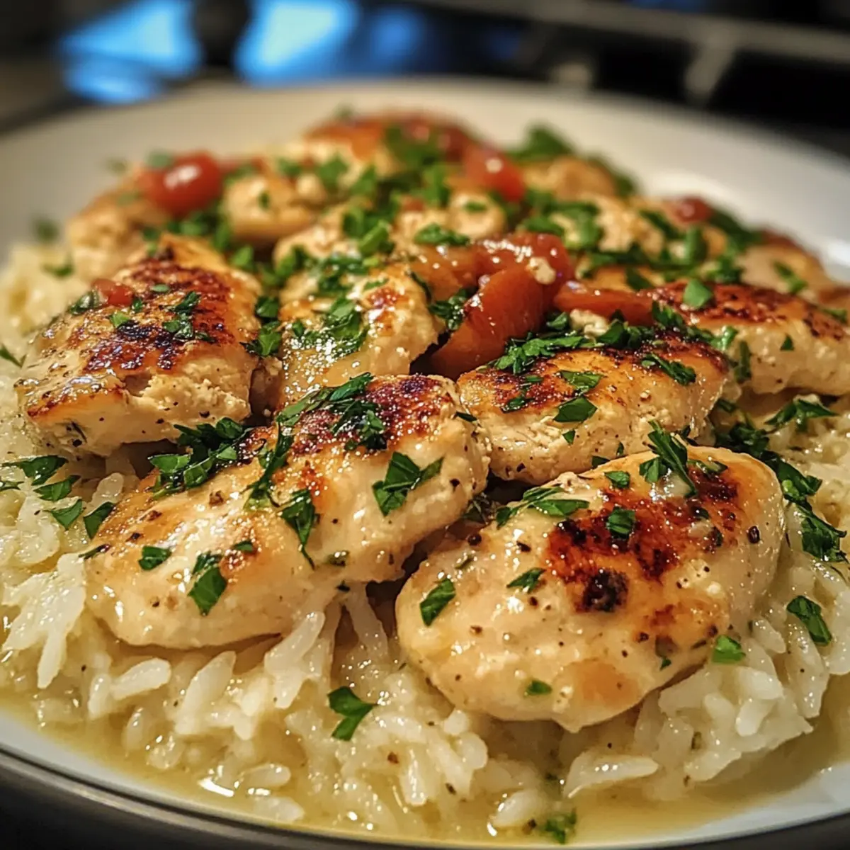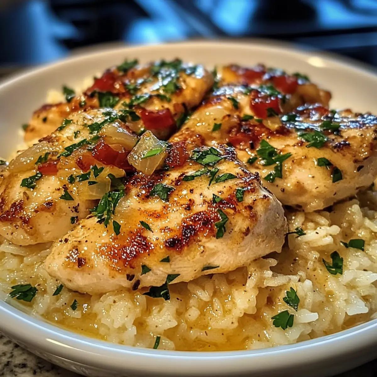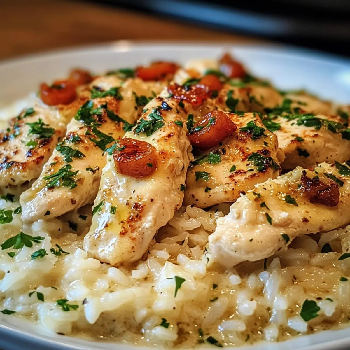 Als ich neulich am Herd stand und das Aroma von frisch gebratenem Knoblauch in der Luft lag, wusste ich: heute wird es etwas Besonderes. Hähnchen Scampi mit Knoblauch-Parmesan-Reis ist nicht nur ein Fest für die Sinne, sondern auch die perfekte Lösung für schnelle, aber dennoch köstliche Abendessen. Mit saftigem Hähnchen in einer cremigen Knoblauchscampi-Sauce und fluffigem Reis, aromatisiert mit Parmesan, gelingt es mir immer wieder, meine Familie und Freunde zu begeistern. Und das Beste? Dieses Rezept ist in weniger als einer Stunde auf dem Tisch – ideal für stressige Wochentage oder gemütliche Dinnerabende. Lust auf ein Stück italienischen Genuss, das im Handumdrehen zubereitet ist? Lass uns direkt in die Details eintauchen! Warum wirst du dieses Rezept lieben? Einfachheit: Die Zubereitung ist unkompliziert und erfordert keine besonderen Kochkünste, sodass du auch an hektischen Abenden eine köstliche Mahlzeit zaubern kannst. Aromatische Geschmackskombination: Der Mix aus Knoblauch, frischem Zitrone und Parmesan sorgt für ein Geschmackserlebnis, das dich direkt nach Italien entführt. Vielseitigkeit: Dieses Gericht lässt sich hervorragend mit Beilagen wie Spargel Mit Parmesan oder gebratenem Gemüse kombinieren, um eine vollwertige Mahlzeit zu kreieren. Familienfreundlich: Egal ob für ein schnelles Abendessen oder ein etwas aufwendigeres Dinner mit Freunden, Hähnchen Scampi begeistert jeden am Tisch! Zeitersparnis: In weniger als einer Stunde ist alles vorbei – perfekt für alle, die wenig Zeit haben, aber dennoch großartig essen wollen. Hähnchen Scampi Zutaten Für das Hähnchen • Hähnchenbrustfilets – Hauptproteinquelle; Hühnchenschenkel sind saftiger. • Olivenöl – Zum Anbraten des Hähnchens; alternativ können auch andere Öle verwendet werden. • Salz – Für die Würze; je nach diätetischen Bedürfnissen anpassen. • Schwarzer Pfeffer – Für zusätzlichen Geschmack und Schärfe. • Paprika – Bringt Farbe und Aroma ins Gericht. Für die Sauce • Butter – Schafft eine reichhaltige Basis; kann durch Olivenöl ersetzt werden für eine leichtere Variante. • Knoblauch (gehackt) – Unerlässlich für den Scampi-Geschmack; frisch verwenden für die besten Ergebnisse. • Hühnerbrühe – Für die Sauce und den Reis; Gemüsebrühe ist ein geeigneter Ersatz. • Zitronensaft und -schale – Sorgt für frische Noten im Gericht; frische Zitronen sind am besten. • Frisch gehackte Petersilie – Für Garnierung und zusätzliche Frische. • Rote Paprikaflocken (optional) – Für etwas Schärfe; weglassen, wenn du es nicht scharf magst. Für den Reis • Weißer Reis – Die Basis des Gerichts; kann durch braunen Reis oder Quinoa ersetzt werden, wobei die Kochzeit angepasst werden muss. • Parmesan (frisch gerieben) – Verleiht dem Reis Cremigkeit; vermeide vorgeriebenen Käse für besseren Geschmack. Schritt-für-Schritt-Anleitung für Hähnchen Scampi mit Knoblauch-Parmesan-Reis Step 1: Hähnchen würzen Die Hähnchenbrustfilets gleichmäßig mit Salz, schwarzem Pfeffer und Paprika würzen. Diese Gewürze verleihen dem Hähnchen nicht nur Geschmack, sondern auch eine schöne Farbe. Stelle sicher, dass das Hähnchen die Gewürze gut aufnimmt, indem du es ein paar Minuten ruhen lässt, während du die Pfanne vorbereitest. Step 2: Hähnchen anbraten Erhitze das Olivenöl in einer großen Pfanne bei mittlerer Hitze. Sobald das Öl schimmert, die gewürzten Hähnchenbrustfilets vorsichtig in die Pfanne legen und etwa 5-6 Minuten auf jeder Seite anbraten, bis sie goldbraun und durchgegart sind. Sie sollten eine Kerntemperatur von 75°C erreichen. Danach das Hähnchen aus der Pfanne nehmen und beiseite stellen. Step 3: Knoblauch und Butter hinzufügen Die Hitze reduzieren und die Butter in der gleichen Pfanne hinzufügen. Sobald die Butter geschmolzen ist, den gehackten Knoblauch einstreuen und 1-2 Minuten anbraten, bis er aromatisch ist und leicht goldbraun ist. Achte darauf, dass der Knoblauch nicht anbrennt, da er sonst bitter werden kann. Step 4: Brühe und Zitrone einrühren Jetzt die Hühnerbrühe und den Zitronensaft in die Pfanne gießen, dabei alle angebratenen Reste vom Pfannenboden abkratzen. Das Aroma wird sofort intensiver! Zitronenschale hinzufügen und die Mischung zum Köcheln bringen, damit sie 3-4 Minuten eindickt. Dies verstärkt den Geschmack der Sauce. Step 5: Hähnchen zurück in die Pfanne Das angebratene Hähnchen wieder in die Pfanne legen und mit der Sauce überziehen. Lass es 2-3 Minuten bei schwacher Hitze köcheln, damit das Hähnchen die Aromen aufnehmen kann. Die Sauce sollte leicht blubbern, während der frische Knoblauch und die Zitrone den Raum durchziehen. Step 6: Reis zubereiten In einem separaten Topf die Butter schmelzen und den gehackten Knoblauch kurz anbraten, bis er duftet. Den weißen Reis hinzufügen und für etwa eine Minute anrösten. Dies hilft, die Aromen im Reis zu verstärken, bevor du die Hühnerbrühe hinzufügst. Step 7: Reis kochen Die Hühnerbrühe in den Reis geben, zum Kochen bringen und dann den Deckel aufsetzen. Hitze reduzieren und den Reis 15 Minuten lang sanft köcheln lassen, bis die Flüssigkeit aufgesogen und der Reis fluffig ist. Du kannst gelegentlich umrühren, um sicherzustellen, dass nichts ansetzt. Step 8: Parmesan und Petersilie unterrühren Sobald der Reis fertig ist, frisch geriebenen Parmesan und gehackte Petersilie unterrühren. Diese Zutaten verleihen dem Reis eine cremige Textur und frische Noten, die perfekt zu deinem Hähnchen Scampi passen. Dies sollte etwa 2 Minuten dauern. Step 9: Anrichten und Servieren Das Hähnchen über dem fluffigen Knoblauch-Parmesan-Reis anrichten. Das Gericht nach Belieben mit zusätzlicher Petersilie und optionalen roten Paprikaflocken garnieren. Serviere dein Hähnchen Scampi mit Knoblauch-Parmesan-Reis sofort, damit alle Aromen frisch und köstlich bleiben. Vorbereitung für das Hähnchen Scampi mit Knoblauch-Parmesan-Reis Hähnchen Scamp