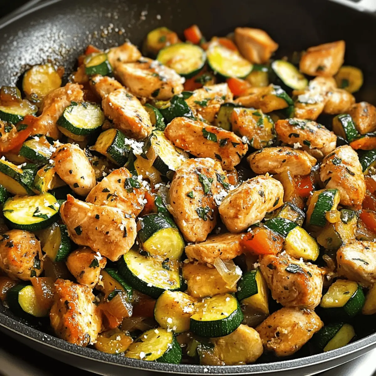 Hinweis: Die Zutaten für die Hähnchen und Zucchini Pfanne sind einfach und gesund, ideal für ein schnelles Abendessen.