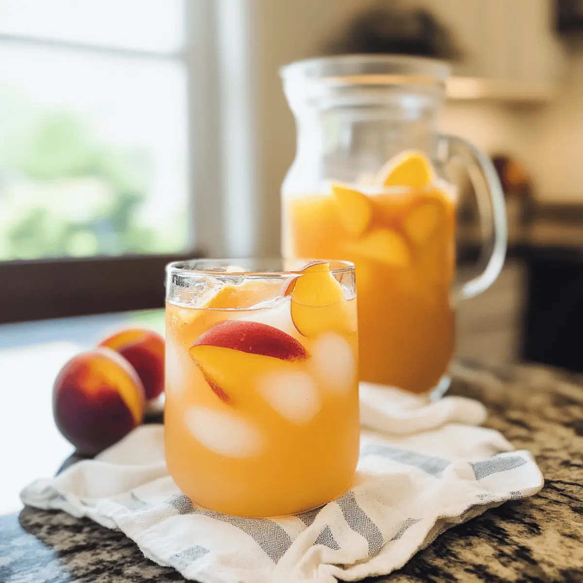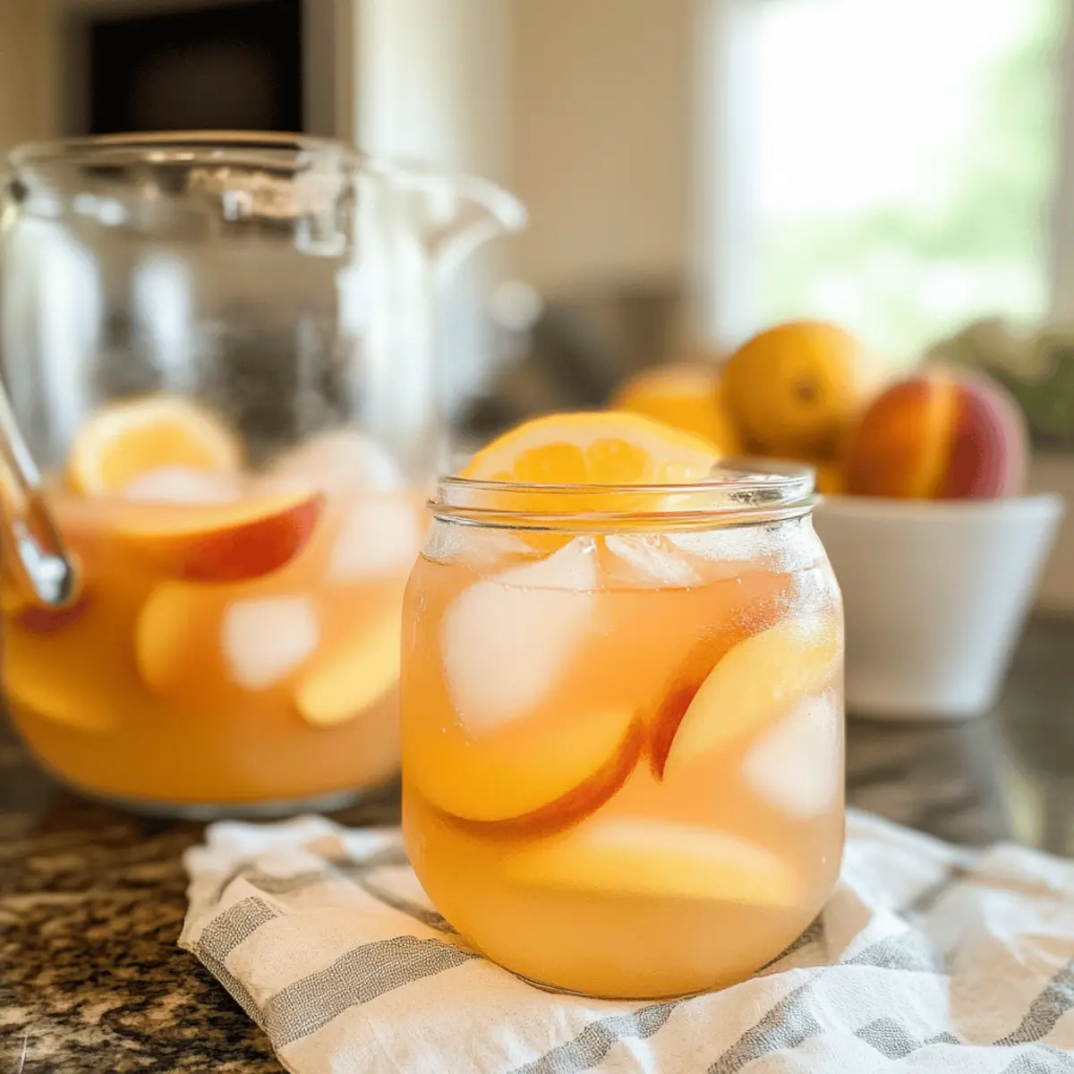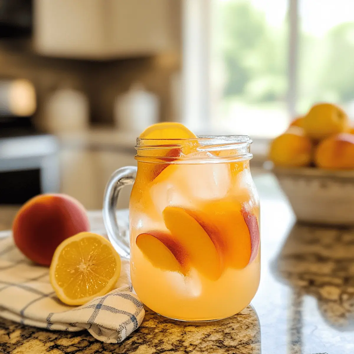 Wenn der Sommer naht, gibt es kaum etwas Erfrischenderes als ein Glas selbstgemachte Pfirsichlimonade. Die süßen Aromen sonnengereifter Pfirsiche treffen auf die spritzige Säure frischer Zitronen und schaffen so die perfekte Harmonie. Diese Hausgemachte Pfirsichlimonade ist nicht nur einfach zuzubereiten, sondern lässt sich auch ganz nach deinem Geschmack anpassen – egal, ob du es klassisch, sprudelnd oder sogar mit einem kleinen Schuss Alkohol magst. In nur wenigen Minuten verwandelt sich eine Handvoll natürlicher Zutaten in ein belebendes Getränk, das für gesellige Runden oder gemütliche Nachmittage unter dem Sonnenschirm ideal geeignet ist. Bereit, diesen erfrischenden Sommerfavoriten zu entdecken? Lass uns gemeinsam eintauchen! Warum wirst du diese Limonade lieben? Ein erfrischender Genuss: Diese hausgemachte Pfirsichlimonade bietet die perfekte Erfrischung an heißen Sommertagen. Einfache Zubereitung: Mit nur wenigen Zutaten ist sie blitzschnell bereit – ideal für spontane Lust auf etwas Erfrischendes. Vielseitige Variationen: Ob als sprudelnde Version oder mit einem Schuss Alkohol, du kannst sie ganz nach deinem Belieben anpassen. Natürlich lecker: Die Verwendung frischer Zutaten sorgt für ein unvergleichliches Geschmackserlebnis, das schnell andere Getränke in den Schatten stellt. Zusammen genießen: Perfekt für gesellige Runden – bring all deine Freunde und Familie zusammen, um diesen Sommerdrink zu feiern! Hausgemachte Pfirsichlimonade Zutaten • Qualitätszutaten sind der Schlüssel zum Geschmack! Für den Sirup Pfirsiche – reife, saftige Pfirsiche sorgen für die süße Basis der Limonade. Zucker – der Zucker verstärkt die Süße des Sirups; passe die Menge nach deinem Geschmack an. Wasser – wichtig, um die Pfirsiche zu kochen und den Sirup zu erstellen. Für die Limonade Zitronen – frisch gepresster Zitronensaft bringt die spritzige Säure, die die Süße ausgleicht. Kaltes Wasser – sorgt dafür, dass die Limonade erfrischend bleibt; die Menge kann nach Belieben variiert werden. Eiswürfel – unerlässlich für ein kühles Getränk; frische Eiswürfel verstärken den Genuss. Pfirsich- und Zitronenscheiben – für die Garnierung; sie verleihen der Limonade eine attraktive Optik und verbessern das Aroma. Durch diese geschmackvollen Zutaten wird deine hausgemachte Pfirsichlimonade ein traumhaft erfrischendes Sommergetränk, das keine Wünsche offenlässt! Schritt-für-Schritt-Anleitung für Hausgemachte Pfirsichlimonade Step 1: Pfirsichsirup zubereiten Beginne damit, die reifen Pfirsiche gründlich zu waschen und die Schale abzuziehen. Schneide die Pfirsiche in kleine Stücke und koche sie bei mittlerer Hitze mit 1 Tasse Wasser und 1 Tasse Zucker in einem Topf, bis die Mischung kocht. Achte darauf, regelmäßig umzurühren, bis der Zucker vollständig aufgelöst ist. Lasse den Sirup 10 Minuten köcheln, damit sich die Aromen entfalten. Step 2: Zitronensaft pressen Presse in der Zwischenzeit die frischen Zitronen aus, bis du etwa 1 Tasse Zitronensaft erhältst. Achte darauf, die Kerne zu entfernen – ein Sieb kann dir dabei helfen. Dieser frisch gepresste Saft verleiht deiner hausgemachten Pfirsichlimonade die nötige Spritzigkeit und Balance. Lass den Saft nach dem Pressen kurz stehen, um ihn bereit für die nächste Mischung zu haben. Step 3: Zutaten kombinieren Nehme einen großen Krug und gib die Tasse frisch gepressten Zitronensaft, 4 Tassen kaltes Wasser und den vorbereiteten Pfirsichsirup hinzu. Rühre die Mischung kräftig um, damit sich die Aromen gut verbinden. Eine geschmackvolle und erfrischende Basis für deine Hausgemachte Pfirsichlimonade entsteht, also achte darauf, dass alles gleichmäßig gemischt ist. Step 4: Süße anpassen Koste die Limonade und entscheide, ob sie nach deinem Geschmack ist. Wenn du eine süßere Note möchtest, füge mehr Pfirsichsirup hinzu oder wenn sie dir zu süß ist, kannst du etwas mehr Wasser einrühren. Dieser Schritt hilft dir, die perfekte Balance zwischen der Süße der Pfirsiche und der Säure der Zitronen zu finden – ein wichtiger Aspekt für die ideale Hausgemachte Pfirsichlimonade. Step 5: Servieren Fülle Gläser mit frischen Eiswürfeln und gieße die Pfirsichlimonade darüber. Um das Getränk optisch ansprechend zu gestalten, garniere die Gläser mit Pfirsich- und Zitronenscheiben. Diese frische und hübsche Präsentation steigert das Trinkerlebnis und macht deine hausgemachte Pfirsichlimonade zu einem echten Hingucker bei jedem Anlass. Perfekte Vorbereitung für deine Hausgemachte Pfirsichlimonade • Diese hausgemachte Pfirsichlimonade ist ideal für Meal Prep, da du die meisten Komponenten im Voraus zubereiten kannst. Bereite den Pfirsichsirup bis zu 3 Tage im Voraus zu; einfach die gekochte Mischung in einem luftdichten Behälter im Kühlschrank aufbewahren, um die Frische zu erhalten. Zudem kannst du die Zitronen bis zu 24 Stunden vorher auspressen und den Saft ebenfalls kühl lagern. Wenn du bereit bist, die Limonade zuzubereiten, kombiniere einfach den Sirup, den frisch gepressten Zitronensaft und das kalte Wasser, rühre gut um und serviere sie über Eis mit den Garnituren. So sparst du Zeit und kannst dennoch eine erfrischende und geschmackvolle hausgemachte Pfirsichlimonade genießen! Tipps für die beste Hausgemachte Pfirsichlimonade Wahl der Pfirsiche: Achte auf reife, saftige Pfirsiche mit süßem Aroma, um den besten Geschmack für deine Hausgemachte Pfirsichlimonade zu erzielen. Frisch gepresster Zitronensaft: Immer frisch pressen! Dieser gibt deiner Limonade die spritzige Frische, die nötig ist – verarbeitet ist oft weniger aromatisch. Süße anpassen: Beginne mit weniger Zucker im Sirup und passe die Süße je nach deinem Geschmack an. Das hilft, eine ausgewogene Limonade zu kreieren. Eisoptionen: Verwende große Eiswürfel für langsameres Schmelzen und damit weniger Verdünnung der Limonade, sodass sie länger erfrischend bleibt. Garnierung: Verziere deine Gläser mi