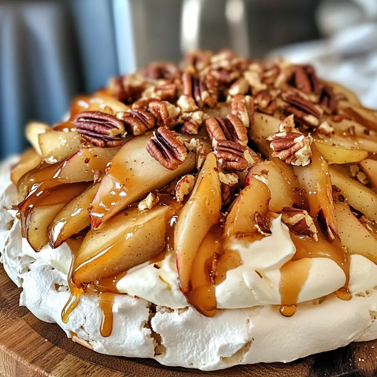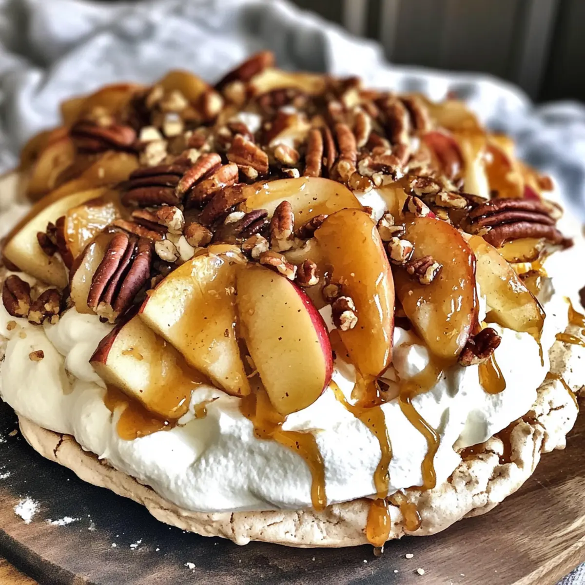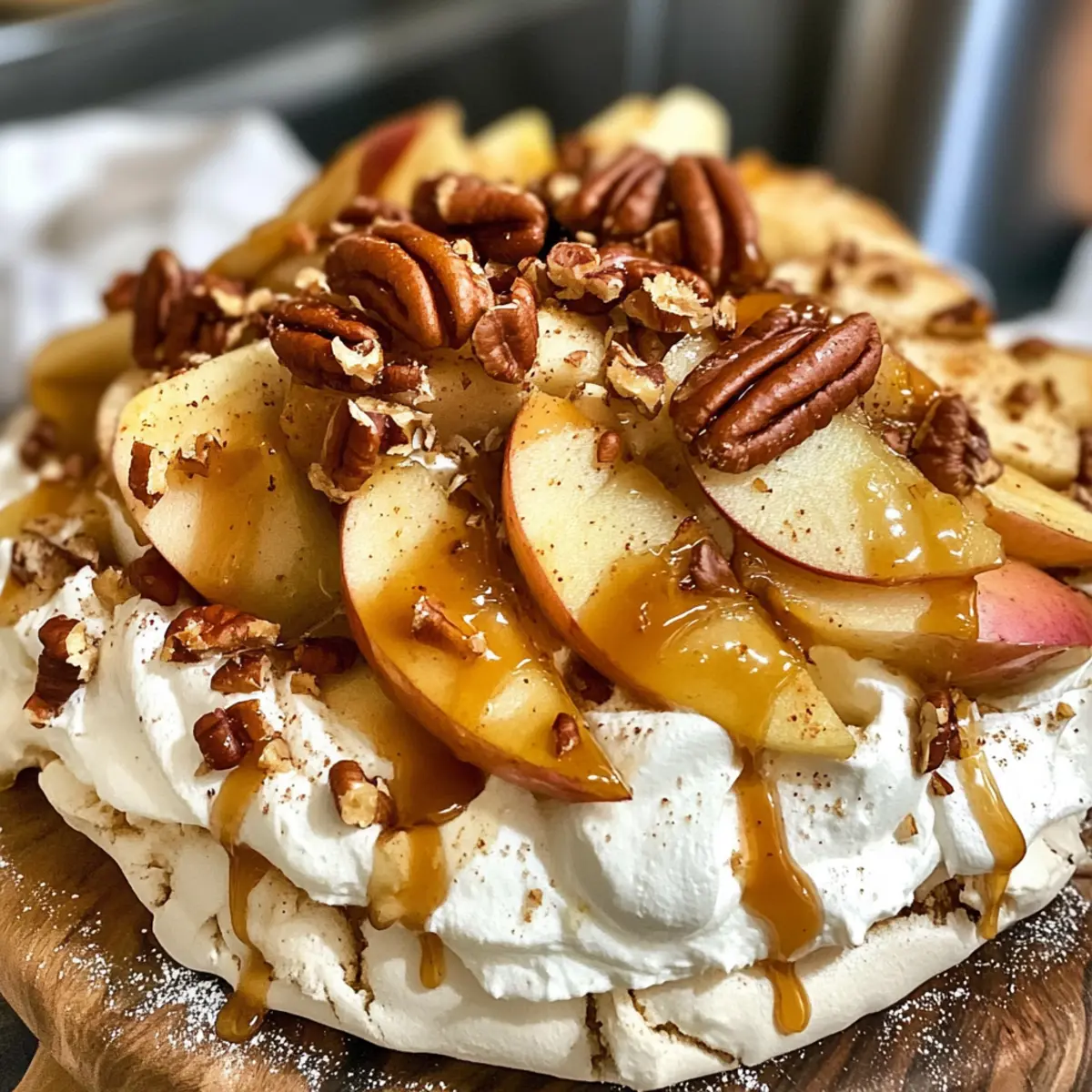 Genieße die Herbst Pavlova mit Äpfeln, Ahorncreme und gesalzenem Karamell – ein himmlischer und festlicher Nachtisch.