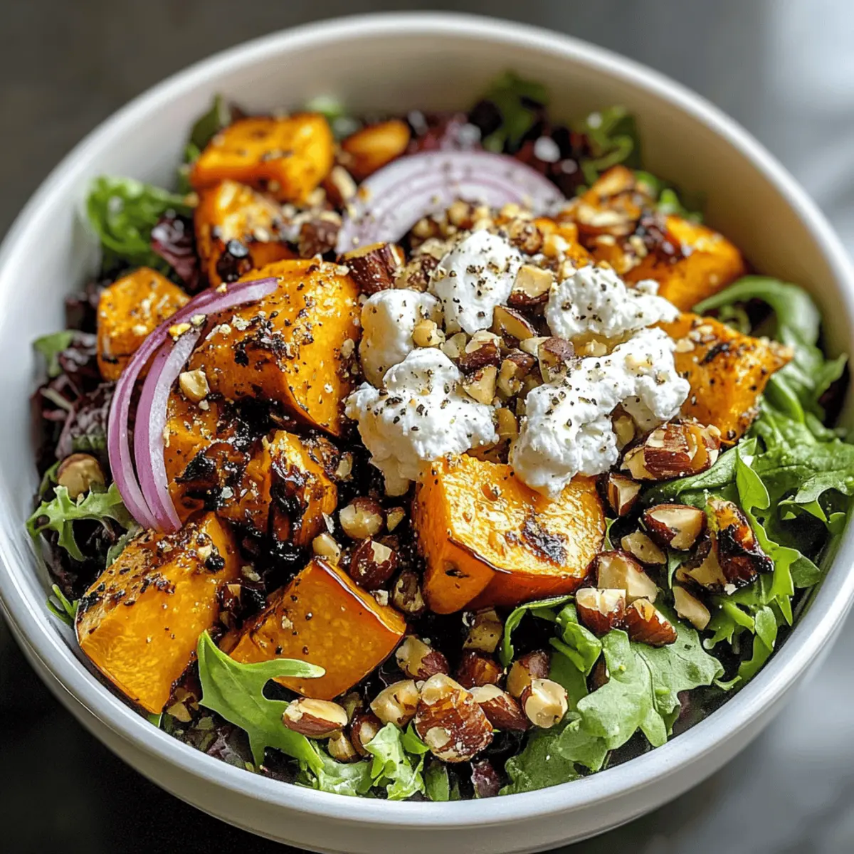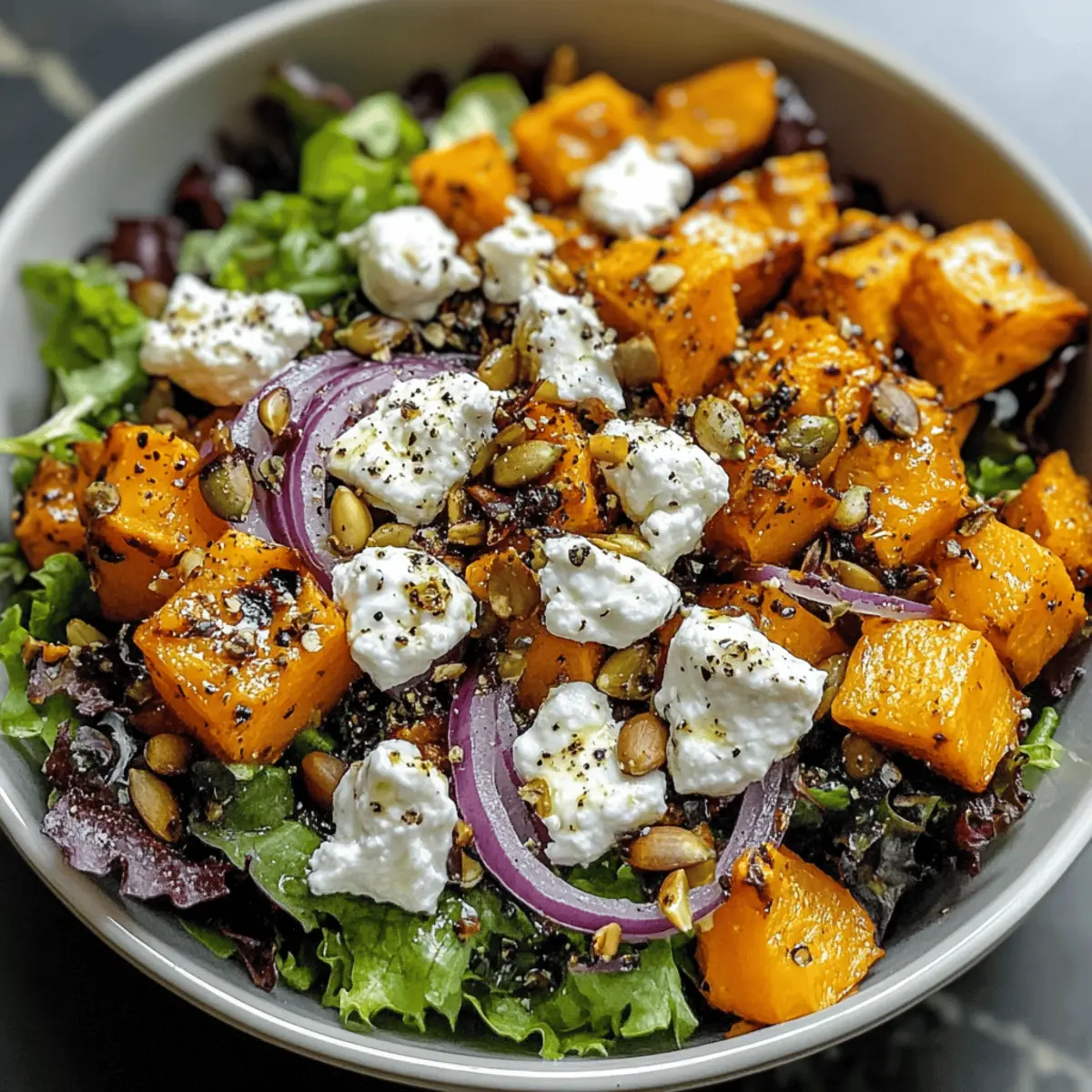 Eine köstliche herbstliche Schüssel mit Ziegenkäse, die die süßen und nussigen Aromen des Herbstes vereint.