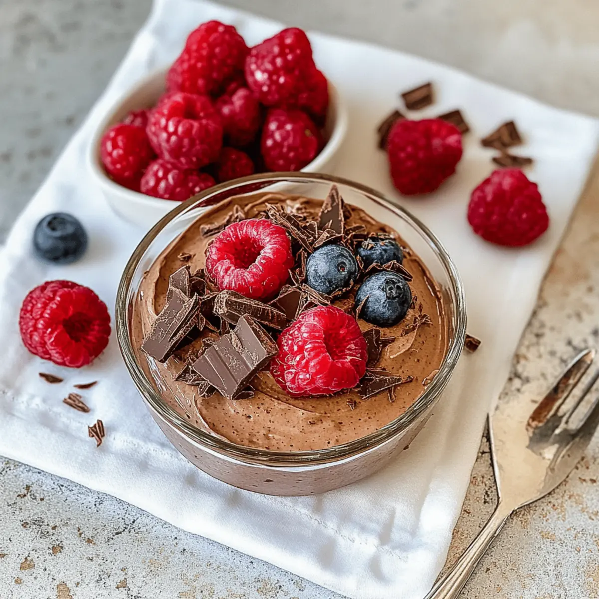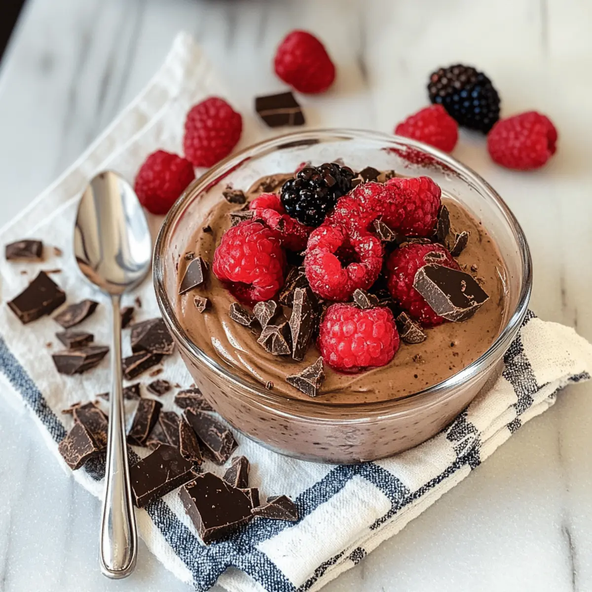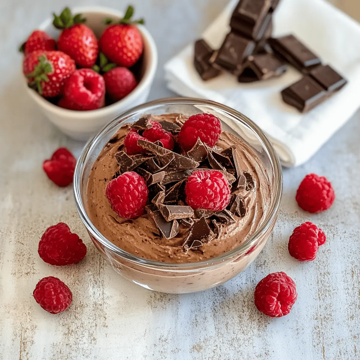 Wenn ich an meine Kindheit denke, kommen mir sofort die süßen, schokoladigen Desserts in den Sinn, die für unzählige Momente des Glücks gesorgt haben. Heute präsentiere ich euch ein Rezept, das den Genuss von Schokolade mit einem gesunden Twist vereint: Hoher Protein Schokoladenmousse mit griechischem Joghurt. Dieser luftige Leckerbissen ist nicht nur ein echter Publikumsmagnet, sondern auch einfach zuzubereiten und glutenfrei. Die cremige Konsistenz wird durch griechischen Joghurt und Proteinpulver verstärkt, was ihn zu einem guilt-free Dessert für Schokoladenliebhaber macht. Topped mit frischen Beeren und Schokoladenspänen, ist dieser Mousse der perfekte Abschluss eines jeden Essens. Bist du bereit, in die Welt dieser köstlichen Mousse einzutauchen? Warum wirst du dieses Rezept lieben? Einfachheit: Die Zubereitung ist kinderleicht und benötigt nur wenige Zutaten, die du wahrscheinlich bereits zu Hause hast. Reichhaltiger Geschmack: Der Mix aus dunkler Schokolade und griechischem Joghurt sorgt für ein intensives Schokoladenerlebnis, das du nicht widerstehen kannst. Gesunde Wahl: Mit 14 Gramm Protein pro Portion ist dieser Mousse das perfekte Dessert, das keinen Raum für Schuldgefühle lässt. Vielseitigkeit: Du kannst das Rezept ganz nach deinem Geschmack abwandeln – versuche eine mocha Variante mit etwas Kaffee oder füge Nüsse für extra Crunch hinzu. Publikumsfavorit: Egal, ob du Gäste bewirten oder einfach nur einen süßen Snack für dich selbst zubereiten möchtest, dieser Mousse zieht alle in seinen Bann. Kombiniere diesen Mousse mit unseren Gesunden Beeren-Toppings für den perfekten Genuss! Zutaten für Hoher Protein Schokoladenmousse mit griechischem Joghurt Für die Mousse • Griechischer Joghurt – sorgt für Cremigkeit und eine Proteinkick; du kannst ihn mit einer pflanzlichen Joghurt-Variante ersetzen. • Dunkle Schokolade – verleiht den reichhaltigen Geschmack; wähle Schokolade mit mindestens 70% Kakao für eine intensivere Note. • Kakaopulver – verstärkt den Schokoladengeschmack; ungesüßtes Kakaopulver ist ideal für weniger Süße. • Schokoladen-Proteinpulver – erhöht den Proteingehalt; kann durch Vanille-Protein ersetzt werden. • Honig – dient als natürlicher Süßstoff; verwende Ahornsirup für eine vegane Alternative. • Milch – sorgt für Feuchtigkeit und Geschmeidigkeit; Mandelmilch oder andere pflanzliche Milchsorten sind gute Alternativen. • Vanilleextrakt – gibt eine aromatische Süße; nutze für den besten Geschmack reinen Vanilleextrakt. • Salz – optimiert den Geschmack; eine Prise Meersalz wird empfohlen. Entdecke den Geschmack von Hoher Protein Schokoladenmousse mit griechischem Joghurt und verwöhne dich selbst mit dieser gesunden Leckerei! Schritt-für-Schritt Anleitung für Hoher Protein Schokoladenmousse mit griechischem Joghurt Step 1: Wasser kochen Fülle einen kleinen Topf mit Wasser und bringe es zum Kochen. Platziere eine hitzebeständige Schüssel über dem Topf, um ein Wasserbad zu schaffen. Achte darauf, dass der Boden der Schüssel das Wasser nicht berührt. Dies ist der perfekte Ort, um die Schokolade sanft zu schmelzen, ohne sie zu verbrennen. Step 2: Schokolade schmelzen Gib die grob gehackte dunkle Schokolade in die Schüssel und rühre sie häufig um, während sie schmilzt. Lasse die Schokolade langsam schmelzen, bis sie vollständig flüssig und glänzend ist. Nimm sie dann vom Herd und lasse sie einige Minuten abkühlen, damit sie nicht zu heiß ist, wenn du sie mit den anderen Zutaten vermischst. Step 3: Mousse Mischung vorbereiten In einer Küchenmaschine mit Schneebesenaufsatz kombinierst du griechischen Joghurt, Kakaopulver, Schokoladen-Proteinpulver, die abgekühlte Schokolade, Honig, Milch, Vanilleextrakt und eine Prise Salz. Schlage alles auf niedriger Stufe an und erhöhe dann die Geschwindigkeit, bis die Mischung glatt und gut kombiniert ist. Dies dauert etwa 2-3 Minuten und die Konsistenz sollte cremig sein. Step 4: Mousse abfüllen Gieße die fertige Mousse-Mischung in ein luftdichtes Behältnis oder mehrere kleine Schüsseln. Achte darauf, dass du die Mousse gleichmäßig aufteilst und dabei alle Luftblasen herausdrückst. Die Konsistenz sollte jetzt bereits verlockend aussehen und ein schöner schokoladiger Duft wird aufsteigen. Step 5: Kühlen für die perfekte Textur Stelle die Mousse für mindestens 4 Stunden, idealerweise über Nacht, in den Kühlschrank, damit sie gut fest wird. Diese Kühlzeit ist entscheidend für die Entwicklung der idealen samtigen Textur des Hoher Protein Schokoladenmousse mit griechischem Joghurt. Überprüfe, ob die Mousse fest geworden ist, bevor du mit dem Servieren fortfährst. Step 6: Servieren und genießen Nimm die Mousse kurz vor dem Servieren aus dem Kühlschrank. Garniere die Mousse nach Belieben mit frischen Beeren und Schokoladenspänen für einen zusätzlichen Hauch von Eleganz. Die Mousse sollte kühl und cremig sein, bereit, deinen Gästen oder dir selbst eine Freude zu bereiten. Guten Appetit! Hoher Protein Schokoladenmousse Variationen und Alternativen Lass deiner Kreativität freien Lauf und personalisiere diesen leckeren Mousse nach deinem Geschmack! Vegan: Ersetze den griechischen Joghurt durch einen pflanzlichen Joghurt, um eine köstliche vegane Variante zu erhalten. So bleibt der Genuss ganz ohne tierische Produkte. Mocha: Füge einen Esslöffel Instantkaffee oder Espressopulver hinzu, um einen schokoladigen Mokka-Geschmack zu kreieren. Diese Kombination sorgt für eine besondere Geschmacksexplosion. Nussige Note: Integriere eine Handvoll gehackte Mandeln oder Haselnüsse in die Mousse oder streue sie als Topping darüber. Der Crunch gibt der Mousse eine tolle Textur und zusätzlichen Geschmack. Fruchtige Akzente: Gemischte Beeren wie Himbeeren oder Erdbeeren können unter die Mousse gehoben oder als frisches Topping verwendet werden. Die fruchtige Frische harmoniert hervorragend mit der Schokolade. Süß oder herzhaft: Taus